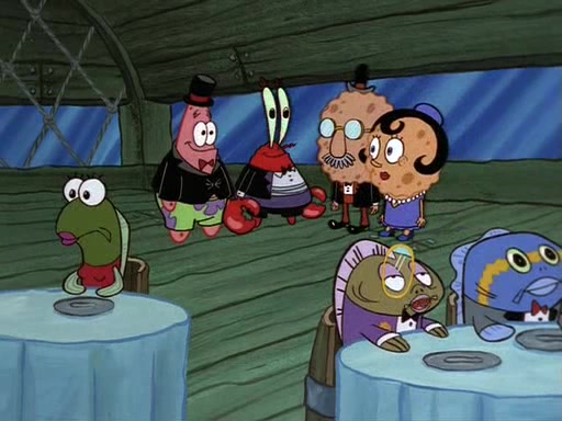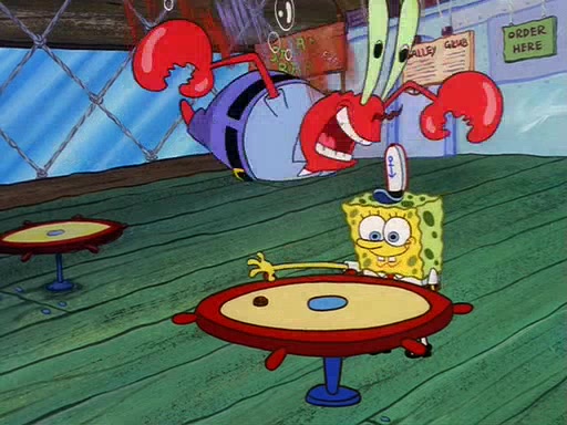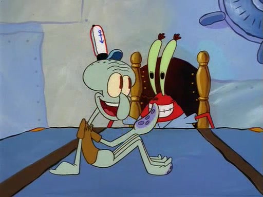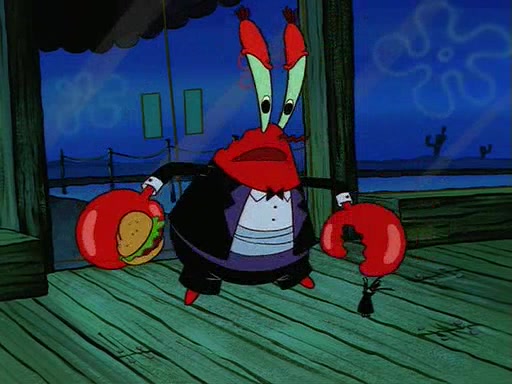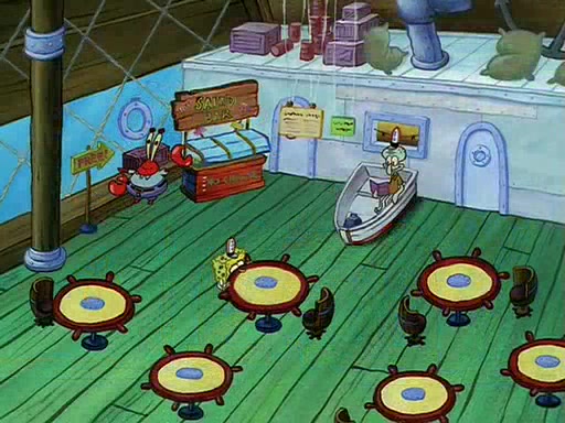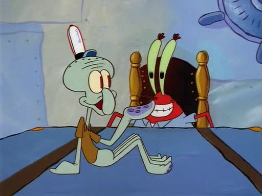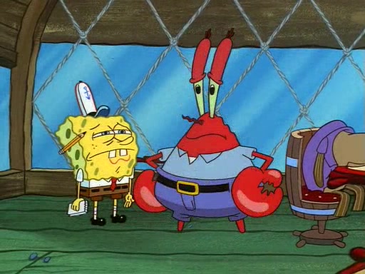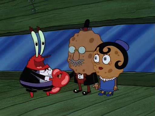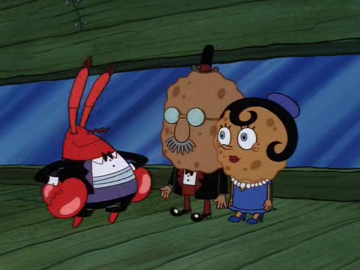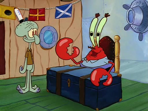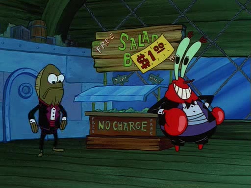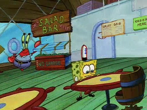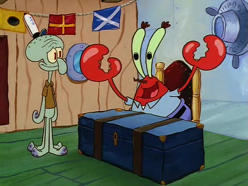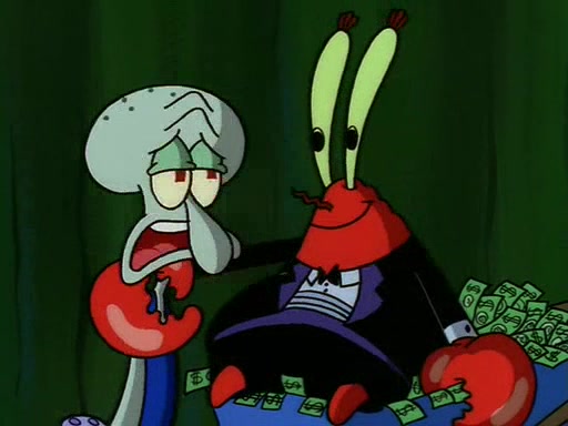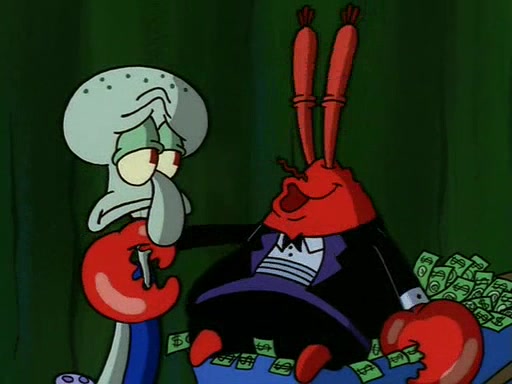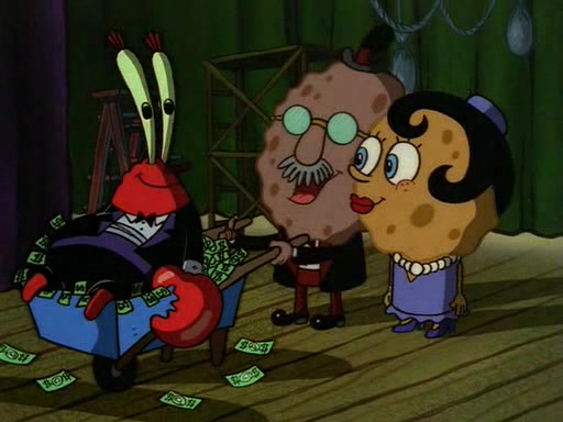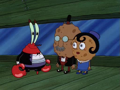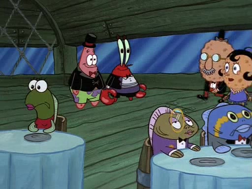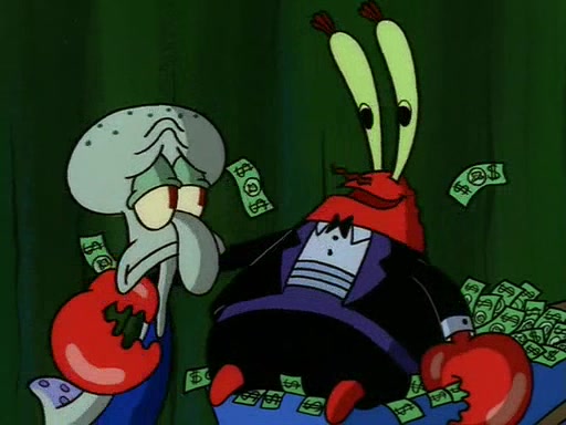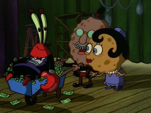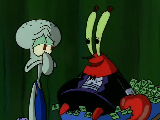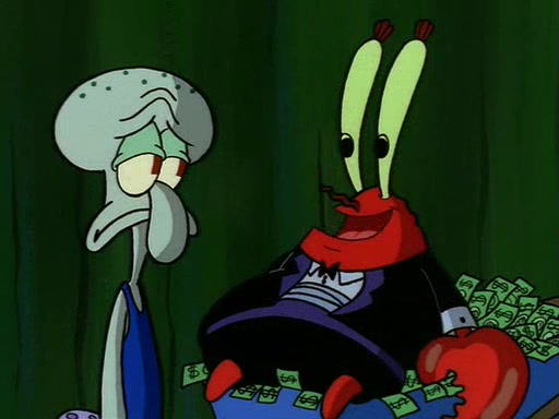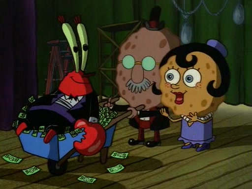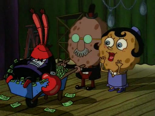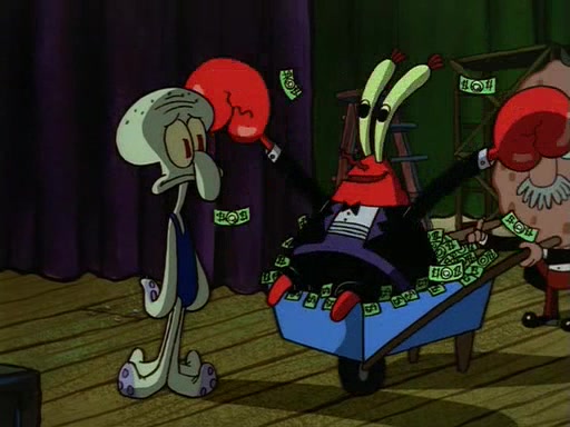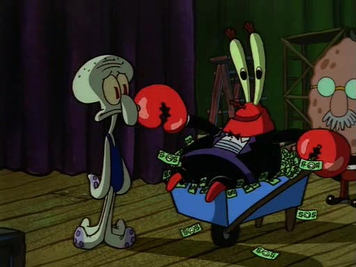 As Mr. Krabs stores the penny away into his vault, he gives his two employees the bad news: Profits are way down this month, and they need a gimmick to bring in customers. Asking for ideas results in apathy from Squidward and increasingly absurd ideas from SpongeBob (including a free pair of socks with each purchase, "Double Patty Midnight Madness", and giving a free drink to the customer who comes in with a mouthful of clams). After Mr. Krabs points out that he was thinking along the lines of "live entertainment", Squidward hits a brainstorm: the first Krusty Krab Talent Show, with him as the host!