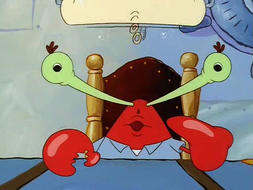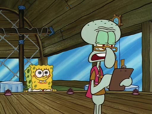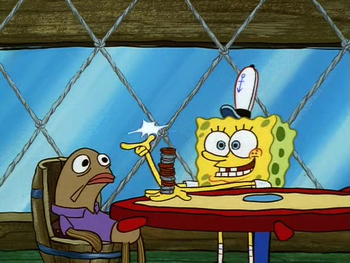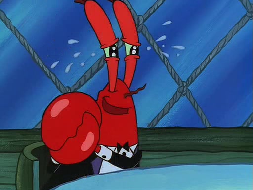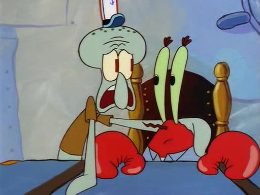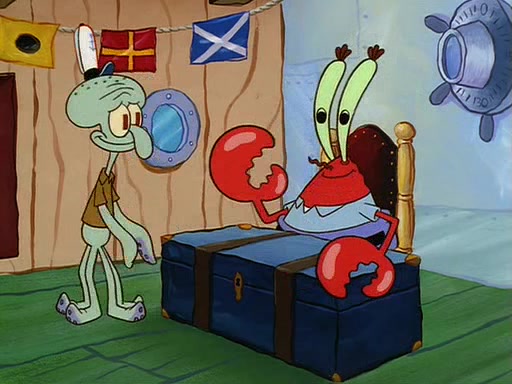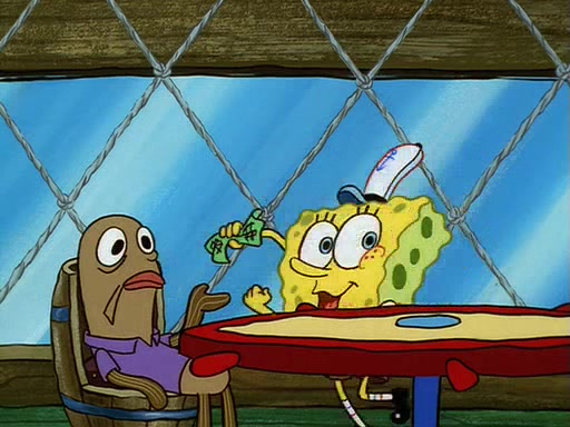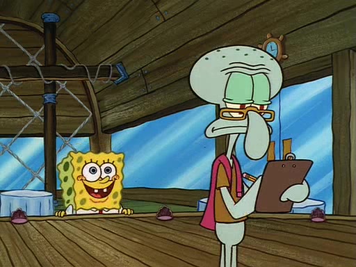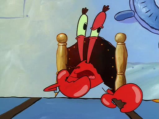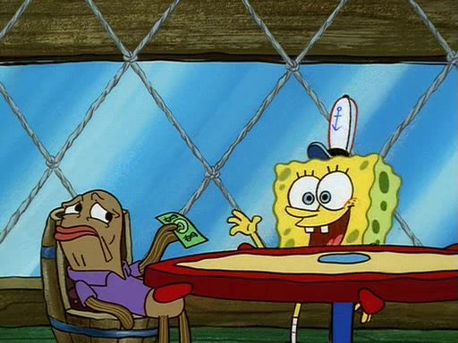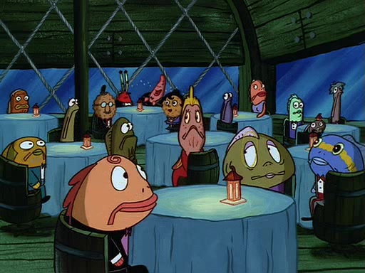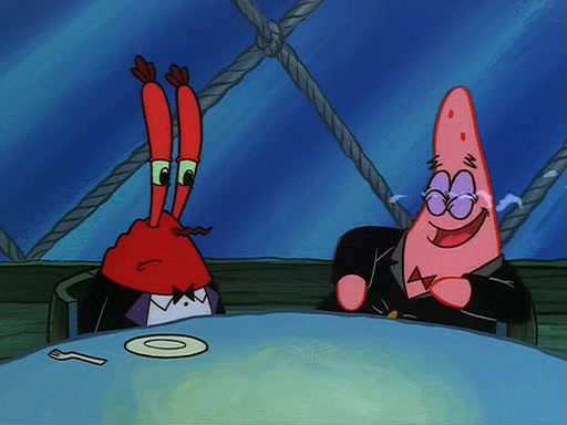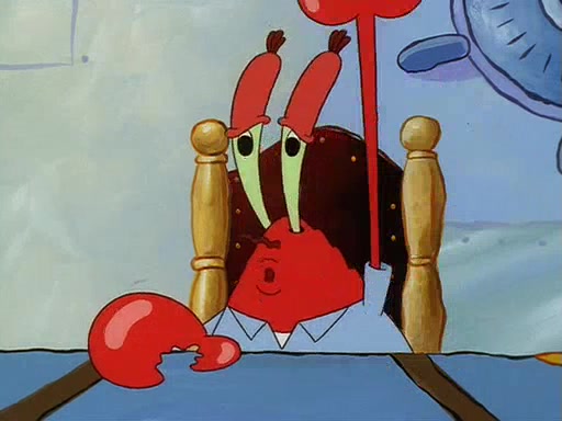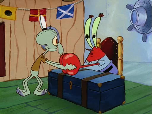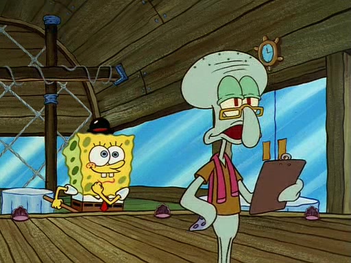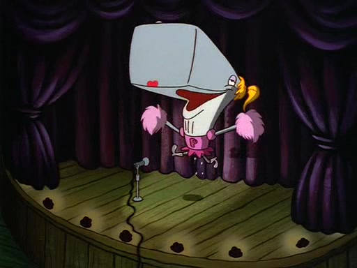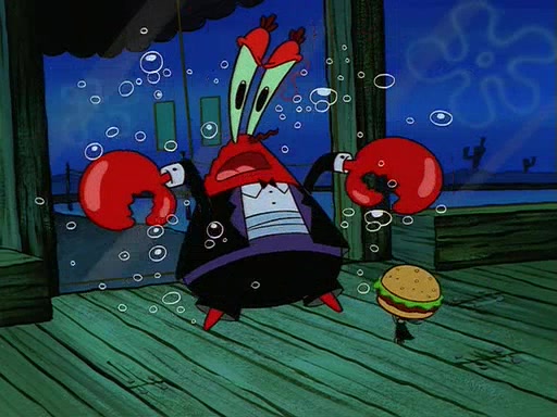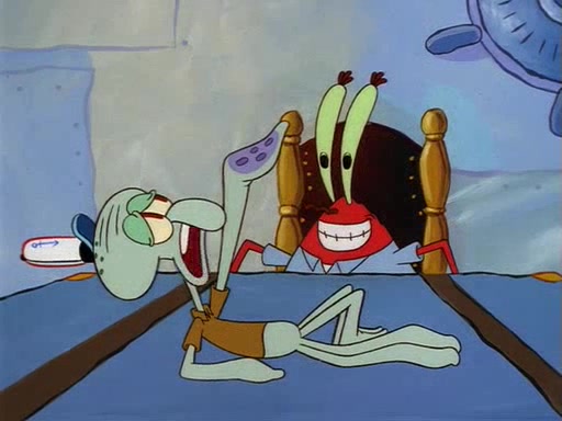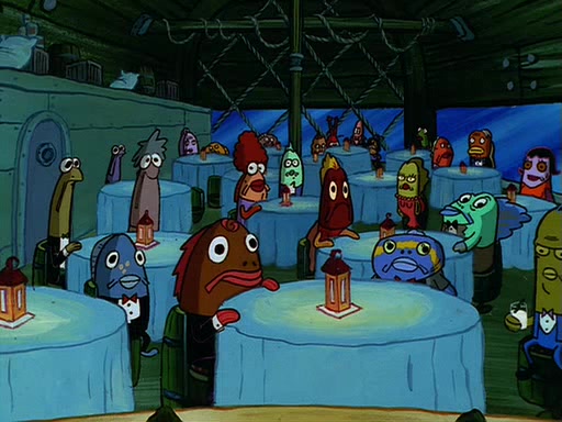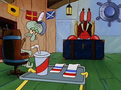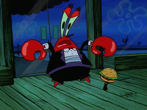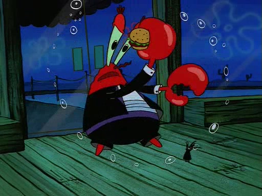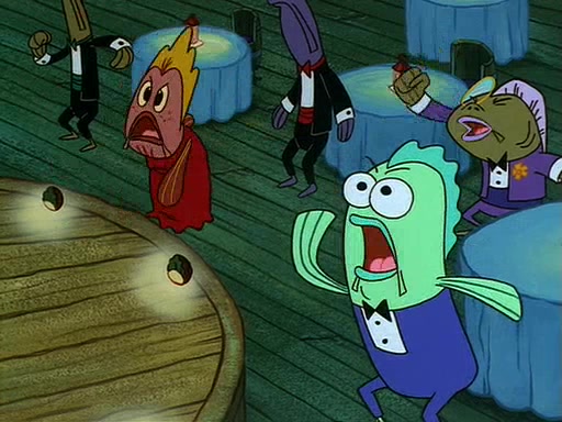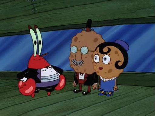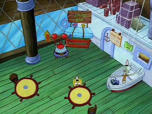 As Mr. Krabs stores the penny away into his vault, he gives his two employees the bad news: Profits are way down this month, and they need a gimmick to bring in customers. Asking for ideas results in apathy from Squidward and increasingly absurd ideas from SpongeBob (including a free pair of socks with each purchase, "Double Patty Midnight Madness", and giving a free drink to the customer who comes in with a mouthful of clams). After Mr. Krabs points out that he was thinking along the lines of "live entertainment", Squidward hits a brainstorm: the first Krusty Krab Talent Show, with him as the host!