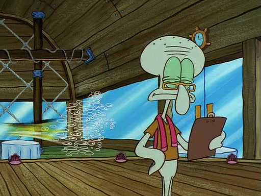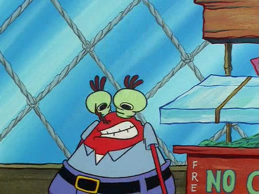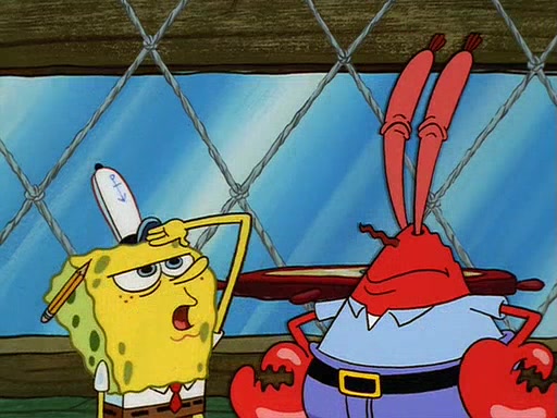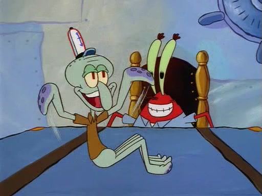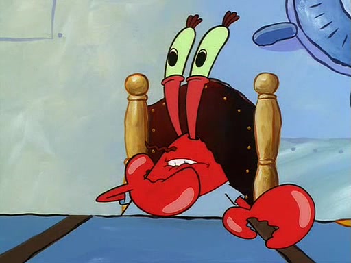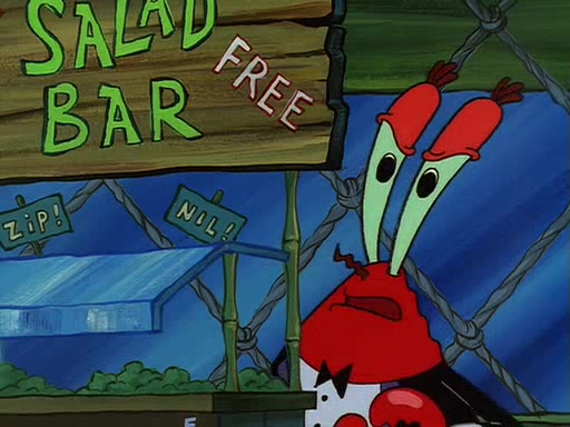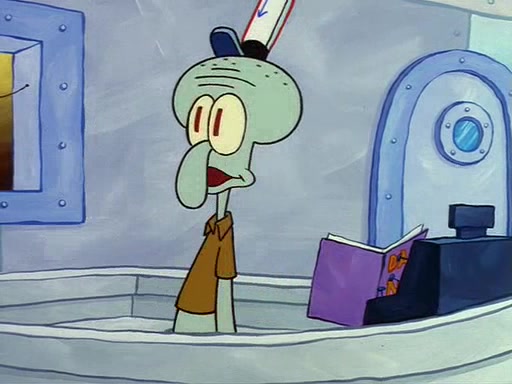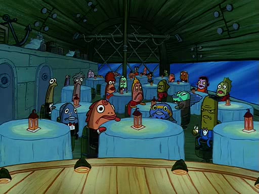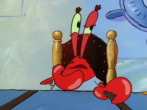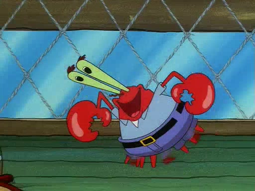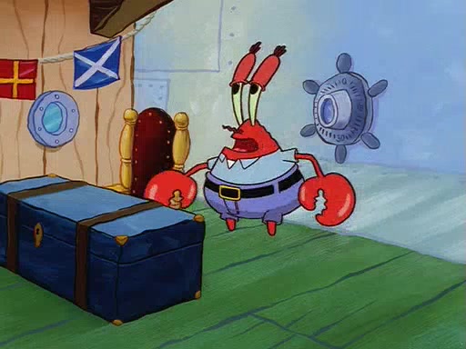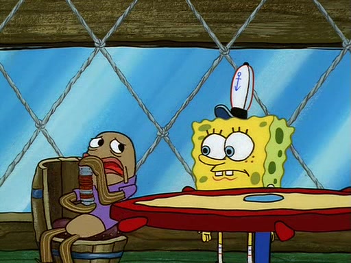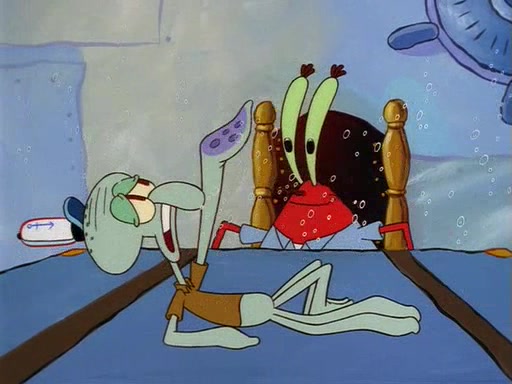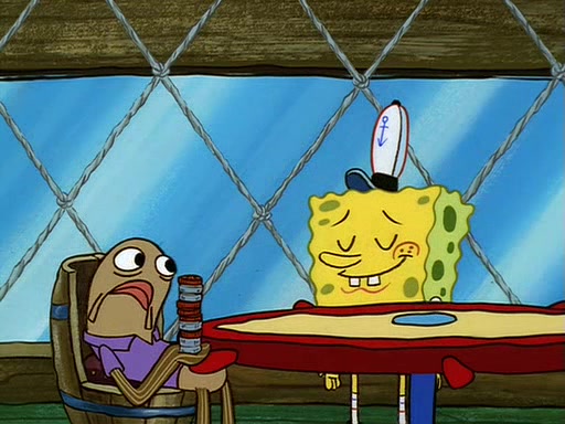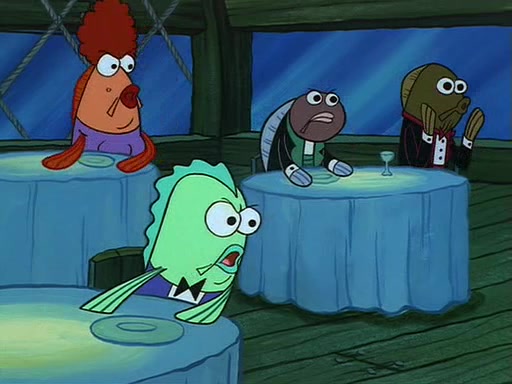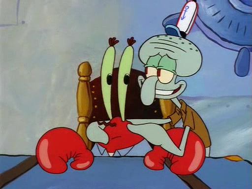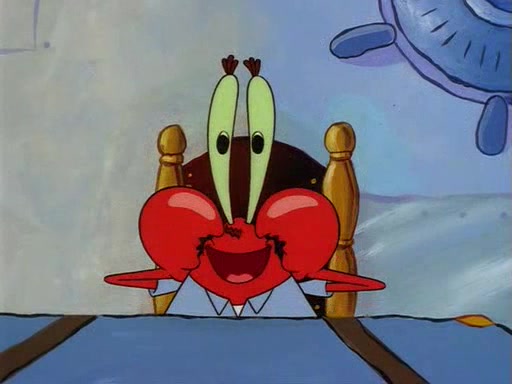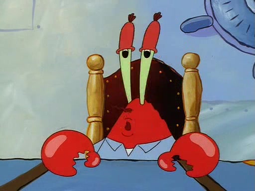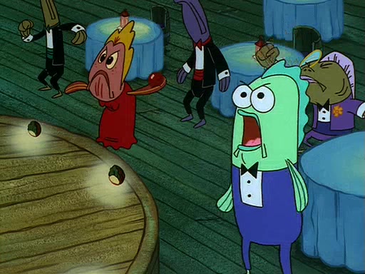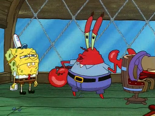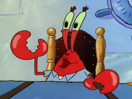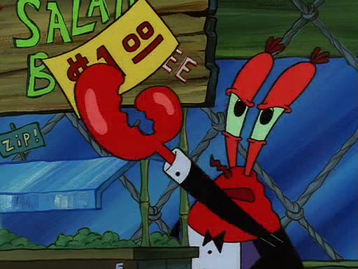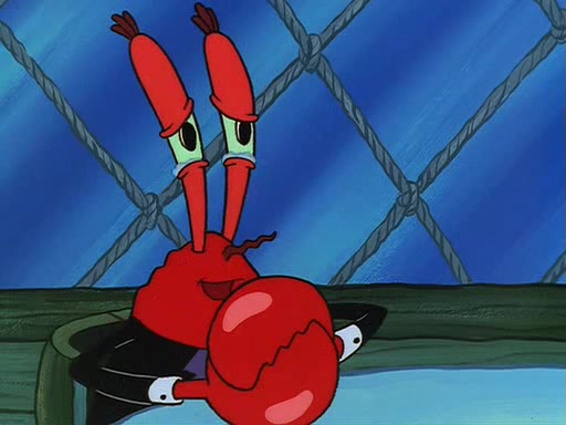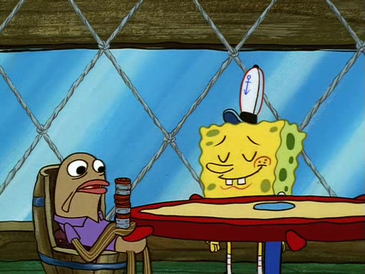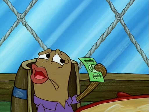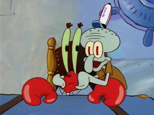 As Mr. Krabs stores the penny away into his vault, he gives his two employees the bad news: Profits are way down this month, and they need a gimmick to bring in customers. Asking for ideas results in apathy from Squidward and increasingly absurd ideas from SpongeBob (including a free pair of socks with each purchase, "Double Patty Midnight Madness", and giving a free drink to the customer who comes in with a mouthful of clams). After Mr. Krabs points out that he was thinking along the lines of "live entertainment", Squidward hits a brainstorm: the first Krusty Krab Talent Show, with him as the host!