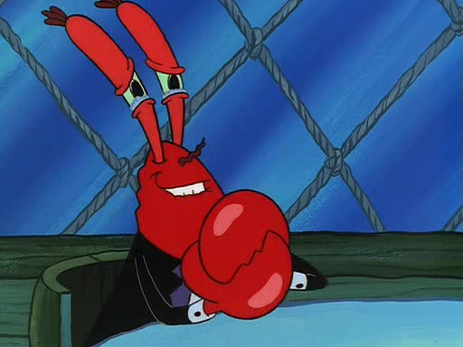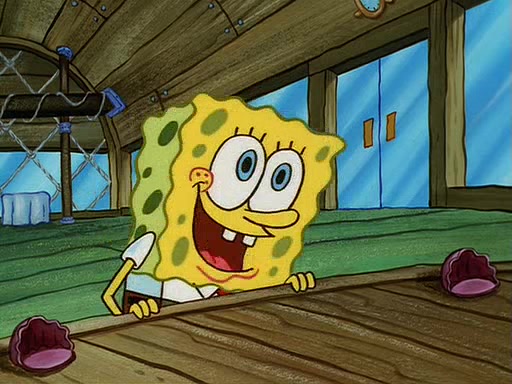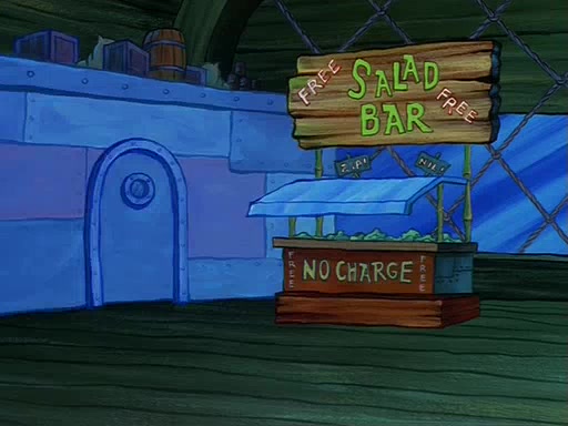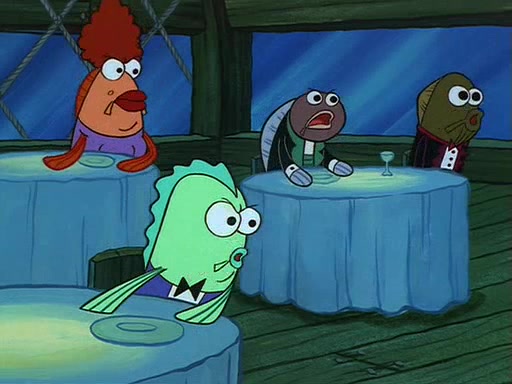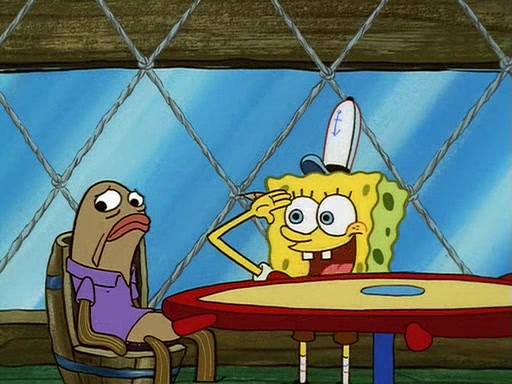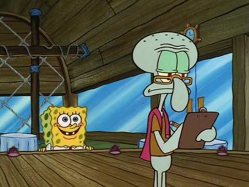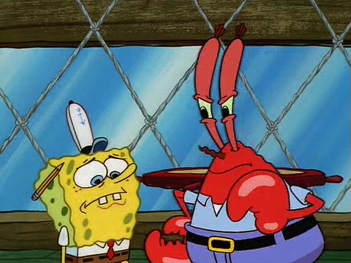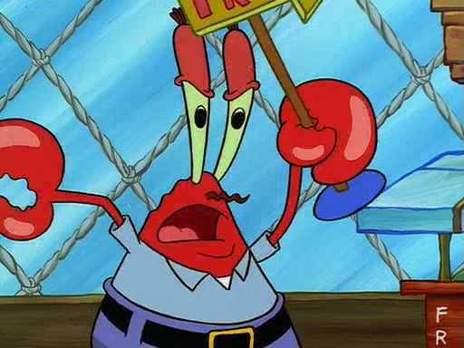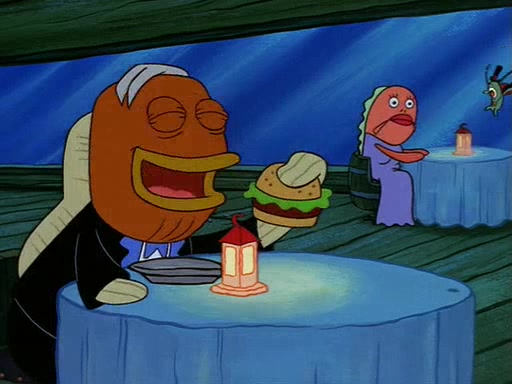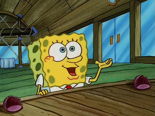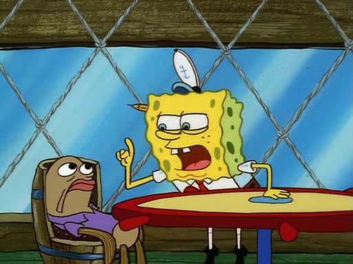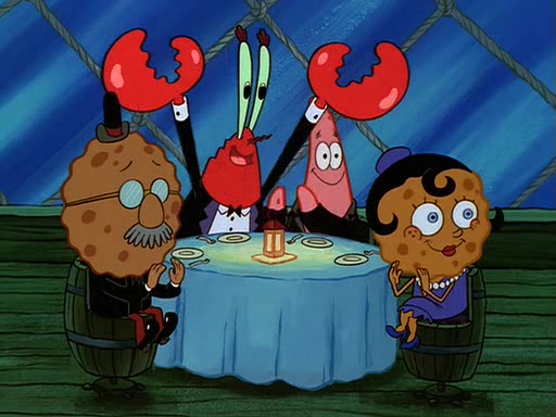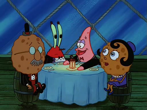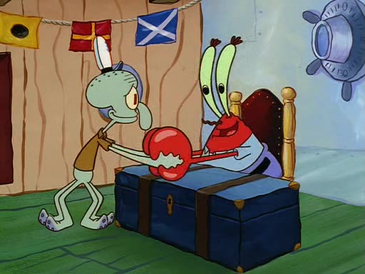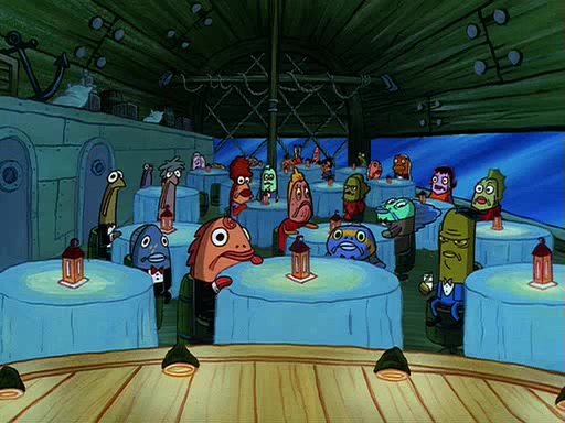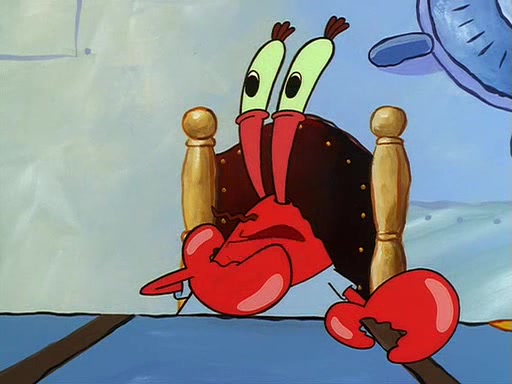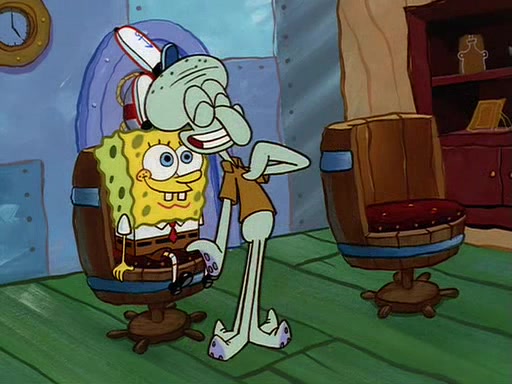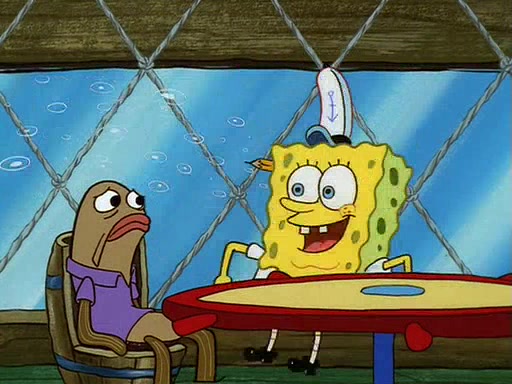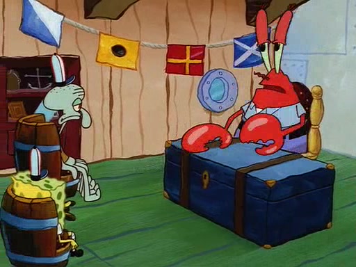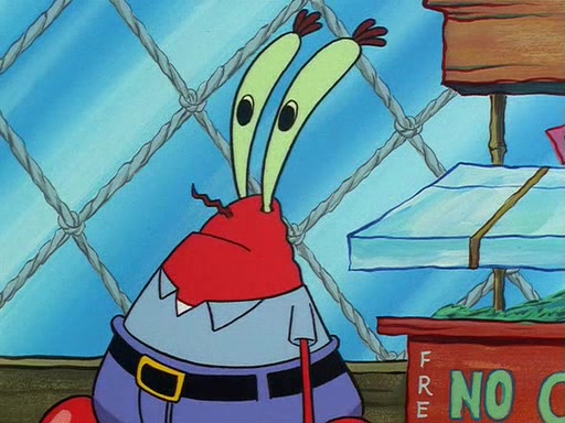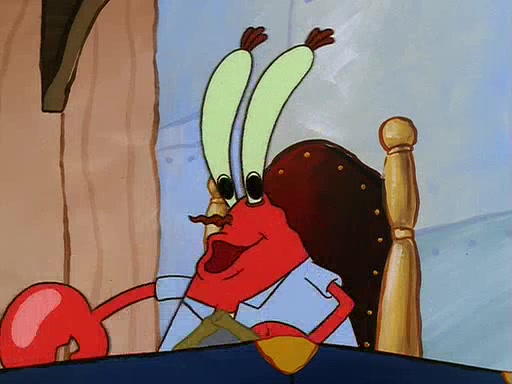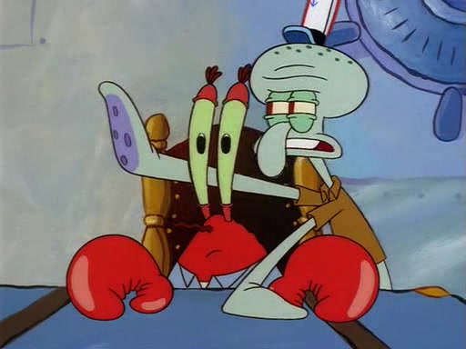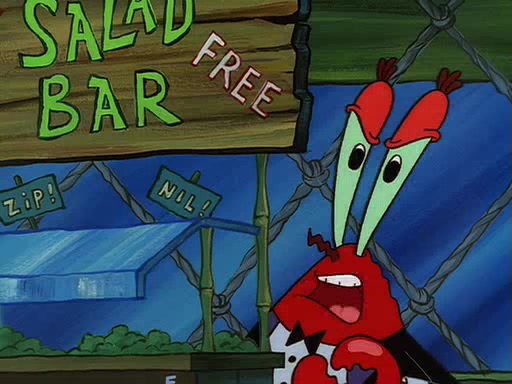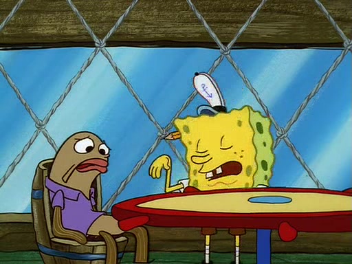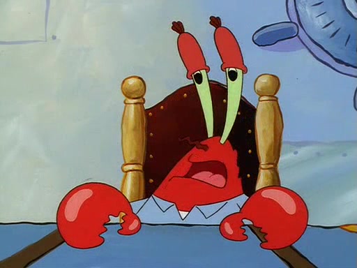 As Mr. Krabs stores the penny away into his vault, he gives his two employees the bad news: Profits are way down this month, and they need a gimmick to bring in customers. Asking for ideas results in apathy from Squidward and increasingly absurd ideas from SpongeBob (including a free pair of socks with each purchase, "Double Patty Midnight Madness", and giving a free drink to the customer who comes in with a mouthful of clams). After Mr. Krabs points out that he was thinking along the lines of "live entertainment", Squidward hits a brainstorm: the first Krusty Krab Talent Show, with him as the host!