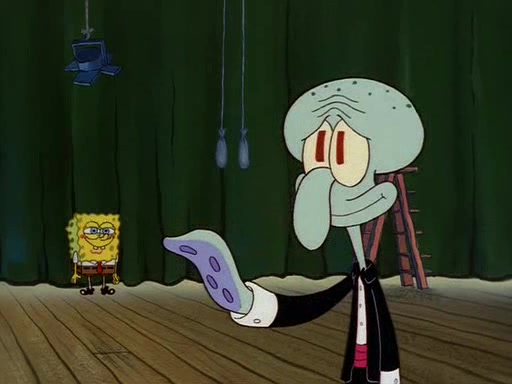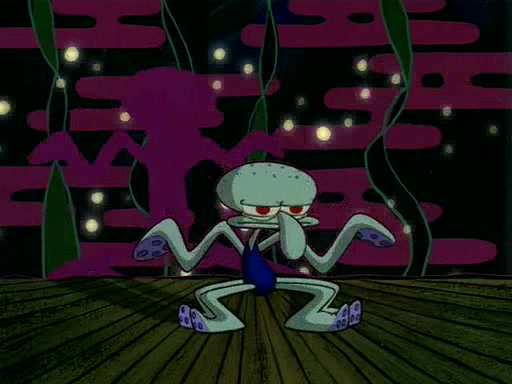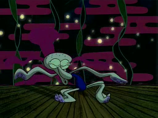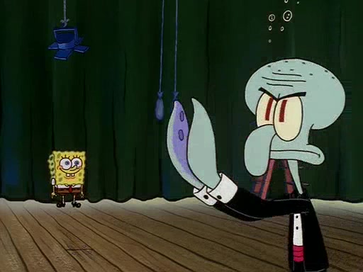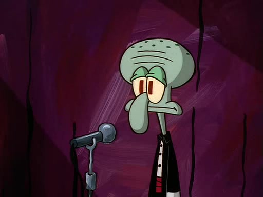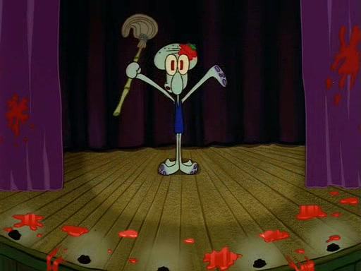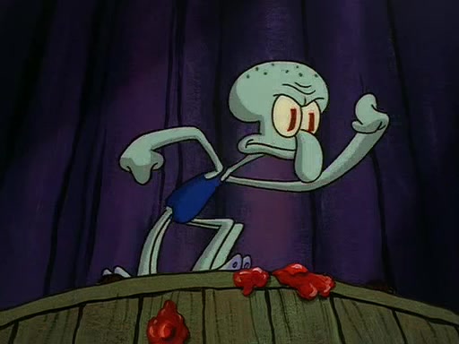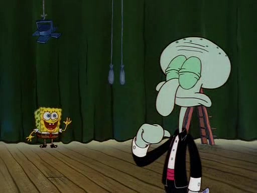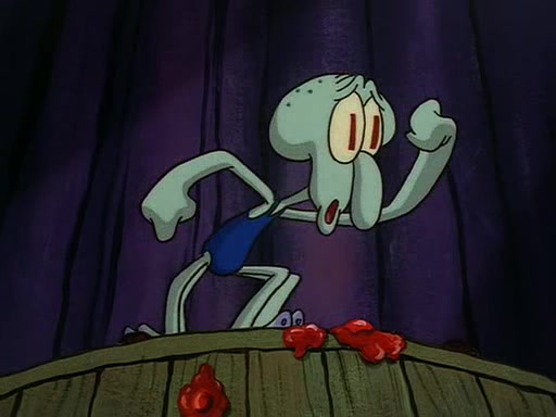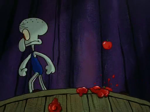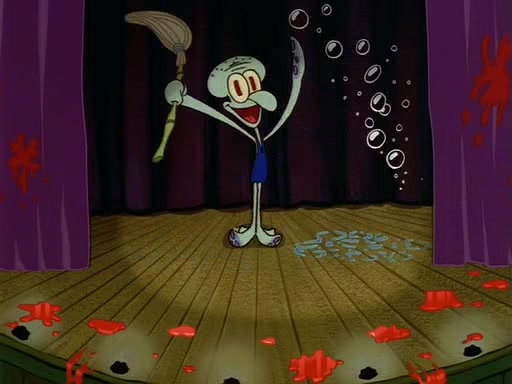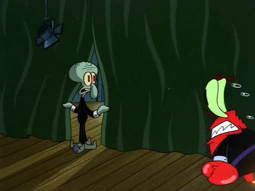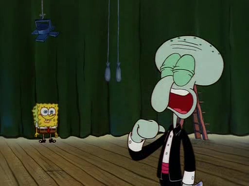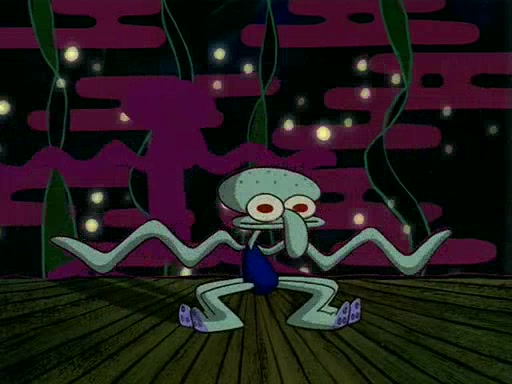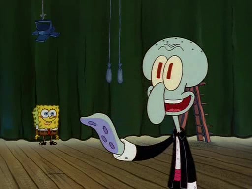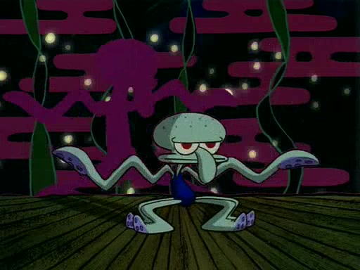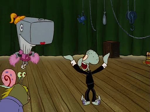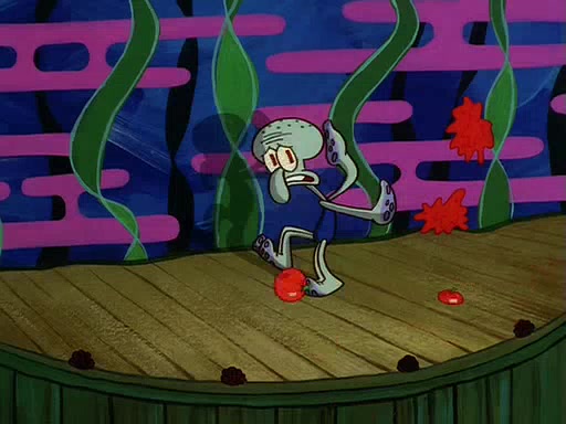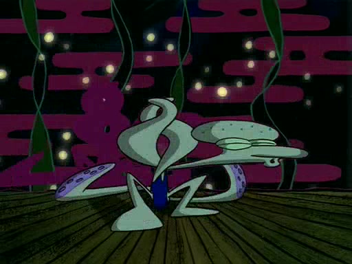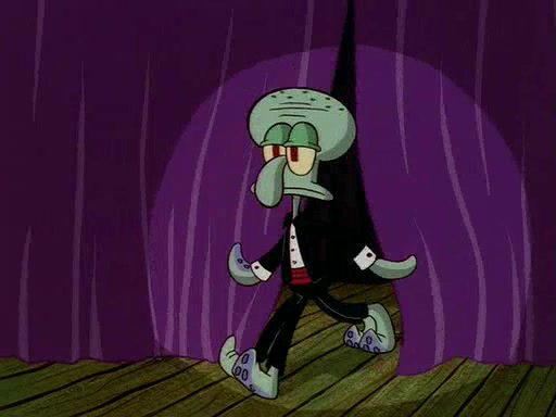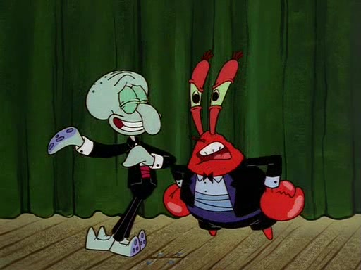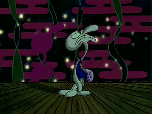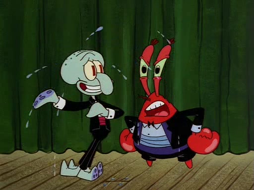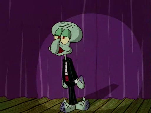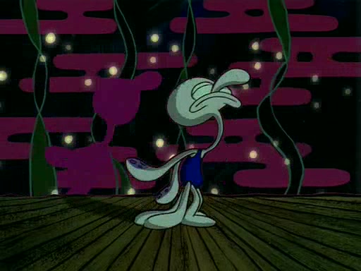 The crowd by this point is getting fed up with the terrible acts, and Mr. Krabs storms backstage, angry at the lack of good responses. Squidward temporarily placates him by claiming he saved the best act for last; it's finally his time to shine! After some buildup with spotlights, Squidward comes in his dancing gear, to looks of confusion from the audience. Squidward starts out dancing to orchestral music, before the music suddenly changes into trance; Squidward's dancing also becomes incredibly bizarre. Unfortunately for him, his time in the spotlight comes to an abrupt end as two audience members pelt him with tomatoes from the free salad bar. Mr. Krabs, realizing he's losing money to this deal, quickly slaps on a one dollar sign to the front of the free salad bar to cash in on the audience's rage. Squidward tells the audience they have no appreciation for his talent, only to be coldly rebuffed. Furious, he storms backstage, where a waiting SpongeBob asks whether he can go on now. Squidward tells him the show is over, much to the sponge's confusion.