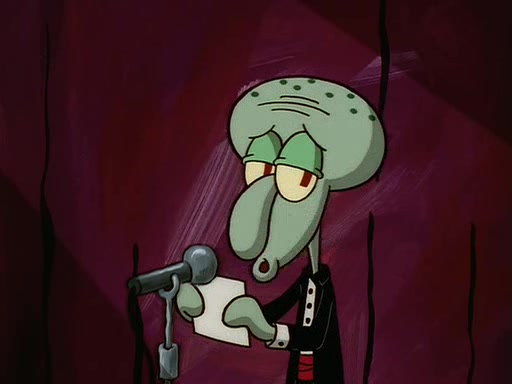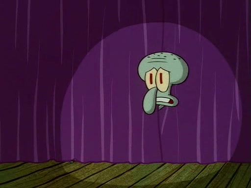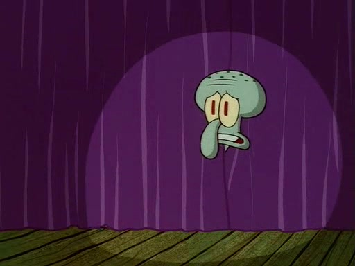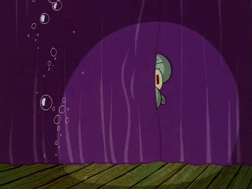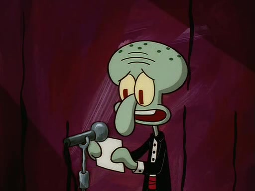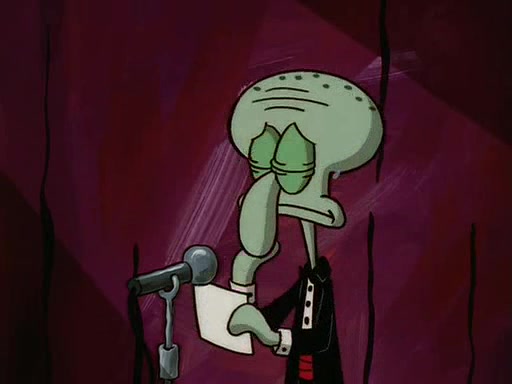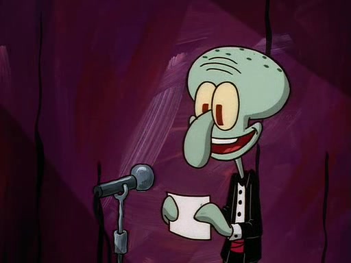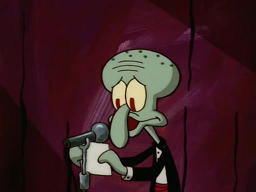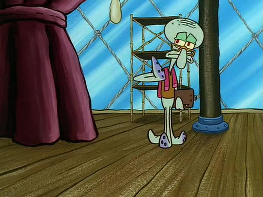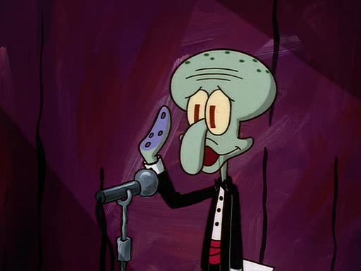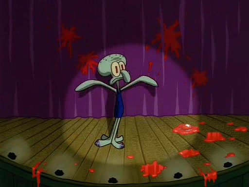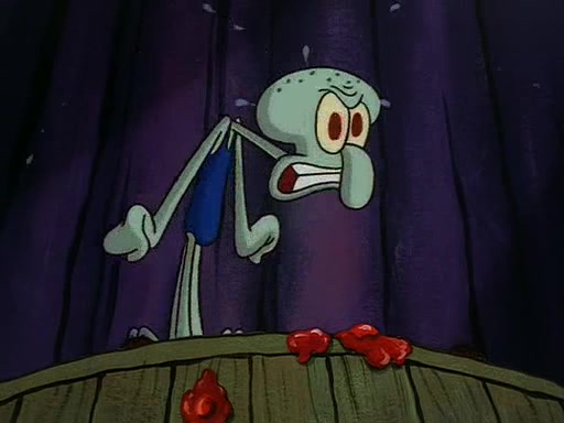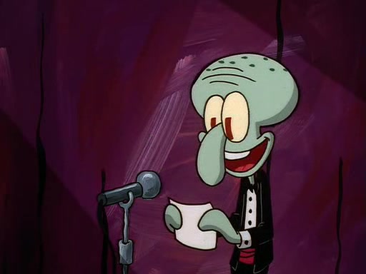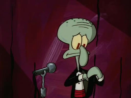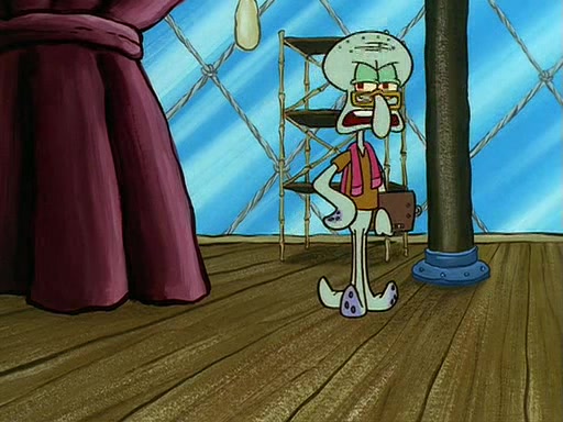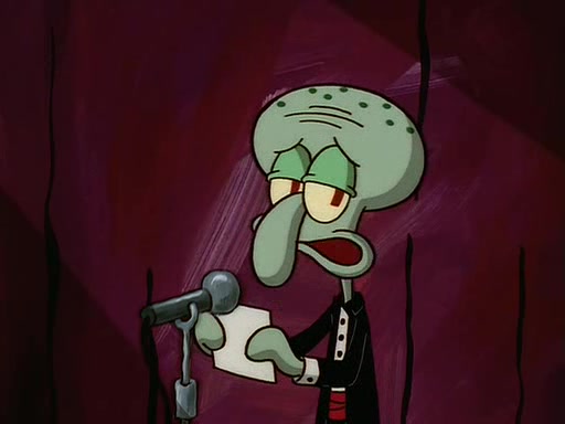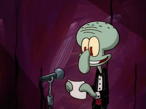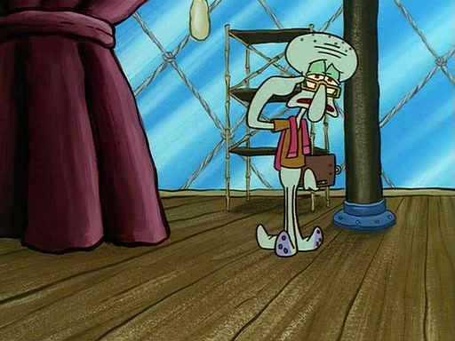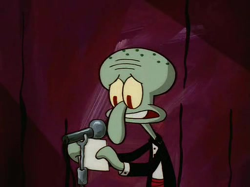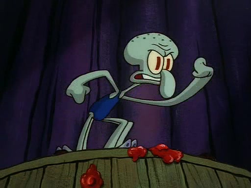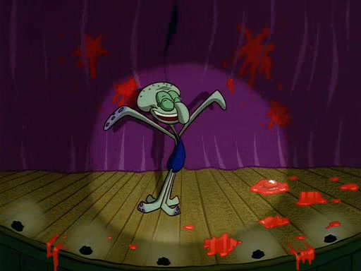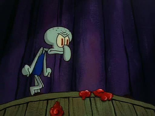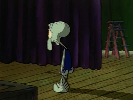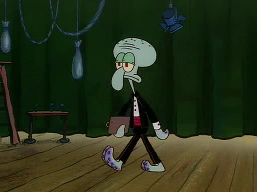 The crowd by this point is getting fed up with the terrible acts, and Mr. Krabs storms backstage, angry at the lack of good responses. Squidward temporarily placates him by claiming he saved the best act for last; it's finally his time to shine! After some buildup with spotlights, Squidward comes in his dancing gear, to looks of confusion from the audience. Squidward starts out dancing to orchestral music, before the music suddenly changes into trance; Squidward's dancing also becomes incredibly bizarre. Unfortunately for him, his time in the spotlight comes to an abrupt end as two audience members pelt him with tomatoes from the free salad bar. Mr. Krabs, realizing he's losing money to this deal, quickly slaps on a one dollar sign to the front of the free salad bar to cash in on the audience's rage. Squidward tells the audience they have no appreciation for his talent, only to be coldly rebuffed. Furious, he storms backstage, where a waiting SpongeBob asks whether he can go on now. Squidward tells him the show is over, much to the sponge's confusion.