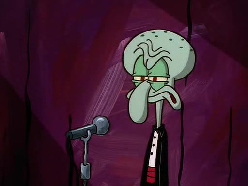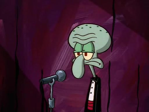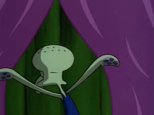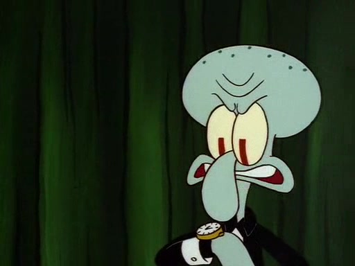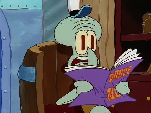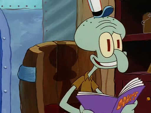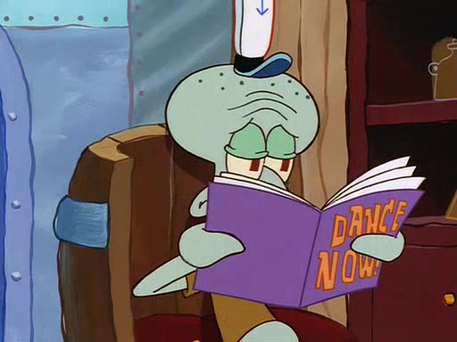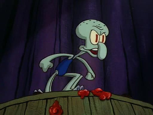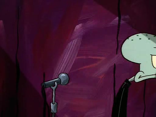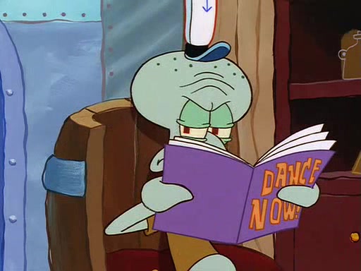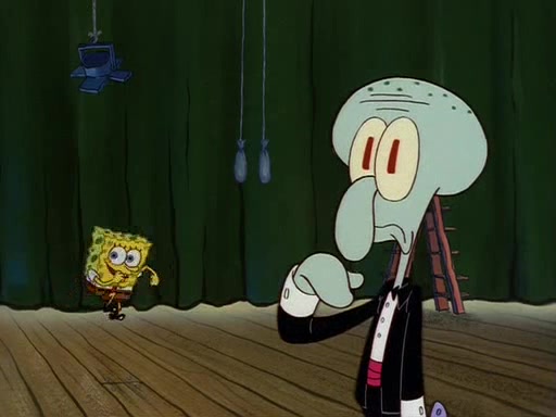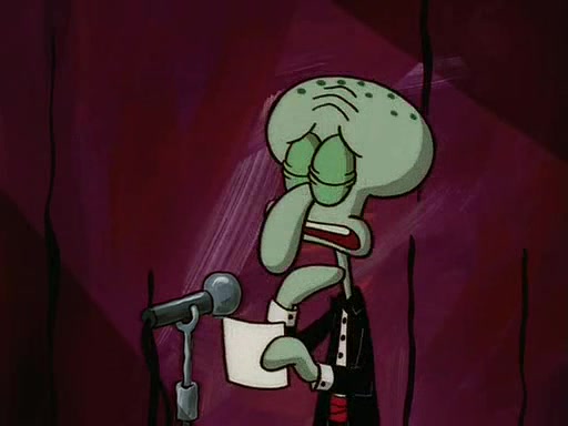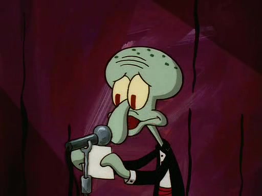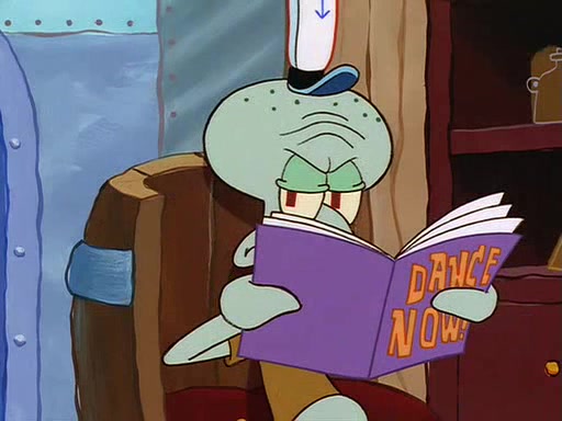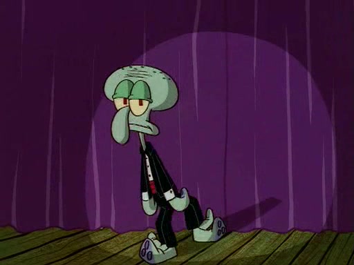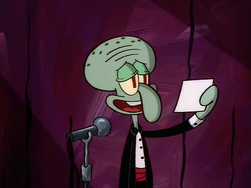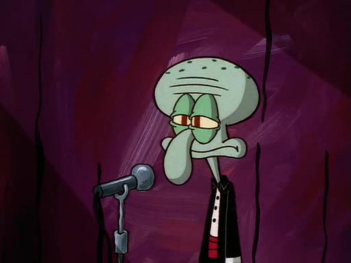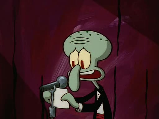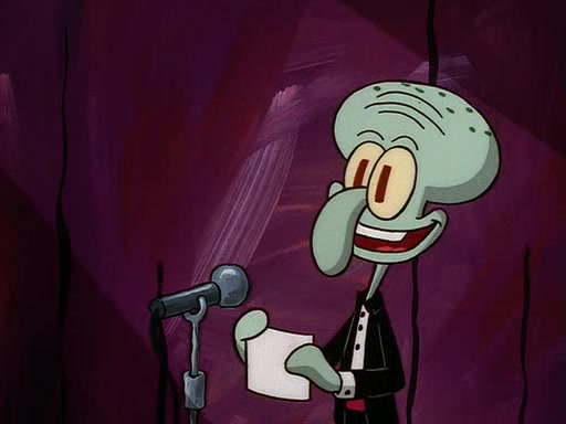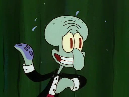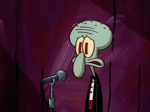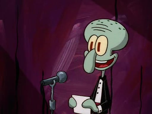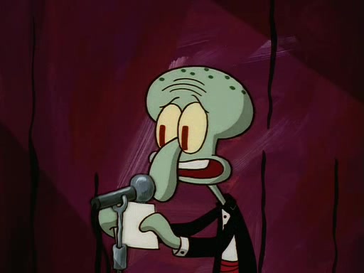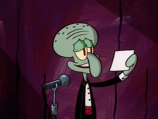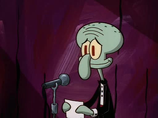 The crowd by this point is getting fed up with the terrible acts, and Mr. Krabs storms backstage, angry at the lack of good responses. Squidward temporarily placates him by claiming he saved the best act for last; it's finally his time to shine! After some buildup with spotlights, Squidward comes in his dancing gear, to looks of confusion from the audience. Squidward starts out dancing to orchestral music, before the music suddenly changes into trance; Squidward's dancing also becomes incredibly bizarre. Unfortunately for him, his time in the spotlight comes to an abrupt end as two audience members pelt him with tomatoes from the free salad bar. Mr. Krabs, realizing he's losing money to this deal, quickly slaps on a one dollar sign to the front of the free salad bar to cash in on the audience's rage. Squidward tells the audience they have no appreciation for his talent, only to be coldly rebuffed. Furious, he storms backstage, where a waiting SpongeBob asks whether he can go on now. Squidward tells him the show is over, much to the sponge's confusion.