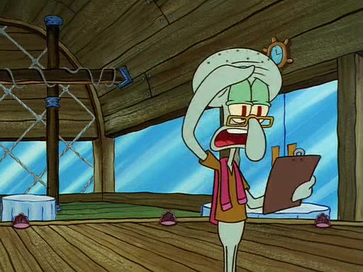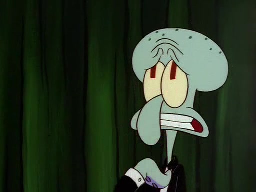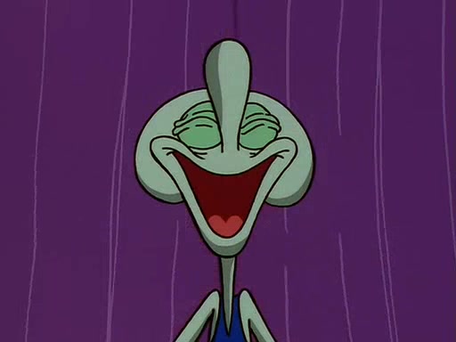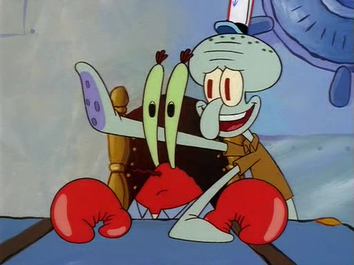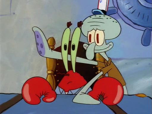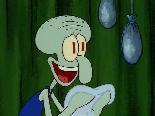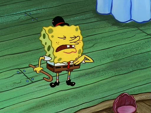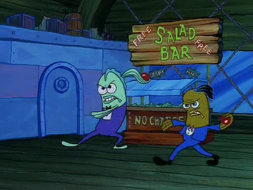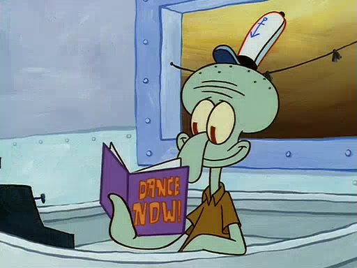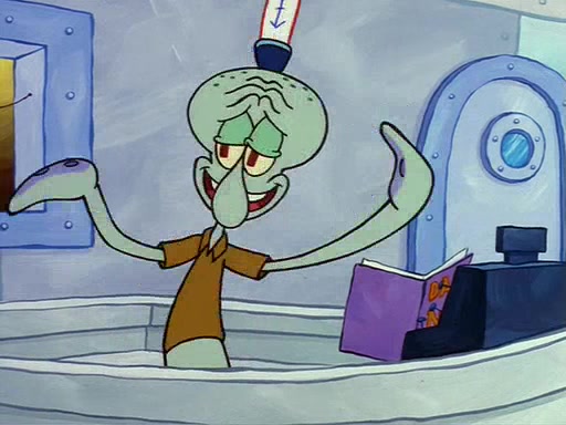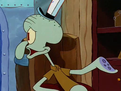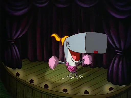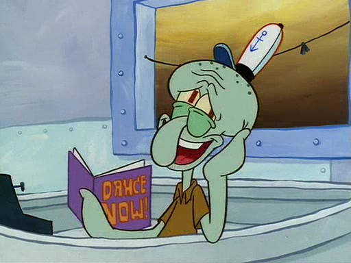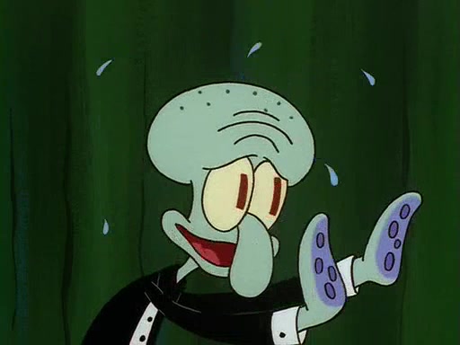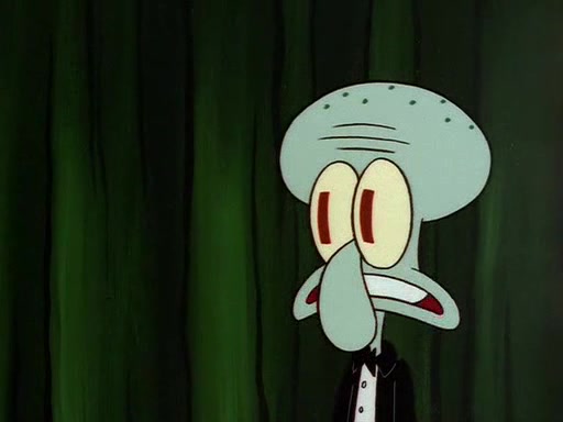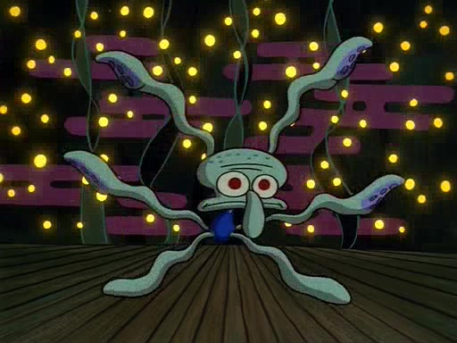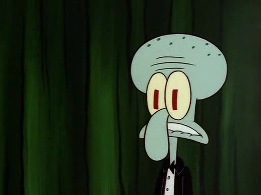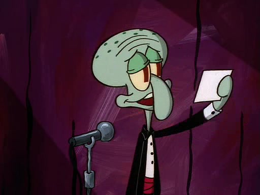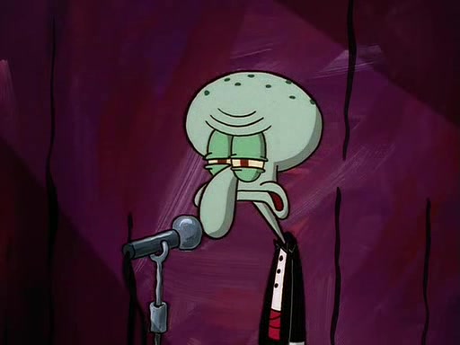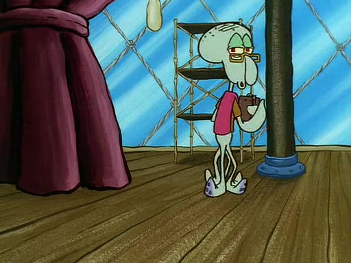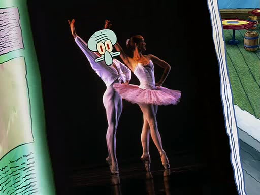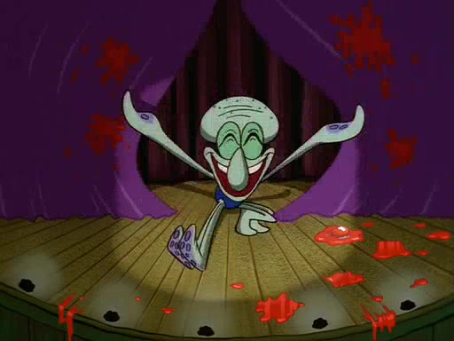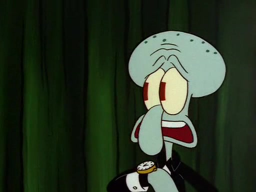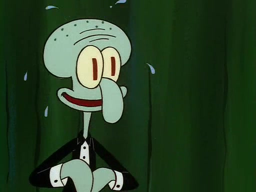 The crowd by this point is getting fed up with the terrible acts, and Mr. Krabs storms backstage, angry at the lack of good responses. Squidward temporarily placates him by claiming he saved the best act for last; it's finally his time to shine! After some buildup with spotlights, Squidward comes in his dancing gear, to looks of confusion from the audience. Squidward starts out dancing to orchestral music, before the music suddenly changes into trance; Squidward's dancing also becomes incredibly bizarre. Unfortunately for him, his time in the spotlight comes to an abrupt end as two audience members pelt him with tomatoes from the free salad bar. Mr. Krabs, realizing he's losing money to this deal, quickly slaps on a one dollar sign to the front of the free salad bar to cash in on the audience's rage. Squidward tells the audience they have no appreciation for his talent, only to be coldly rebuffed. Furious, he storms backstage, where a waiting SpongeBob asks whether he can go on now. Squidward tells him the show is over, much to the sponge's confusion.