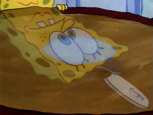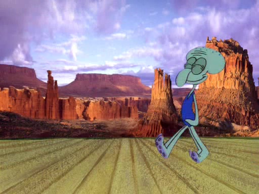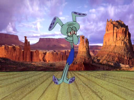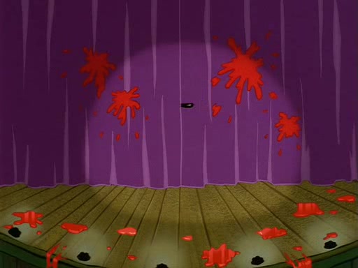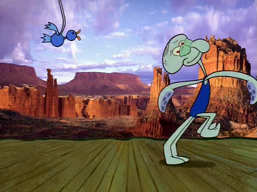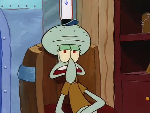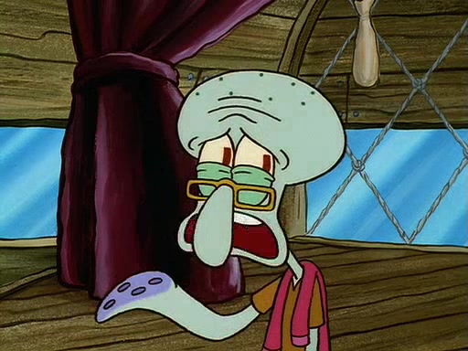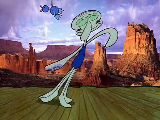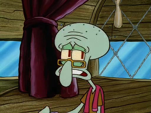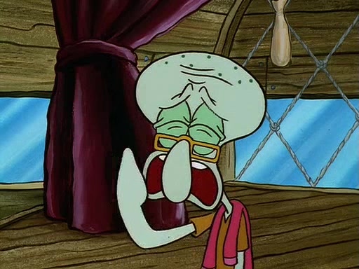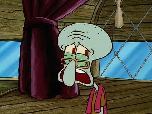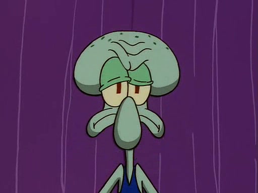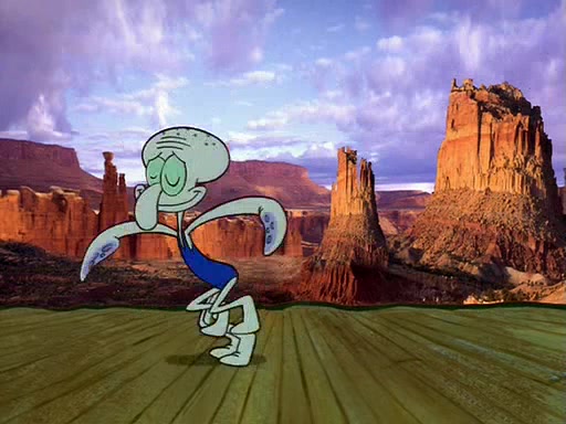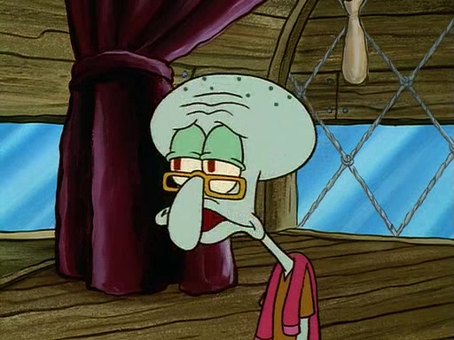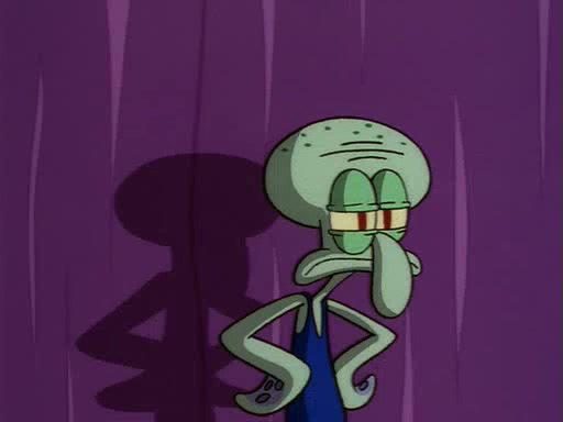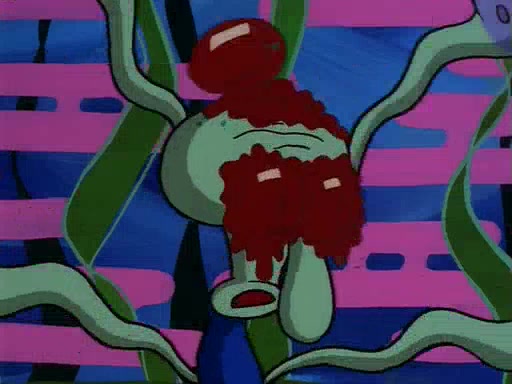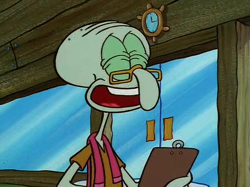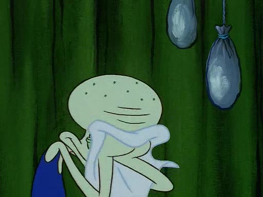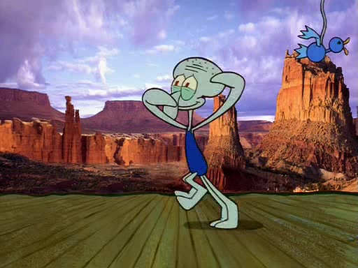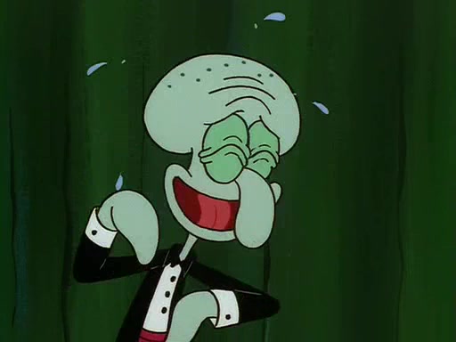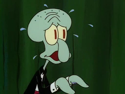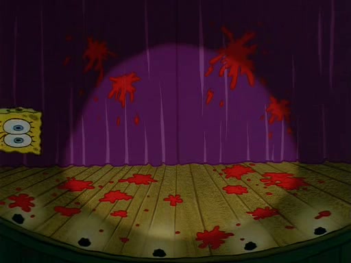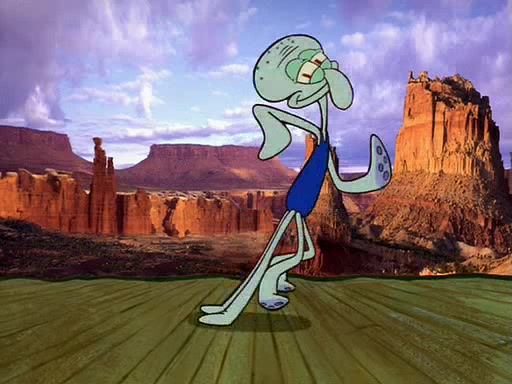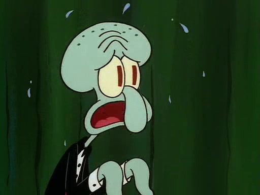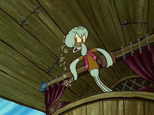 The crowd by this point is getting fed up with the terrible acts, and Mr. Krabs storms backstage, angry at the lack of good responses. Squidward temporarily placates him by claiming he saved the best act for last; it's finally his time to shine! After some buildup with spotlights, Squidward comes in his dancing gear, to looks of confusion from the audience. Squidward starts out dancing to orchestral music, before the music suddenly changes into trance; Squidward's dancing also becomes incredibly bizarre. Unfortunately for him, his time in the spotlight comes to an abrupt end as two audience members pelt him with tomatoes from the free salad bar. Mr. Krabs, realizing he's losing money to this deal, quickly slaps on a one dollar sign to the front of the free salad bar to cash in on the audience's rage. Squidward tells the audience they have no appreciation for his talent, only to be coldly rebuffed. Furious, he storms backstage, where a waiting SpongeBob asks whether he can go on now. Squidward tells him the show is over, much to the sponge's confusion.