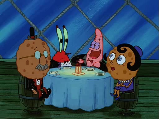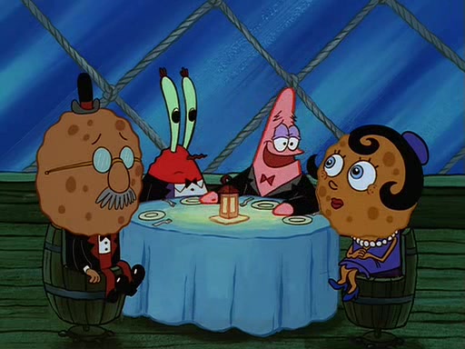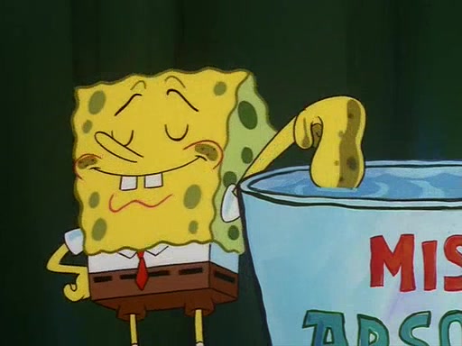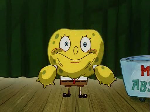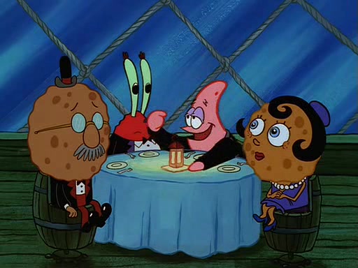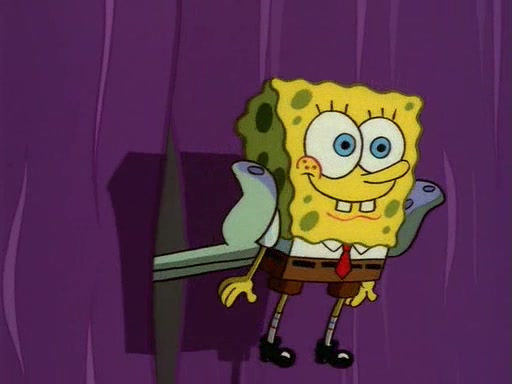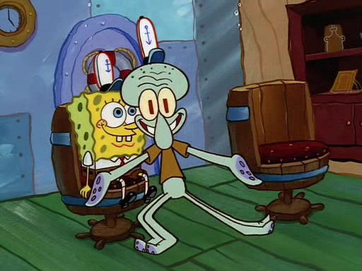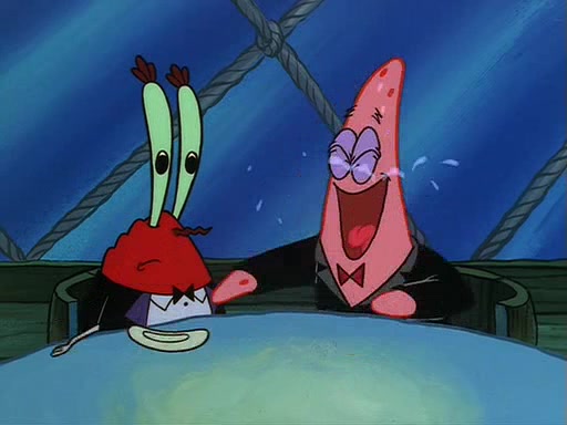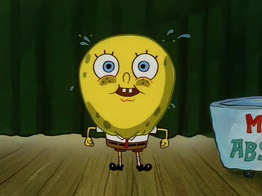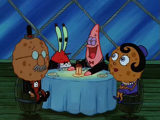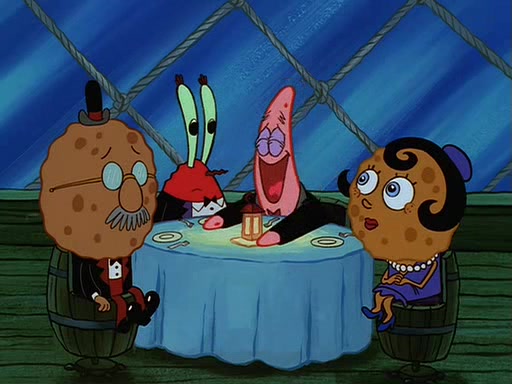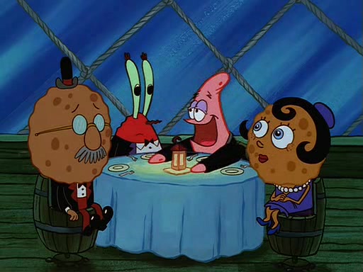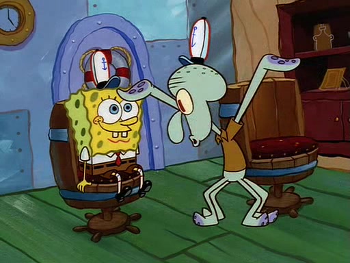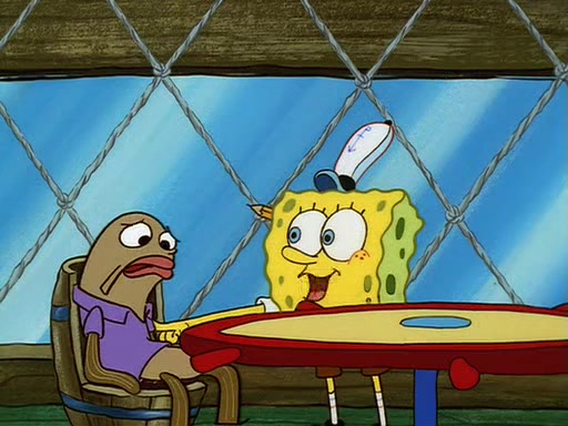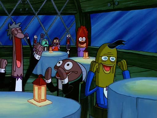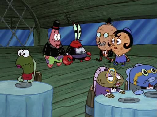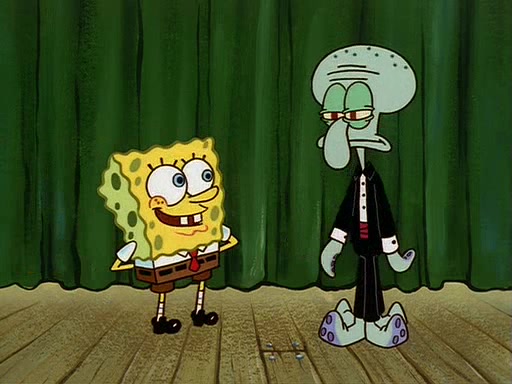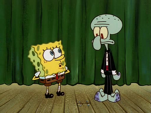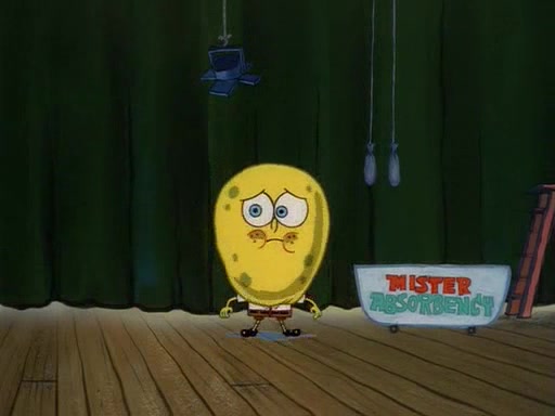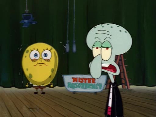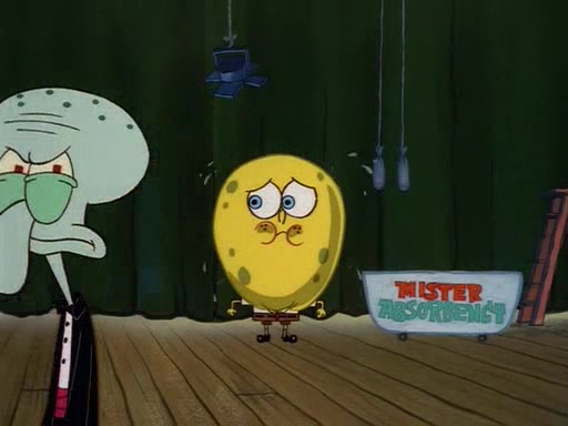It's now night-time, and the Krusty Krab is packed; even Patrick has come along with SpongeBob's parents, who Mr. Krabs introduces himself to ("Hello! I'm Mr Krabs, and I like money!"). In the backstage, Squidward makes it very clear to everyone else that this is HIS chance to reach stardom, but is interrupted by SpongeBob's newest act: inflating himself with water and showing off his sponge traits. Squidward once again shoots him down, not wanting SpongeBob to ruin his chances at stardom. SpongeBob tearfully begs Squidward to let him on the show, claiming he'll do anything, with the squid relegating him to clean up duty after the show is done. SpongeBob, not realizing this, takes his new "act" with great enthusiasm.