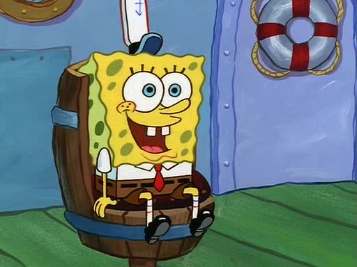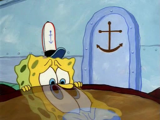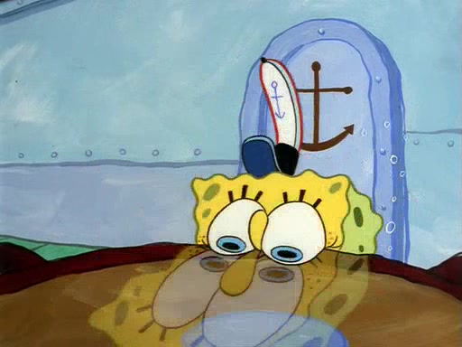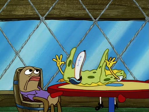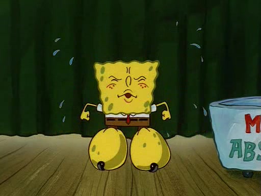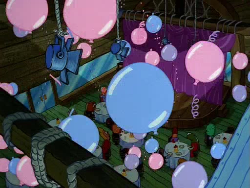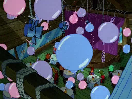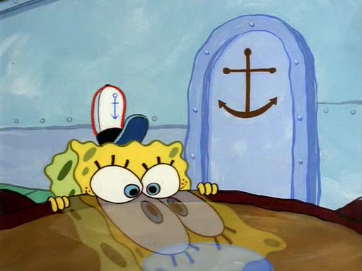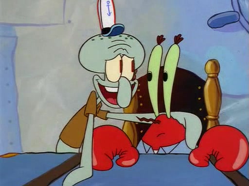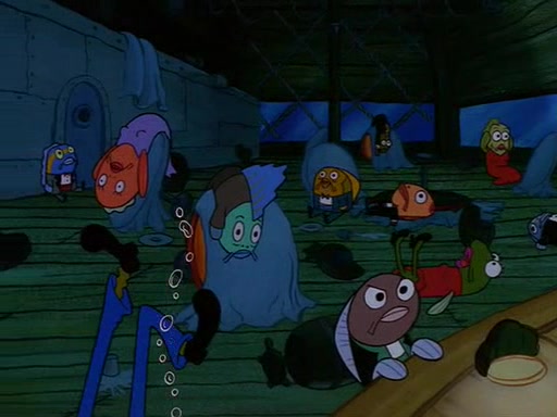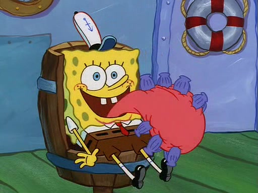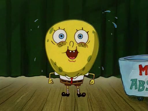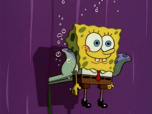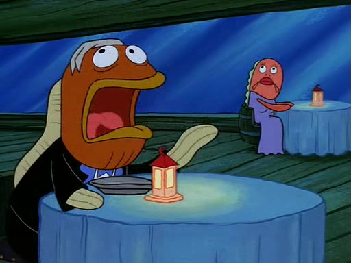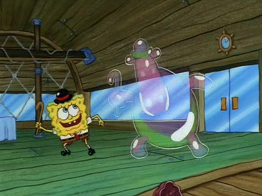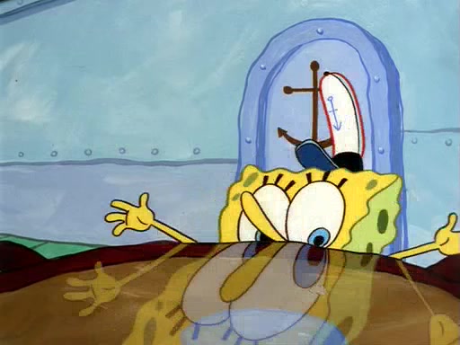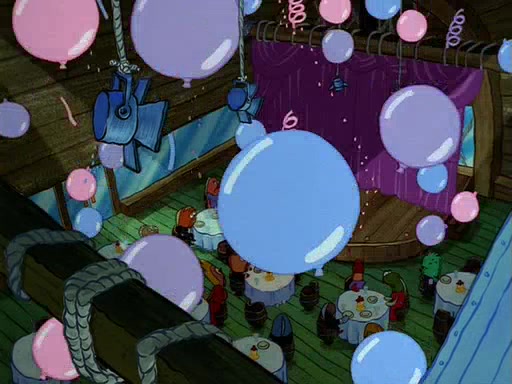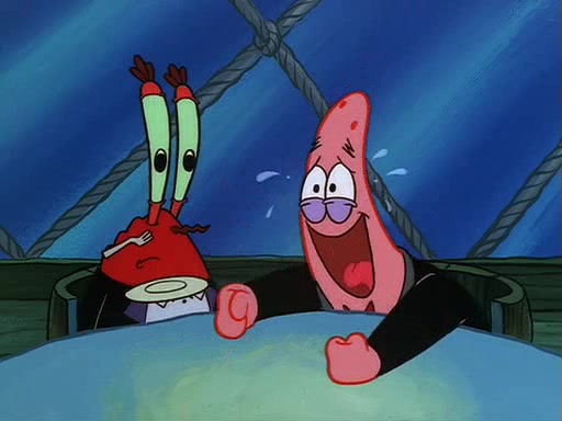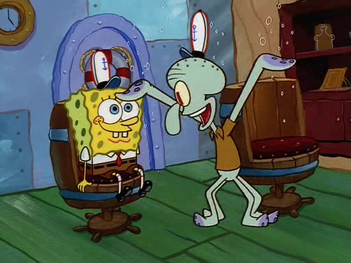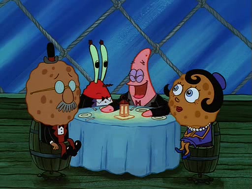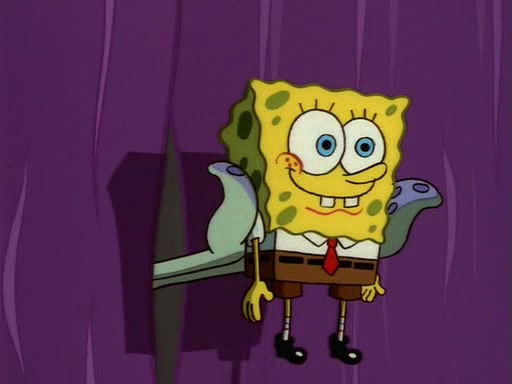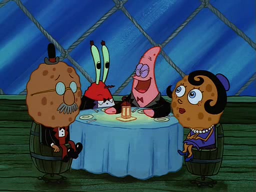 It's now night-time, and the Krusty Krab is packed; even Patrick has come along with SpongeBob's parents, who Mr. Krabs introduces himself to ("Hello! I'm Mr Krabs, and I like money!"). In the backstage, Squidward makes it very clear to everyone else that this is HIS chance to reach stardom, but is interrupted by SpongeBob's newest act: inflating himself with water and showing off his sponge traits. Squidward once again shoots him down, not wanting SpongeBob to ruin his chances at stardom. SpongeBob tearfully begs Squidward to let him on the show, claiming he'll do anything, with the squid relegating him to clean up duty after the show is done. SpongeBob, not realizing this, takes his new "act" with great enthusiasm.