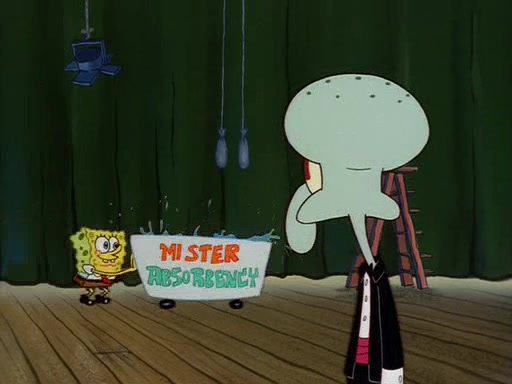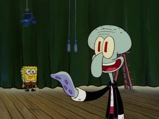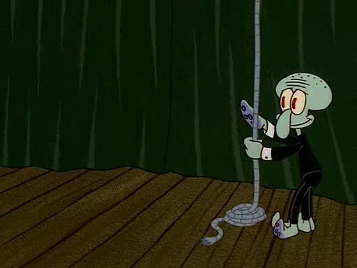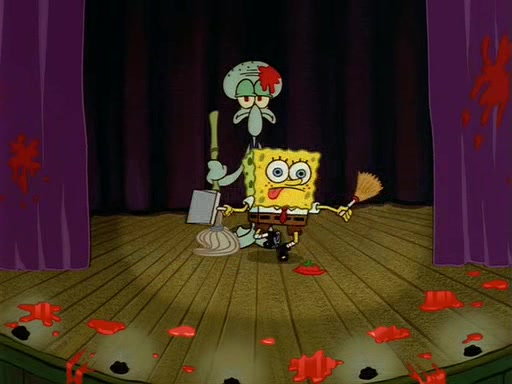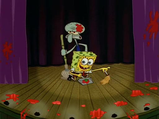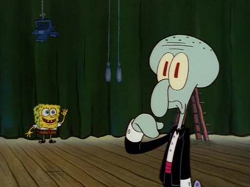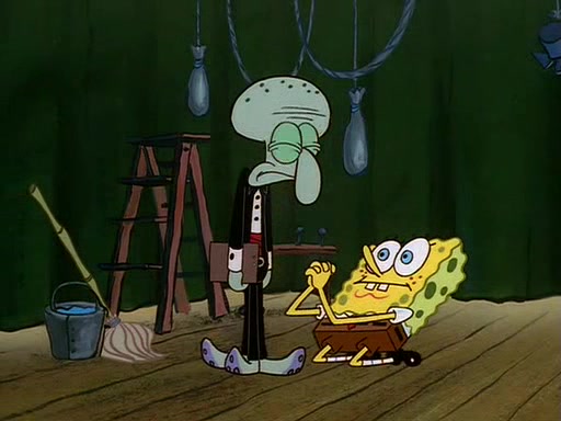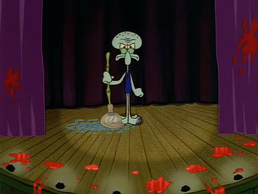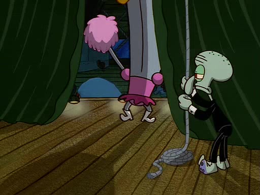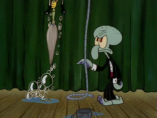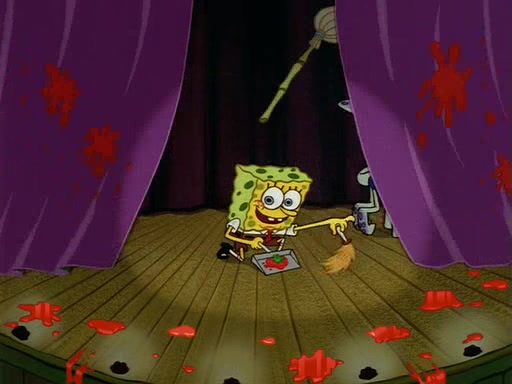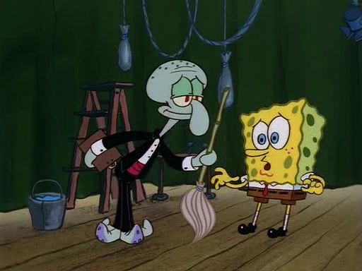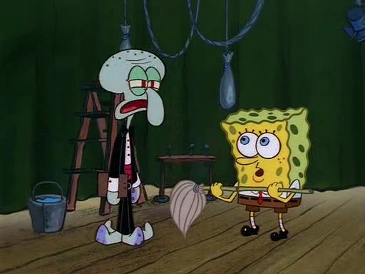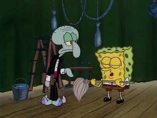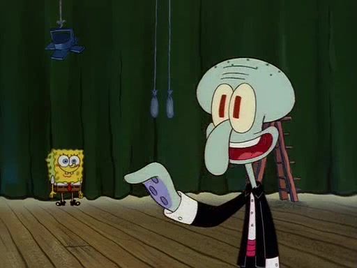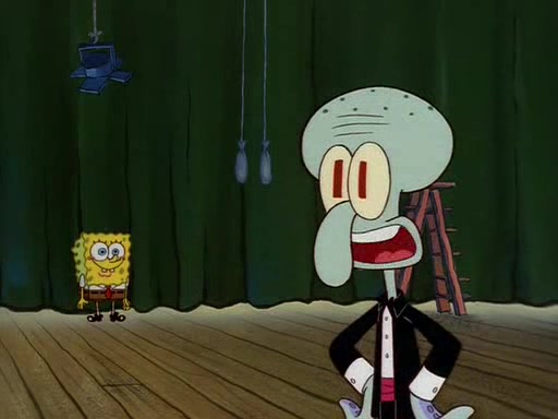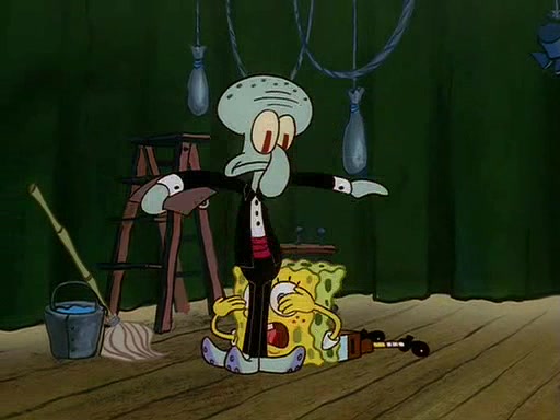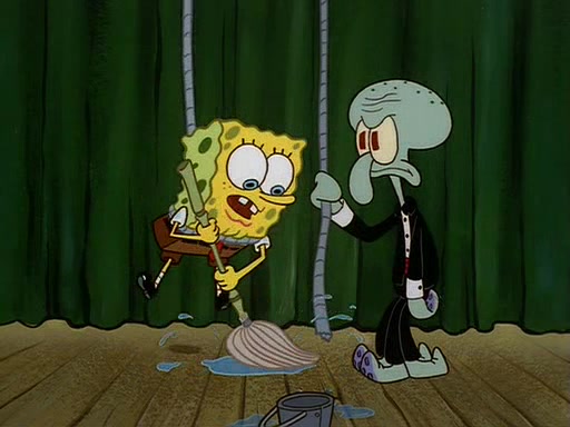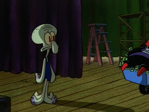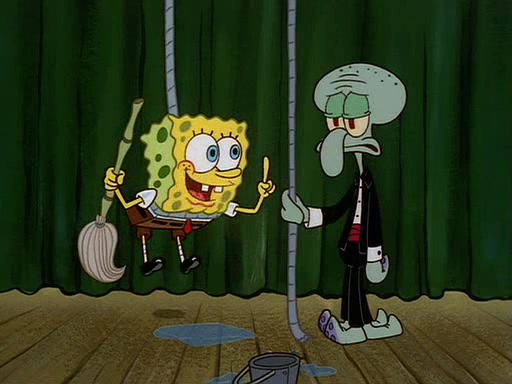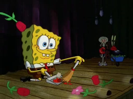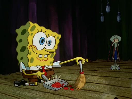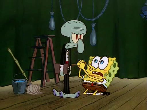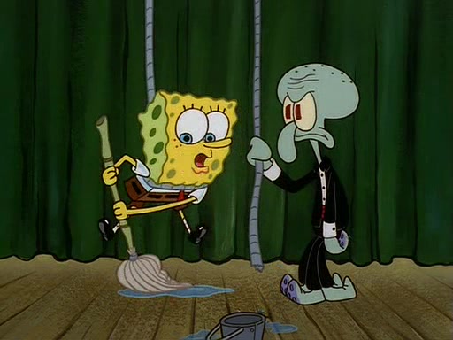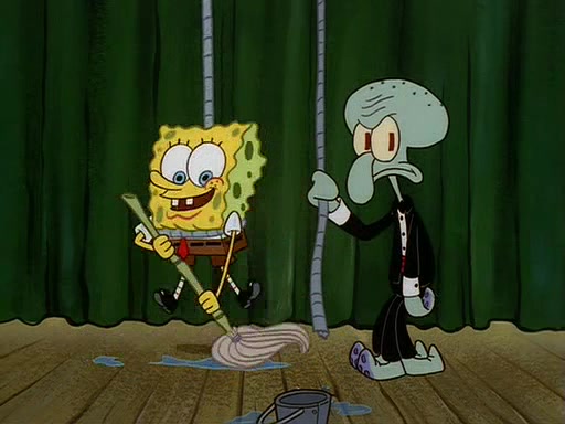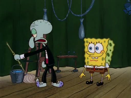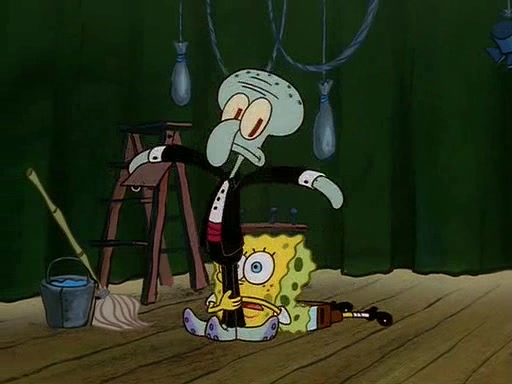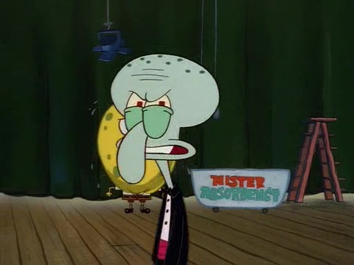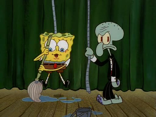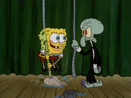 SpongeBob gets to work cleaning the stage, only to receive an unexpected surprise: the audience likes his act! Squidward thinks the audience has changed their mind about him, and charges onstage as SpongeBob leaves...only to be met with silence. He storms off again, and SpongeBob continues cleaning to great applause. Squidward charges in and is once again met by silence. However, he begins to realize that SpongeBob seems to be tied to the audience's sudden change in behavior, and tries several times to get the audience to cheer for him by doing SpongeBob's act, only to be rejected. Squidward is forced to conclude that it's SpongeBob the audience is cheering for and watches from the sidelines. Squidward gets praised for his show, as well as making SpongeBob a star. Mr. Krabs, lying in a wheelbarrow full of money, says he'll need another one for next week's show; Squidward can only sigh and watch with envy as SpongeBob gets a standing ovation for his cleaning. It looks like Squidward did save the best for last; it just wasn't his act.