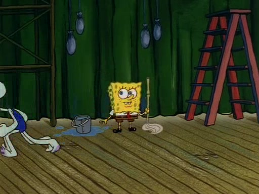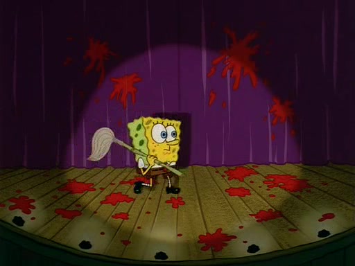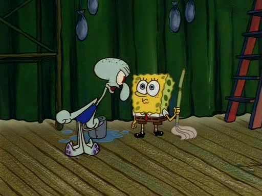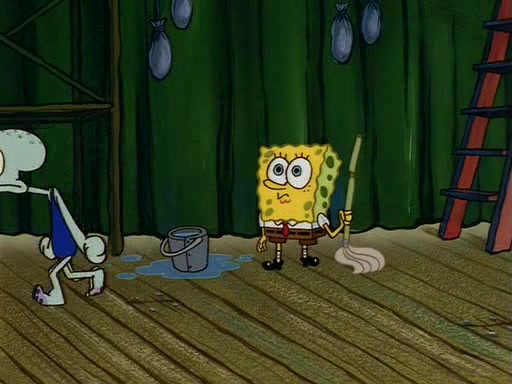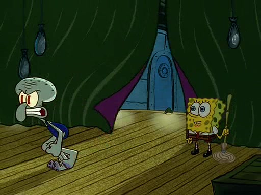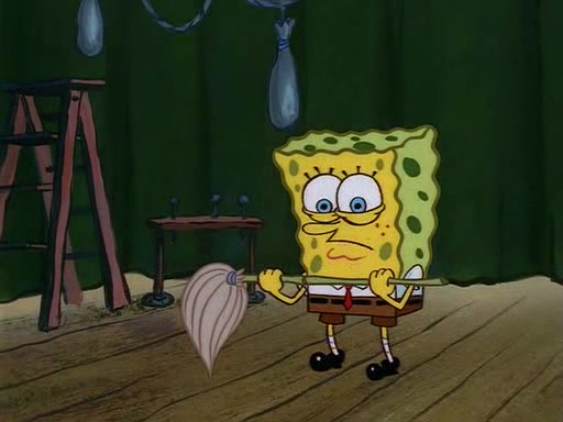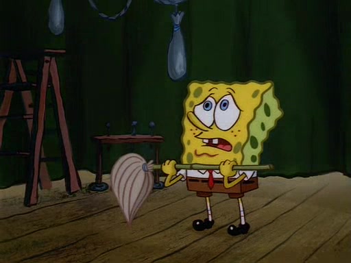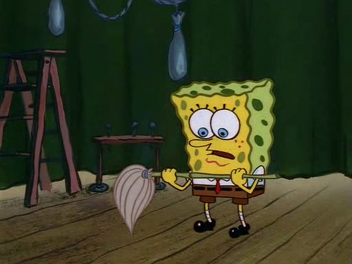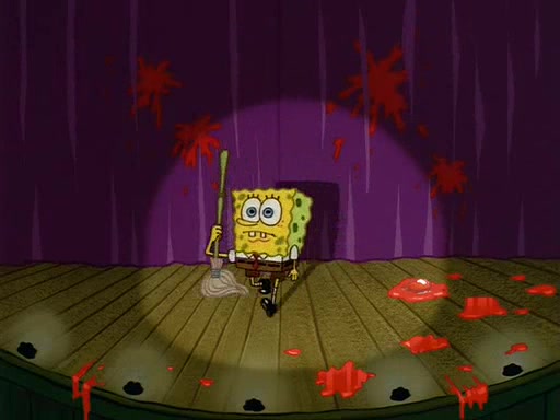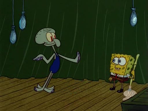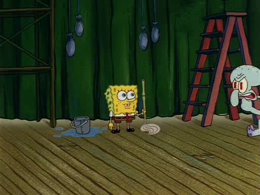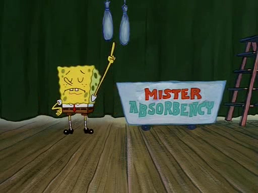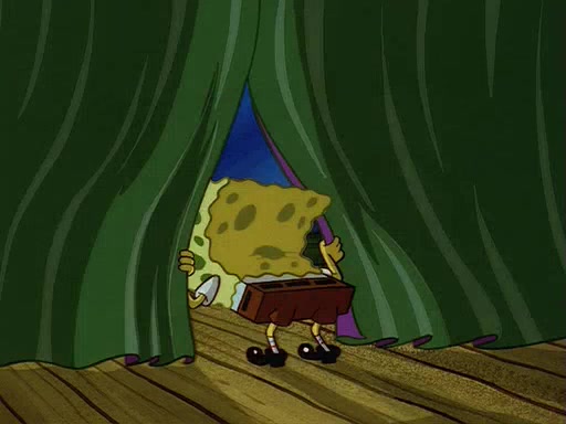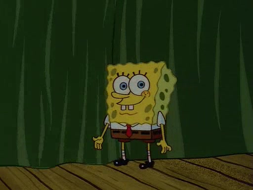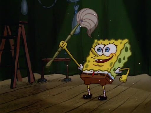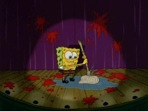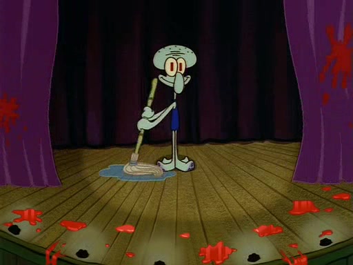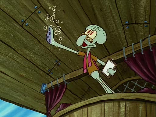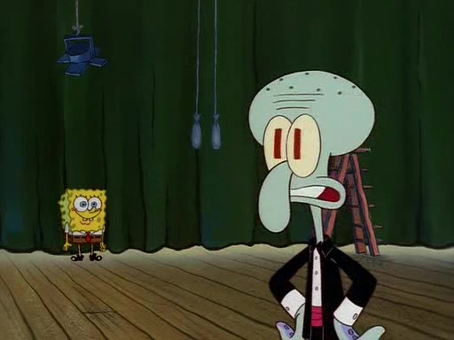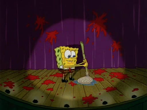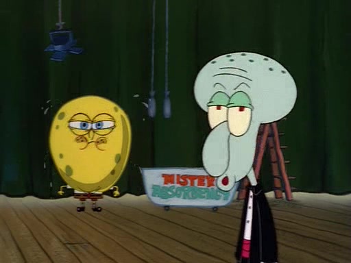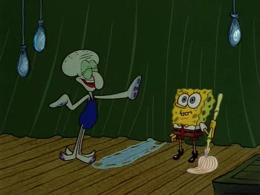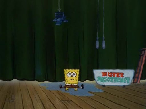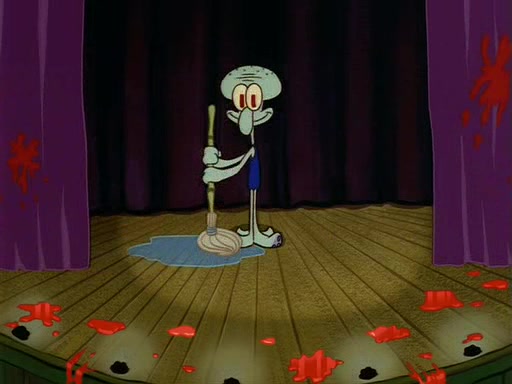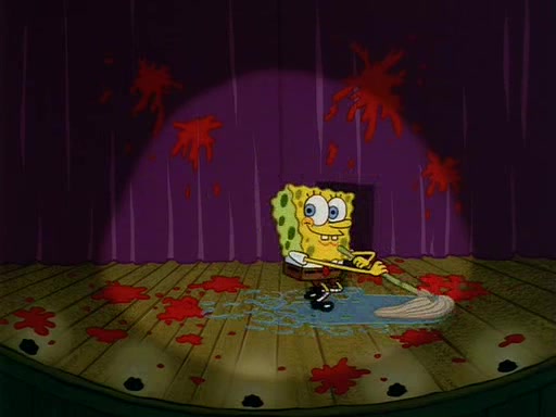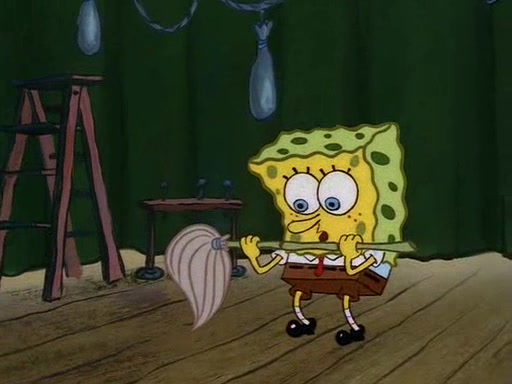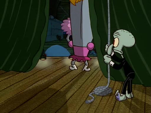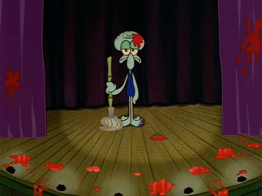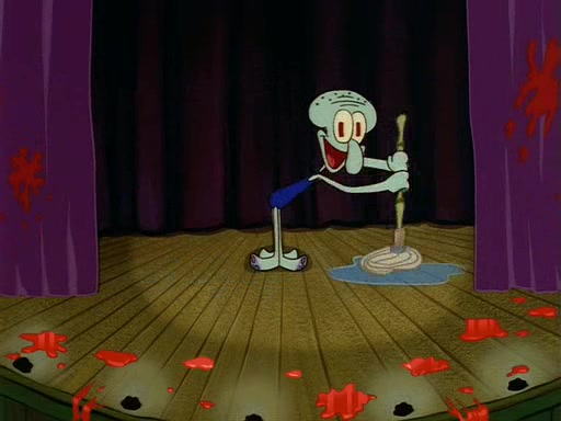 SpongeBob gets to work cleaning the stage, only to receive an unexpected surprise: the audience likes his act! Squidward thinks the audience has changed their mind about him, and charges onstage as SpongeBob leaves...only to be met with silence. He storms off again, and SpongeBob continues cleaning to great applause. Squidward charges in and is once again met by silence. However, he begins to realize that SpongeBob seems to be tied to the audience's sudden change in behavior, and tries several times to get the audience to cheer for him by doing SpongeBob's act, only to be rejected. Squidward is forced to conclude that it's SpongeBob the audience is cheering for and watches from the sidelines. Squidward gets praised for his show, as well as making SpongeBob a star. Mr. Krabs, lying in a wheelbarrow full of money, says he'll need another one for next week's show; Squidward can only sigh and watch with envy as SpongeBob gets a standing ovation for his cleaning. It looks like Squidward did save the best for last; it just wasn't his act.