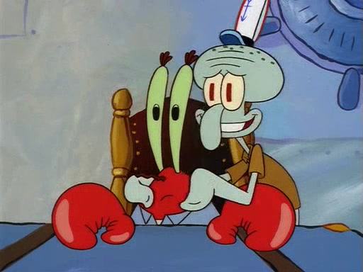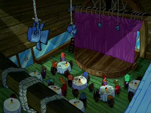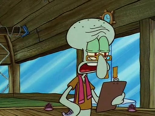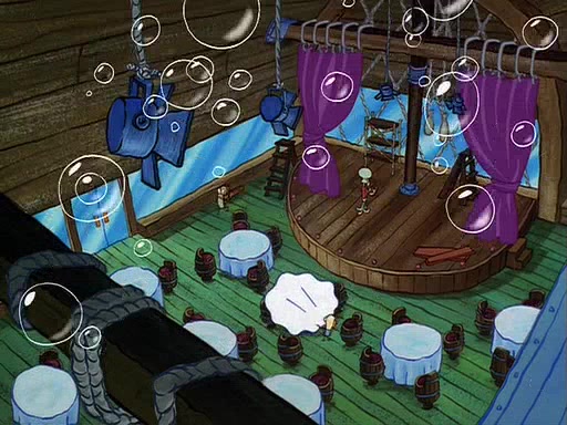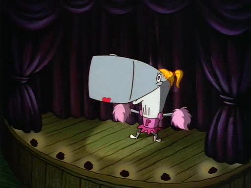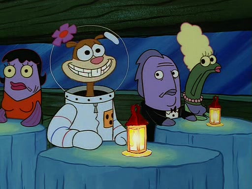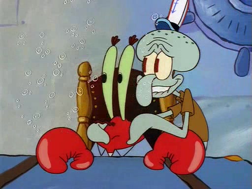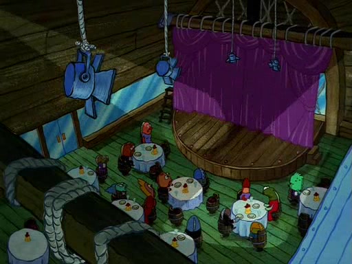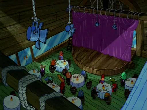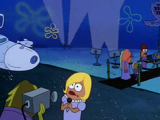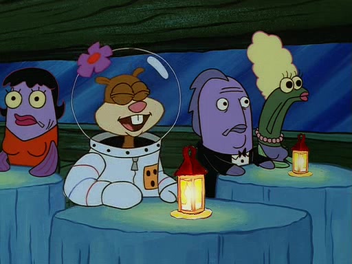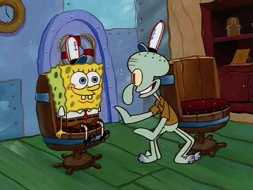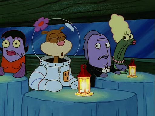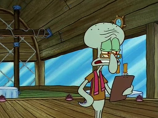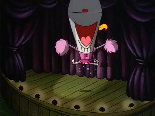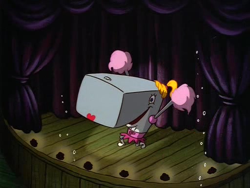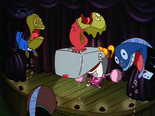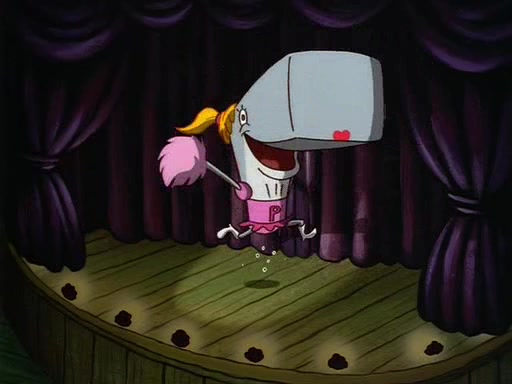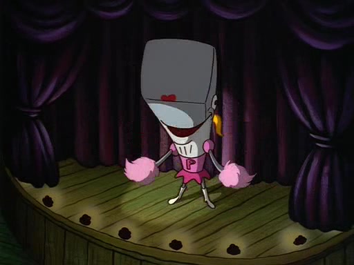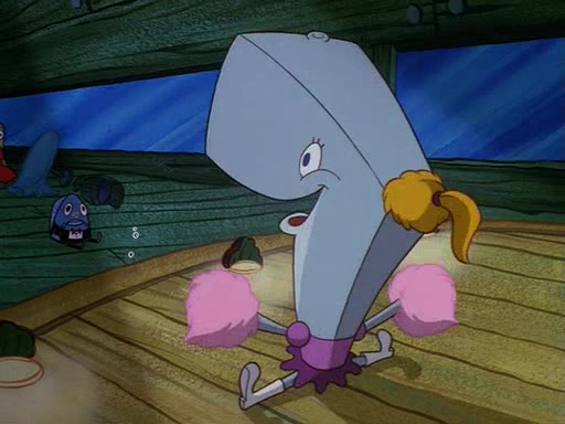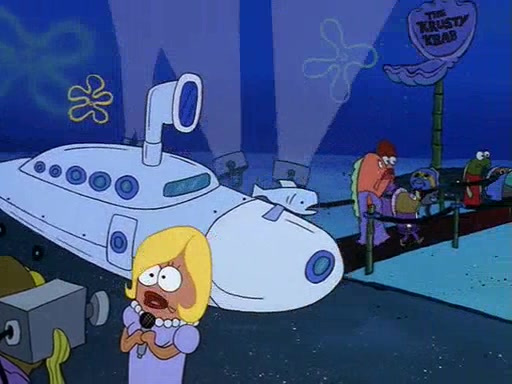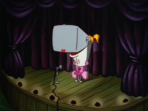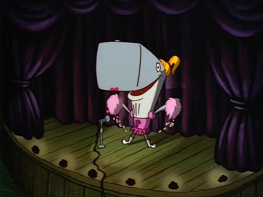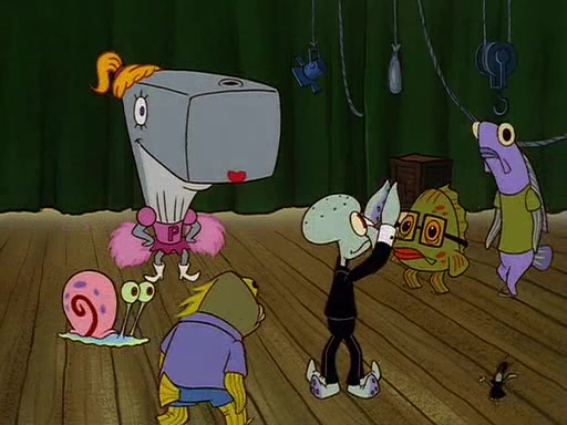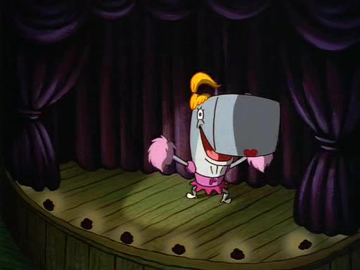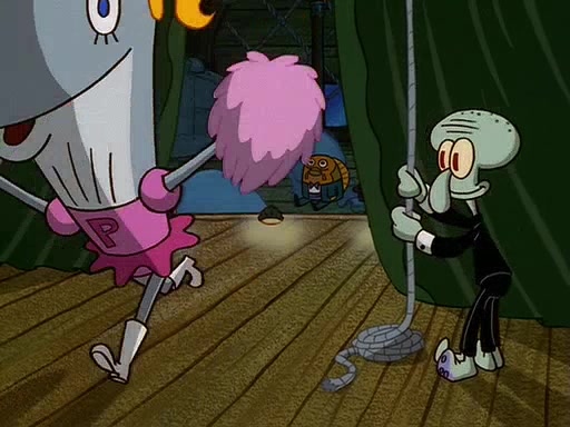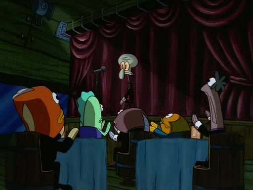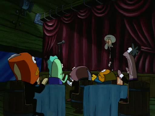 Squidward goes on-stage to introduce the audience to the first Krusty Krab Talent Show, in the process making a joke about how no one else would give the Krabby Patty a home. This greatly amuses Patrick to the point that he randomly interrupts the next parts of Squidward's speech. Not able to get in a word edgewise, Squidward eventually just says Pearl's name and leaves the stage. Pearl is unveiled with a set of cheerleader pom-poms, and Mr. Krabs is ecstatic to see his daughter in the spotlight. Her act is a cheer-leading routine about the Krusty Krab, but her size and weight throws the audience up into the air with each jump, resulting in everyone eventually lying about in various states of pain. As she leaves the stage, SpongeBob drops in to badger Squidward about his "act", with the latter trying to ignore him.
