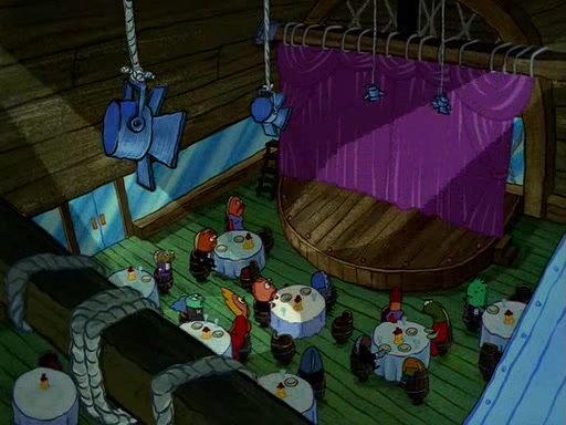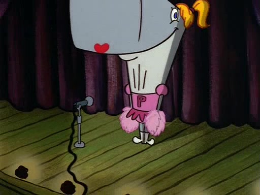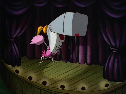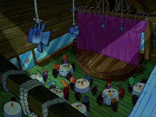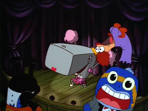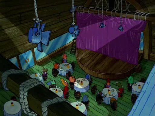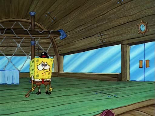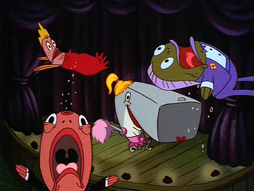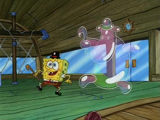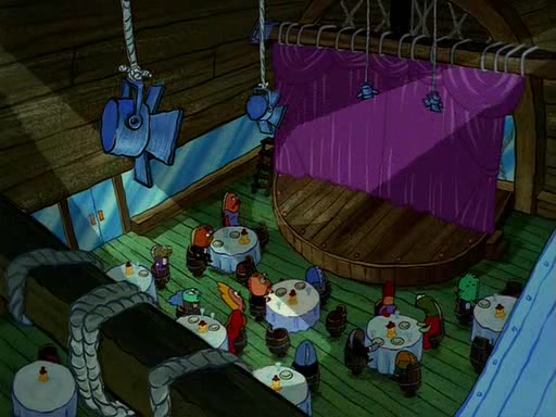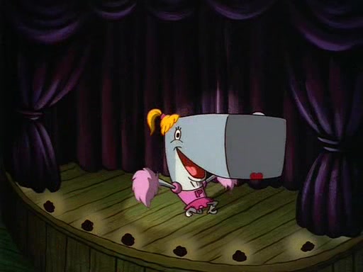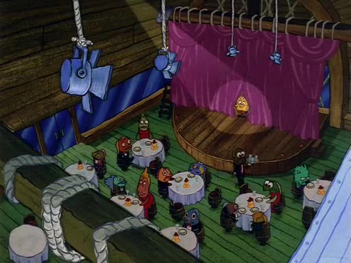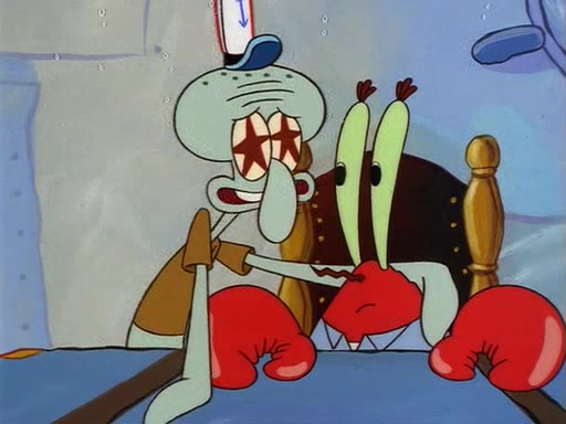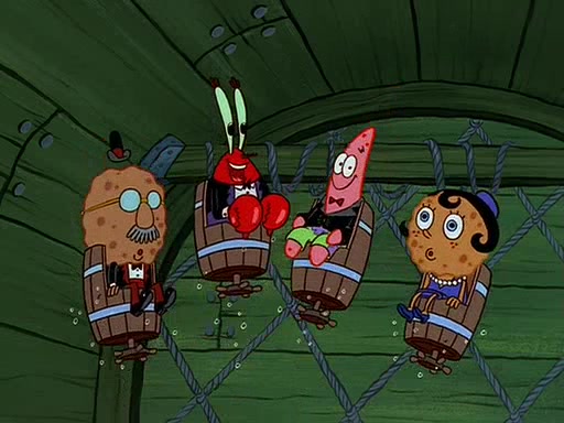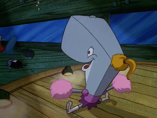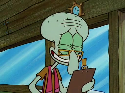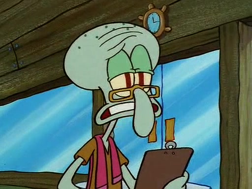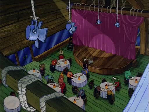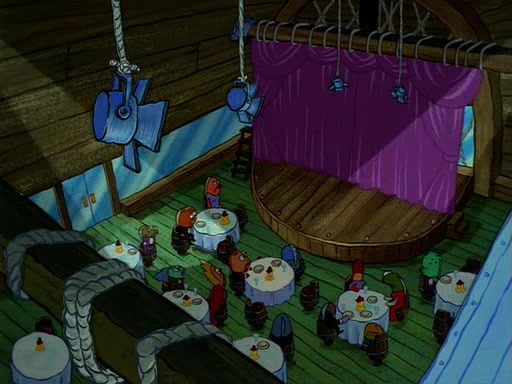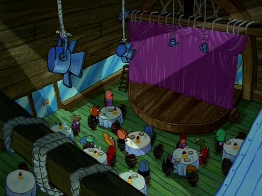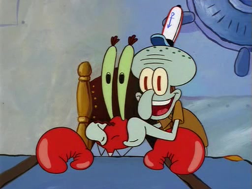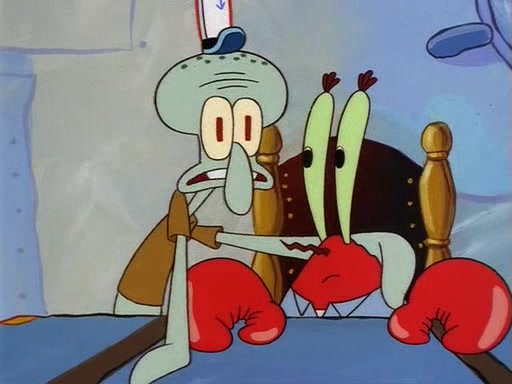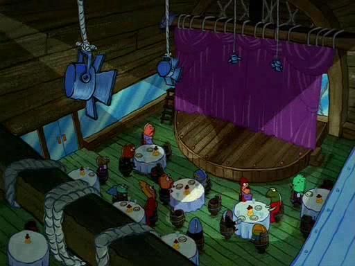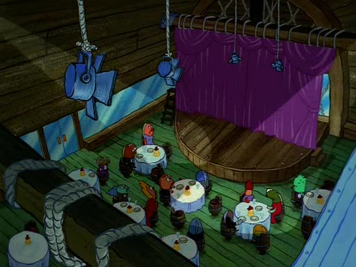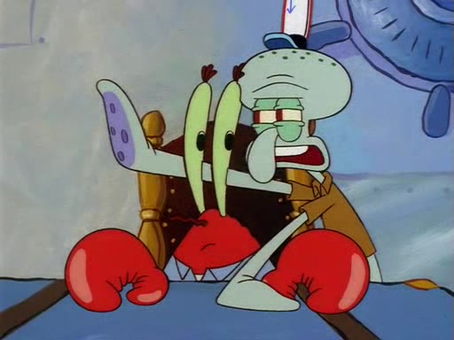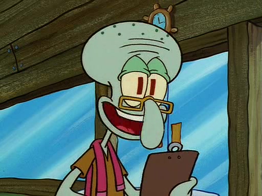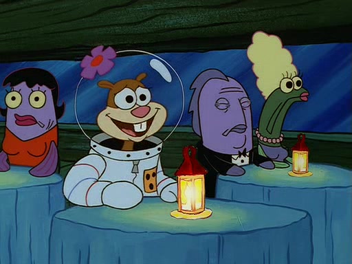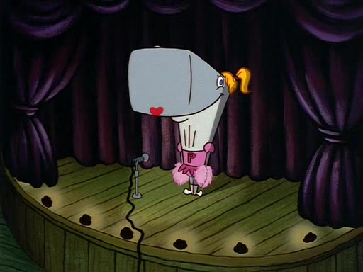 Squidward goes on-stage to introduce the audience to the first Krusty Krab Talent Show, in the process making a joke about how no one else would give the Krabby Patty a home. This greatly amuses Patrick to the point that he randomly interrupts the next parts of Squidward's speech. Not able to get in a word edgewise, Squidward eventually just says Pearl's name and leaves the stage. Pearl is unveiled with a set of cheerleader pom-poms, and Mr. Krabs is ecstatic to see his daughter in the spotlight. Her act is a cheer-leading routine about the Krusty Krab, but her size and weight throws the audience up into the air with each jump, resulting in everyone eventually lying about in various states of pain. As she leaves the stage, SpongeBob drops in to badger Squidward about his "act", with the latter trying to ignore him.