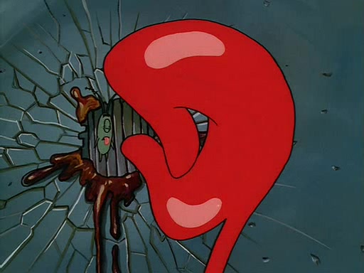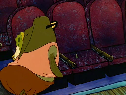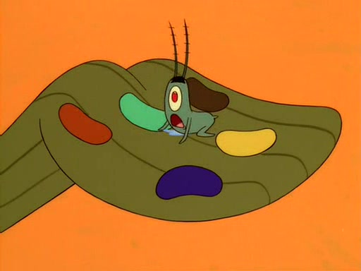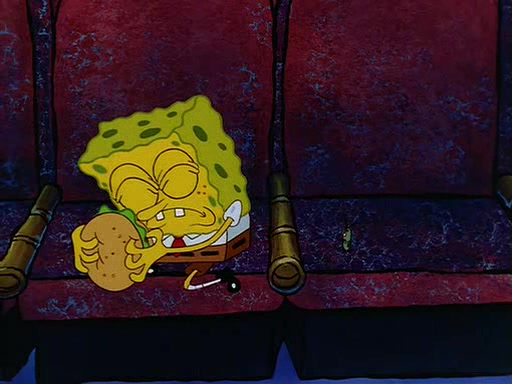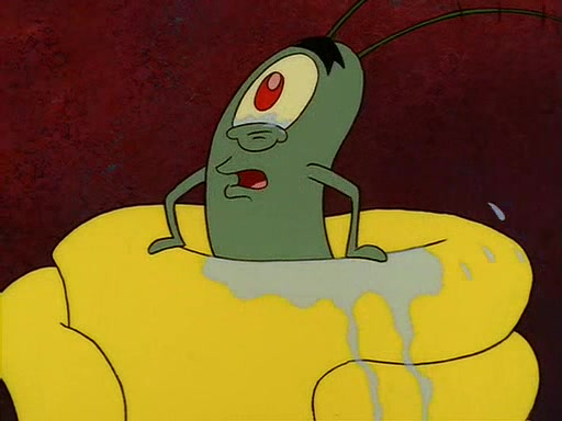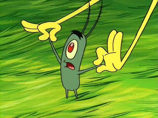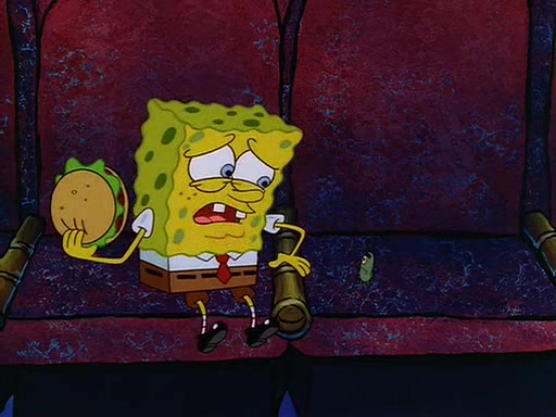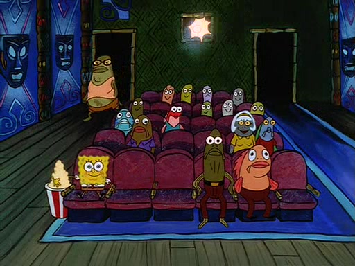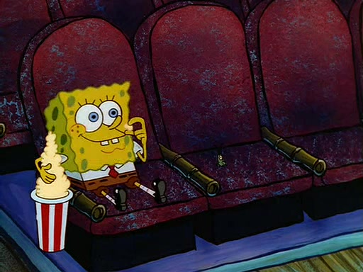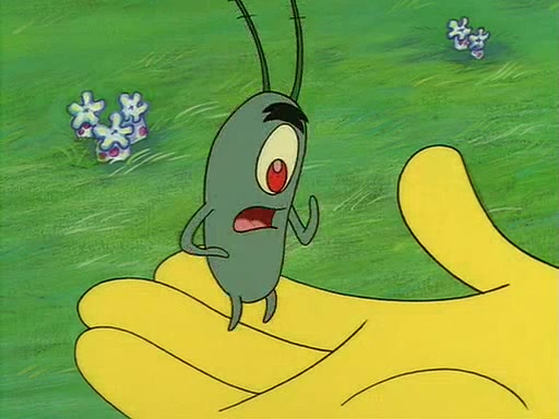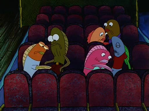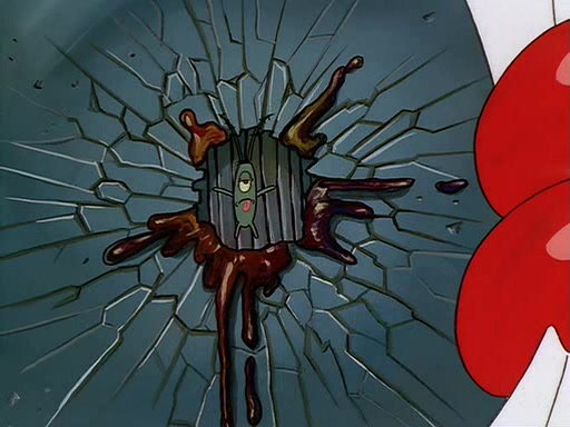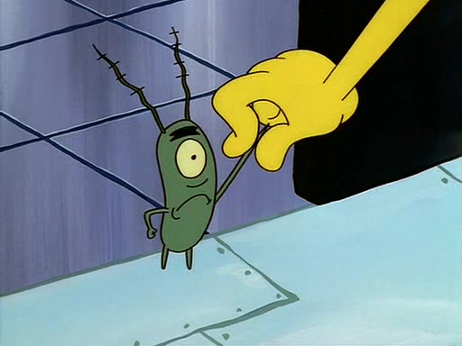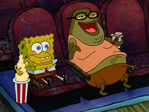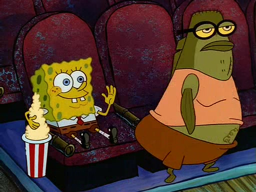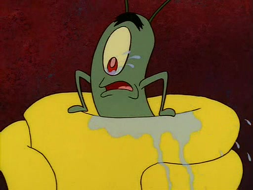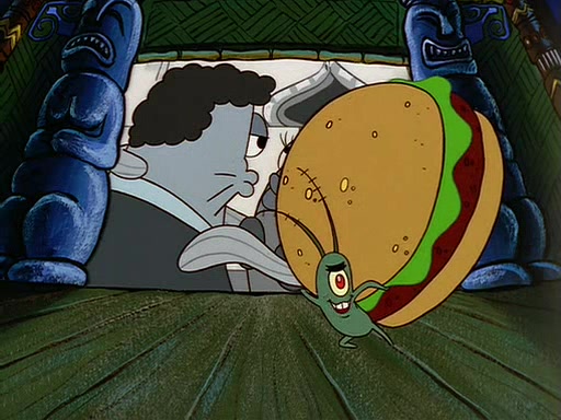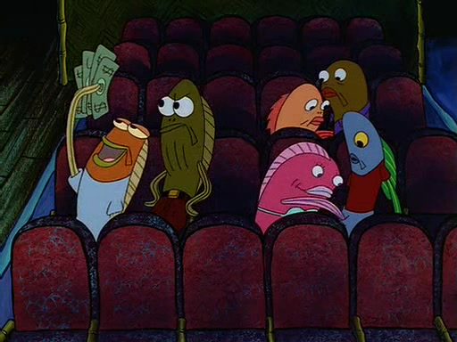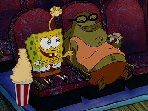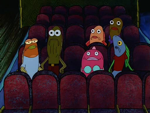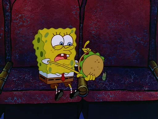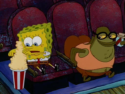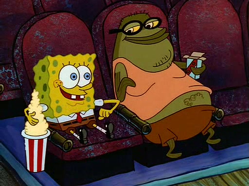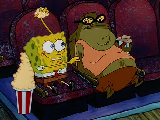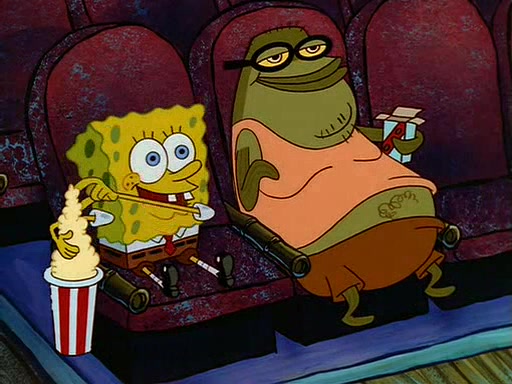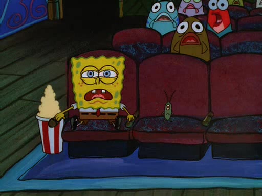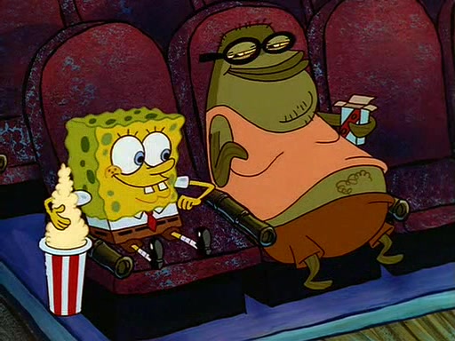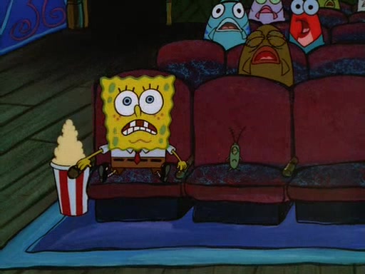 At the Reef Cinema, Mr. Krabs appears in front of the projector and shouts "reach into his pocket now and take what he's got!" SpongeBob reaches into Plankton's pocket and finds a Krabby Patty (the other people simply steal from their neighbor's pocket and leave the theater). SpongeBob realizes that Plankton used him to get a Krabby Patty, and Plankton attempts to explain that he realizes now that he only ever wanted friendship, before admitting to everything and running off with the patty. However, he runs directly through the movie screen into a solid wall. Plankton is squashed, badly, and Mr. Krabs flicks him off the wall onto Bubble Bass' hand, who mistakes Plankton for a jellybean and chases him around his hand.