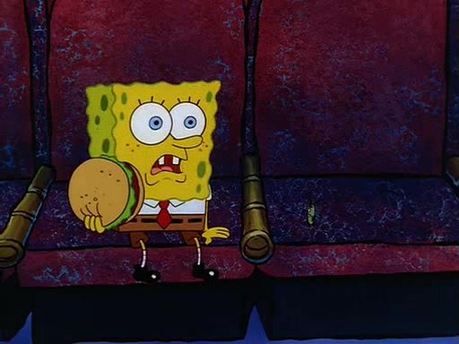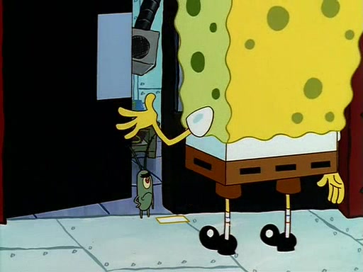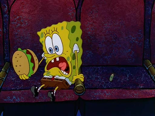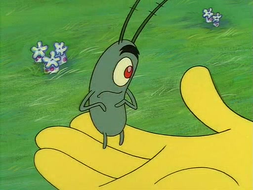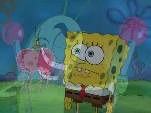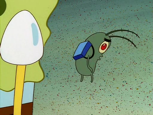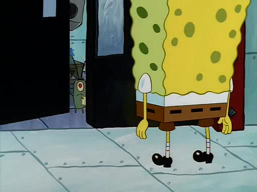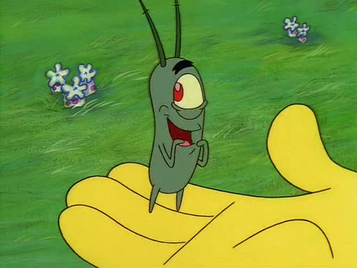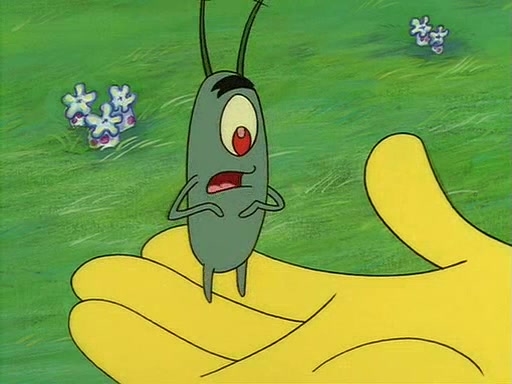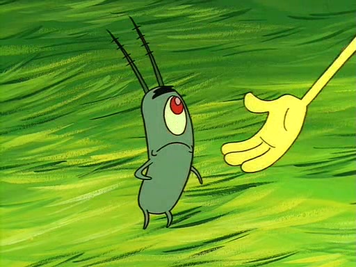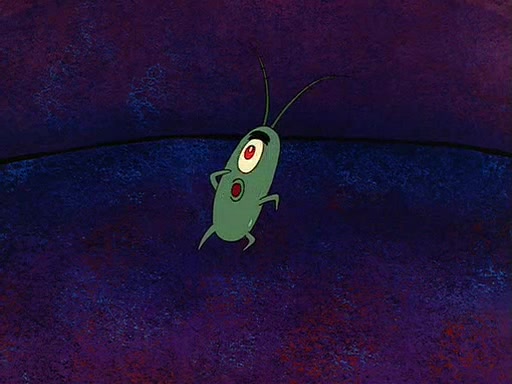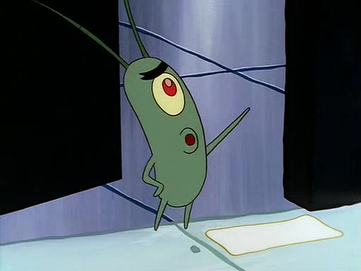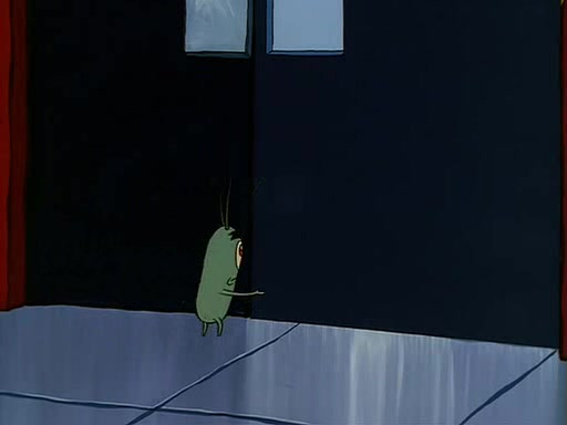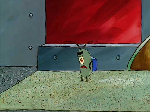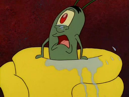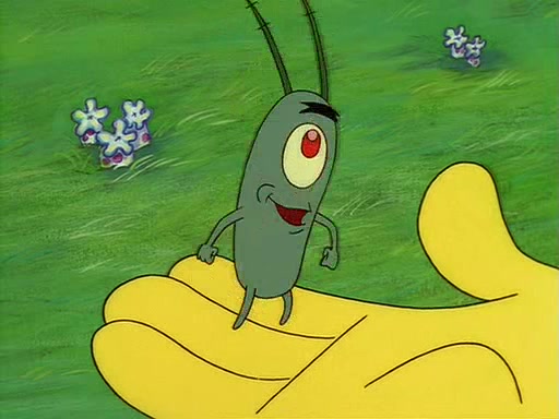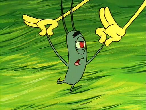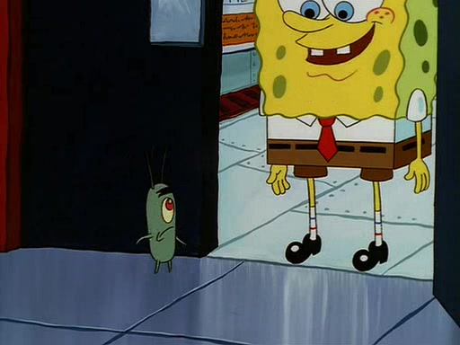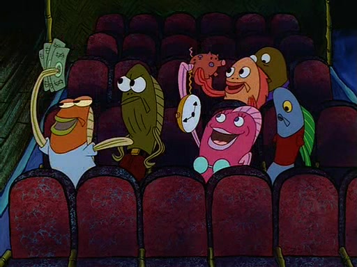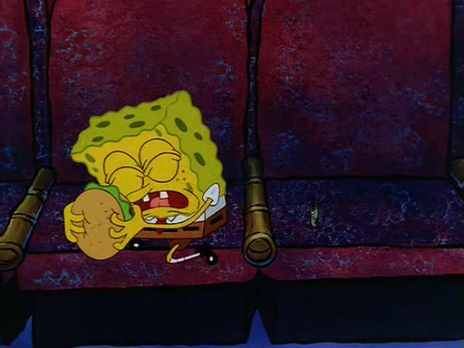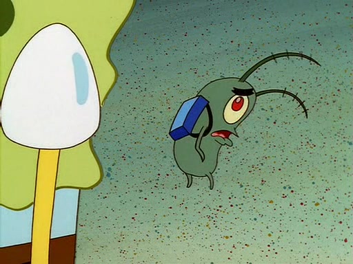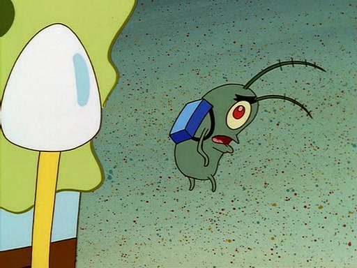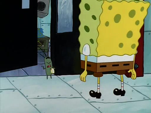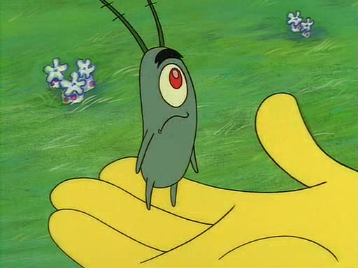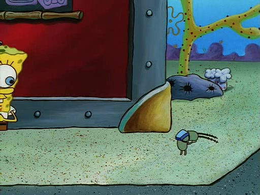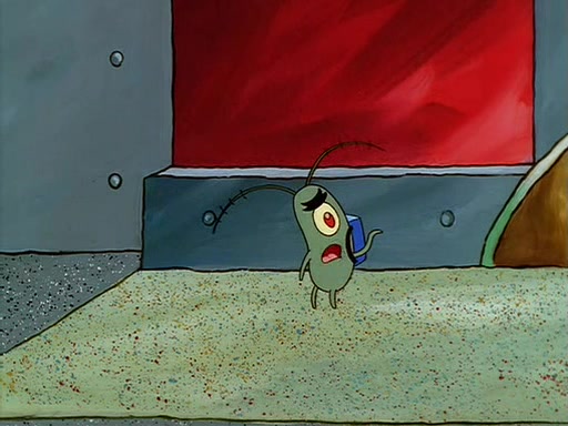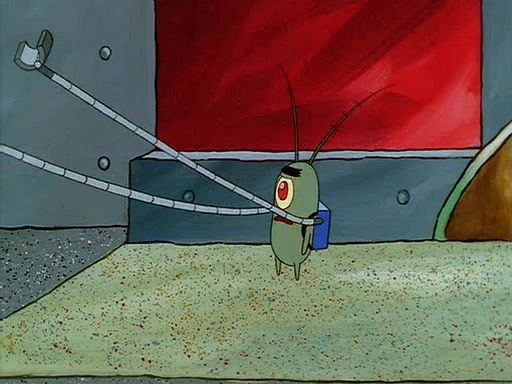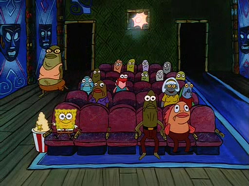 At the Reef Cinema, Mr. Krabs appears in front of the projector and shouts "reach into his pocket now and take what he's got!" SpongeBob reaches into Plankton's pocket and finds a Krabby Patty (the other people simply steal from their neighbor's pocket and leave the theater). SpongeBob realizes that Plankton used him to get a Krabby Patty, and Plankton attempts to explain that he realizes now that he only ever wanted friendship, before admitting to everything and running off with the patty. However, he runs directly through the movie screen into a solid wall. Plankton is squashed, badly, and Mr. Krabs flicks him off the wall onto Bubble Bass' hand, who mistakes Plankton for a jellybean and chases him around his hand.