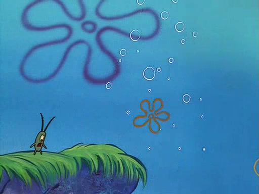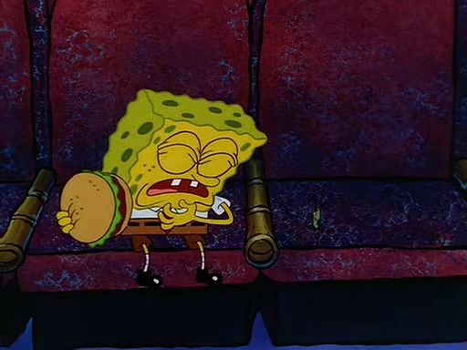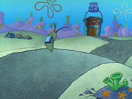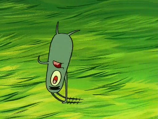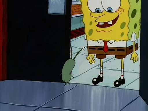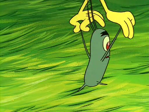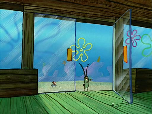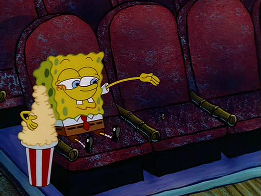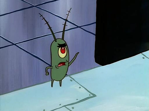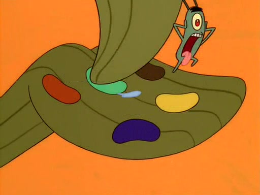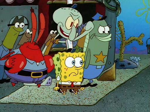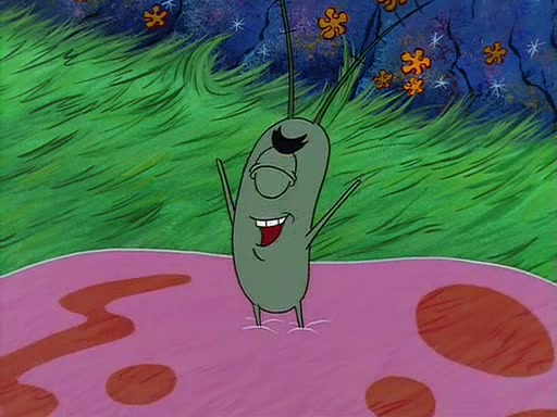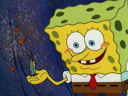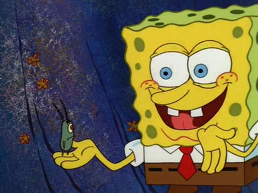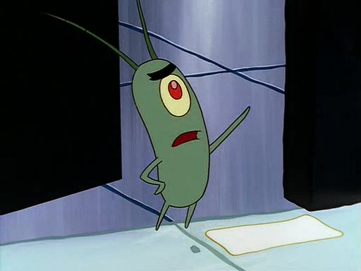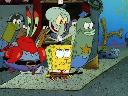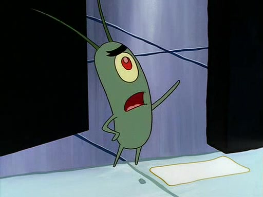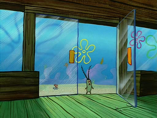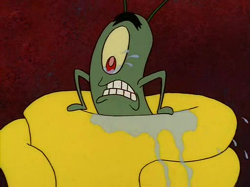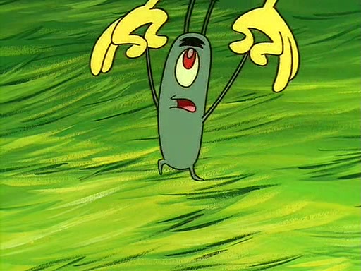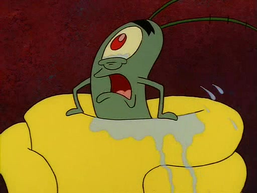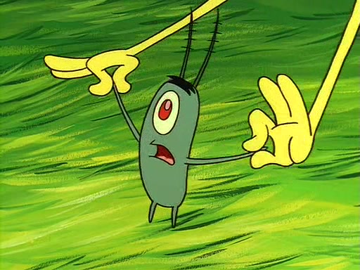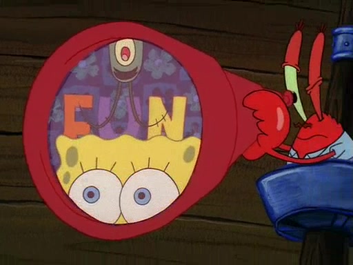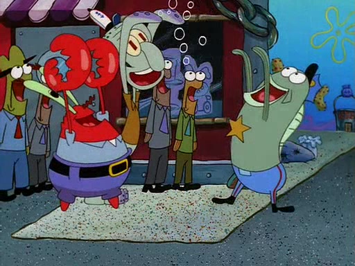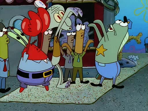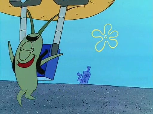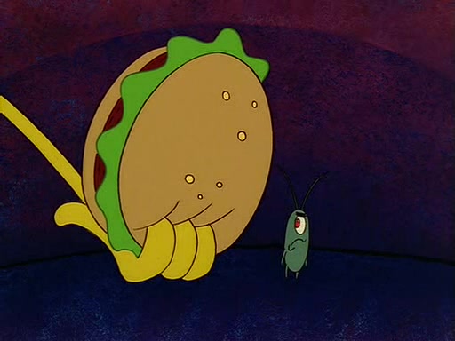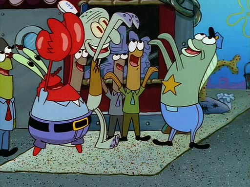 At the Reef Cinema, Mr. Krabs appears in front of the projector and shouts "reach into his pocket now and take what he's got!" SpongeBob reaches into Plankton's pocket and finds a Krabby Patty (the other people simply steal from their neighbor's pocket and leave the theater). SpongeBob realizes that Plankton used him to get a Krabby Patty, and Plankton attempts to explain that he realizes now that he only ever wanted friendship, before admitting to everything and running off with the patty. However, he runs directly through the movie screen into a solid wall. Plankton is squashed, badly, and Mr. Krabs flicks him off the wall onto Bubble Bass' hand, who mistakes Plankton for a jellybean and chases him around his hand.