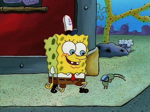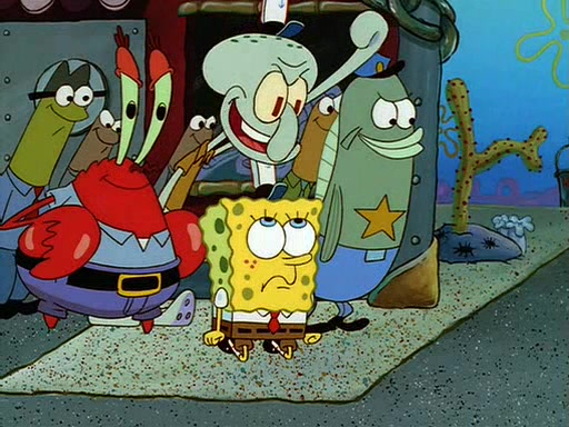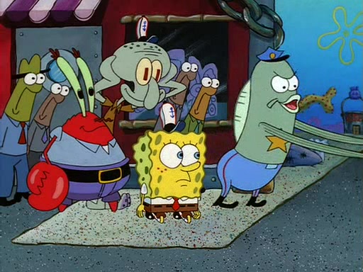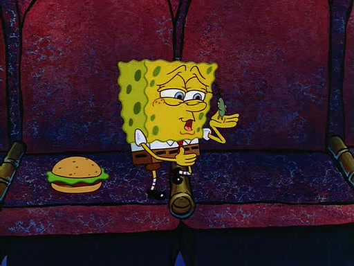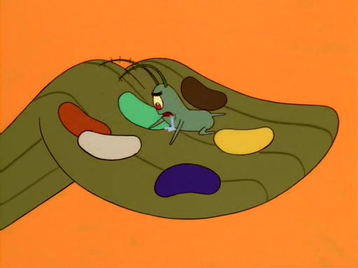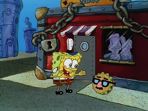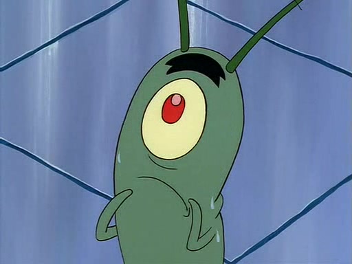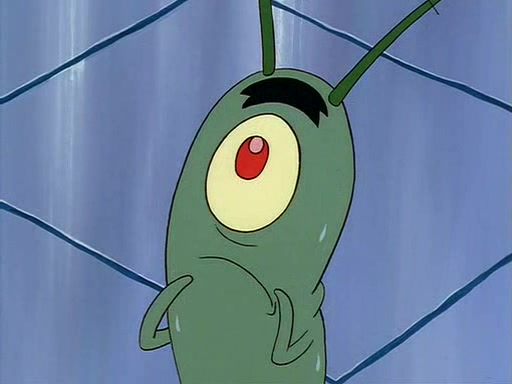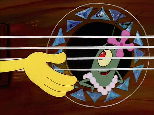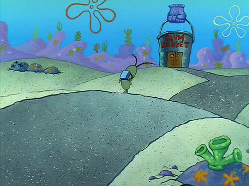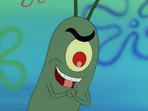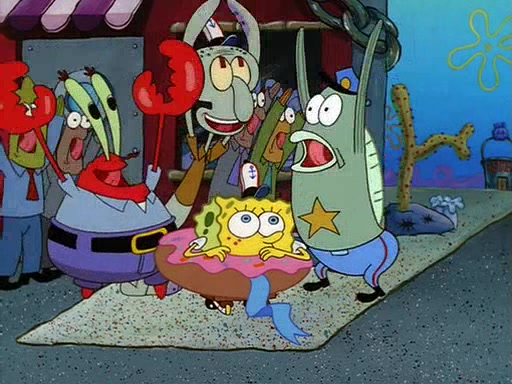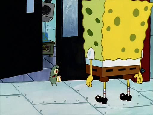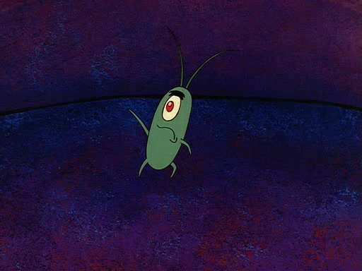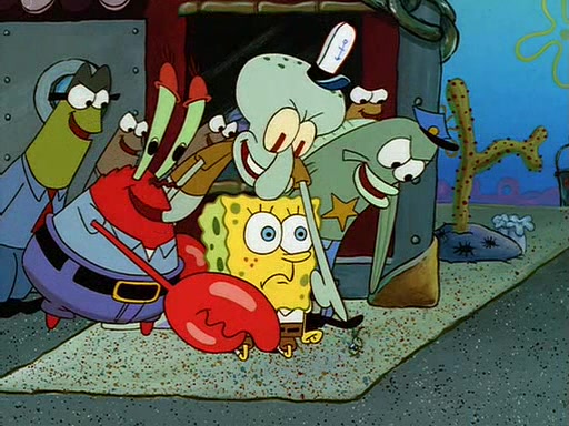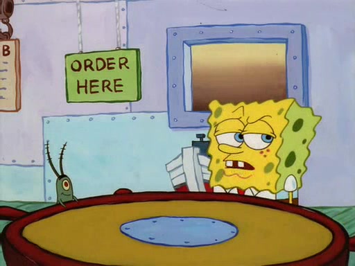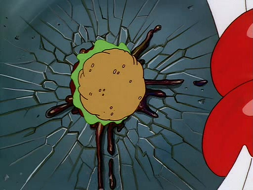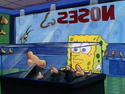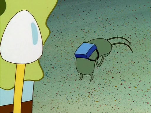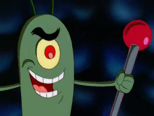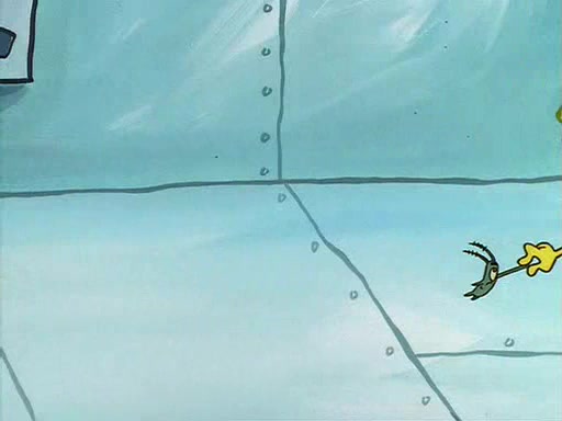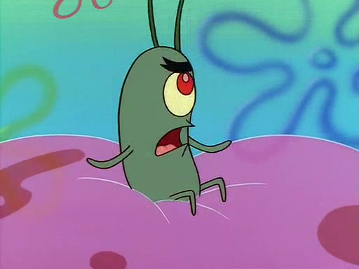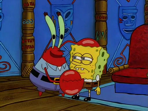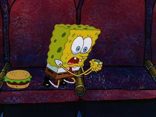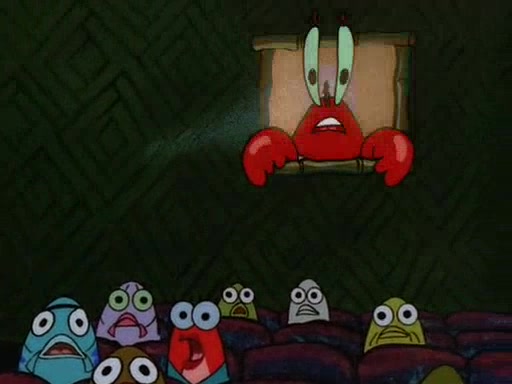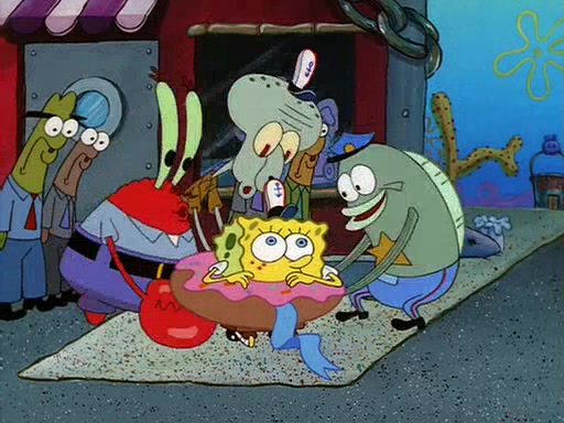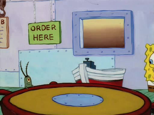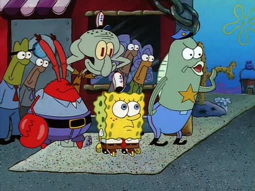 At the Reef Cinema, Mr. Krabs appears in front of the projector and shouts "reach into his pocket now and take what he's got!" SpongeBob reaches into Plankton's pocket and finds a Krabby Patty (the other people simply steal from their neighbor's pocket and leave the theater). SpongeBob realizes that Plankton used him to get a Krabby Patty, and Plankton attempts to explain that he realizes now that he only ever wanted friendship, before admitting to everything and running off with the patty. However, he runs directly through the movie screen into a solid wall. Plankton is squashed, badly, and Mr. Krabs flicks him off the wall onto Bubble Bass' hand, who mistakes Plankton for a jellybean and chases him around his hand.