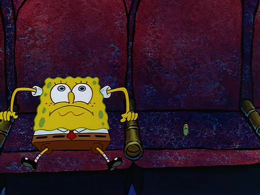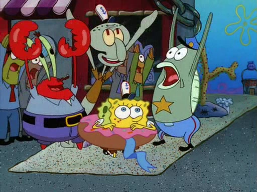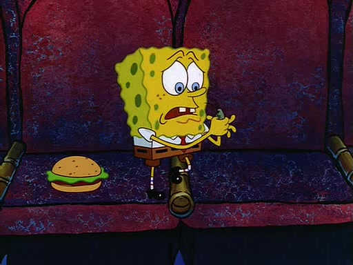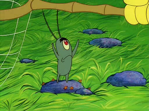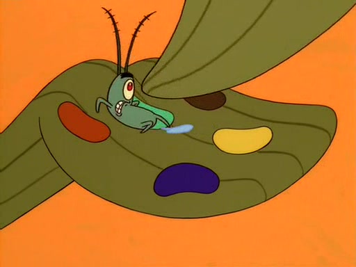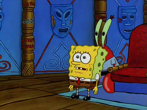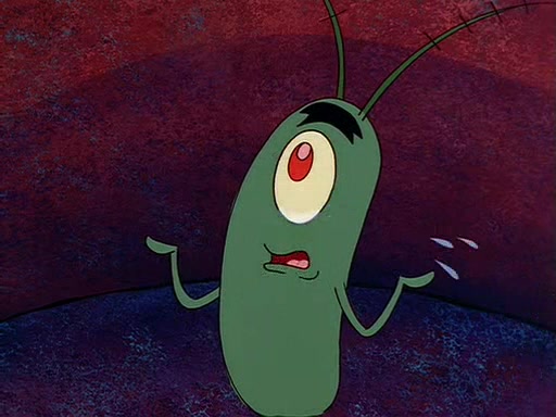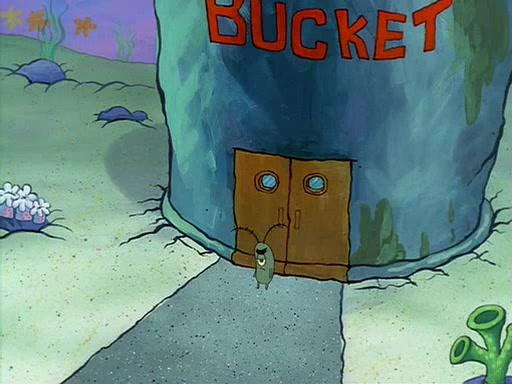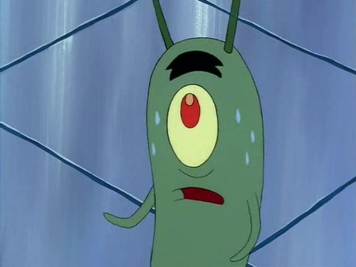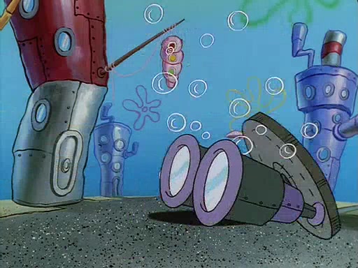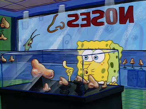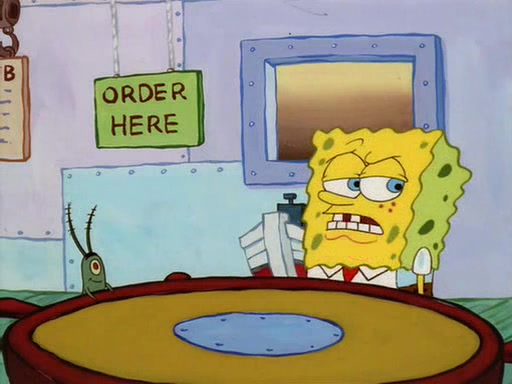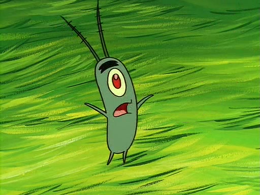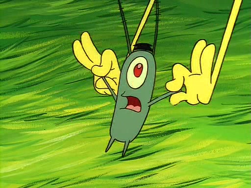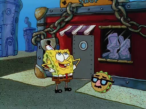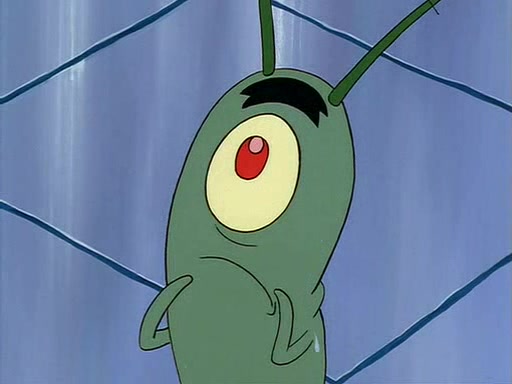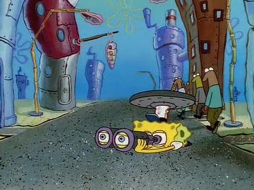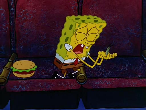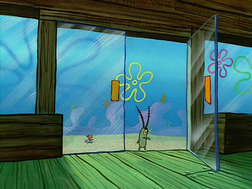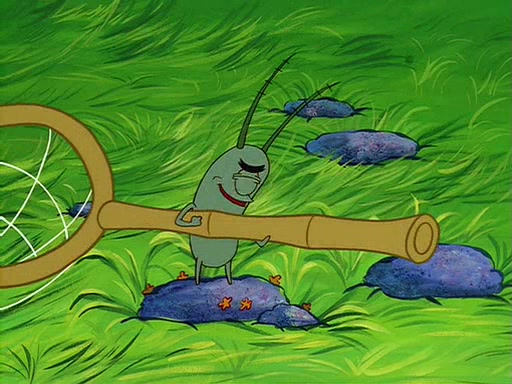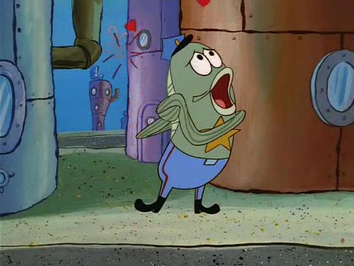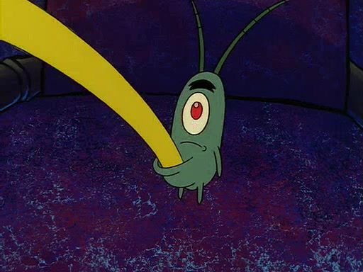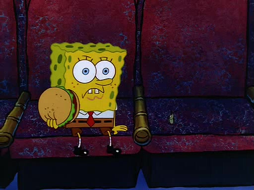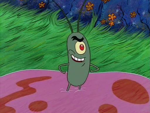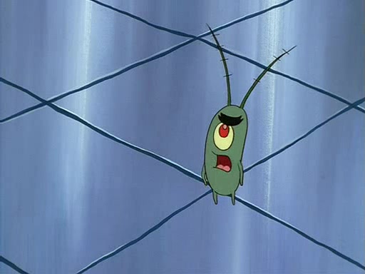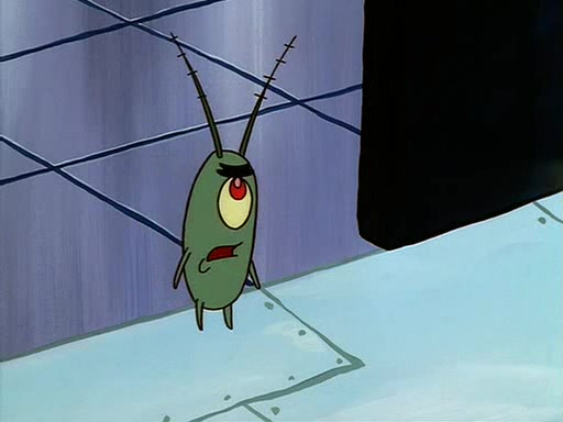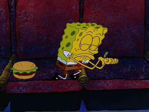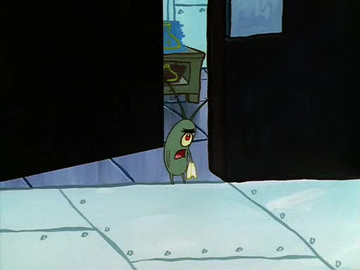 At the Reef Cinema, Mr. Krabs appears in front of the projector and shouts "reach into his pocket now and take what he's got!" SpongeBob reaches into Plankton's pocket and finds a Krabby Patty (the other people simply steal from their neighbor's pocket and leave the theater). SpongeBob realizes that Plankton used him to get a Krabby Patty, and Plankton attempts to explain that he realizes now that he only ever wanted friendship, before admitting to everything and running off with the patty. However, he runs directly through the movie screen into a solid wall. Plankton is squashed, badly, and Mr. Krabs flicks him off the wall onto Bubble Bass' hand, who mistakes Plankton for a jellybean and chases him around his hand.