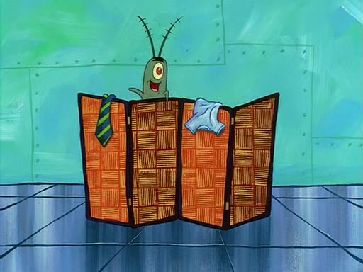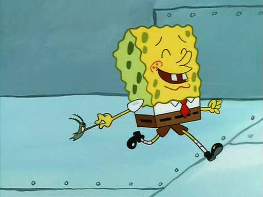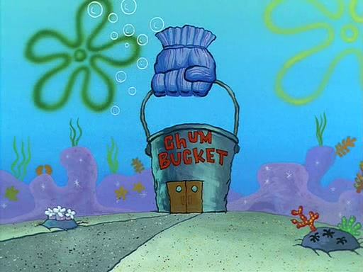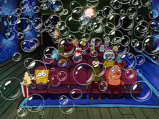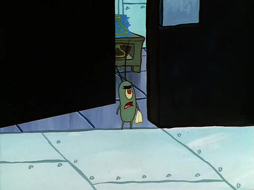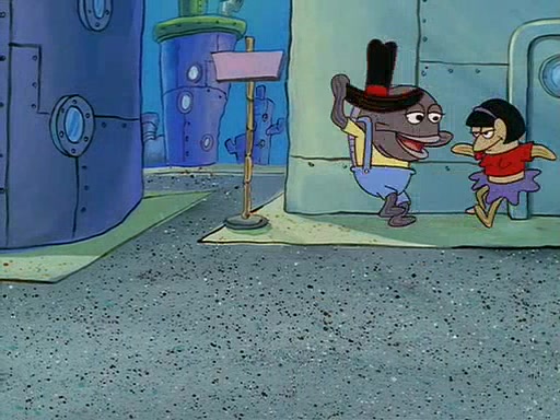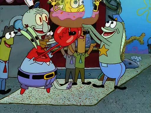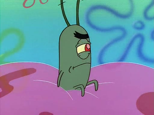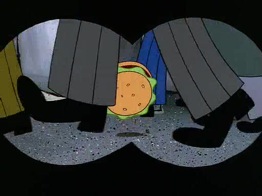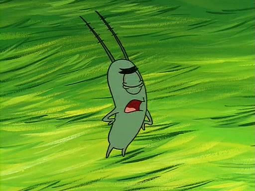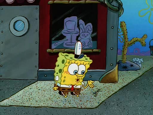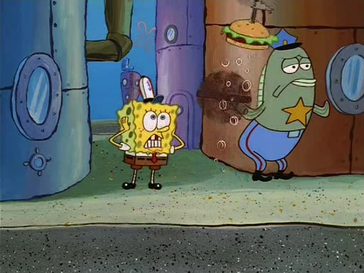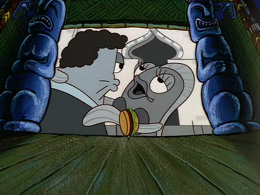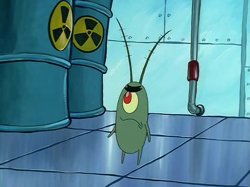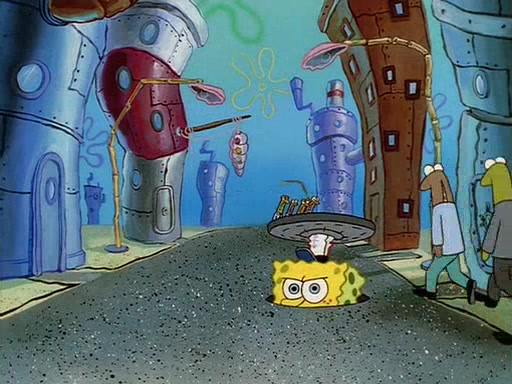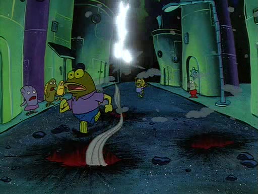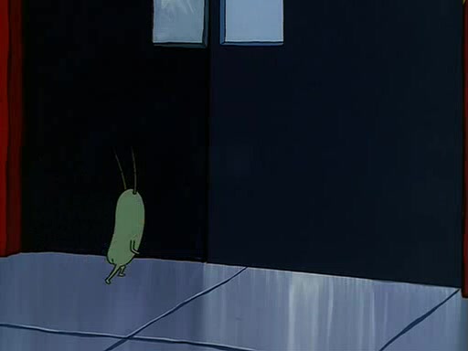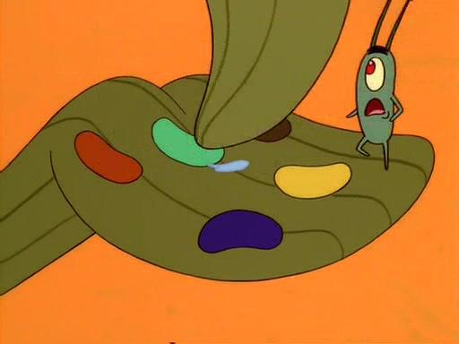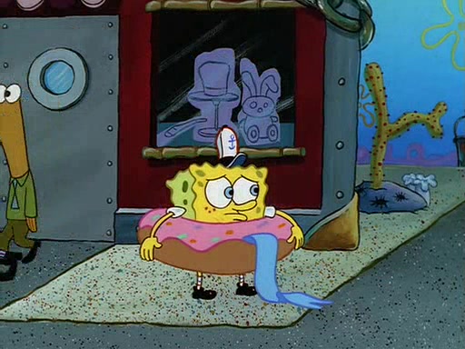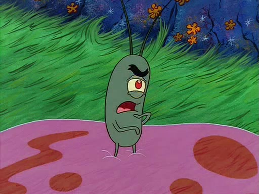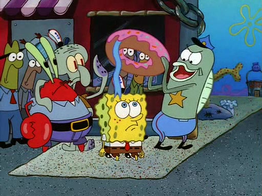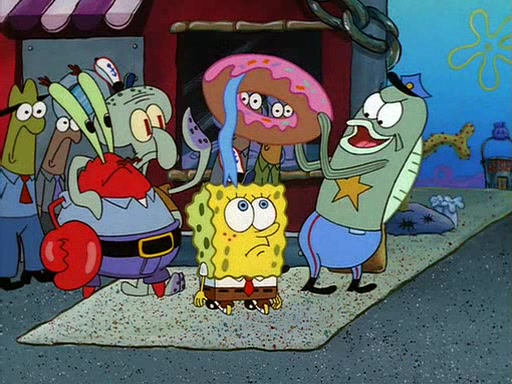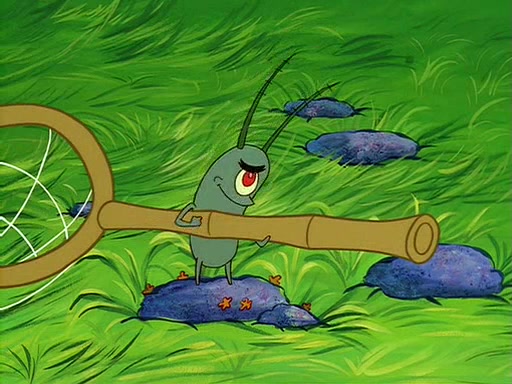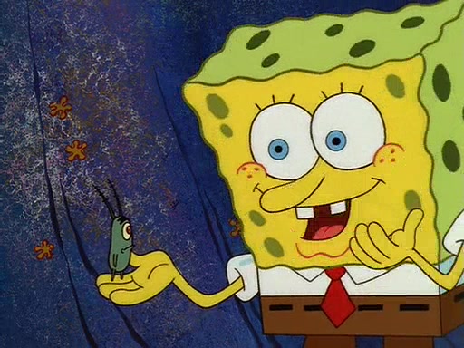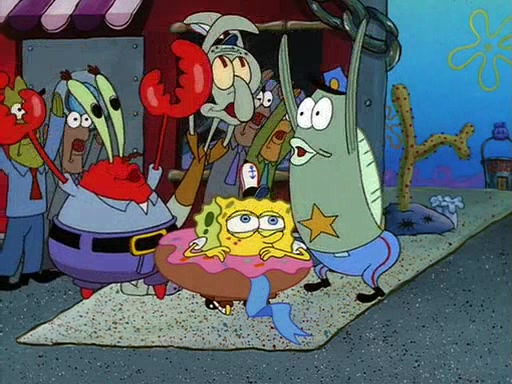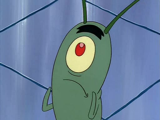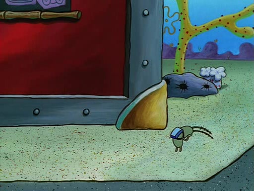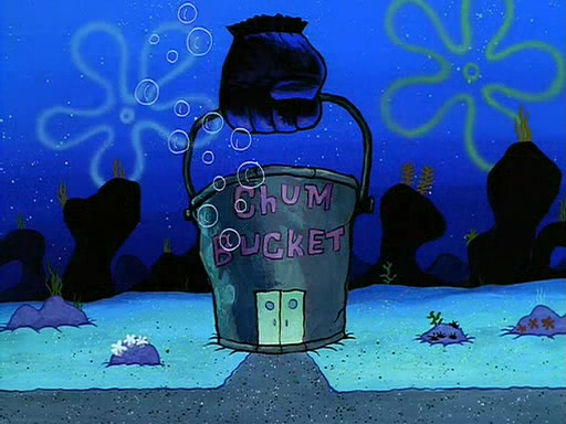 At the Reef Cinema, Mr. Krabs appears in front of the projector and shouts "reach into his pocket now and take what he's got!" SpongeBob reaches into Plankton's pocket and finds a Krabby Patty (the other people simply steal from their neighbor's pocket and leave the theater). SpongeBob realizes that Plankton used him to get a Krabby Patty, and Plankton attempts to explain that he realizes now that he only ever wanted friendship, before admitting to everything and running off with the patty. However, he runs directly through the movie screen into a solid wall. Plankton is squashed, badly, and Mr. Krabs flicks him off the wall onto Bubble Bass' hand, who mistakes Plankton for a jellybean and chases him around his hand.