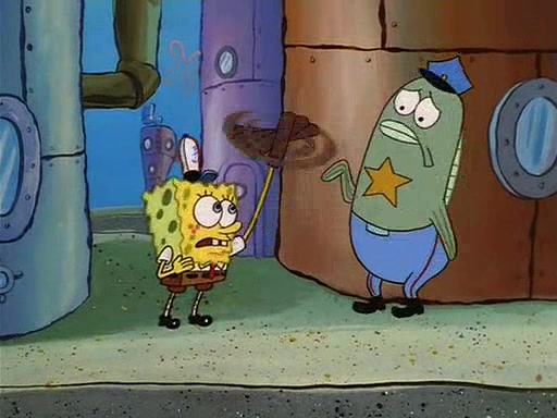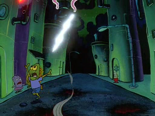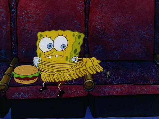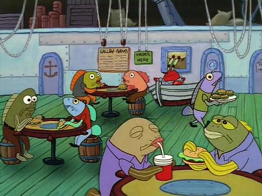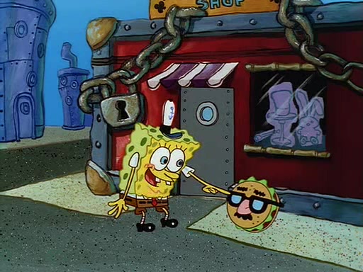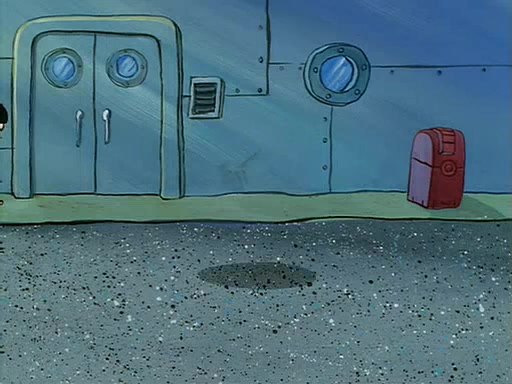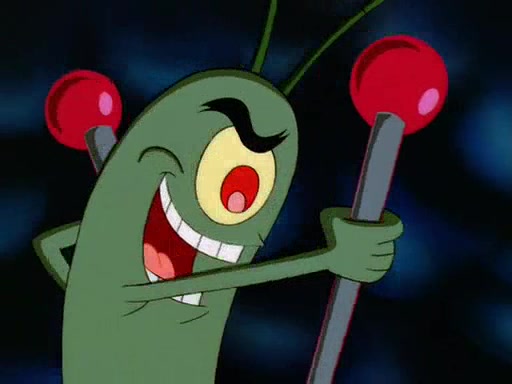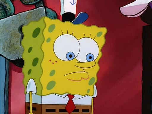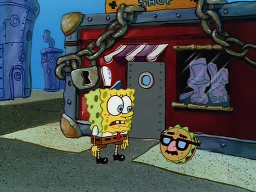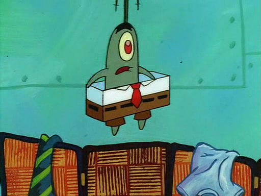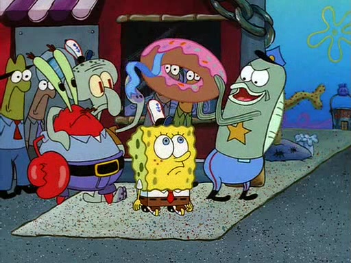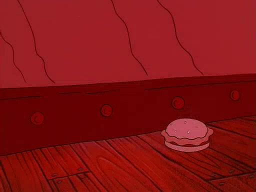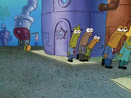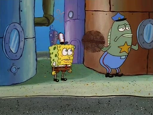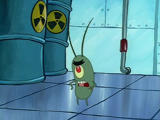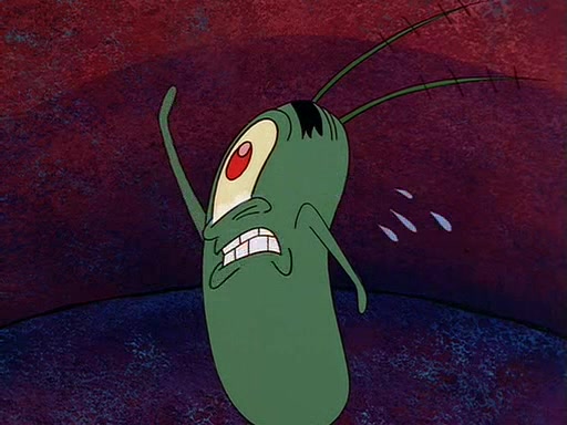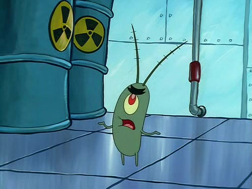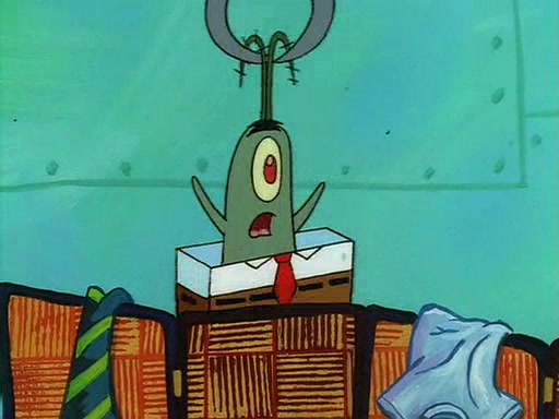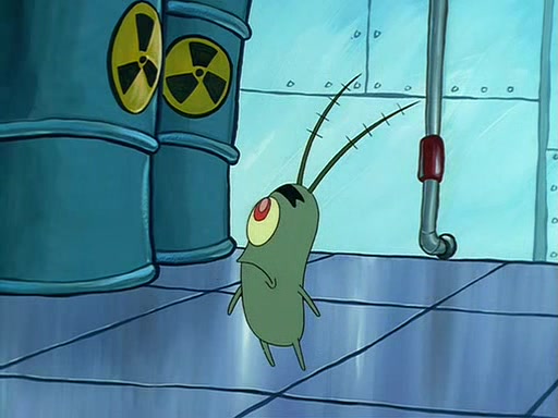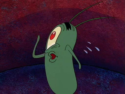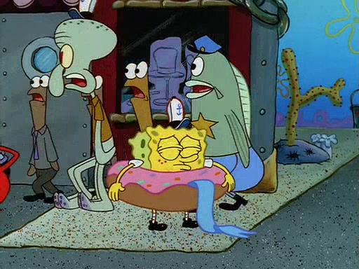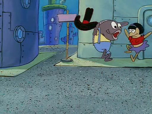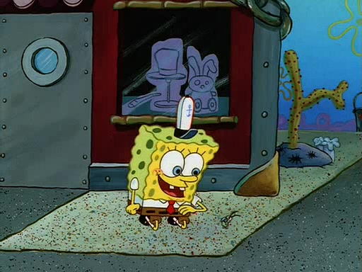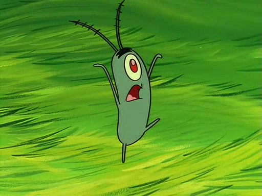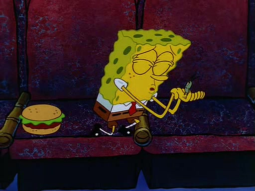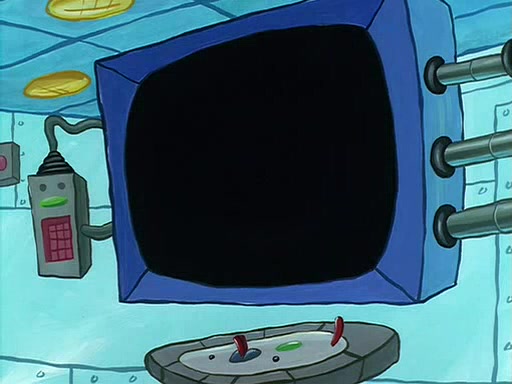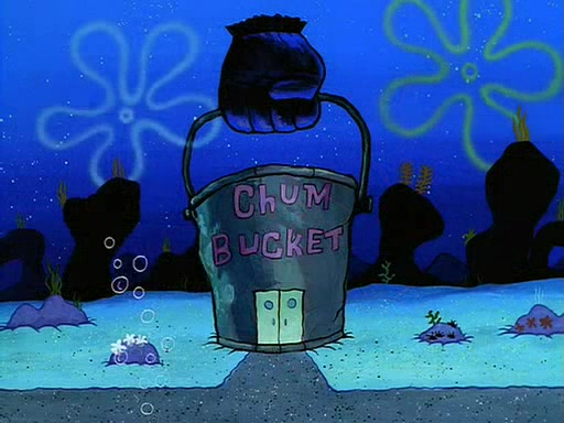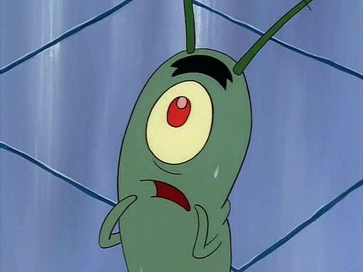 At the Reef Cinema, Mr. Krabs appears in front of the projector and shouts "reach into his pocket now and take what he's got!" SpongeBob reaches into Plankton's pocket and finds a Krabby Patty (the other people simply steal from their neighbor's pocket and leave the theater). SpongeBob realizes that Plankton used him to get a Krabby Patty, and Plankton attempts to explain that he realizes now that he only ever wanted friendship, before admitting to everything and running off with the patty. However, he runs directly through the movie screen into a solid wall. Plankton is squashed, badly, and Mr. Krabs flicks him off the wall onto Bubble Bass' hand, who mistakes Plankton for a jellybean and chases him around his hand.