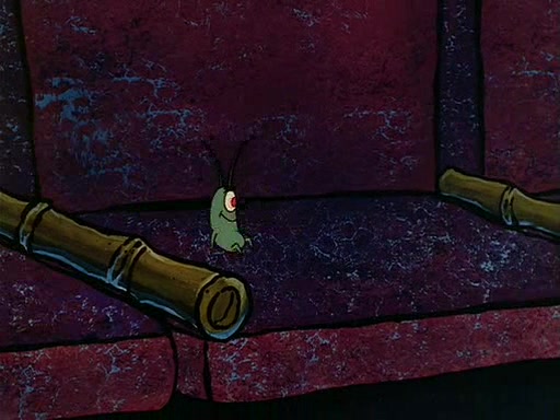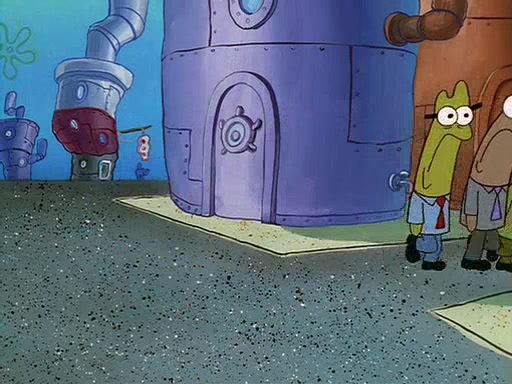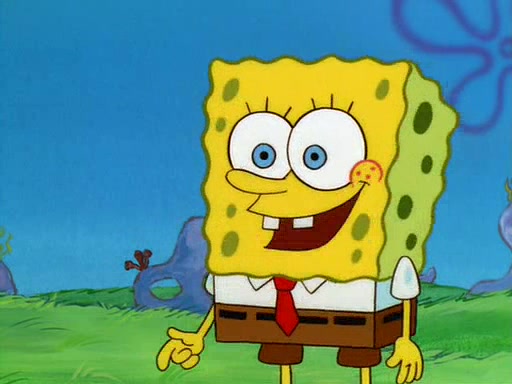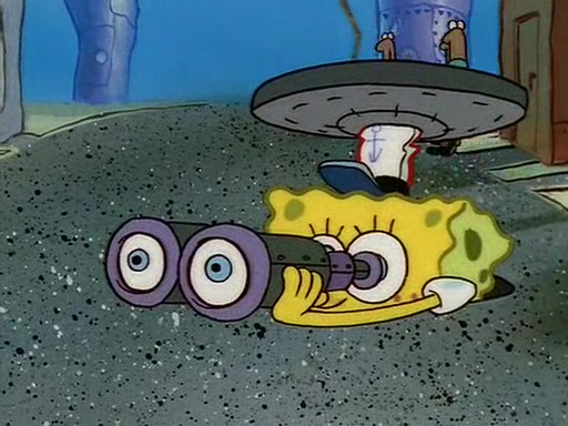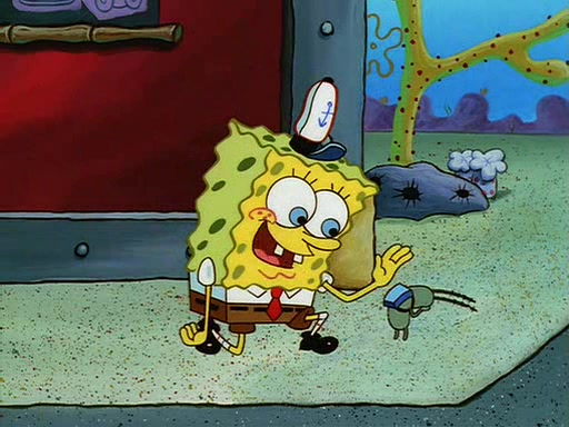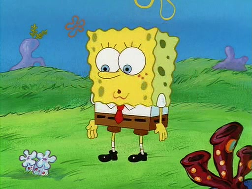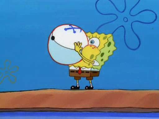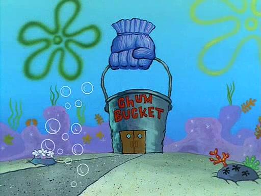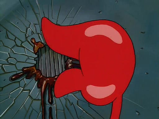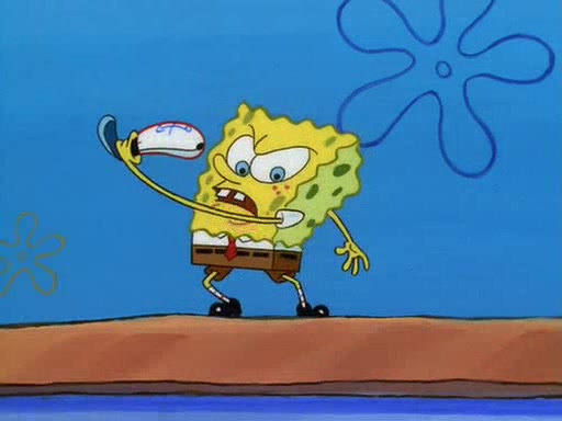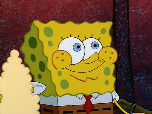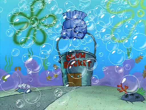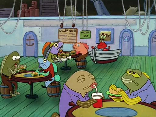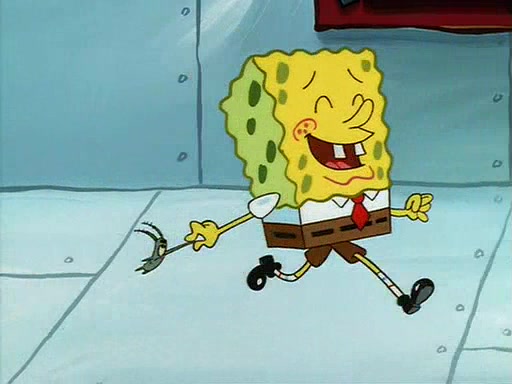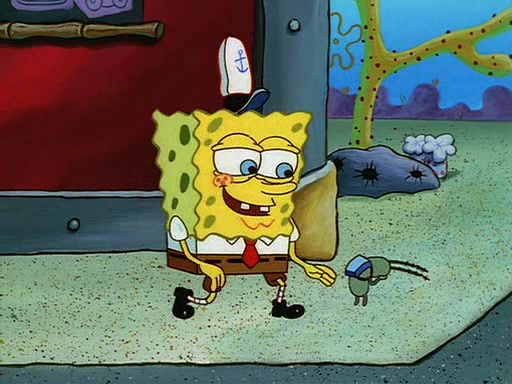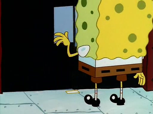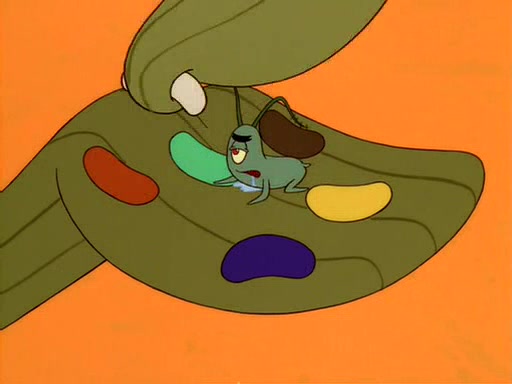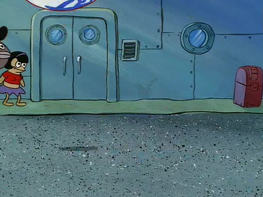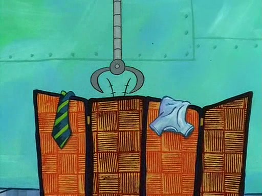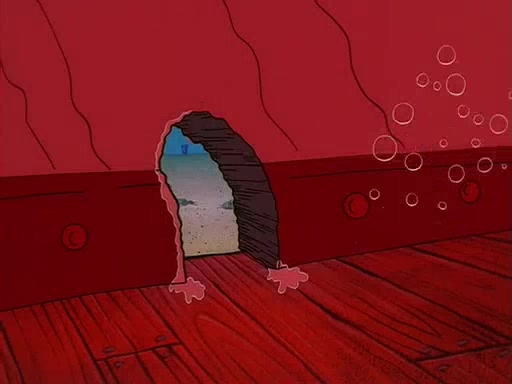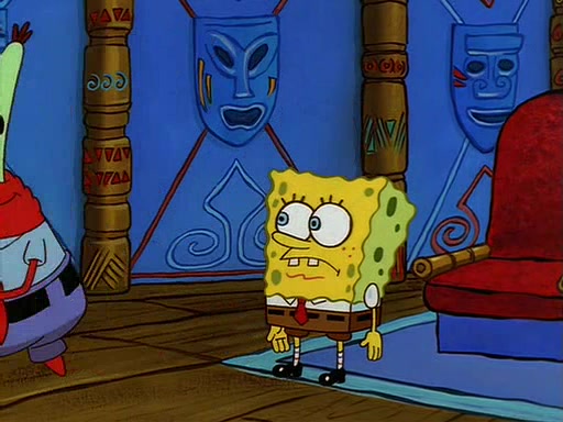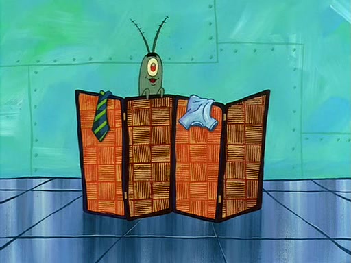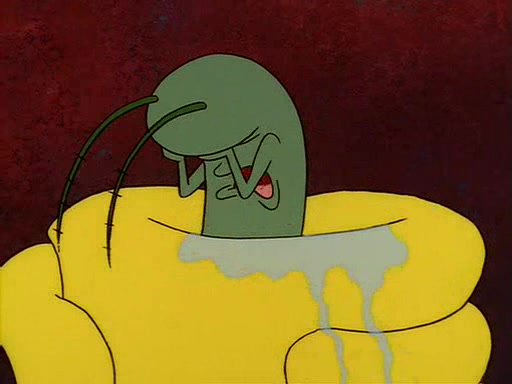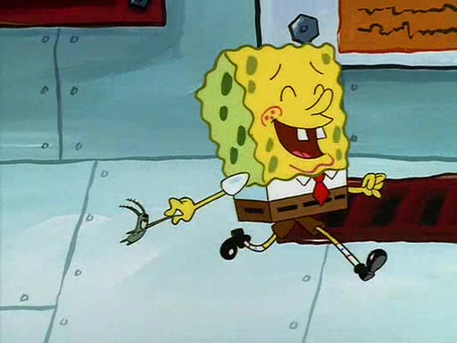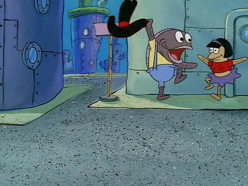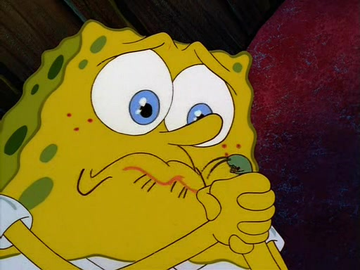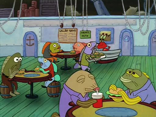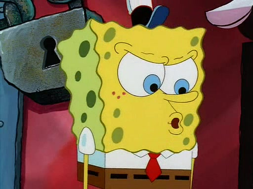 At the Reef Cinema, Mr. Krabs appears in front of the projector and shouts "reach into his pocket now and take what he's got!" SpongeBob reaches into Plankton's pocket and finds a Krabby Patty (the other people simply steal from their neighbor's pocket and leave the theater). SpongeBob realizes that Plankton used him to get a Krabby Patty, and Plankton attempts to explain that he realizes now that he only ever wanted friendship, before admitting to everything and running off with the patty. However, he runs directly through the movie screen into a solid wall. Plankton is squashed, badly, and Mr. Krabs flicks him off the wall onto Bubble Bass' hand, who mistakes Plankton for a jellybean and chases him around his hand.