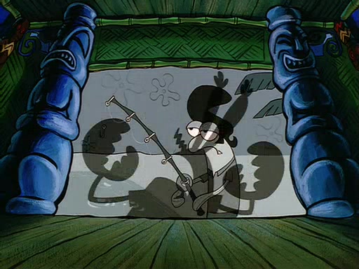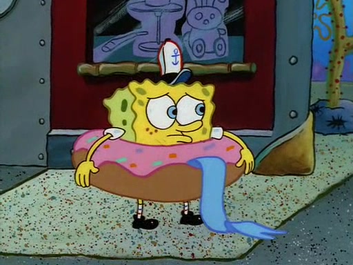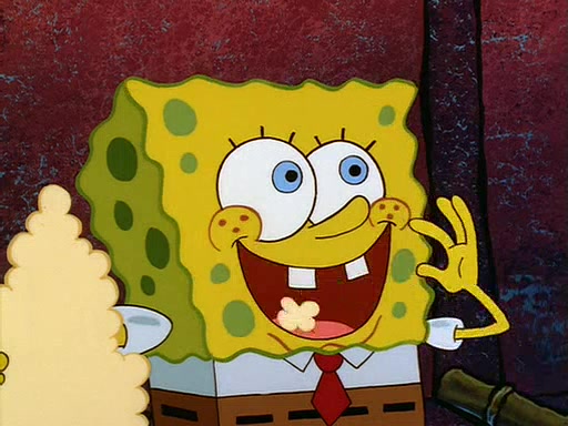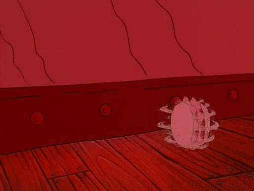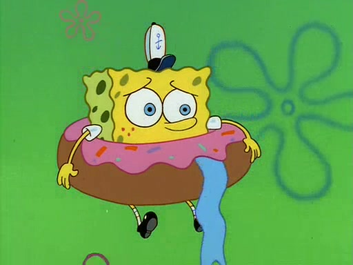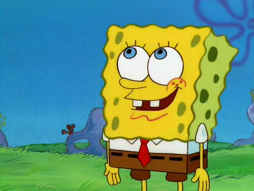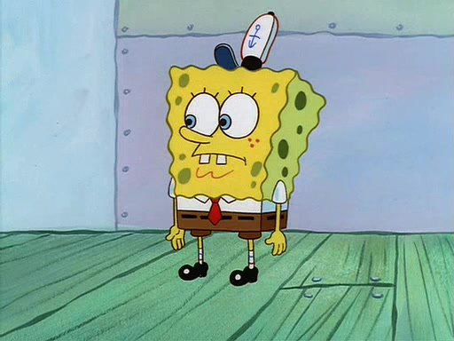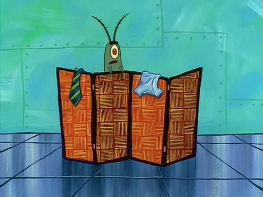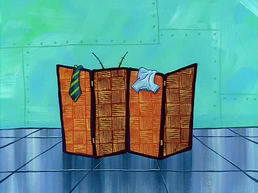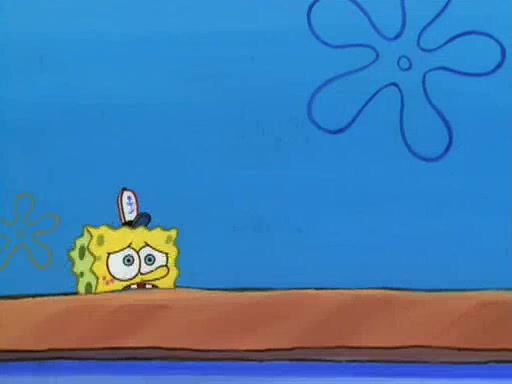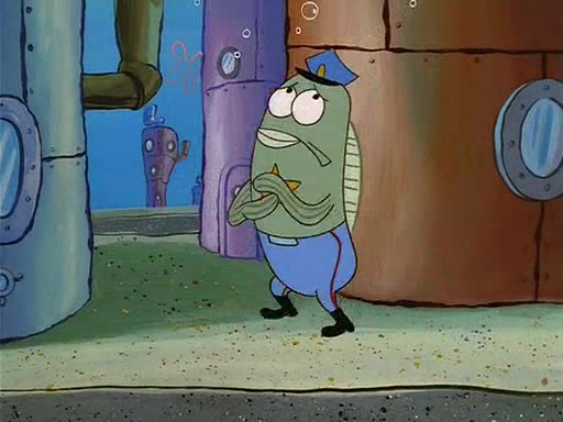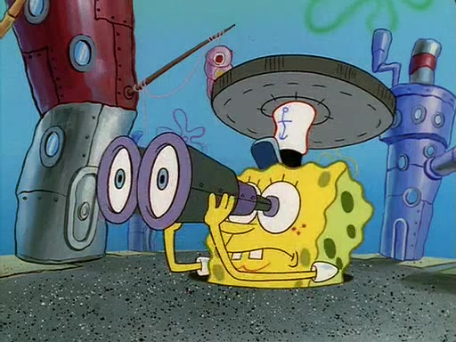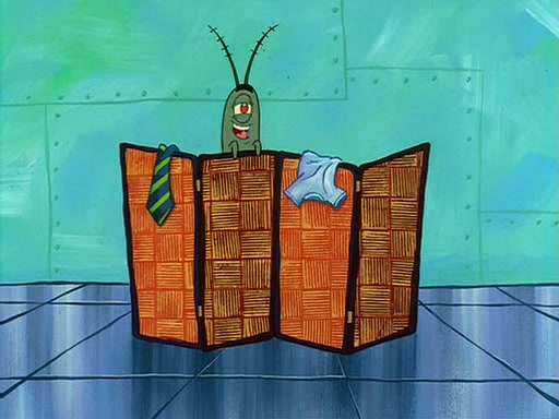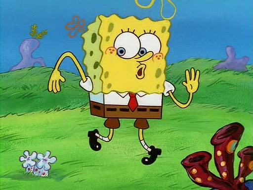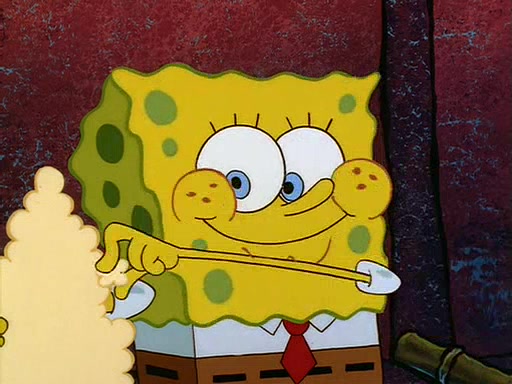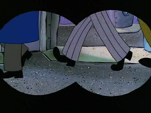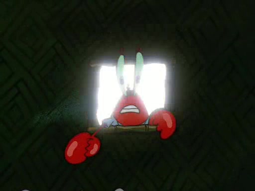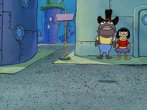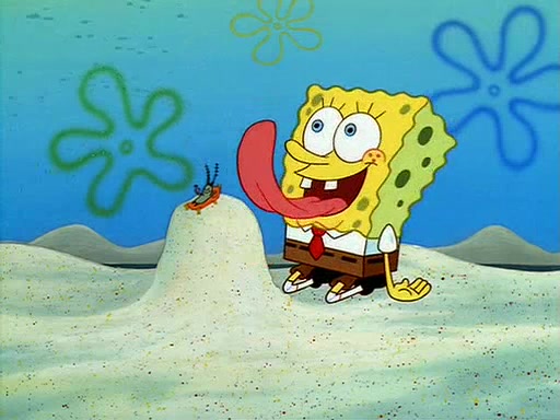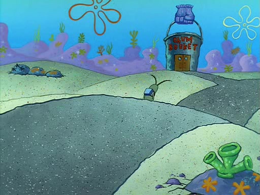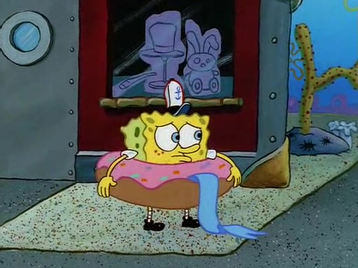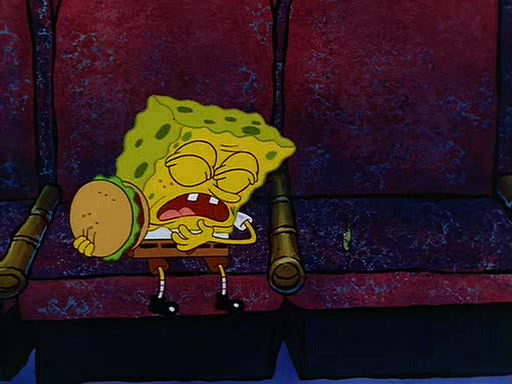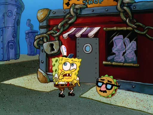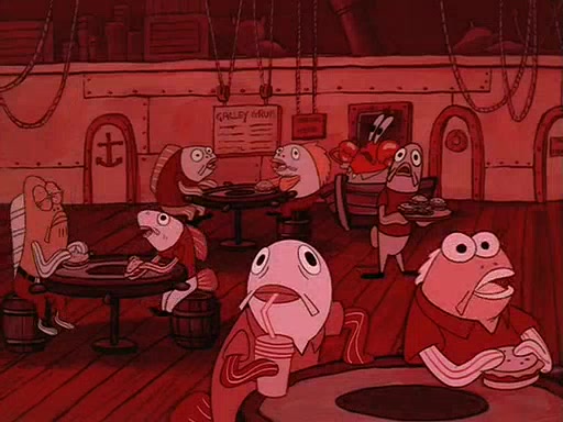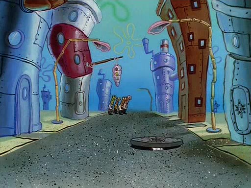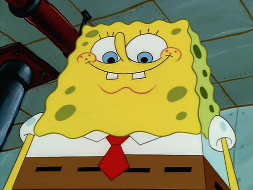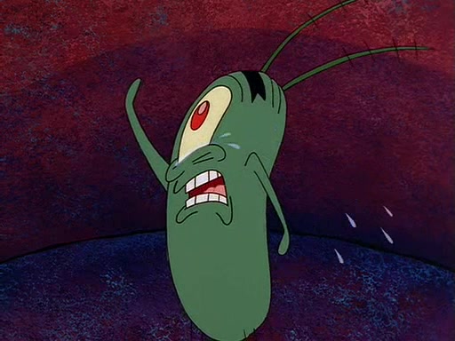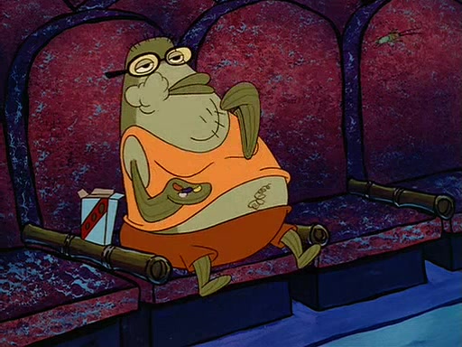 At the Reef Cinema, Mr. Krabs appears in front of the projector and shouts "reach into his pocket now and take what he's got!" SpongeBob reaches into Plankton's pocket and finds a Krabby Patty (the other people simply steal from their neighbor's pocket and leave the theater). SpongeBob realizes that Plankton used him to get a Krabby Patty, and Plankton attempts to explain that he realizes now that he only ever wanted friendship, before admitting to everything and running off with the patty. However, he runs directly through the movie screen into a solid wall. Plankton is squashed, badly, and Mr. Krabs flicks him off the wall onto Bubble Bass' hand, who mistakes Plankton for a jellybean and chases him around his hand.