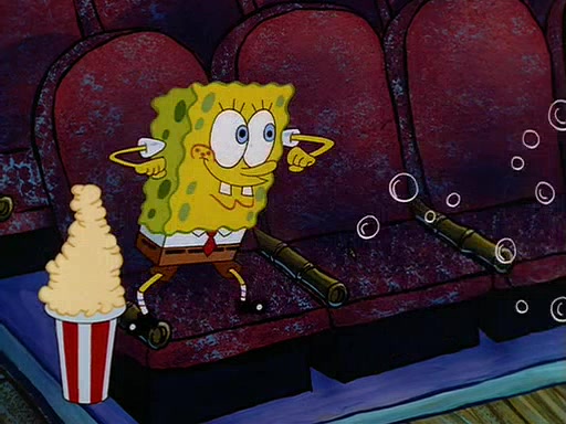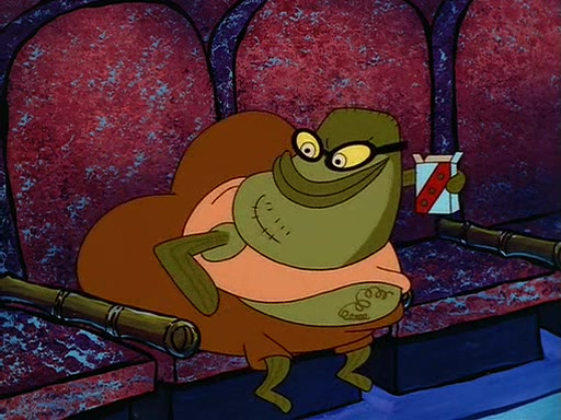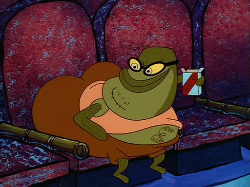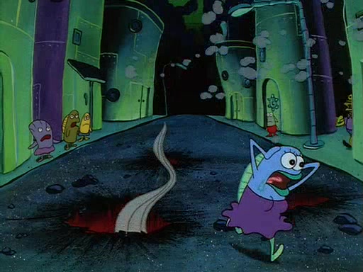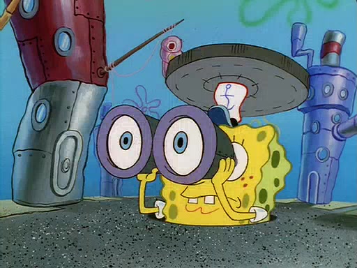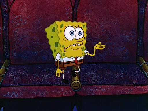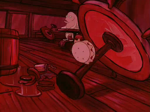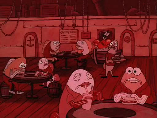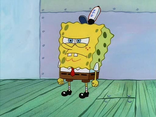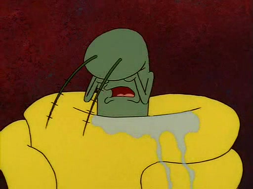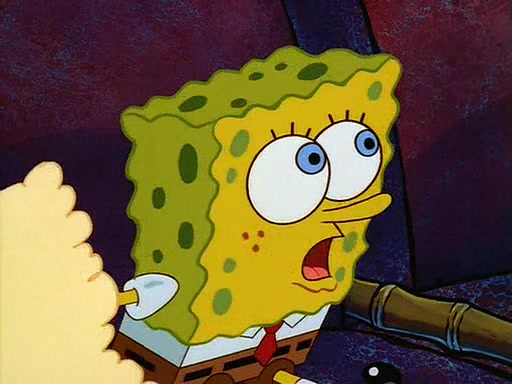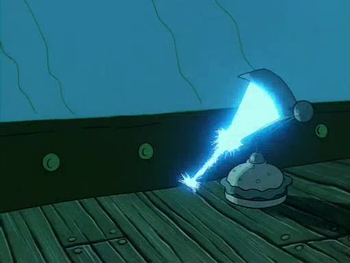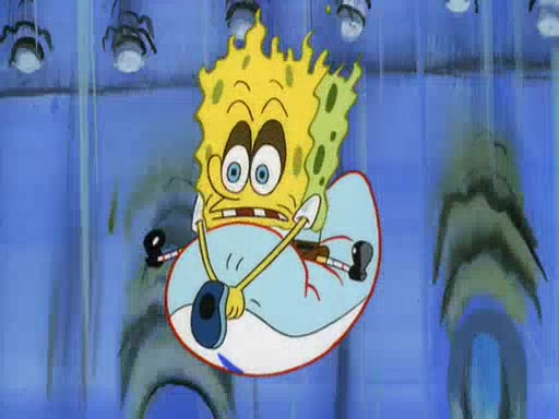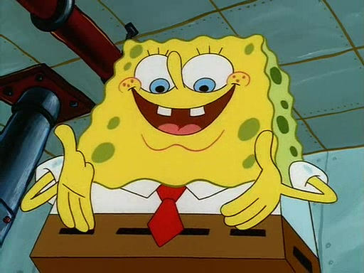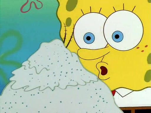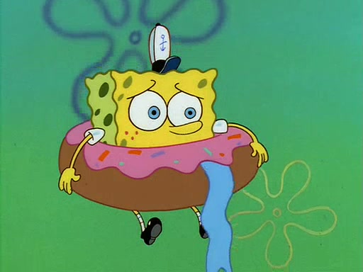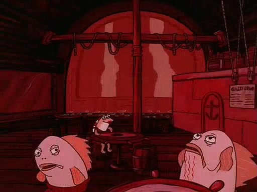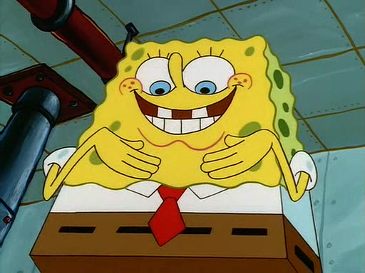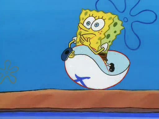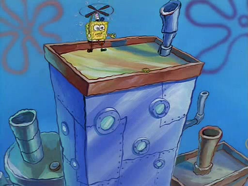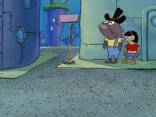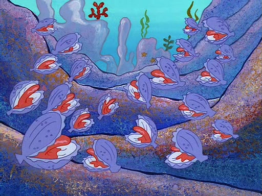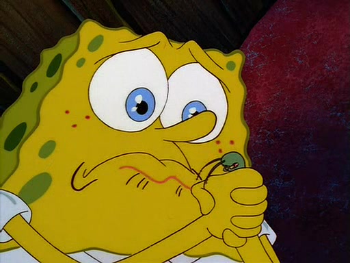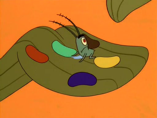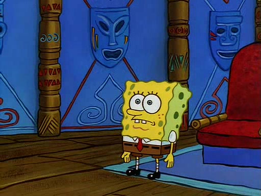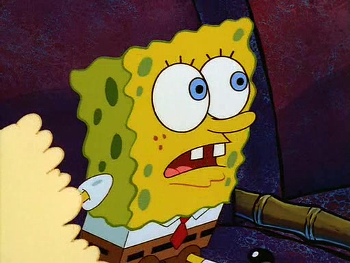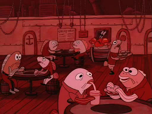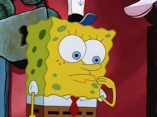 At the Reef Cinema, Mr. Krabs appears in front of the projector and shouts "reach into his pocket now and take what he's got!" SpongeBob reaches into Plankton's pocket and finds a Krabby Patty (the other people simply steal from their neighbor's pocket and leave the theater). SpongeBob realizes that Plankton used him to get a Krabby Patty, and Plankton attempts to explain that he realizes now that he only ever wanted friendship, before admitting to everything and running off with the patty. However, he runs directly through the movie screen into a solid wall. Plankton is squashed, badly, and Mr. Krabs flicks him off the wall onto Bubble Bass' hand, who mistakes Plankton for a jellybean and chases him around his hand.