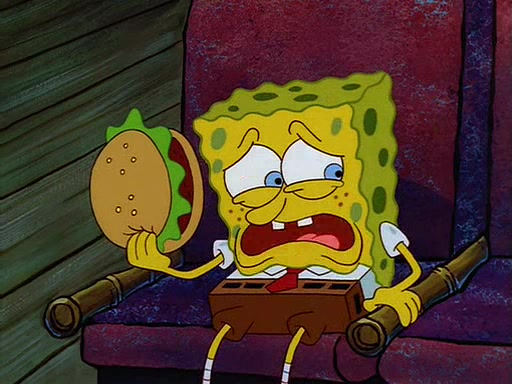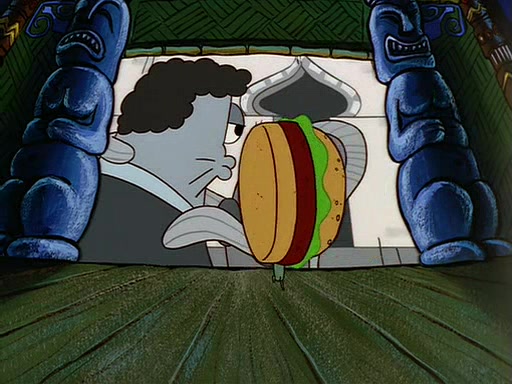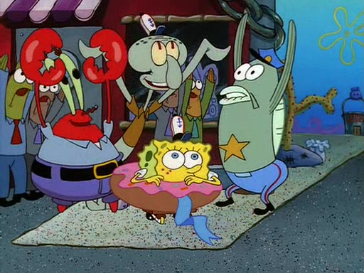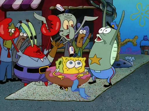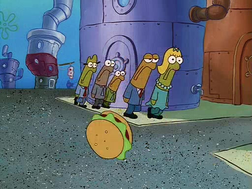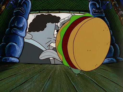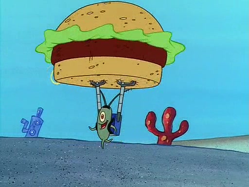SpongeBob heroically chases after it. After a long chase, SpongeBob finally recovers the Krabby Patty, and is congratulated by the townsfolk, while Plankton walks away sadly.