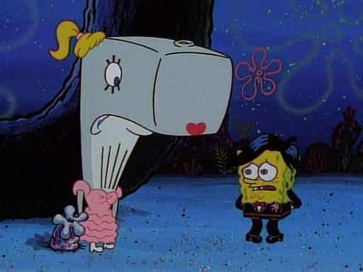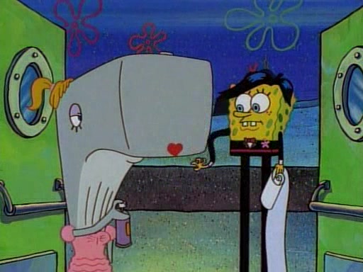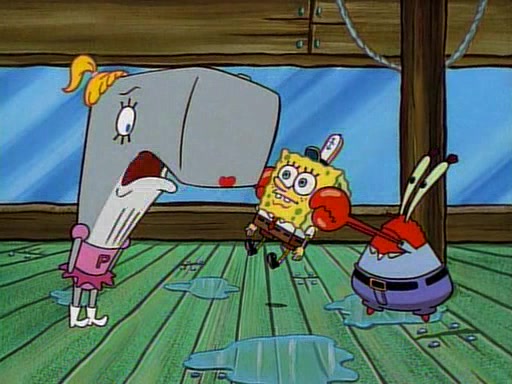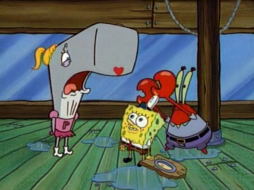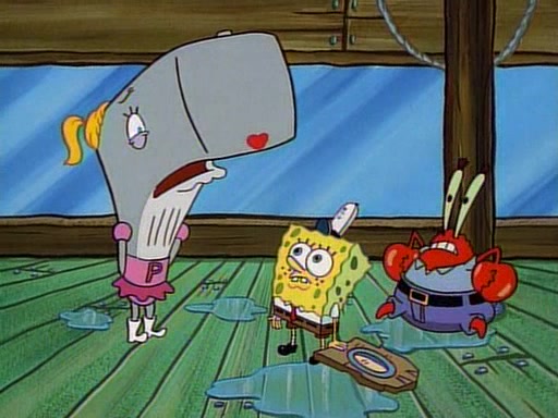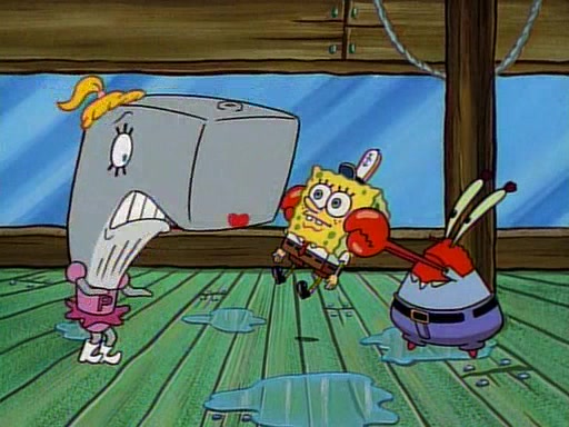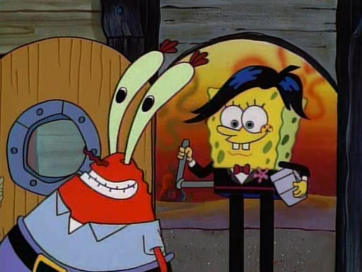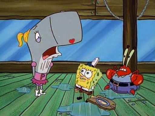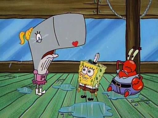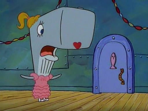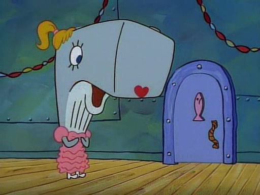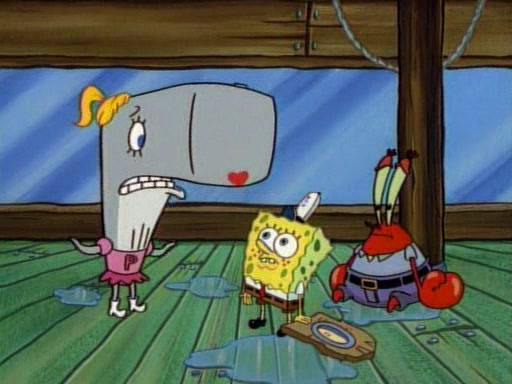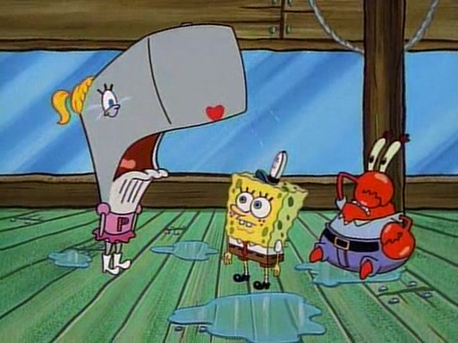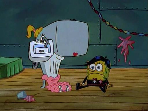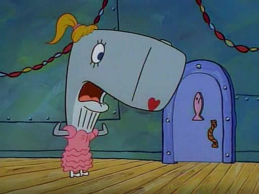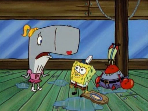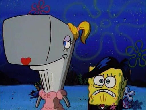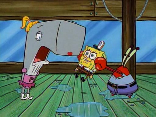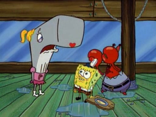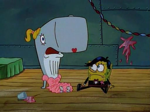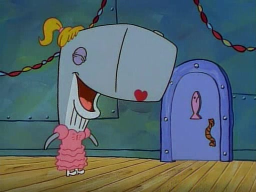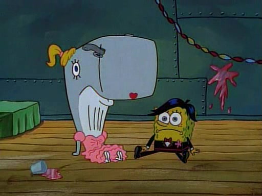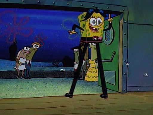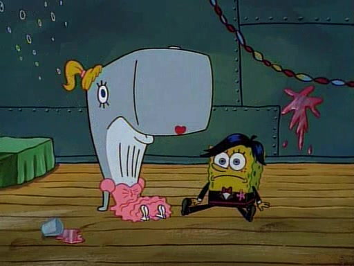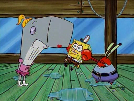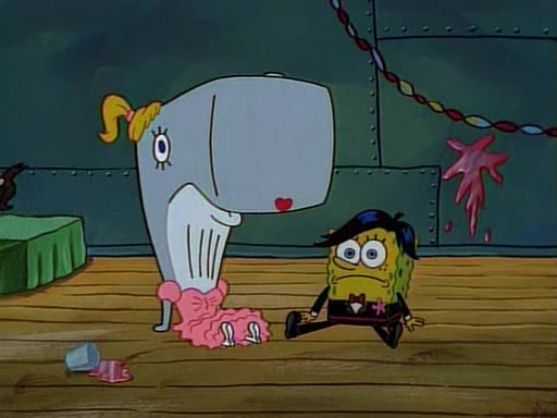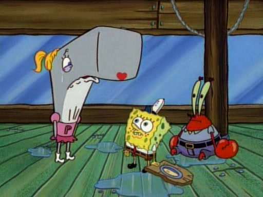 At the Krusty Krab, Pearl runs in crying so profusely that her tears begin literally flooding the restaurant. Mr. Krabs asks her what's wrong, and she explains that her prom date has just dumped her, and the prom is tomorrow night. Mr. Krabs suggests taking himself, but she starts crying, causing an earthquake. He then suggest he takes Squidward or one of the restaurant's customers to the prom, but she continues crying, which causes the earthquake to become worse. Ultimately, he chooses that SpongeBob should be the one that has to go with her. Pearl doesn't want to be embarrassed by SpongeBob, and begs him to do his best not to. At home, using a magazine as a guide, SpongeBob dresses up and uses extremely long artificial legs to make himself look "long, tan, and handsome" for Pearl. On the night of the prom, things initially work well for SpongeBob and Pearl. However, SpongeBob's costume soon begins malfunctioning, resulting in disaster and severely embarrassing Pearl. SpongeBob, after having broken everything at the prom, runs into the ladies' restroom crying. Pearl, feeling sorry for him, attempts to console him and restore his confidence.