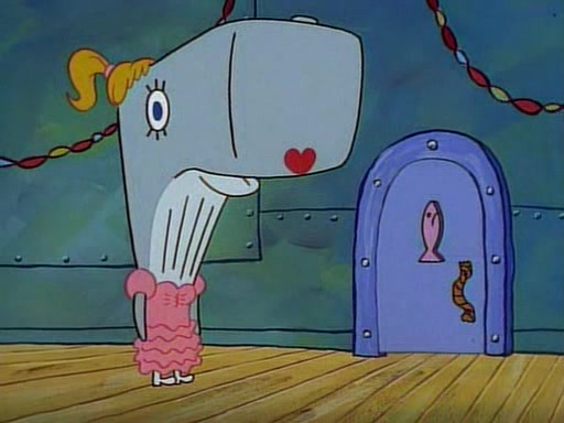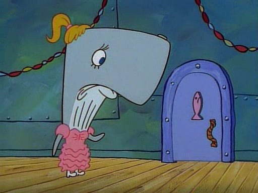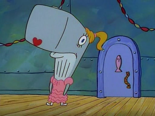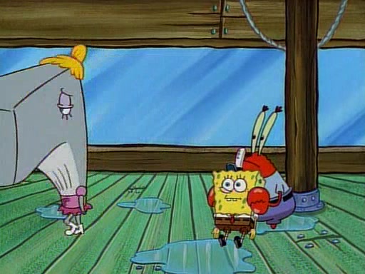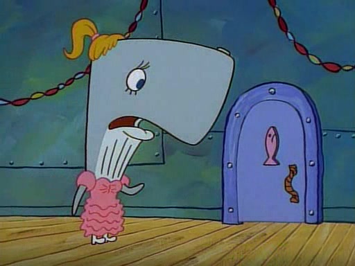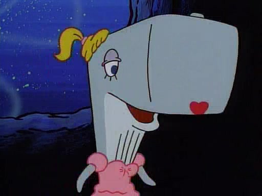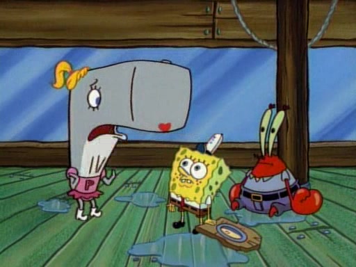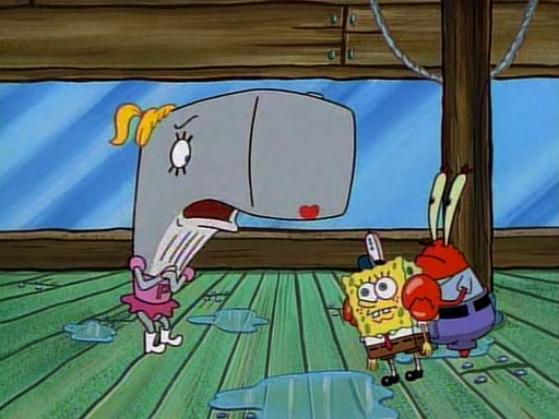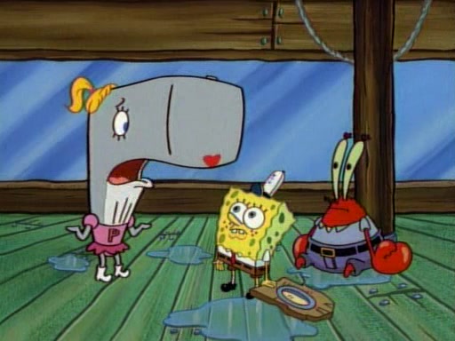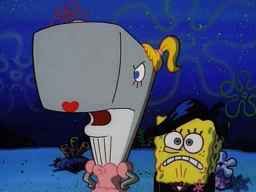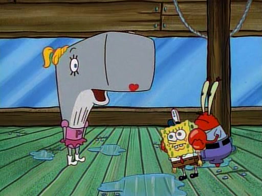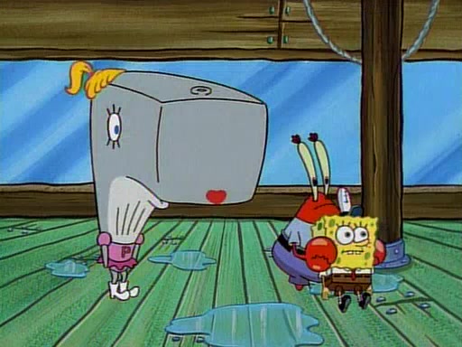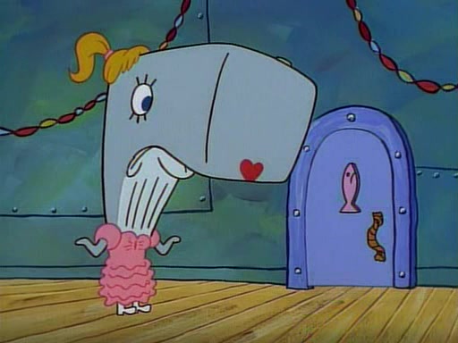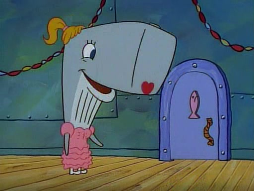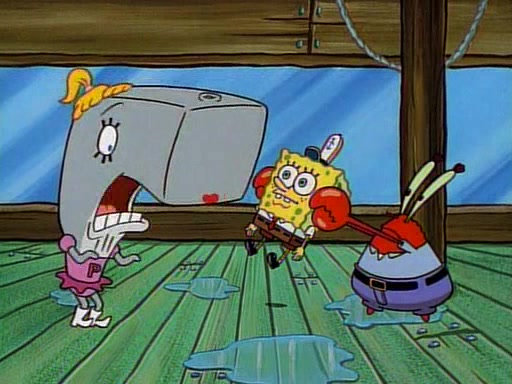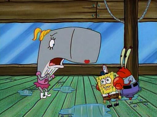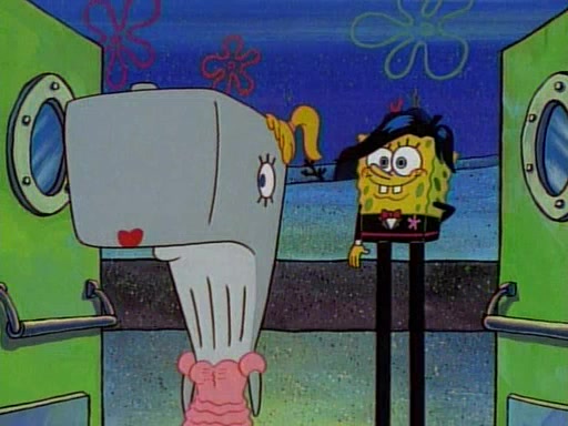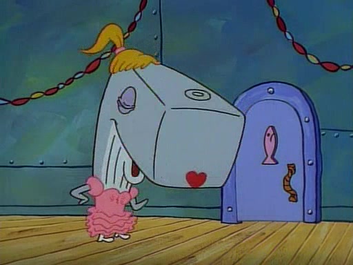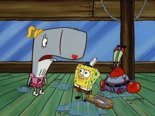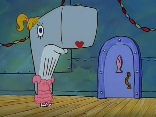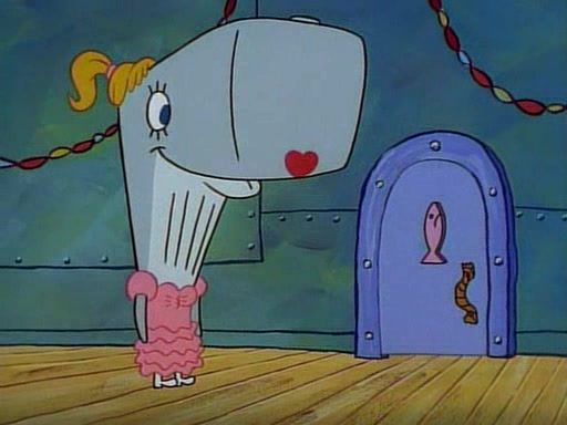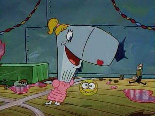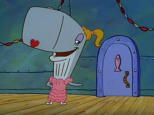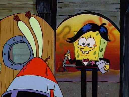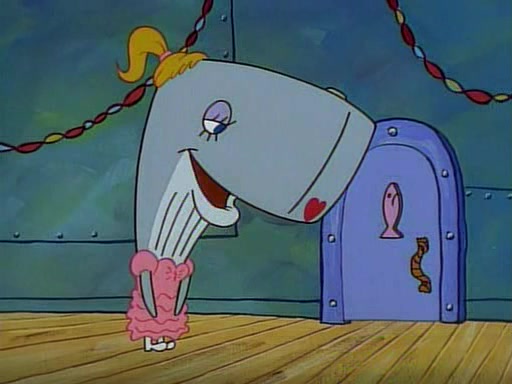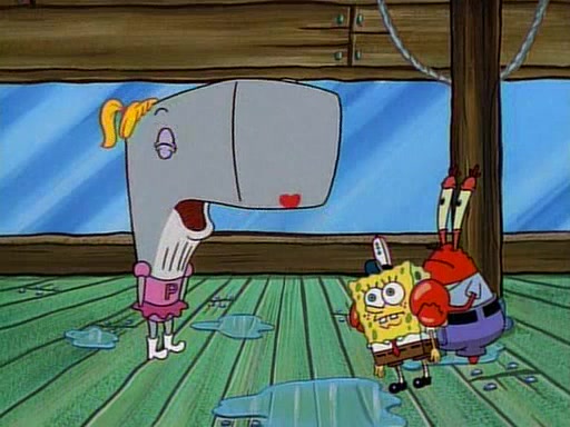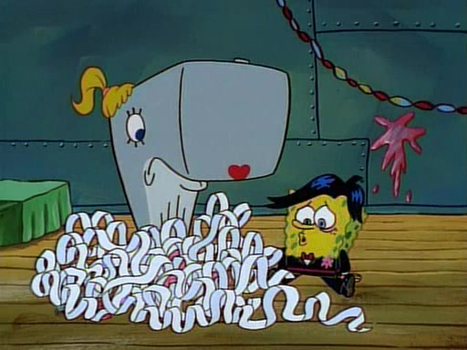 At the Krusty Krab, Pearl runs in crying so profusely that her tears begin literally flooding the restaurant. Mr. Krabs asks her what's wrong, and she explains that her prom date has just dumped her, and the prom is tomorrow night. Mr. Krabs suggests taking himself, but she starts crying, causing an earthquake. He then suggest he takes Squidward or one of the restaurant's customers to the prom, but she continues crying, which causes the earthquake to become worse. Ultimately, he chooses that SpongeBob should be the one that has to go with her. Pearl doesn't want to be embarrassed by SpongeBob, and begs him to do his best not to. At home, using a magazine as a guide, SpongeBob dresses up and uses extremely long artificial legs to make himself look "long, tan, and handsome" for Pearl. On the night of the prom, things initially work well for SpongeBob and Pearl. However, SpongeBob's costume soon begins malfunctioning, resulting in disaster and severely embarrassing Pearl. SpongeBob, after having broken everything at the prom, runs into the ladies' restroom crying. Pearl, feeling sorry for him, attempts to console him and restore his confidence.
