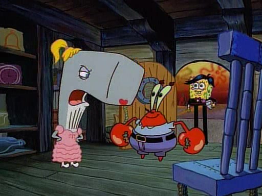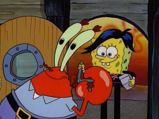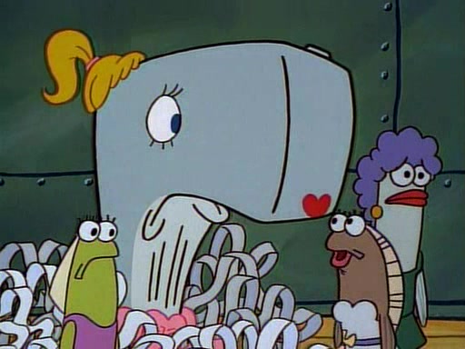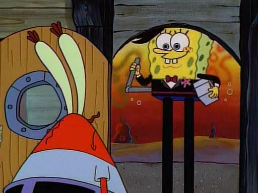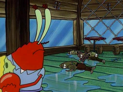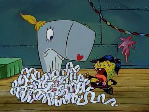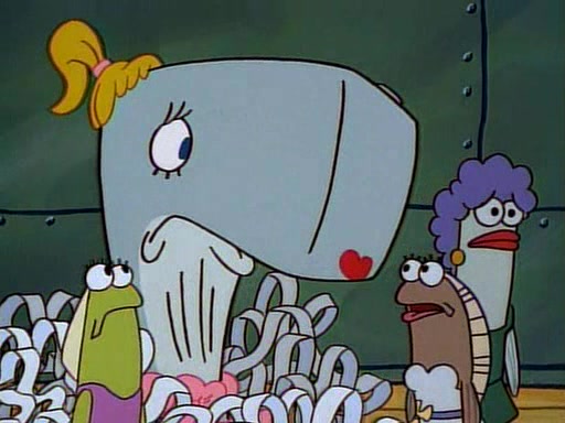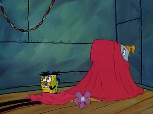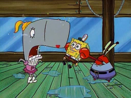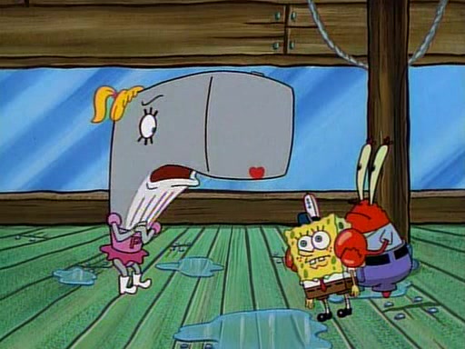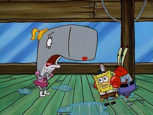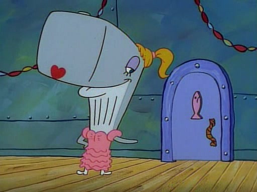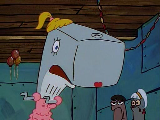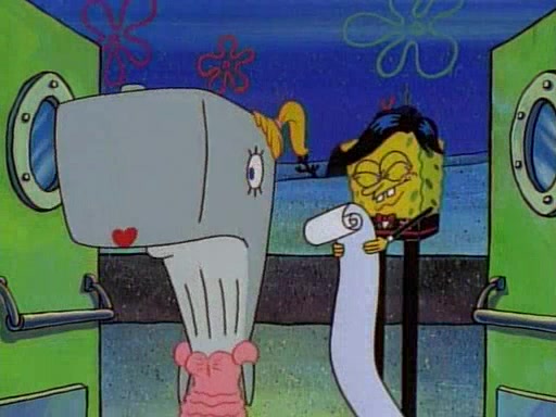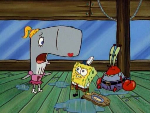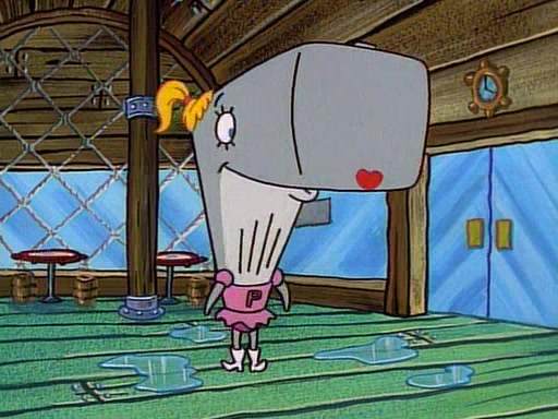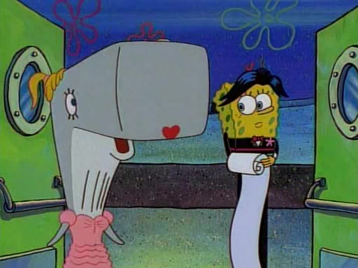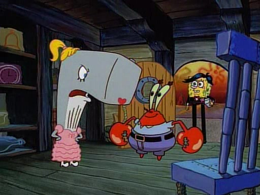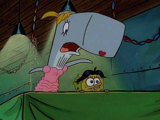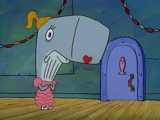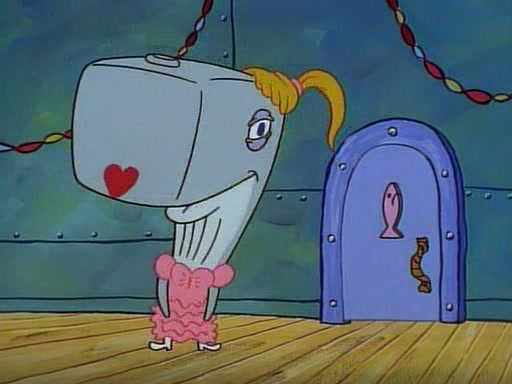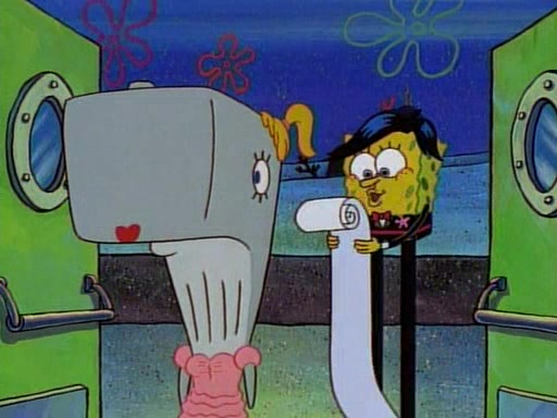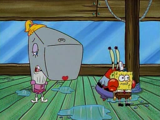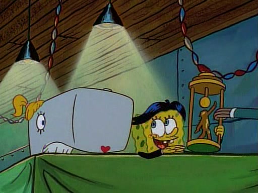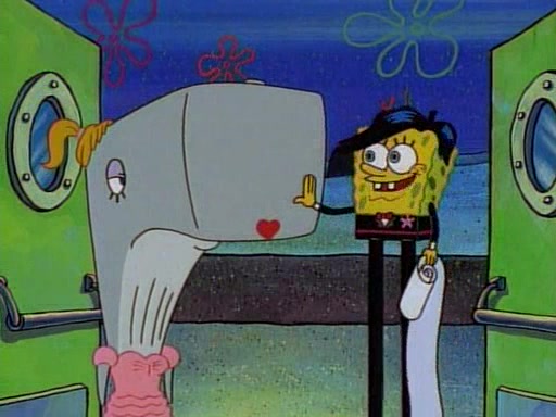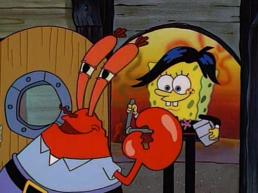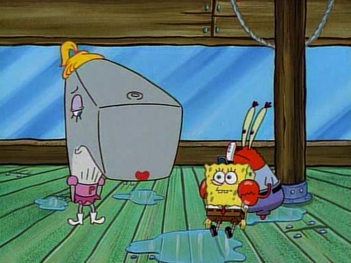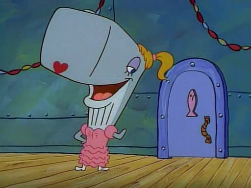 At the Krusty Krab, Pearl runs in crying so profusely that her tears begin literally flooding the restaurant. Mr. Krabs asks her what's wrong, and she explains that her prom date has just dumped her, and the prom is tomorrow night. Mr. Krabs suggests taking himself, but she starts crying, causing an earthquake. He then suggest he takes Squidward or one of the restaurant's customers to the prom, but she continues crying, which causes the earthquake to become worse. Ultimately, he chooses that SpongeBob should be the one that has to go with her. Pearl doesn't want to be embarrassed by SpongeBob, and begs him to do his best not to. At home, using a magazine as a guide, SpongeBob dresses up and uses extremely long artificial legs to make himself look "long, tan, and handsome" for Pearl. On the night of the prom, things initially work well for SpongeBob and Pearl. However, SpongeBob's costume soon begins malfunctioning, resulting in disaster and severely embarrassing Pearl. SpongeBob, after having broken everything at the prom, runs into the ladies' restroom crying. Pearl, feeling sorry for him, attempts to console him and restore his confidence.