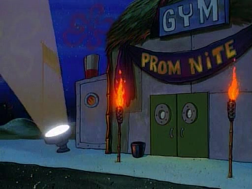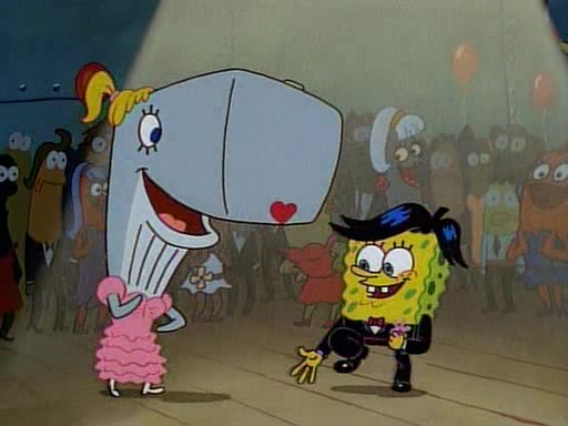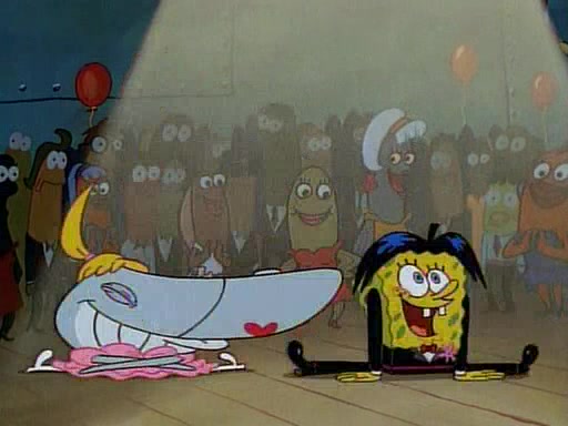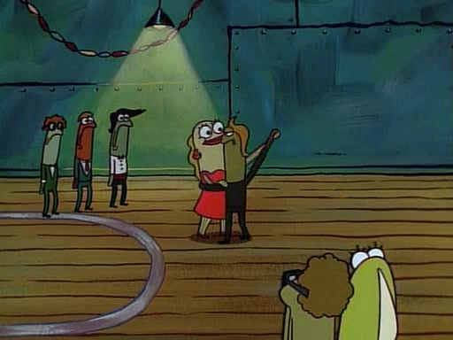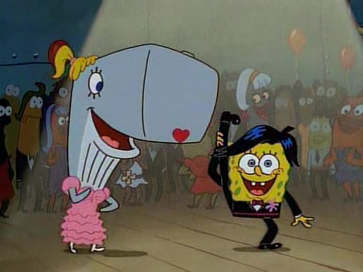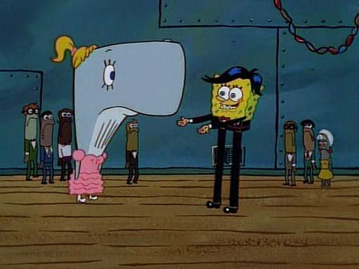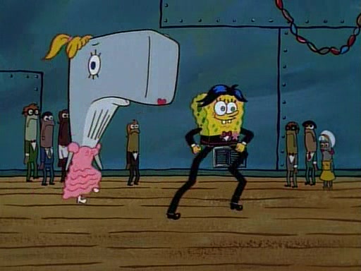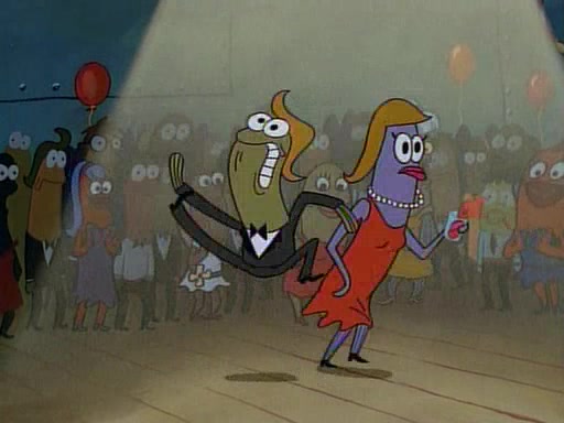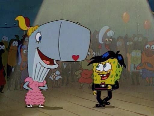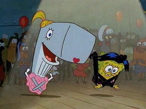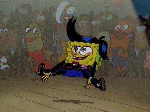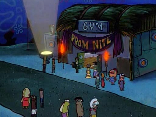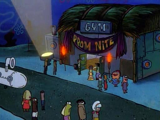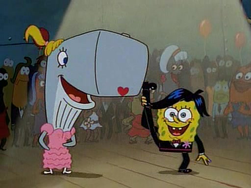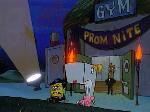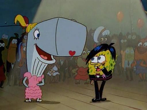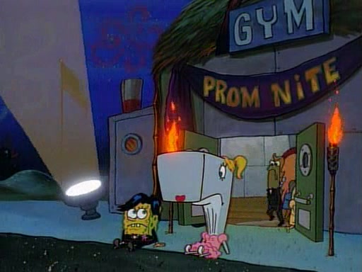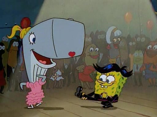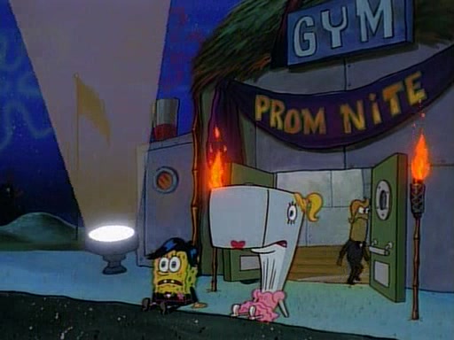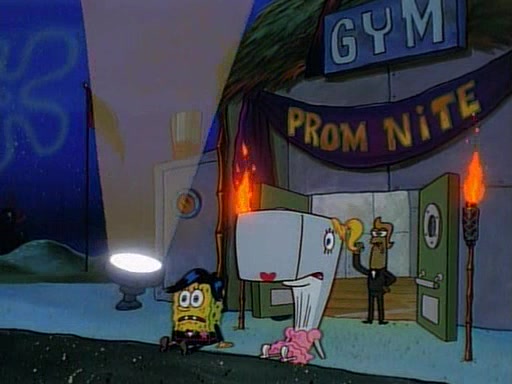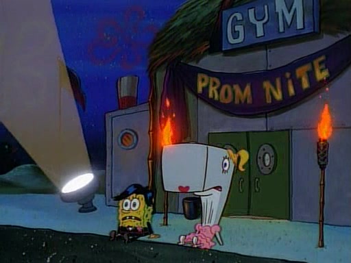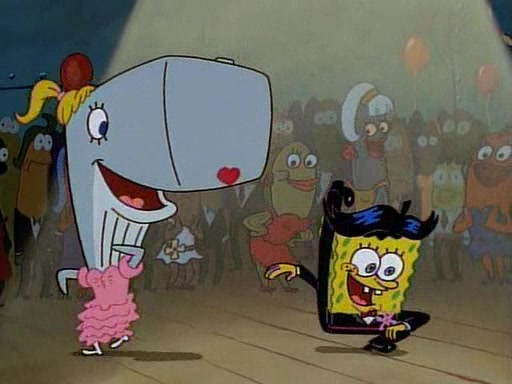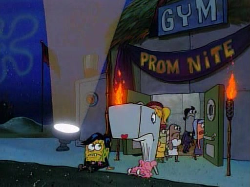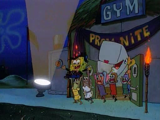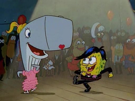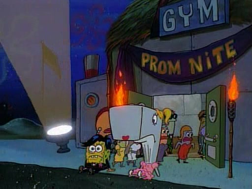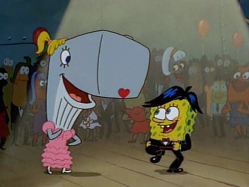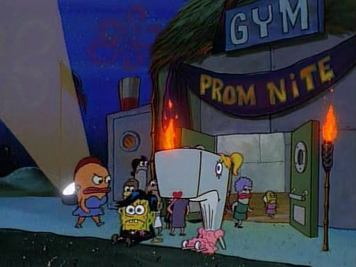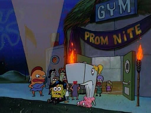 This ultimately succeeds, and Pearl and SpongeBob join the prom dance. They begin doing a dance called "The Sponge," which everyone else soon begins doing. However, this results in many injuries and mass destruction. An angry mob forms and lifts up Pearl and SpongeBob, who think this means that they are popular until the mob throws them out of the building. SpongeBob apologizes, and Pearl says even though it was a disaster, it was really fun. Pearl says goodnight to SpongeBob as she returns home, and tries to get SpongeBob's attention, but as she does so SpongeBob appears to be frozen. Mr. Krabs congratulates SpongeBob on his success at the prom, and the real SpongeBob appears to retrieve his wax dummy of himself (which was seen earlier in the episode), and carries it off, laughing.