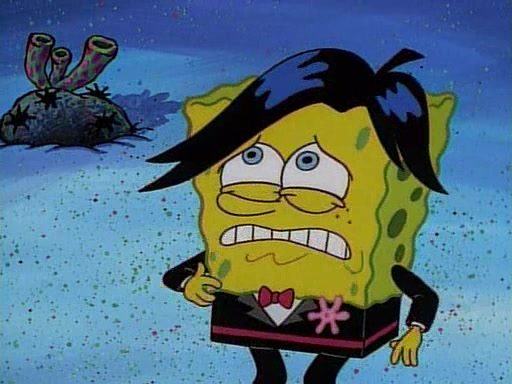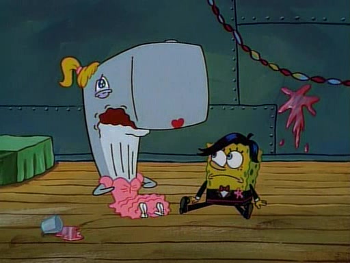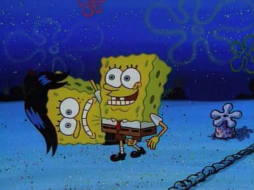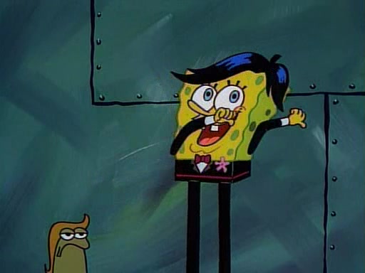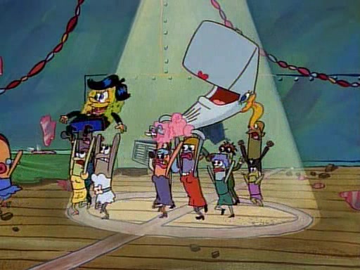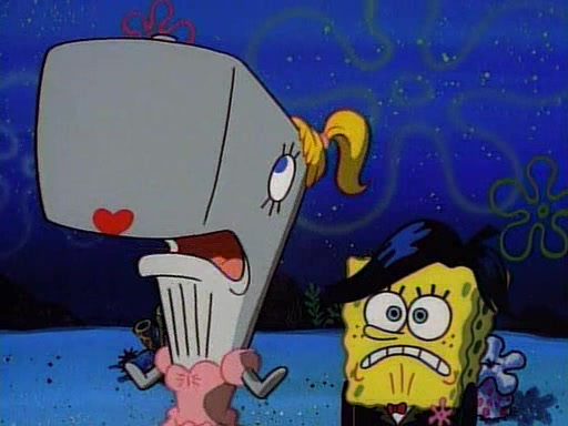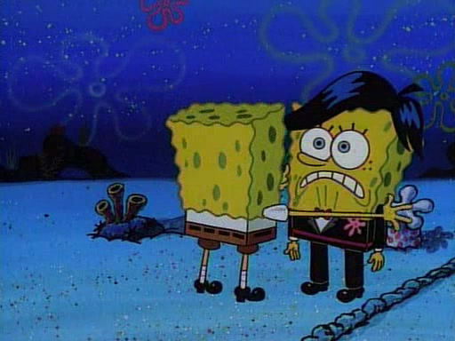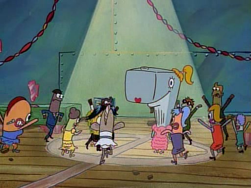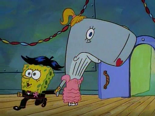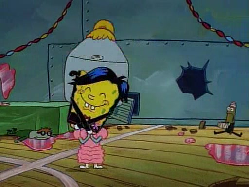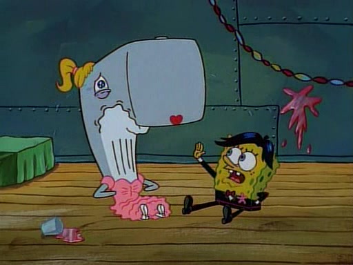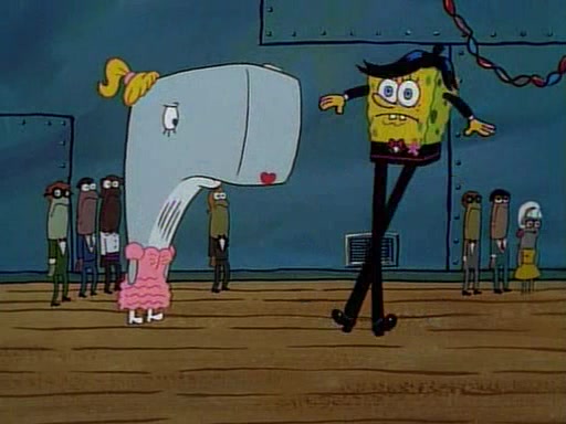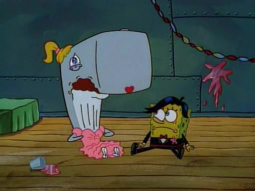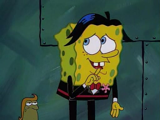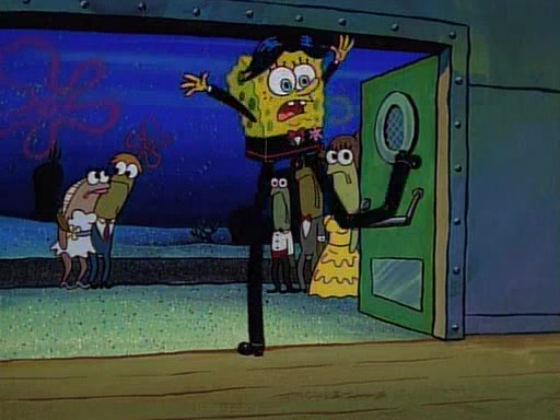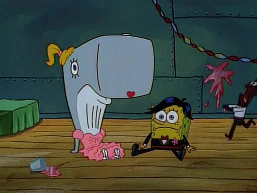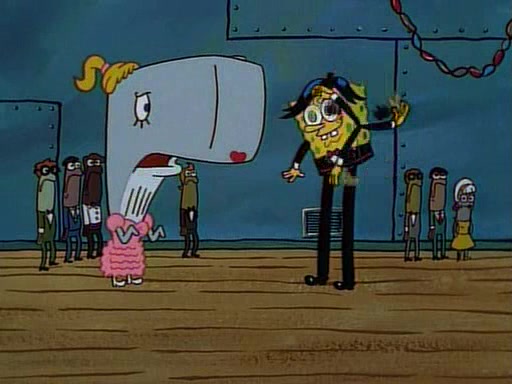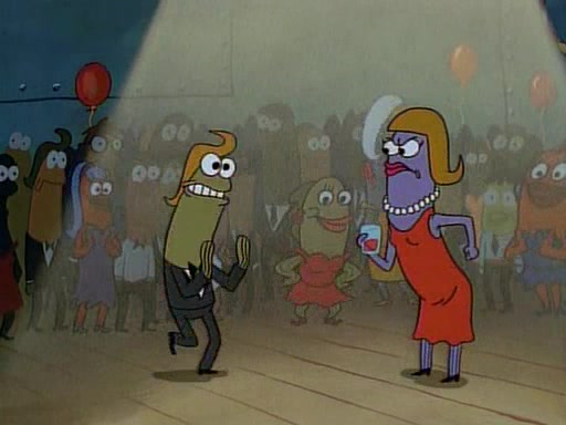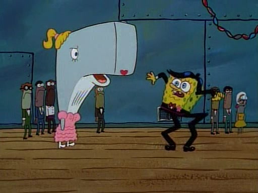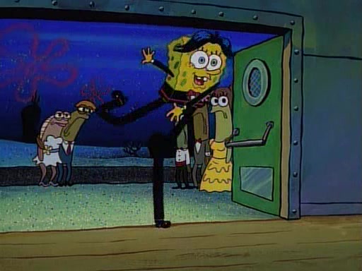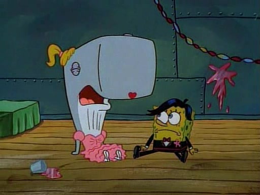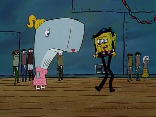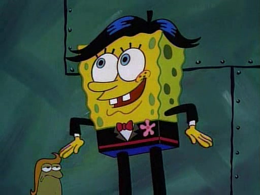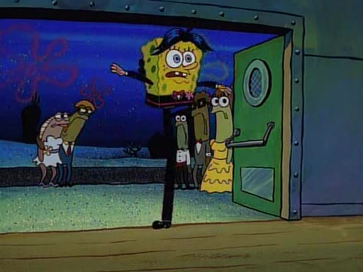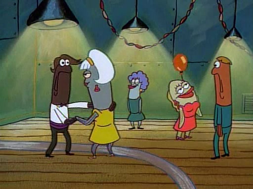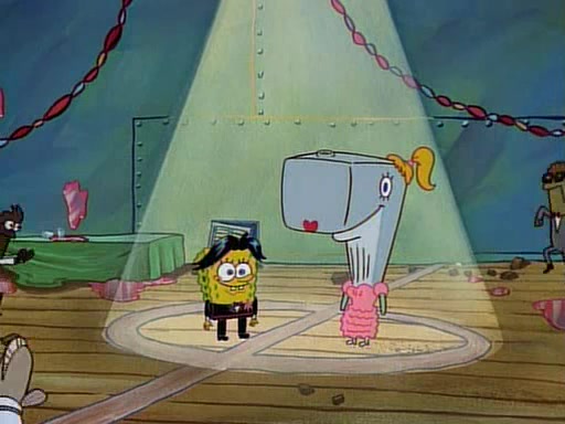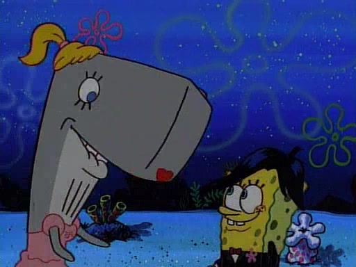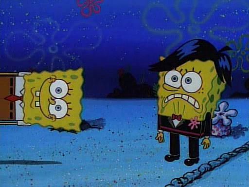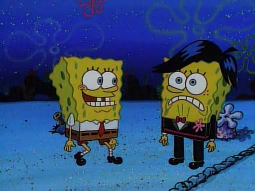 This ultimately succeeds, and Pearl and SpongeBob join the prom dance. They begin doing a dance called "The Sponge," which everyone else soon begins doing. However, this results in many injuries and mass destruction. An angry mob forms and lifts up Pearl and SpongeBob, who think this means that they are popular until the mob throws them out of the building. SpongeBob apologizes, and Pearl says even though it was a disaster, it was really fun. Pearl says goodnight to SpongeBob as she returns home, and tries to get SpongeBob's attention, but as she does so SpongeBob appears to be frozen. Mr. Krabs congratulates SpongeBob on his success at the prom, and the real SpongeBob appears to retrieve his wax dummy of himself (which was seen earlier in the episode), and carries it off, laughing.