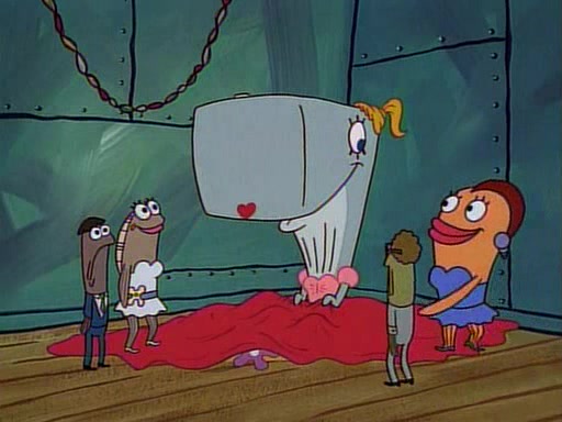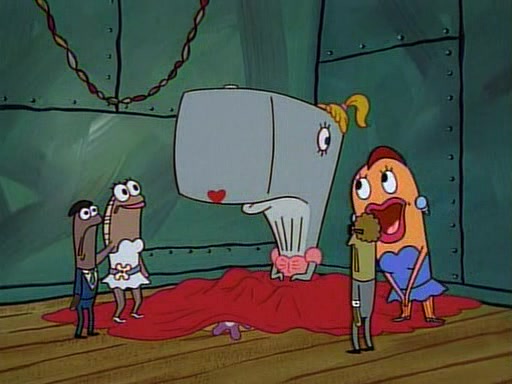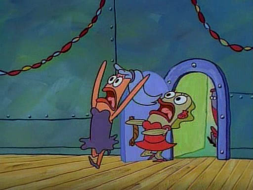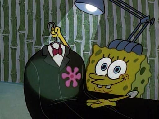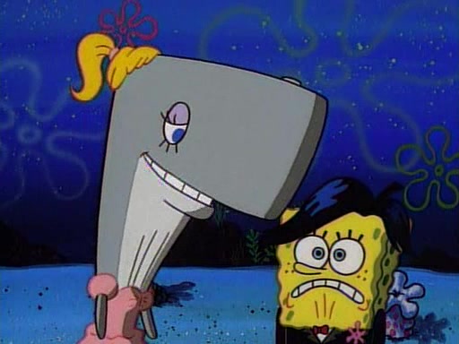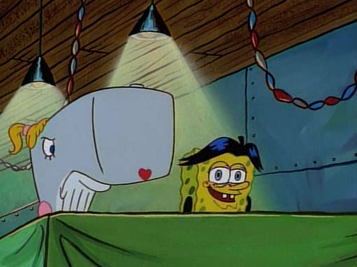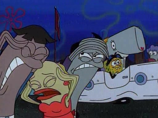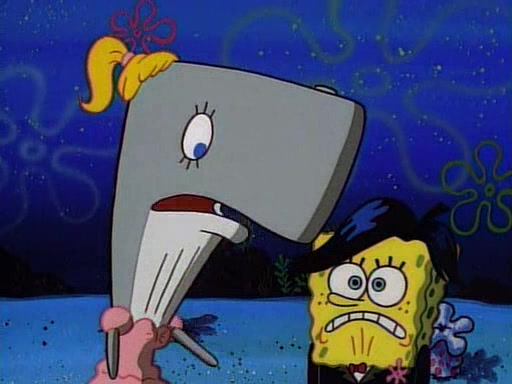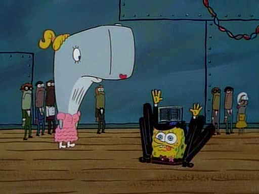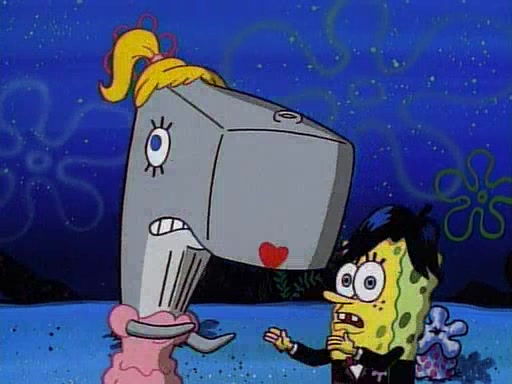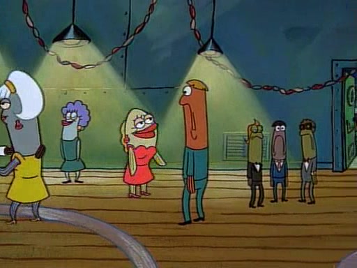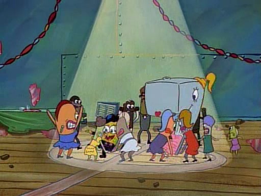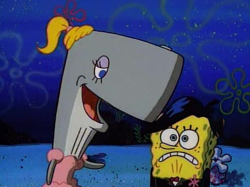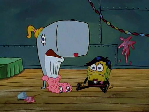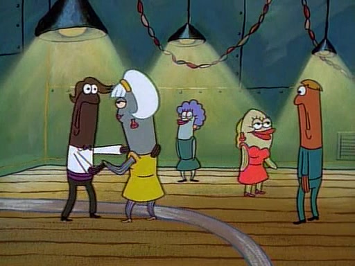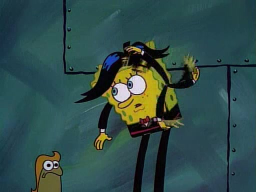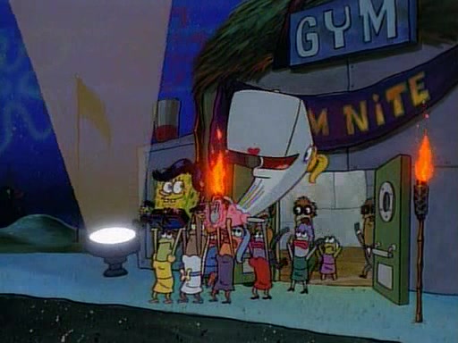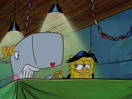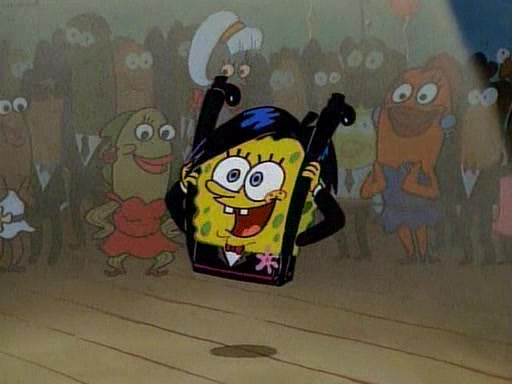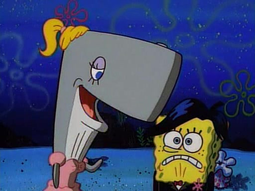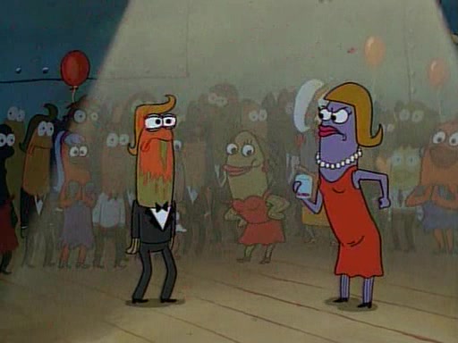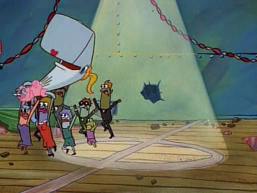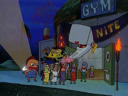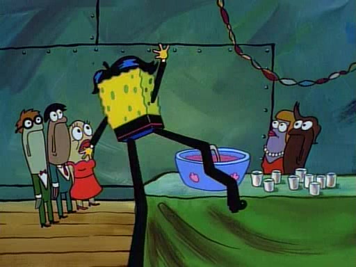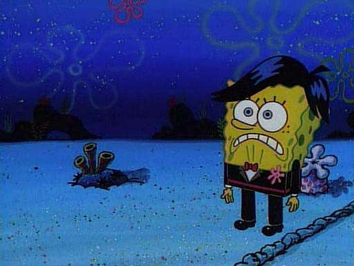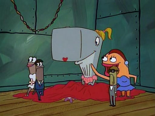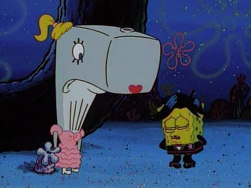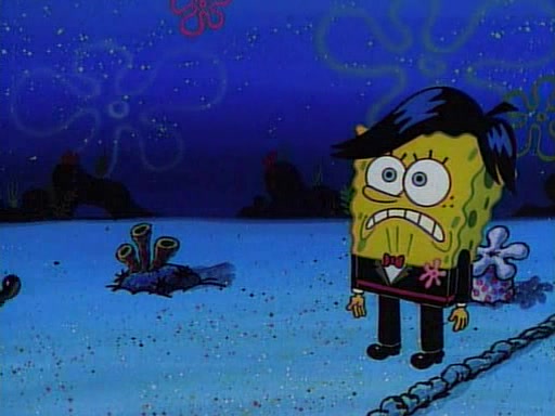 This ultimately succeeds, and Pearl and SpongeBob join the prom dance. They begin doing a dance called "The Sponge," which everyone else soon begins doing. However, this results in many injuries and mass destruction. An angry mob forms and lifts up Pearl and SpongeBob, who think this means that they are popular until the mob throws them out of the building. SpongeBob apologizes, and Pearl says even though it was a disaster, it was really fun. Pearl says goodnight to SpongeBob as she returns home, and tries to get SpongeBob's attention, but as she does so SpongeBob appears to be frozen. Mr. Krabs congratulates SpongeBob on his success at the prom, and the real SpongeBob appears to retrieve his wax dummy of himself (which was seen earlier in the episode), and carries it off, laughing.