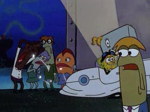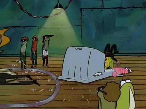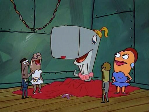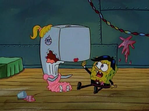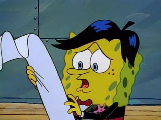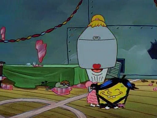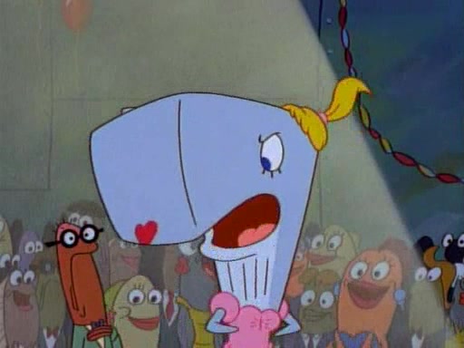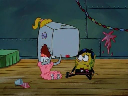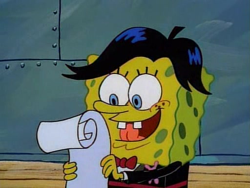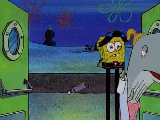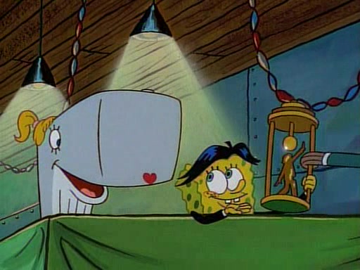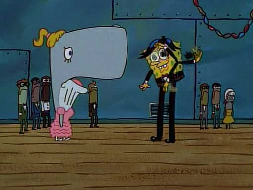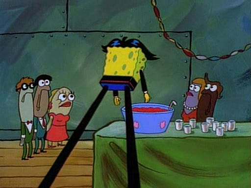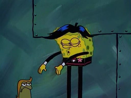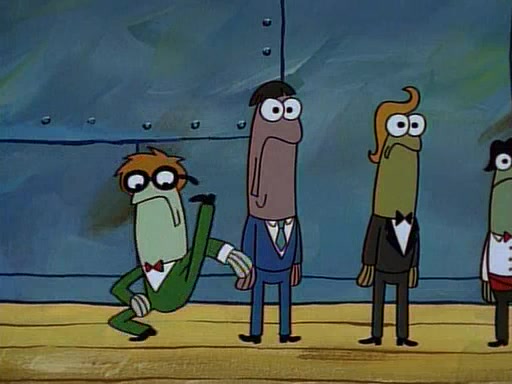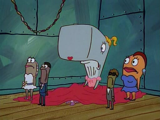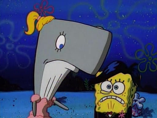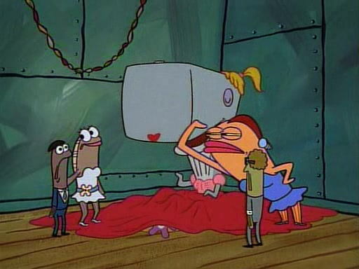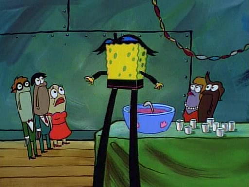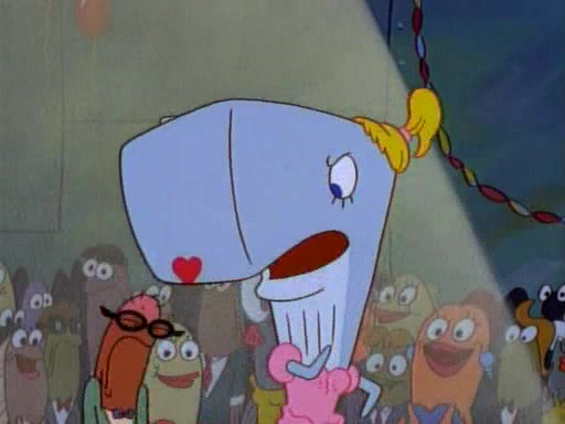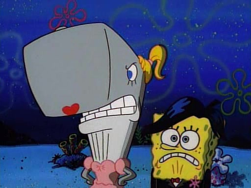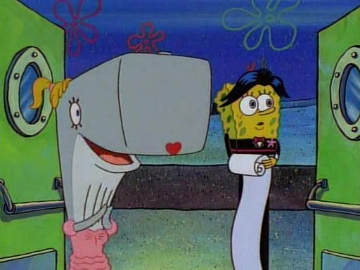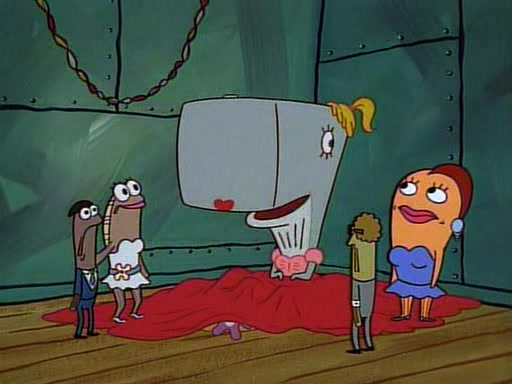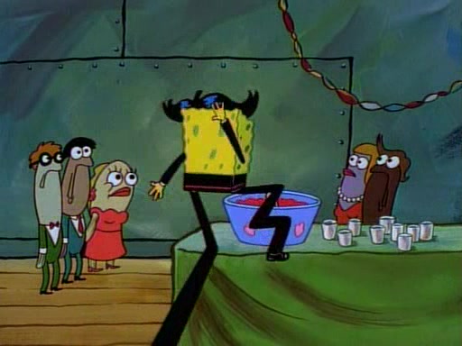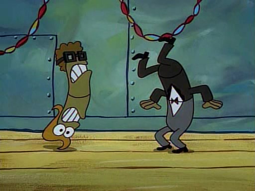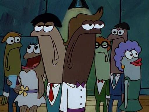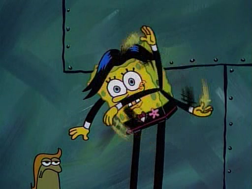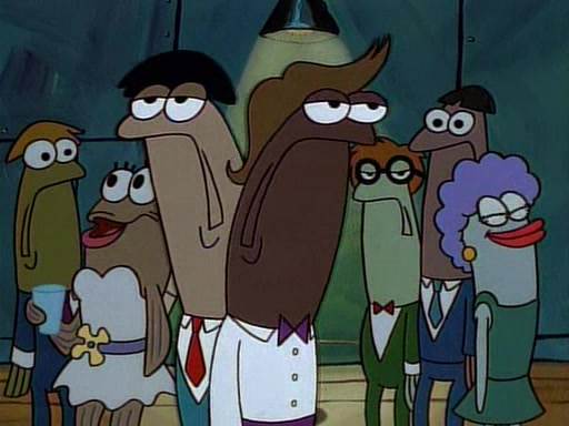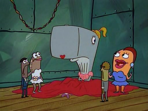 This ultimately succeeds, and Pearl and SpongeBob join the prom dance. They begin doing a dance called "The Sponge," which everyone else soon begins doing. However, this results in many injuries and mass destruction. An angry mob forms and lifts up Pearl and SpongeBob, who think this means that they are popular until the mob throws them out of the building. SpongeBob apologizes, and Pearl says even though it was a disaster, it was really fun. Pearl says goodnight to SpongeBob as she returns home, and tries to get SpongeBob's attention, but as she does so SpongeBob appears to be frozen. Mr. Krabs congratulates SpongeBob on his success at the prom, and the real SpongeBob appears to retrieve his wax dummy of himself (which was seen earlier in the episode), and carries it off, laughing.