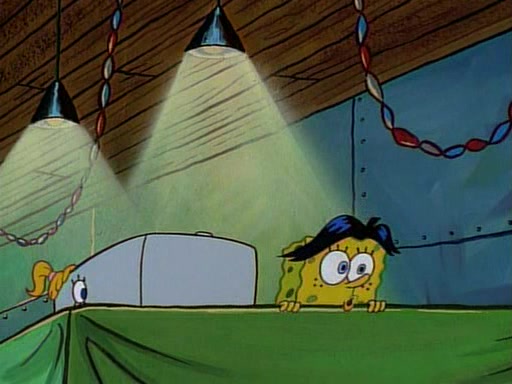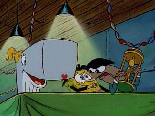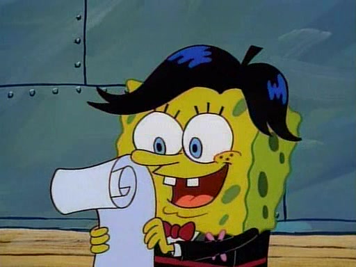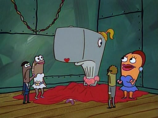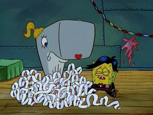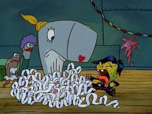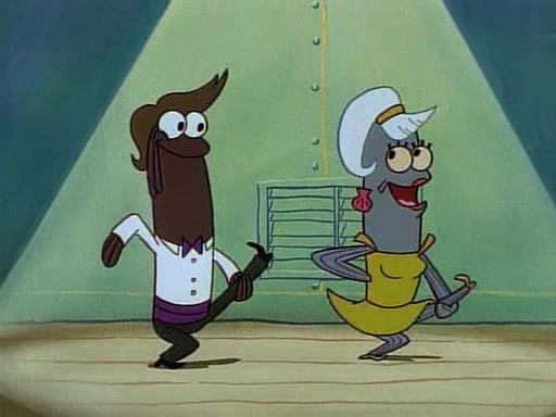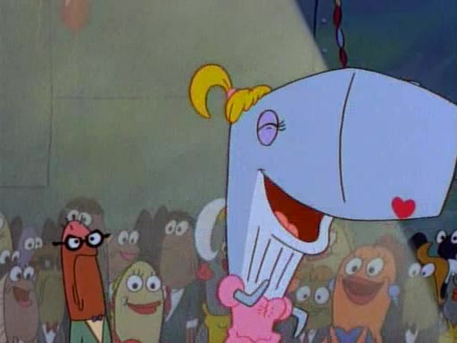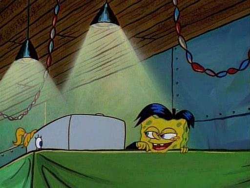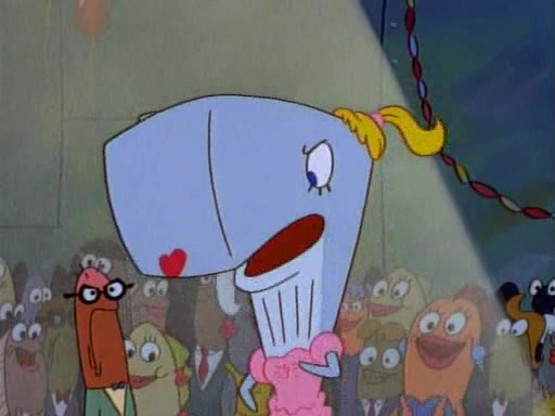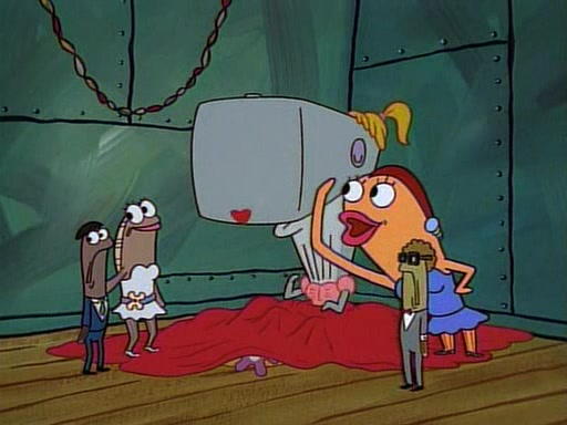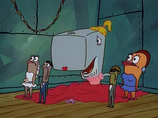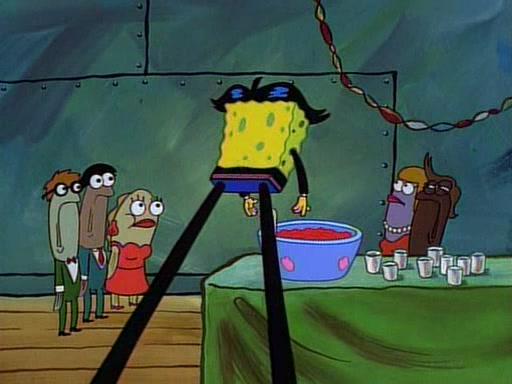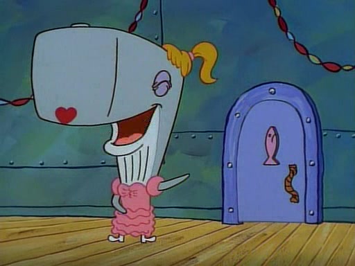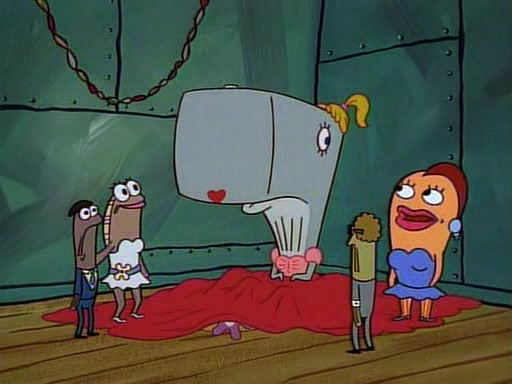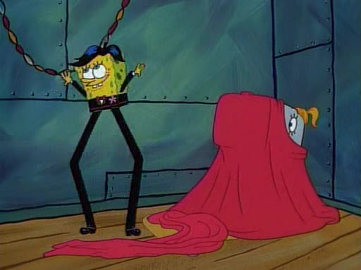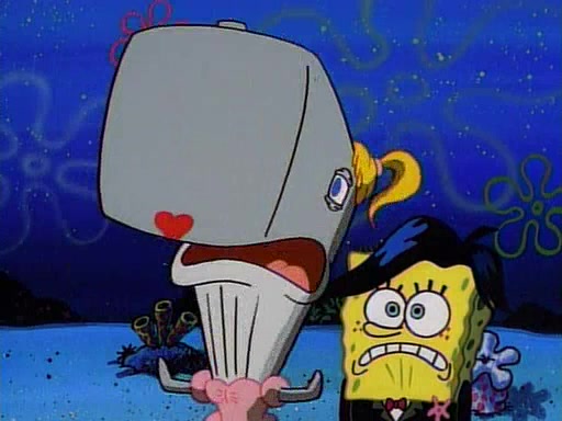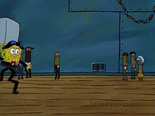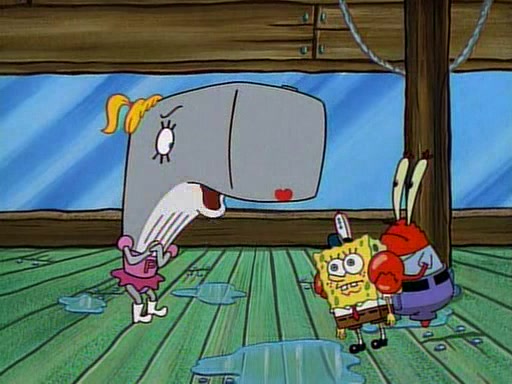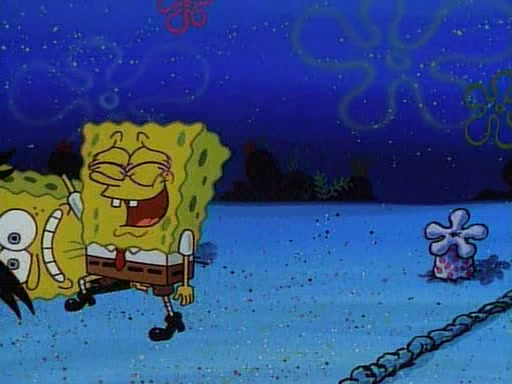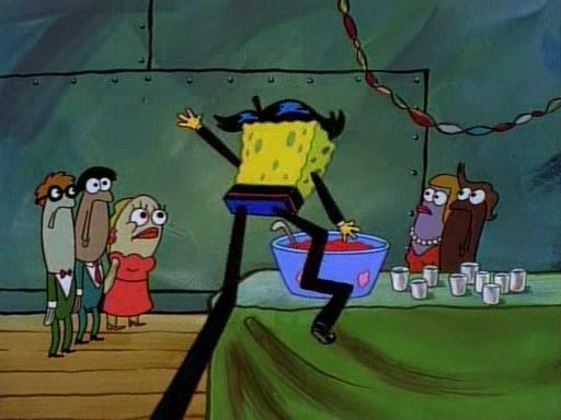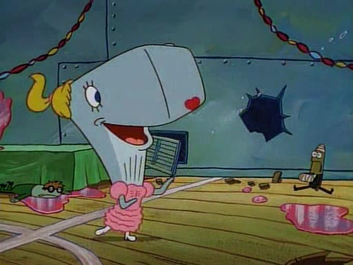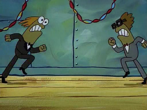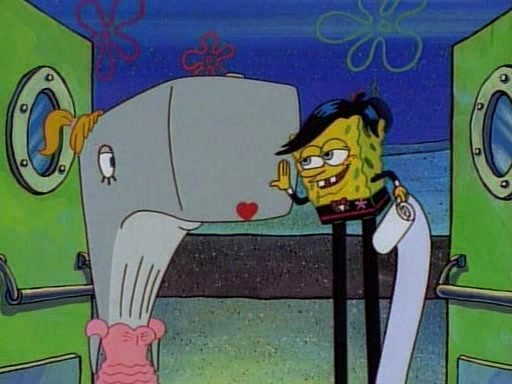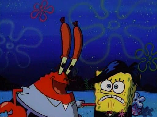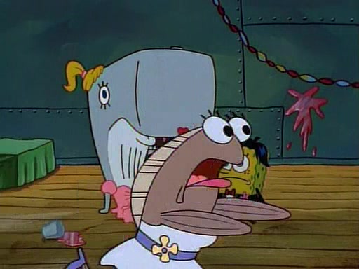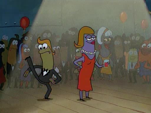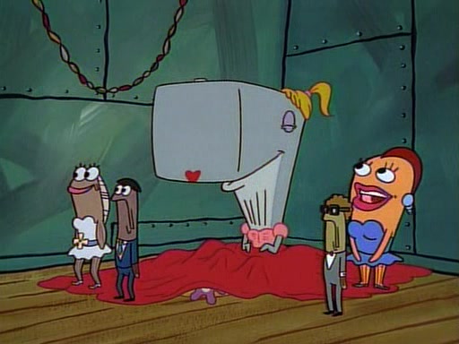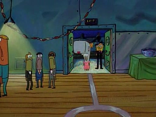 This ultimately succeeds, and Pearl and SpongeBob join the prom dance. They begin doing a dance called "The Sponge," which everyone else soon begins doing. However, this results in many injuries and mass destruction. An angry mob forms and lifts up Pearl and SpongeBob, who think this means that they are popular until the mob throws them out of the building. SpongeBob apologizes, and Pearl says even though it was a disaster, it was really fun. Pearl says goodnight to SpongeBob as she returns home, and tries to get SpongeBob's attention, but as she does so SpongeBob appears to be frozen. Mr. Krabs congratulates SpongeBob on his success at the prom, and the real SpongeBob appears to retrieve his wax dummy of himself (which was seen earlier in the episode), and carries it off, laughing.