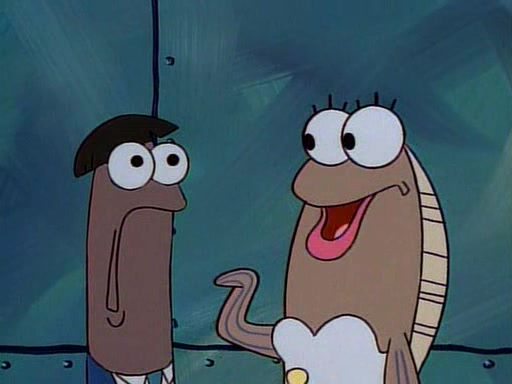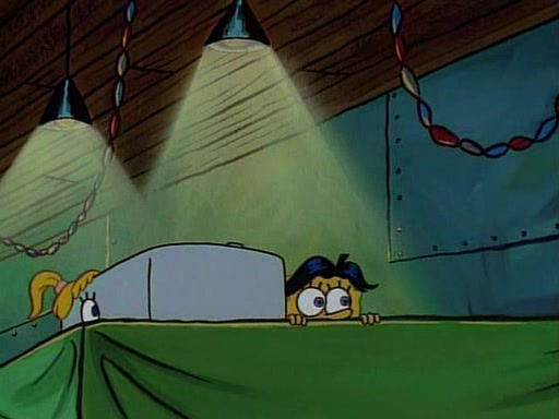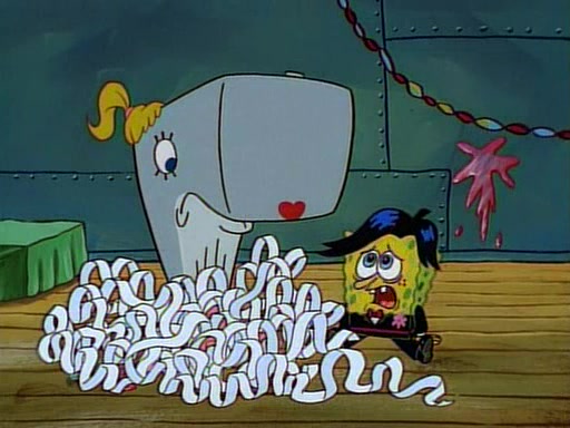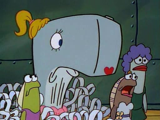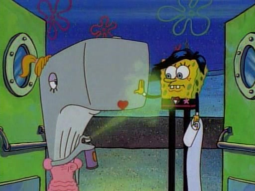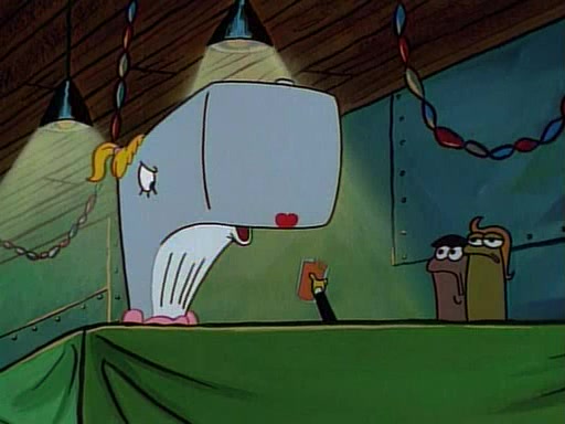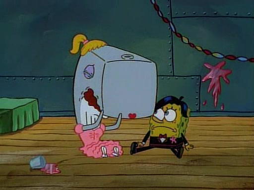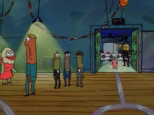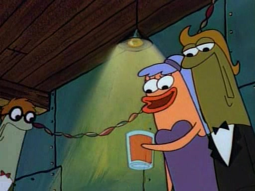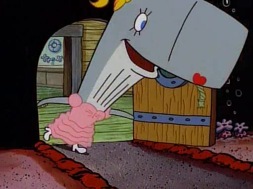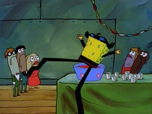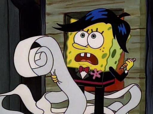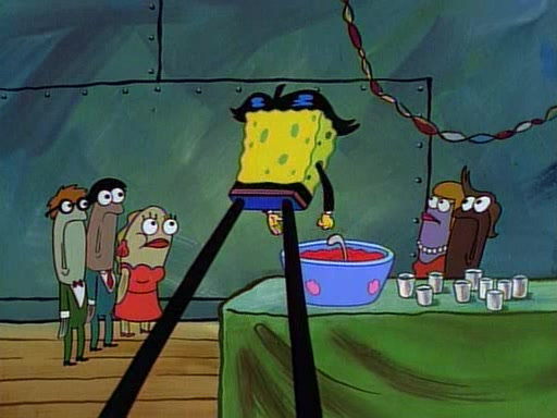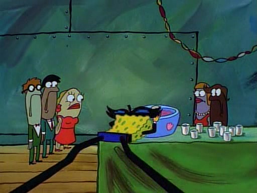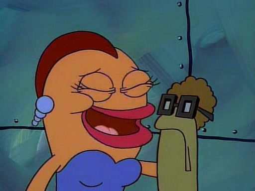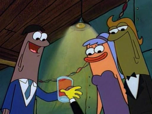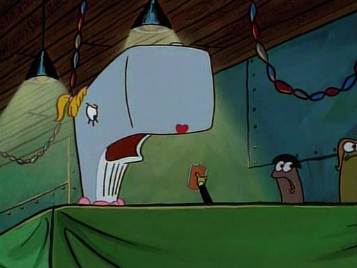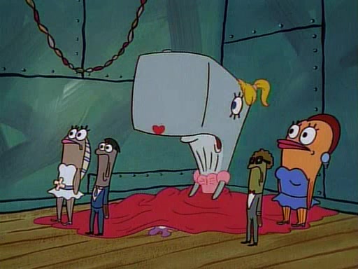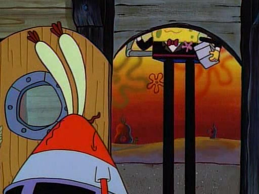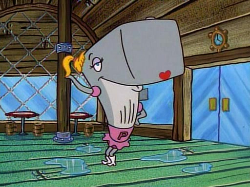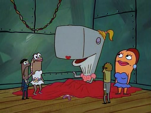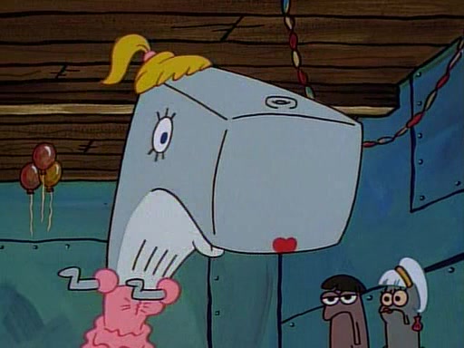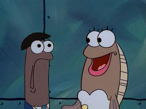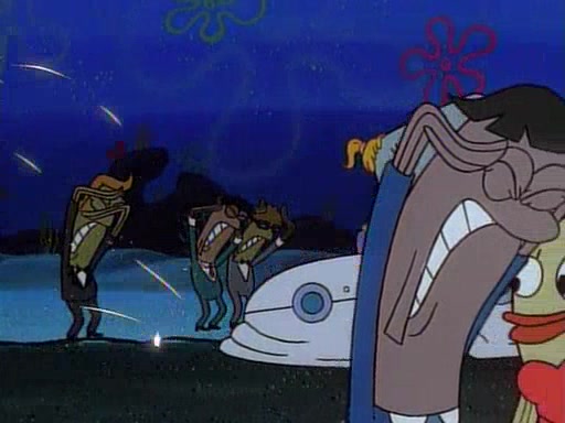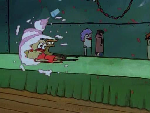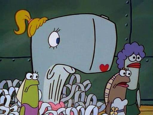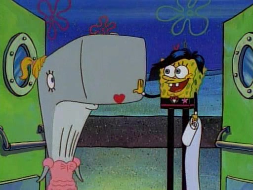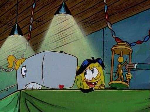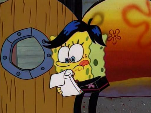 This ultimately succeeds, and Pearl and SpongeBob join the prom dance. They begin doing a dance called "The Sponge," which everyone else soon begins doing. However, this results in many injuries and mass destruction. An angry mob forms and lifts up Pearl and SpongeBob, who think this means that they are popular until the mob throws them out of the building. SpongeBob apologizes, and Pearl says even though it was a disaster, it was really fun. Pearl says goodnight to SpongeBob as she returns home, and tries to get SpongeBob's attention, but as she does so SpongeBob appears to be frozen. Mr. Krabs congratulates SpongeBob on his success at the prom, and the real SpongeBob appears to retrieve his wax dummy of himself (which was seen earlier in the episode), and carries it off, laughing.