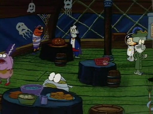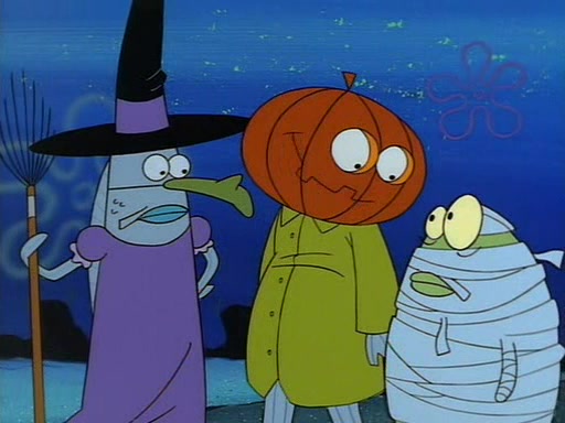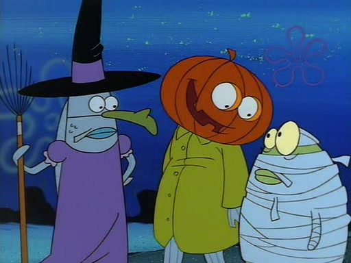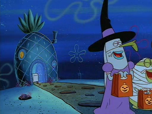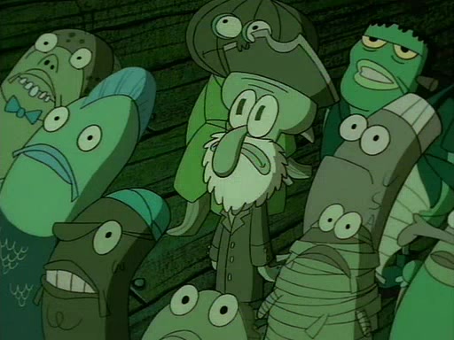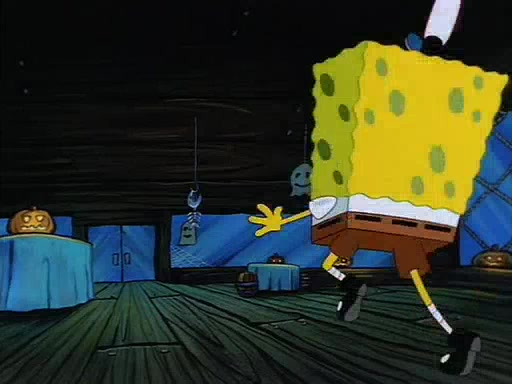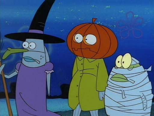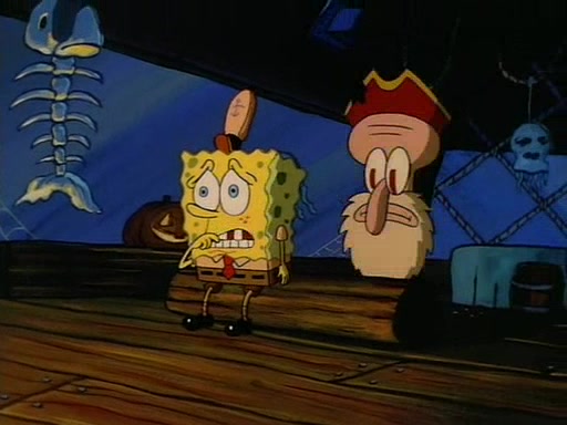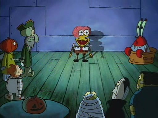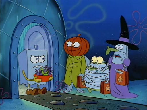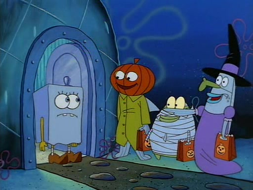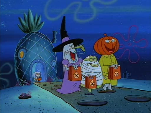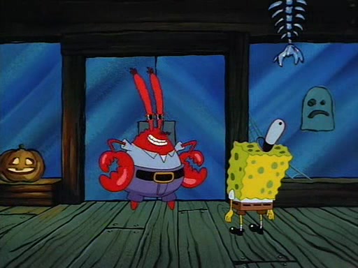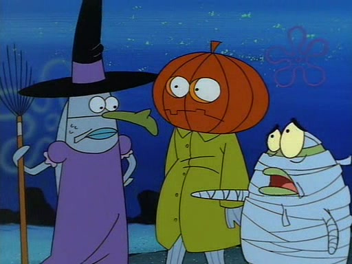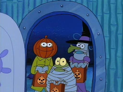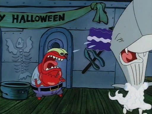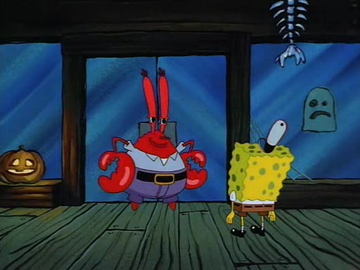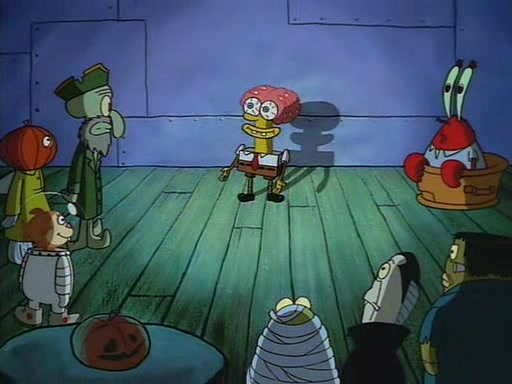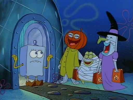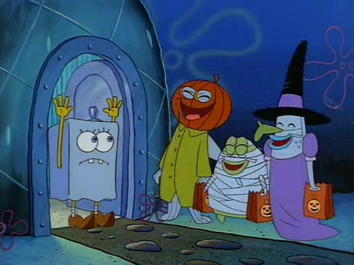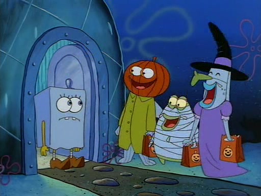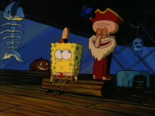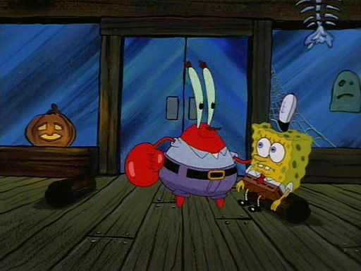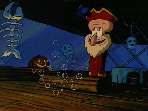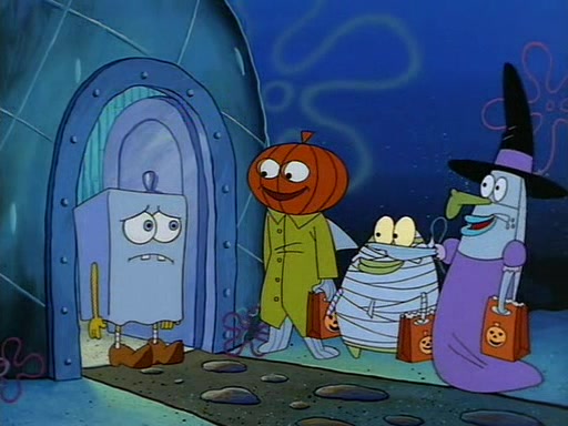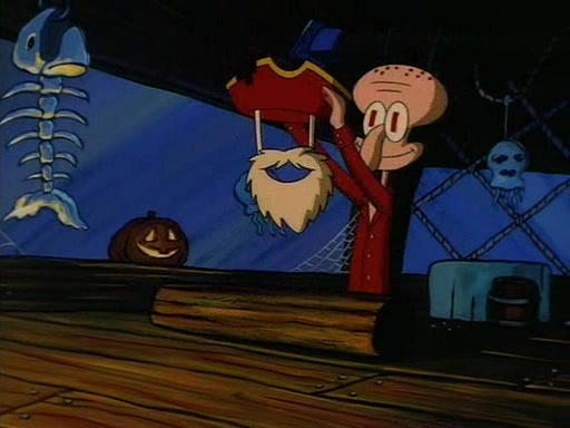 After he finishes, he begins to run away, but Mr. Krabs stops him and asks him if he wants to hear his "annual scary story," and he then does. He tells a story of "The Flying Dutchman," a ghost who steals souls on Halloween. Squidward, dressed up as the Flying Dutchman, appears behind SpongeBob, saying that he'll steal his soul, terrifying him. SpongeBob, who has a reputation for being easily scared, and is nicknamed "SpongeBob ScaredyPants," rushes home, and is scared by everything he sees on the way.
