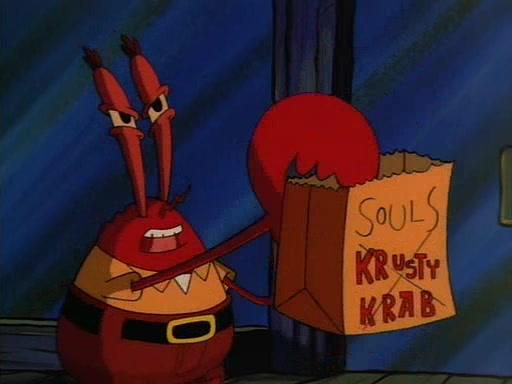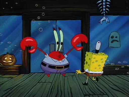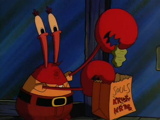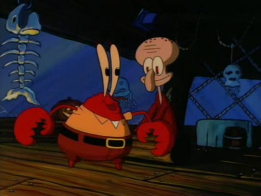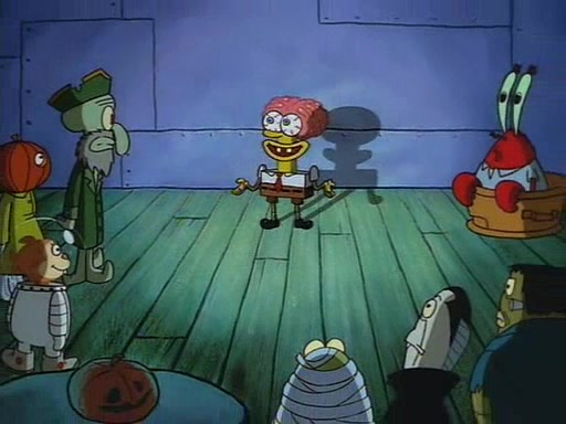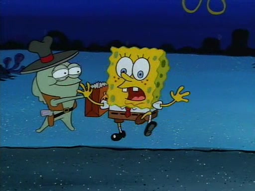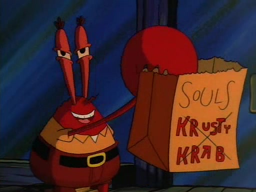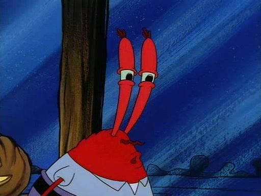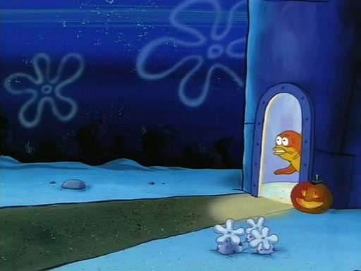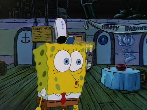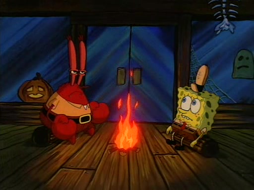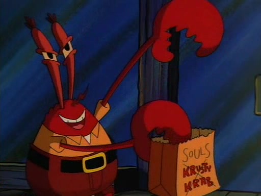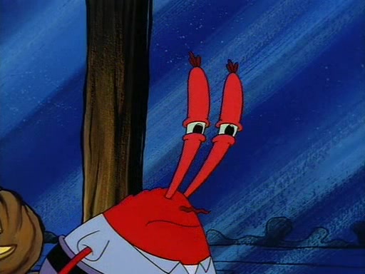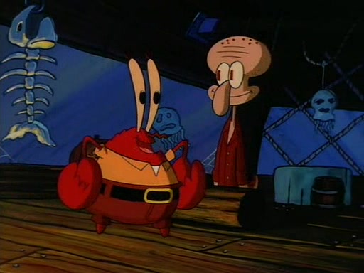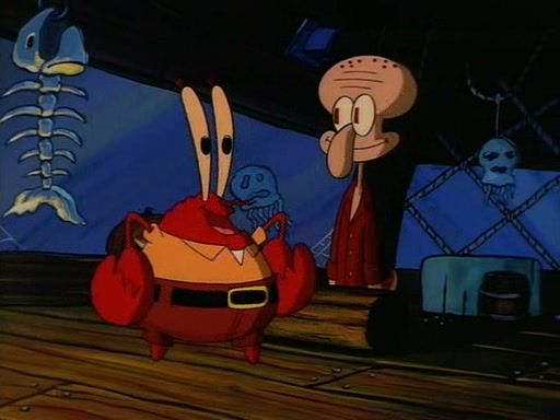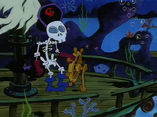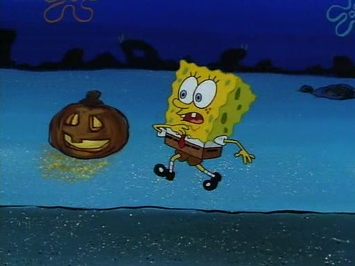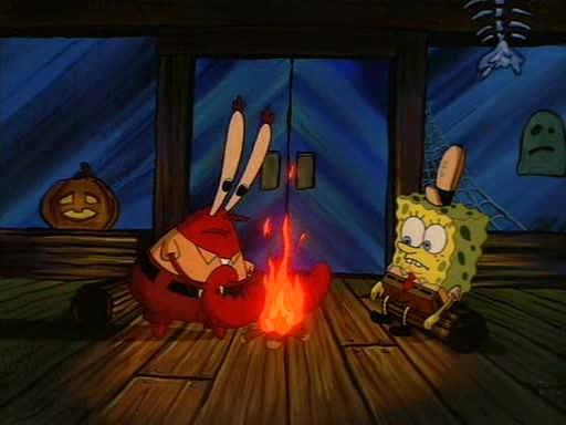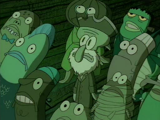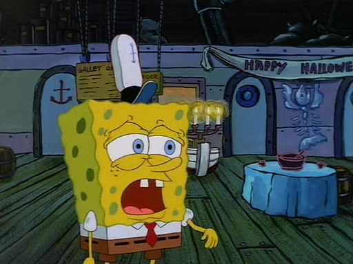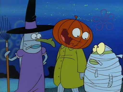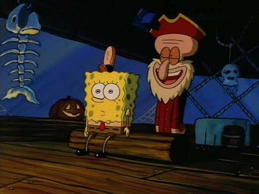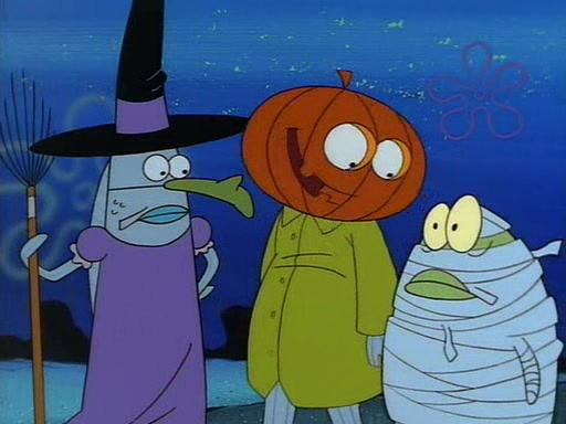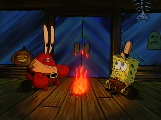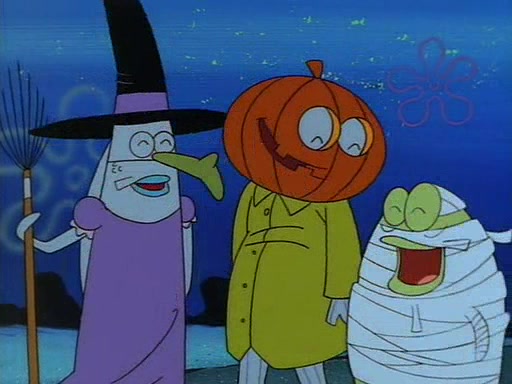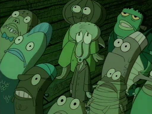 After he finishes, he begins to run away, but Mr. Krabs stops him and asks him if he wants to hear his "annual scary story," and he then does. He tells a story of "The Flying Dutchman," a ghost who steals souls on Halloween. Squidward, dressed up as the Flying Dutchman, appears behind SpongeBob, saying that he'll steal his soul, terrifying him. SpongeBob, who has a reputation for being easily scared, and is nicknamed "SpongeBob ScaredyPants," rushes home, and is scared by everything he sees on the way.