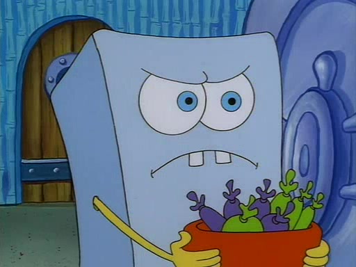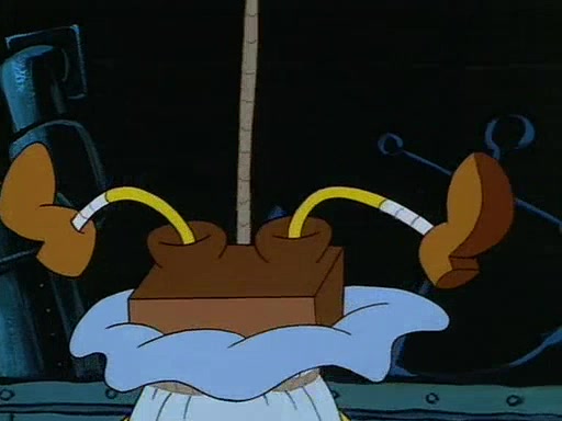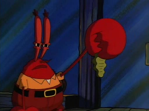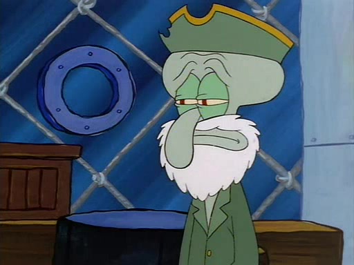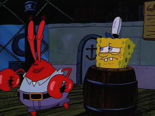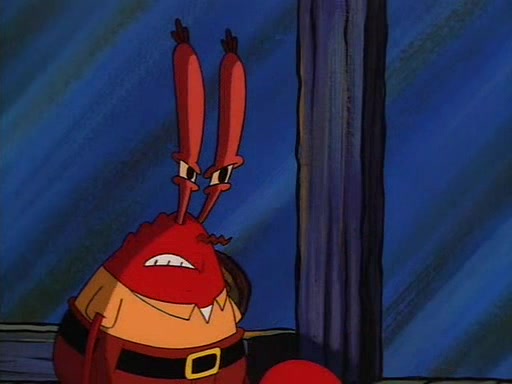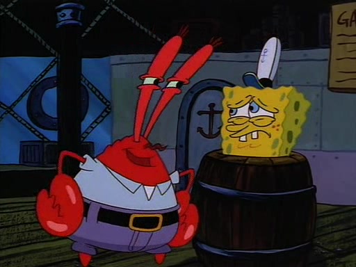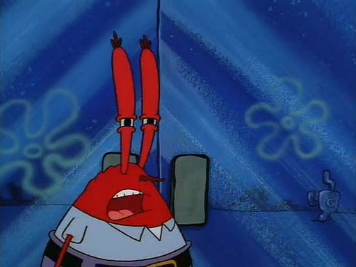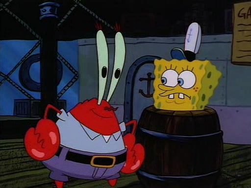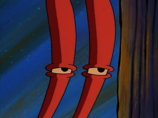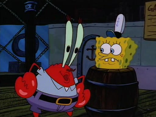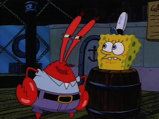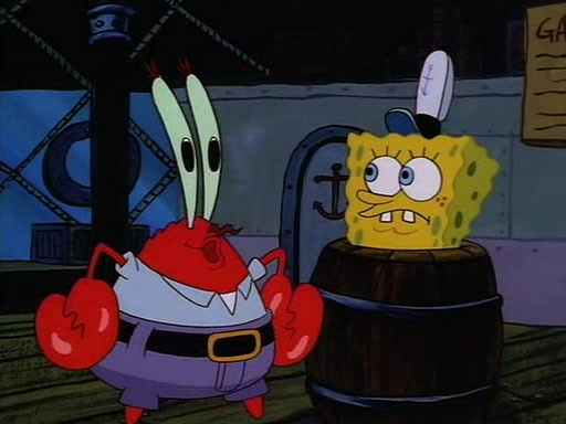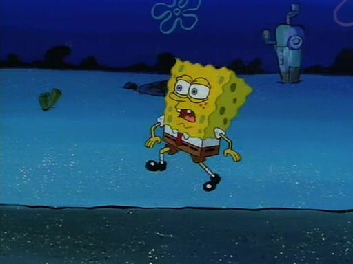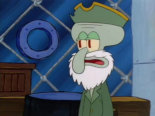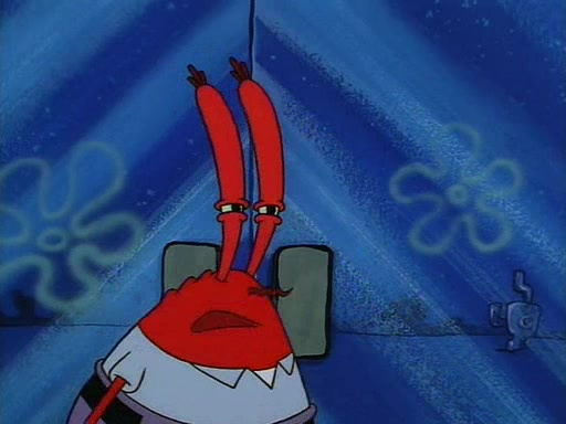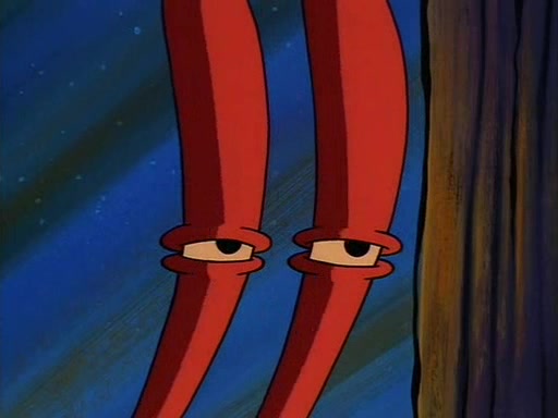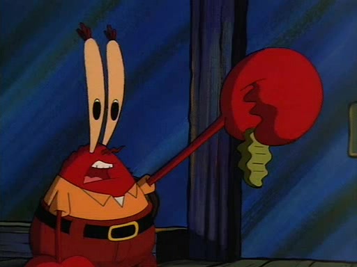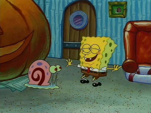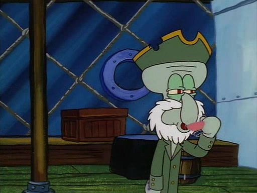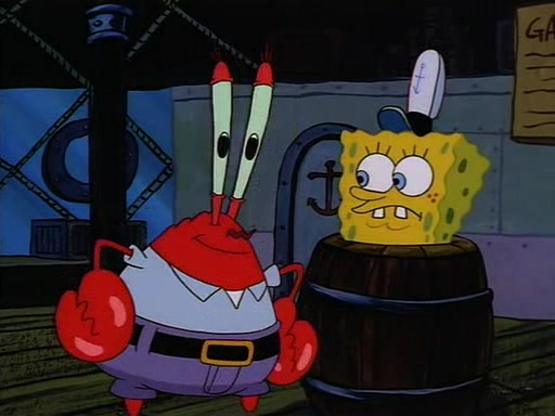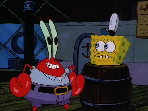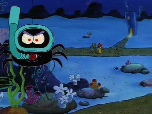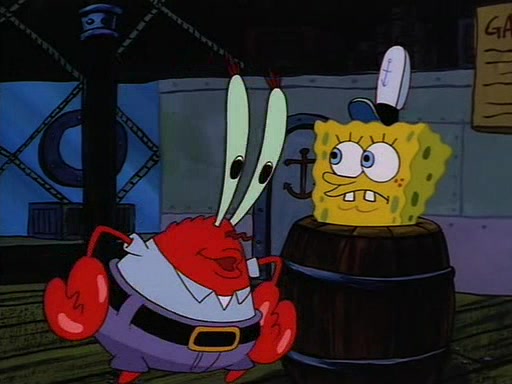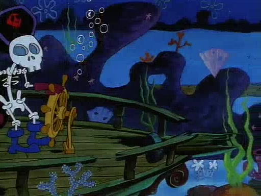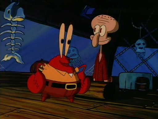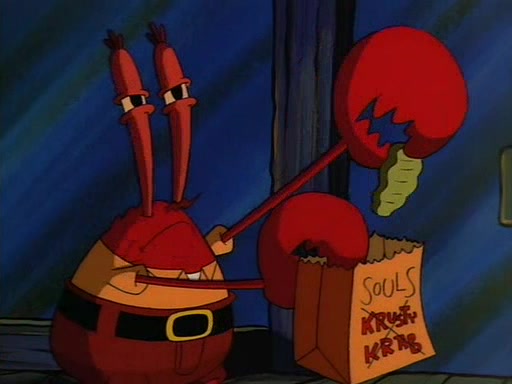 After he finishes, he begins to run away, but Mr. Krabs stops him and asks him if he wants to hear his "annual scary story," and he then does. He tells a story of "The Flying Dutchman," a ghost who steals souls on Halloween. Squidward, dressed up as the Flying Dutchman, appears behind SpongeBob, saying that he'll steal his soul, terrifying him. SpongeBob, who has a reputation for being easily scared, and is nicknamed "SpongeBob ScaredyPants," rushes home, and is scared by everything he sees on the way.