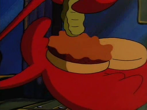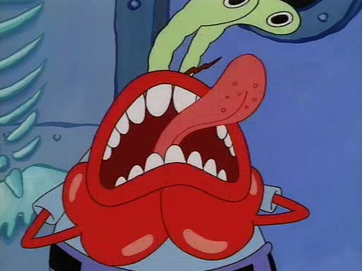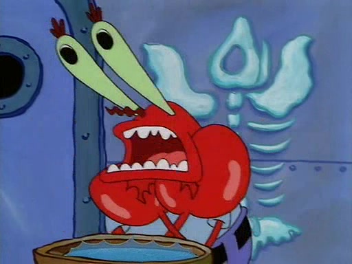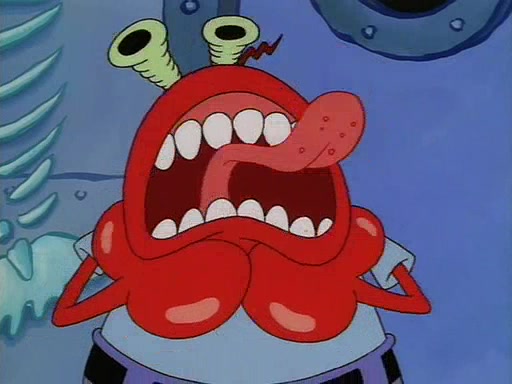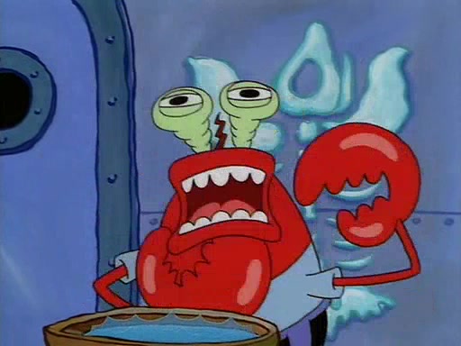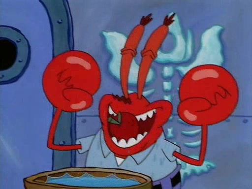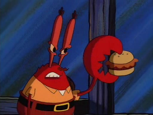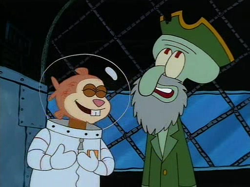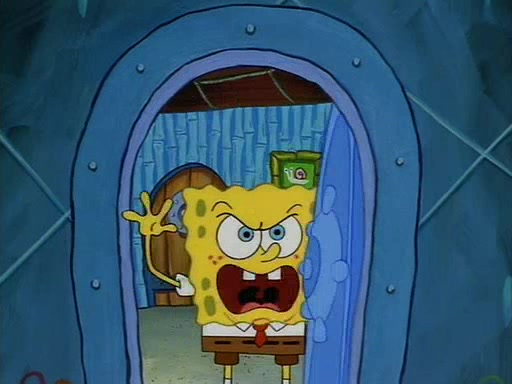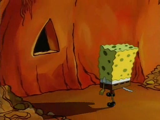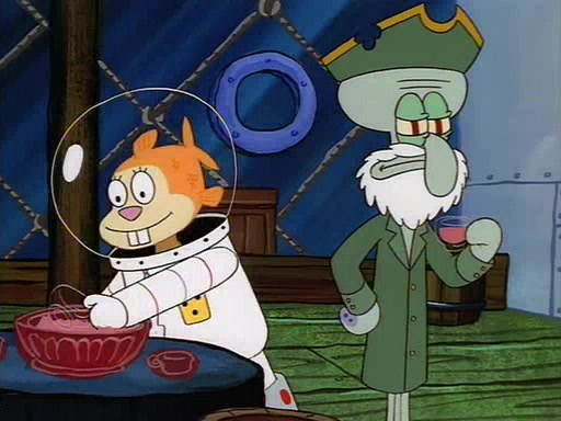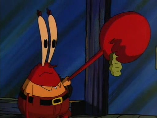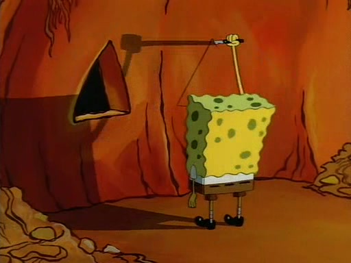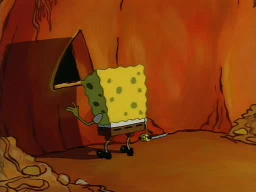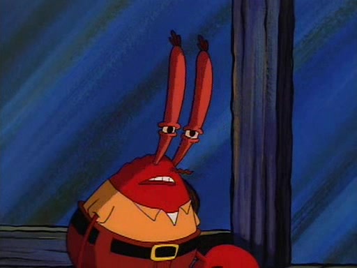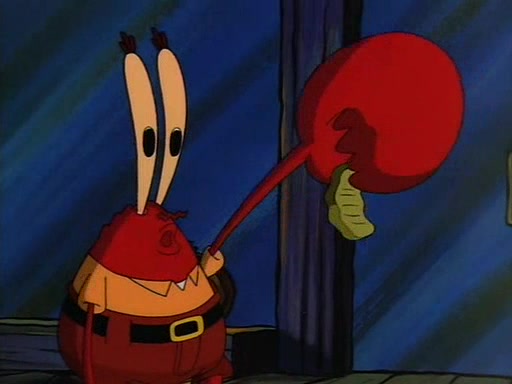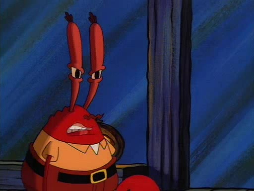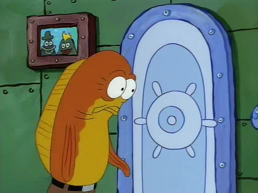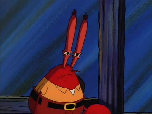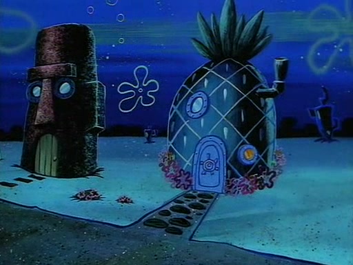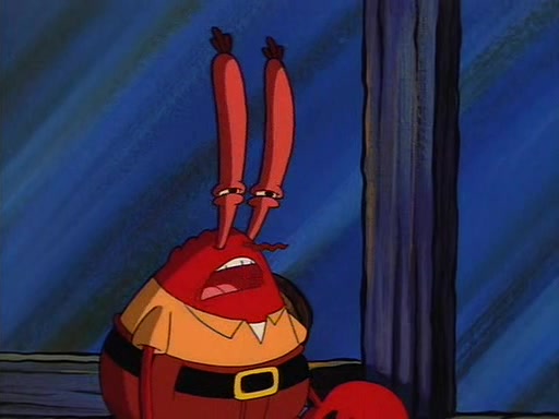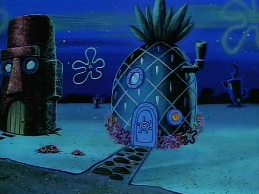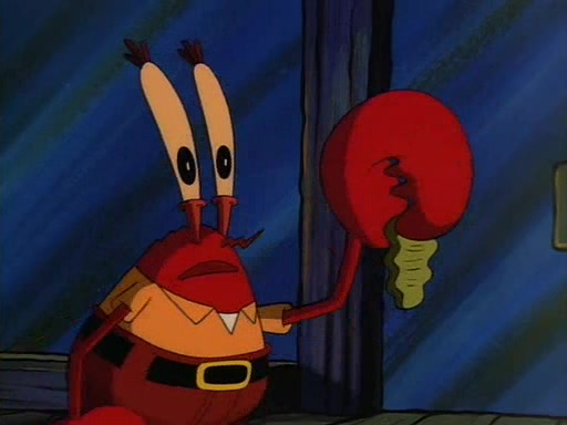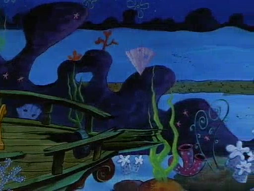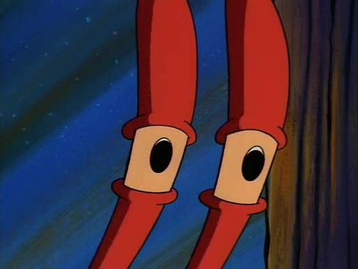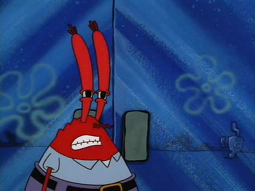 After he finishes, he begins to run away, but Mr. Krabs stops him and asks him if he wants to hear his "annual scary story," and he then does. He tells a story of "The Flying Dutchman," a ghost who steals souls on Halloween. Squidward, dressed up as the Flying Dutchman, appears behind SpongeBob, saying that he'll steal his soul, terrifying him. SpongeBob, who has a reputation for being easily scared, and is nicknamed "SpongeBob ScaredyPants," rushes home, and is scared by everything he sees on the way.