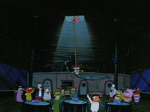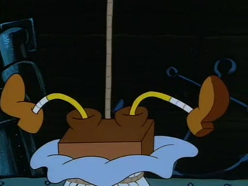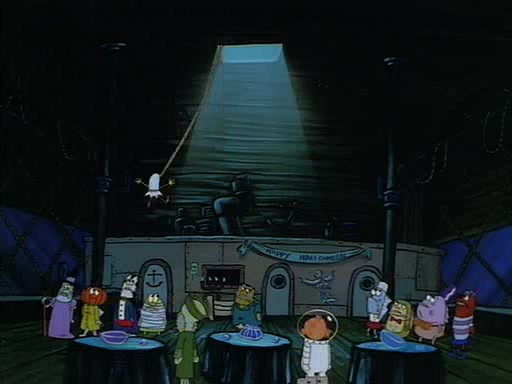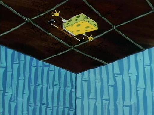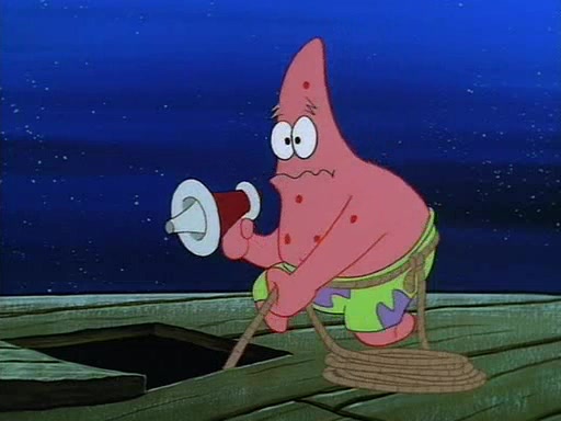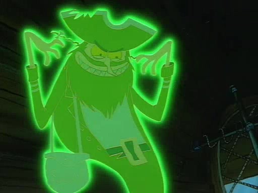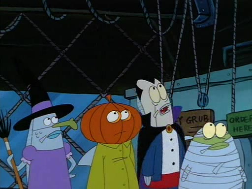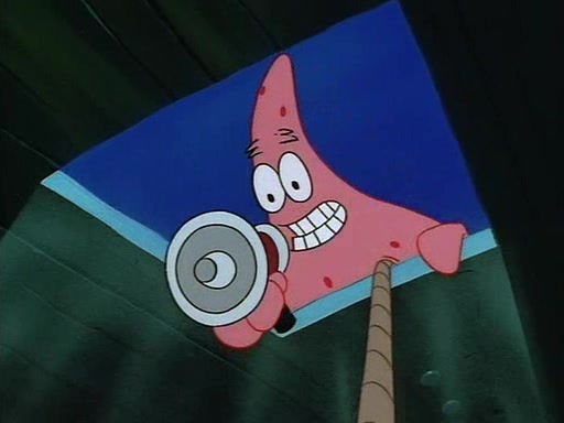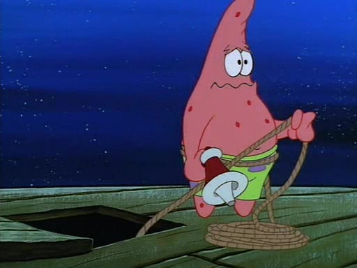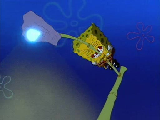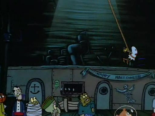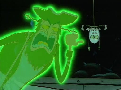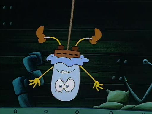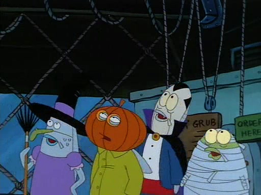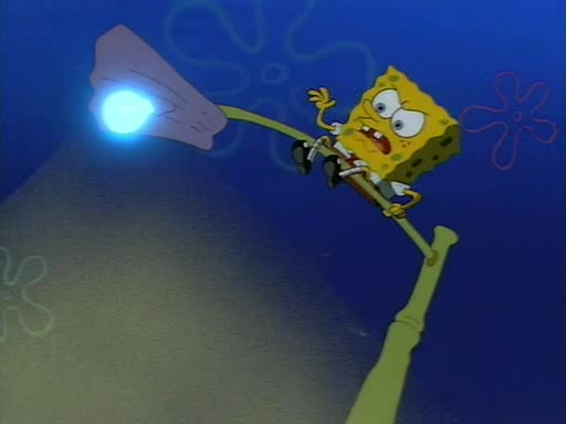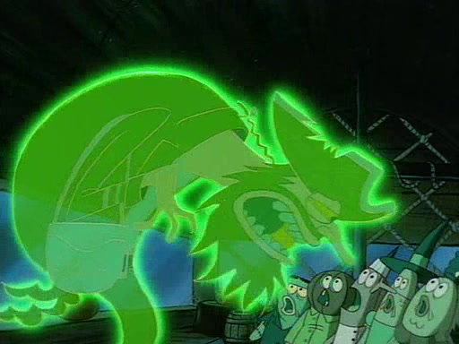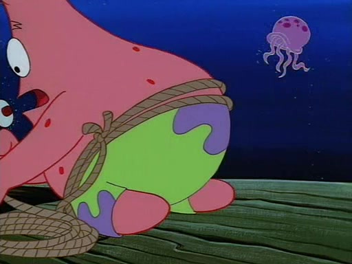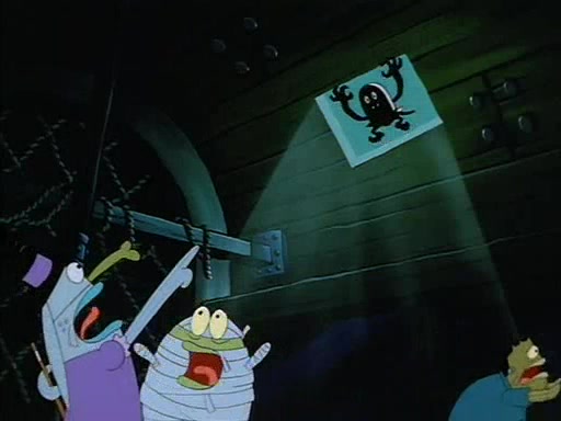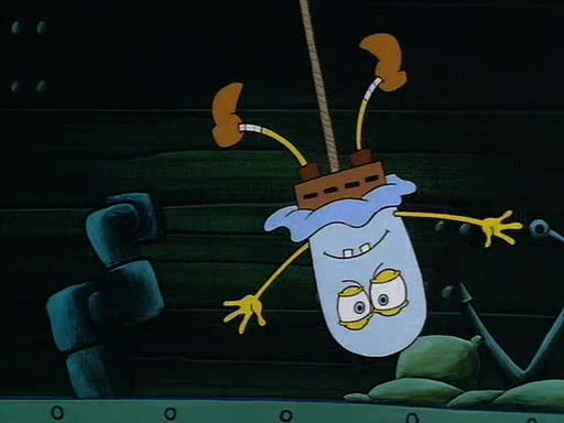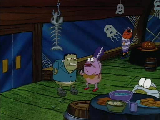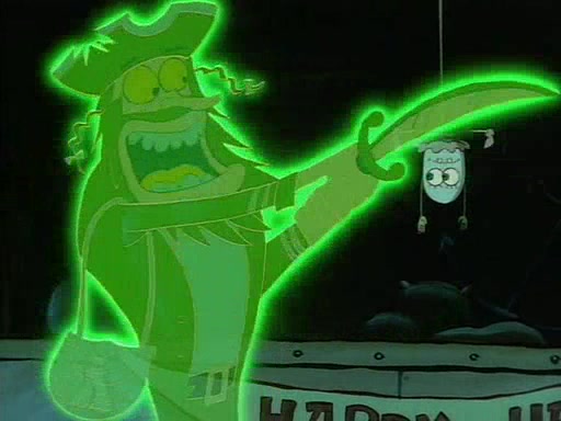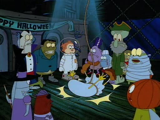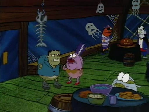 They then go to the roof of the Krusty Krab where a Halloween party is taking place, turn off all the lights, and lower SpongeBob with a rope, with Patrick providing the voice of the "Dutchman," which initially terrifies everyone. However, when a jellyfish stings Patrick, whom the rope is tied to, he starts running around in pain, causing SpongeBob to fly around uncontrollably, exposing his true identity.