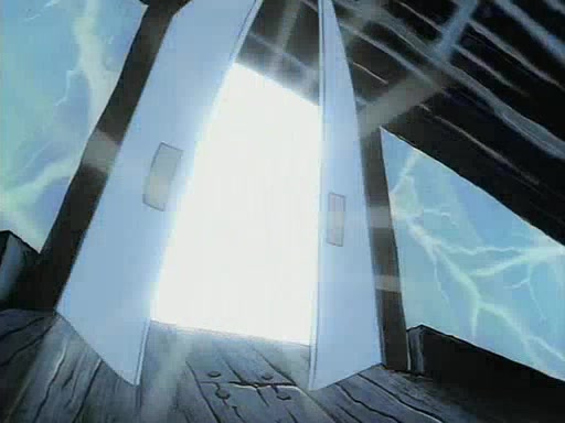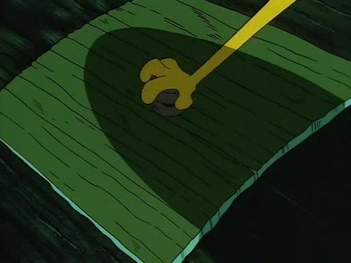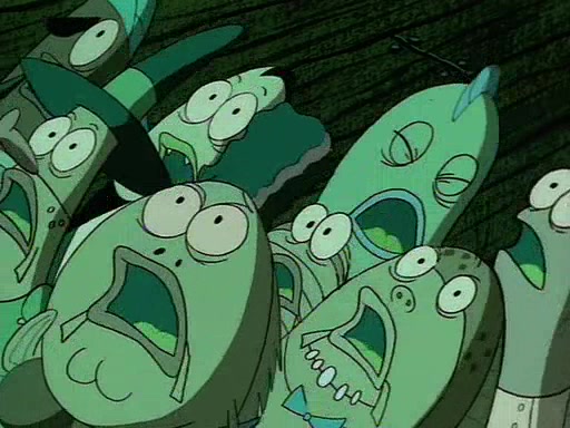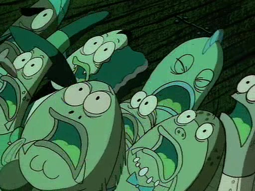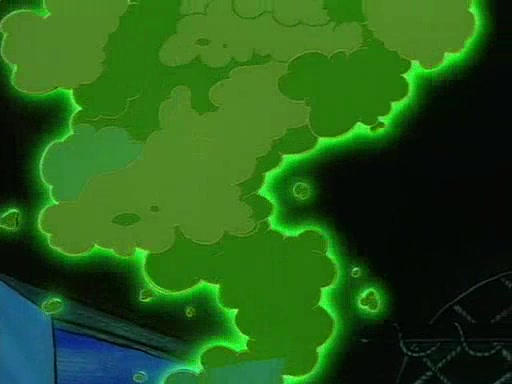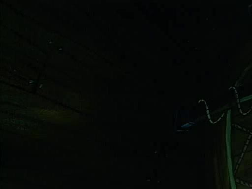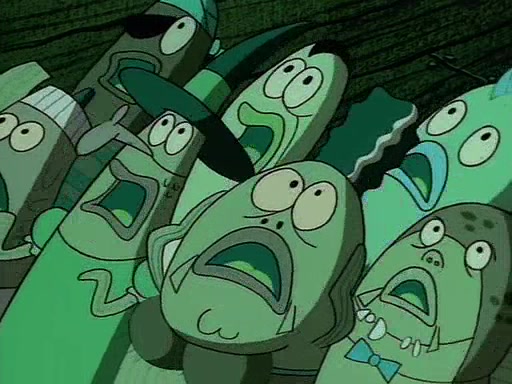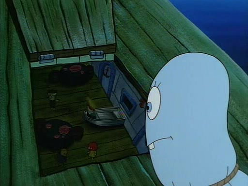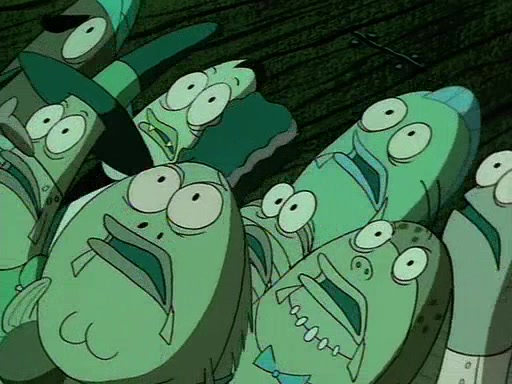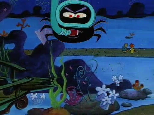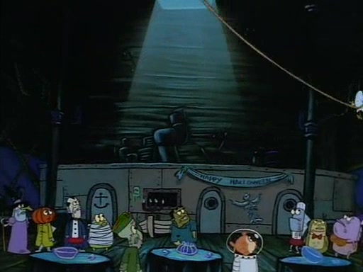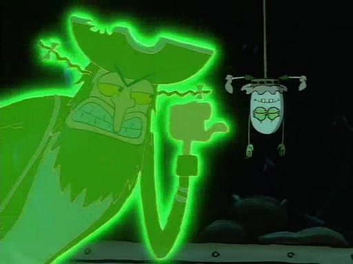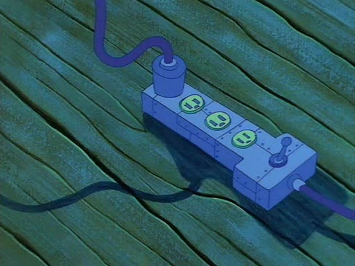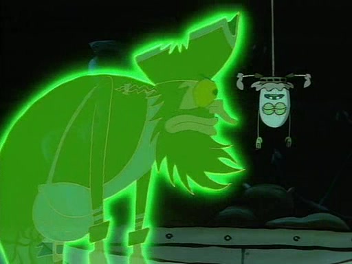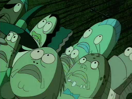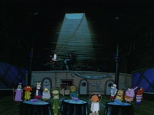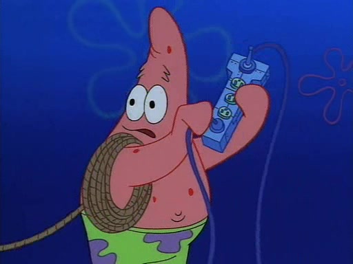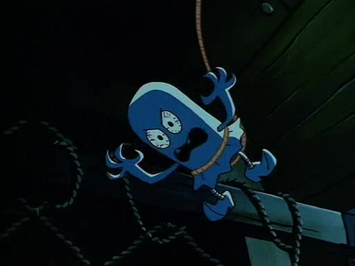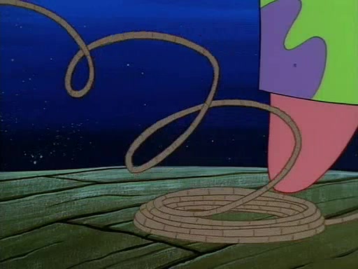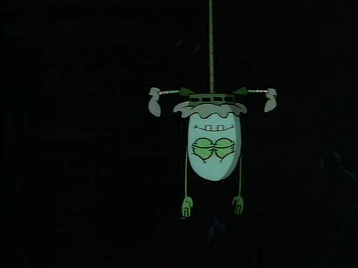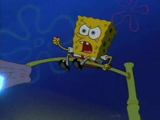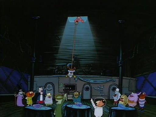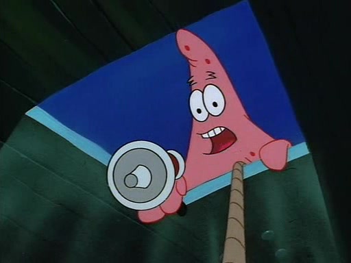 They then go to the roof of the Krusty Krab where a Halloween party is taking place, turn off all the lights, and lower SpongeBob with a rope, with Patrick providing the voice of the "Dutchman," which initially terrifies everyone. However, when a jellyfish stings Patrick, whom the rope is tied to, he starts running around in pain, causing SpongeBob to fly around uncontrollably, exposing his true identity.