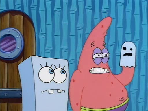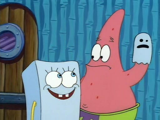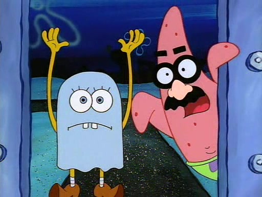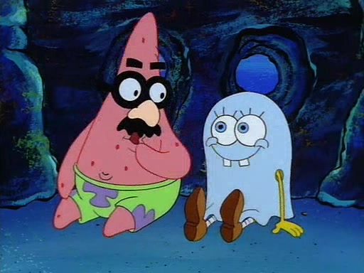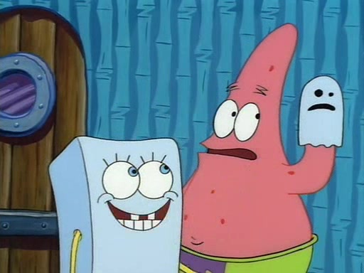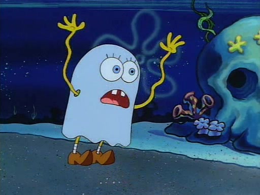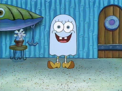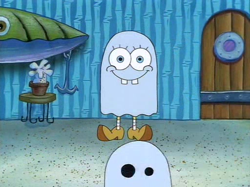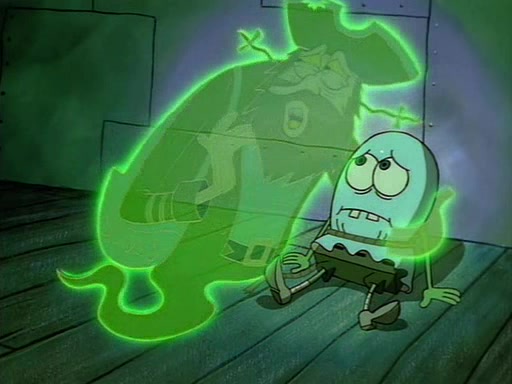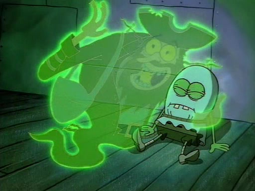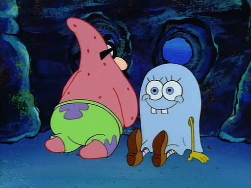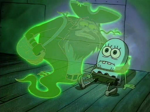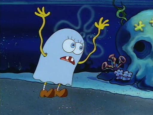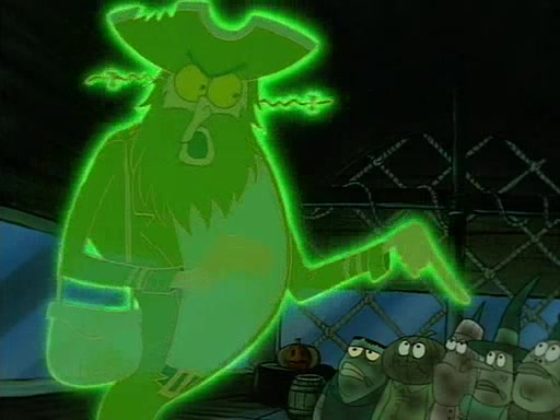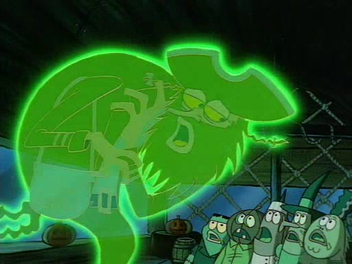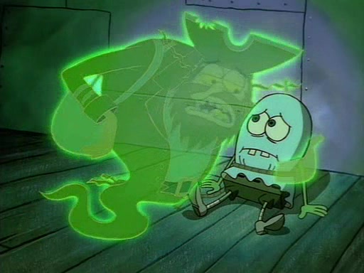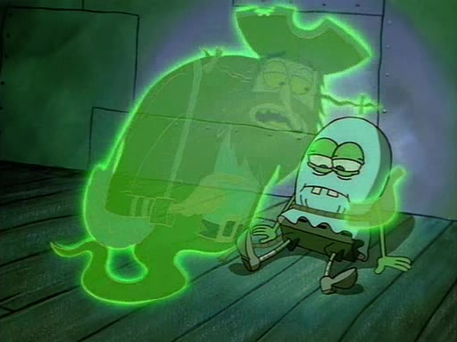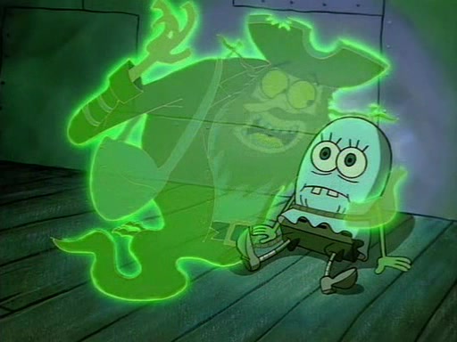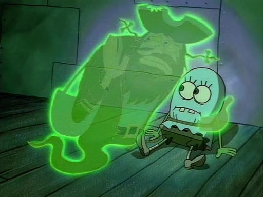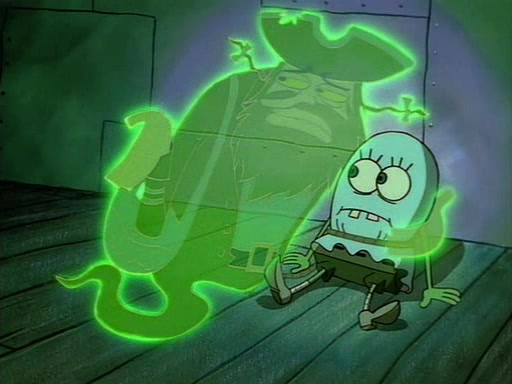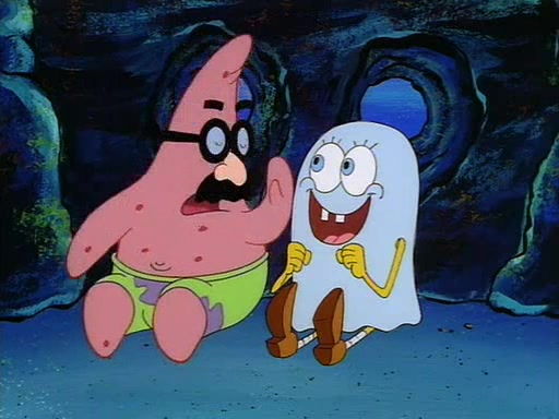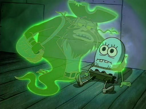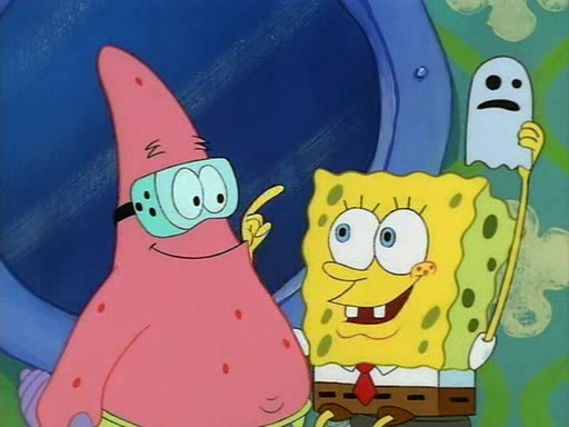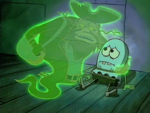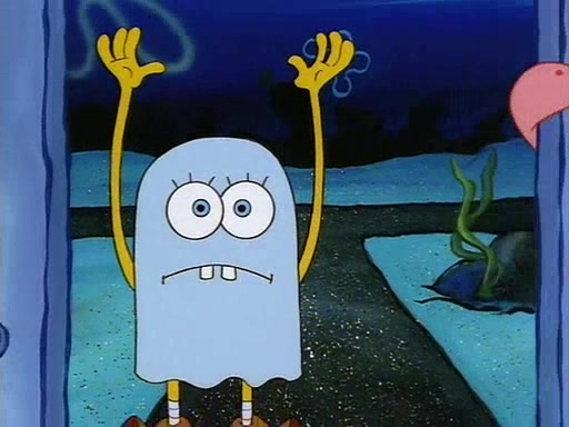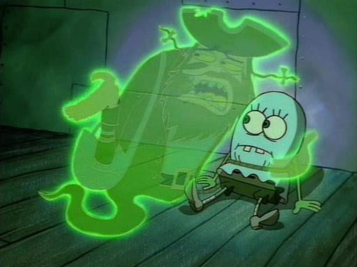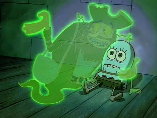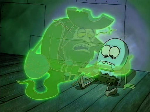 After being scared by Patrick, he asks him for help. They make a "Flying Dutchman" costume, but it fails to scare anyone. SpongeBob realizes that a real ghost has a round head, and that he has a square one. Patrick shaves SpongeBob's head, making it round. Believing themselves to be scary, SpongeBob and Patrick go around town attempting to scare people, and believe themselves to be successful in doing so, although their "victims" are simply confused by their antics.