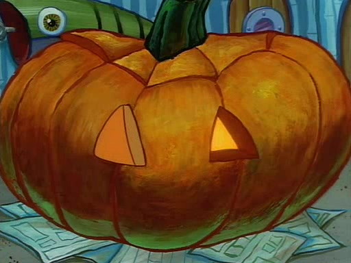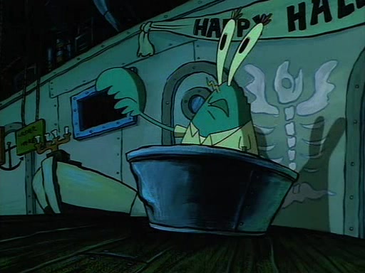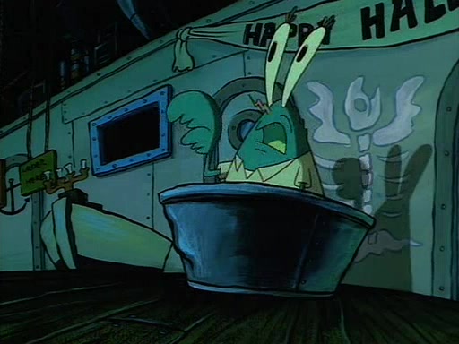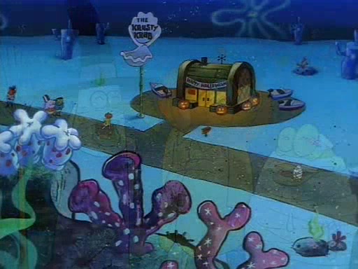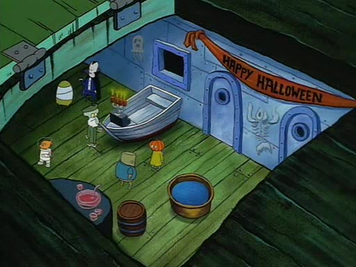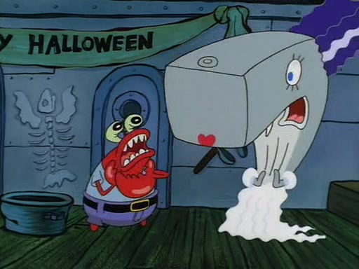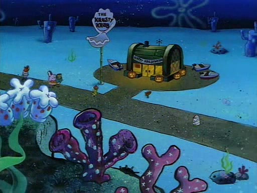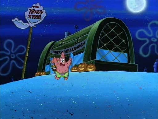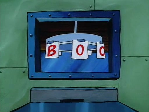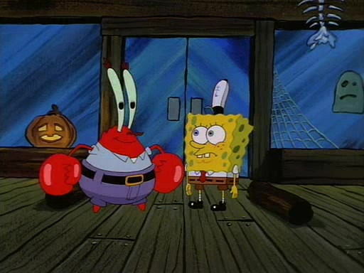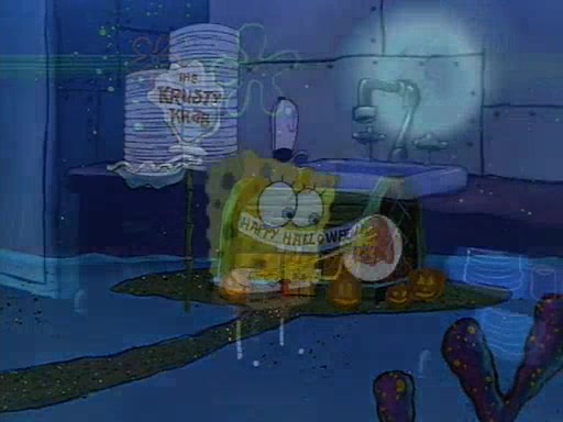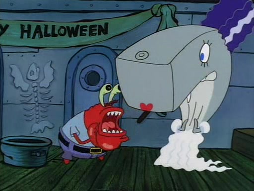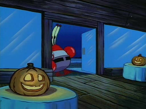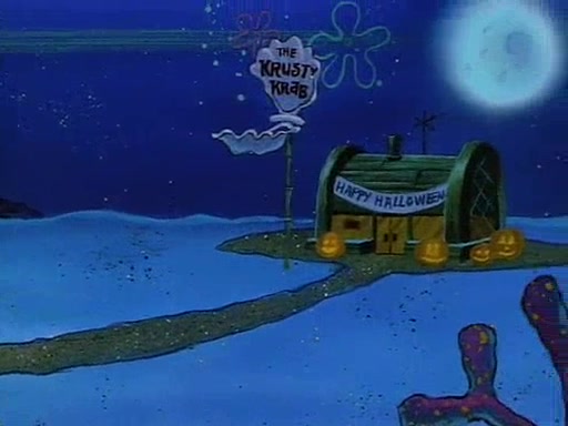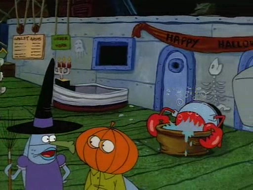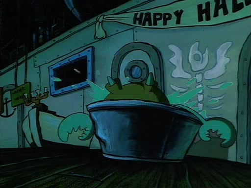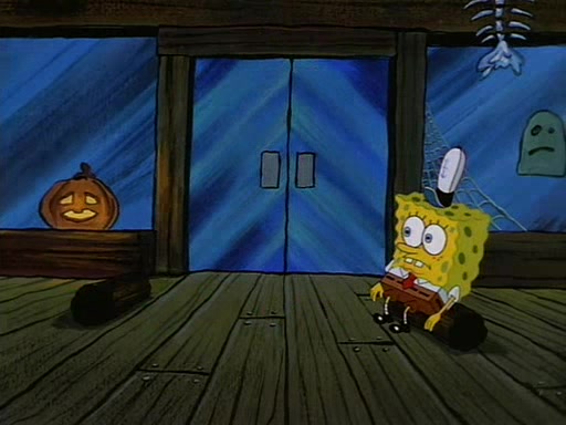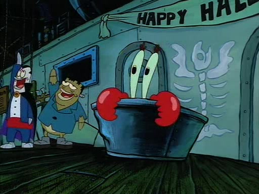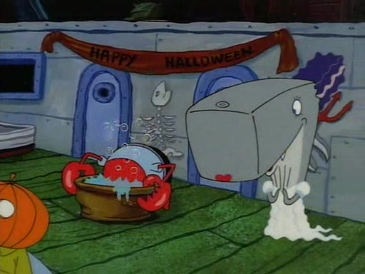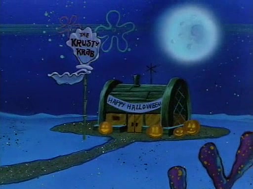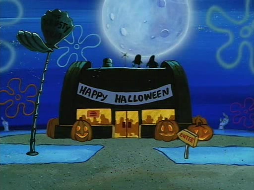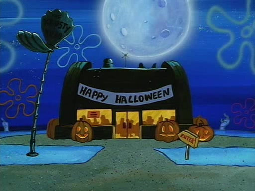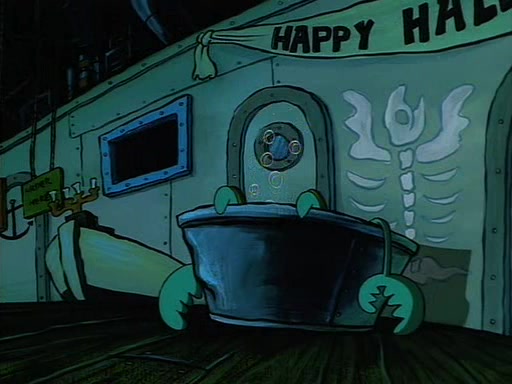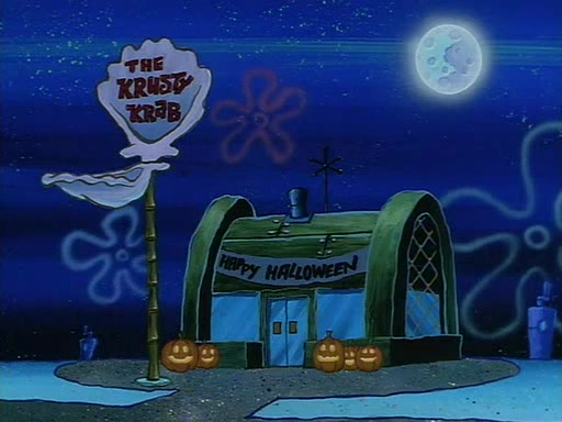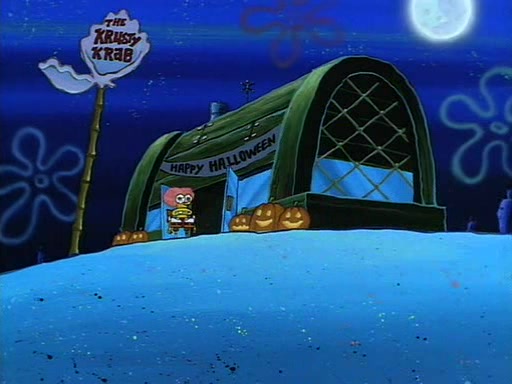 It's Halloween in Bikini Bottom, and SpongeBob is cleaning the dishes in the Krusty Krab at the end of the work day. He is frightened by the creepy door closing and a word (or possibly a message) reading "BOO" on the order slips.
