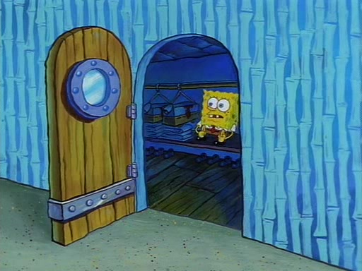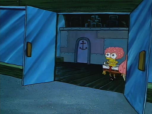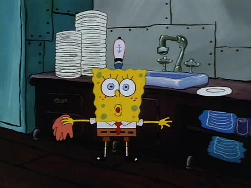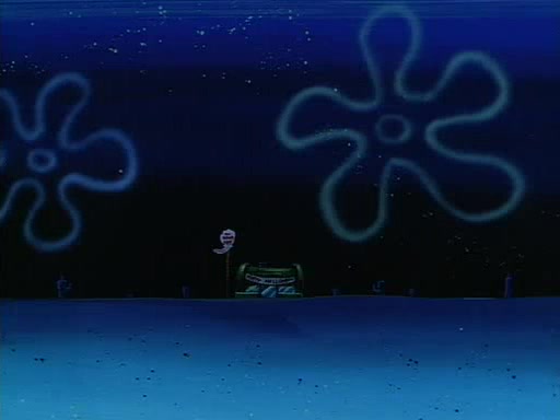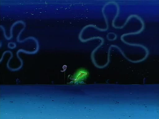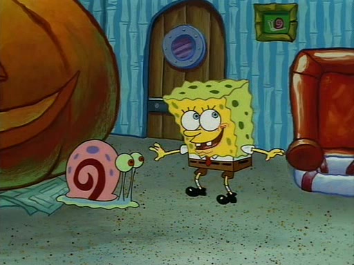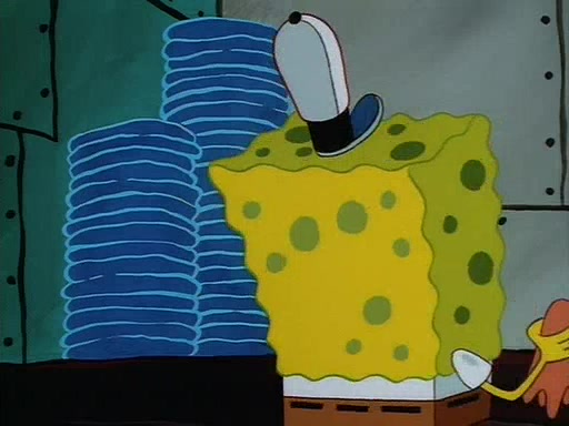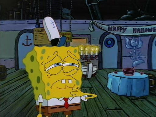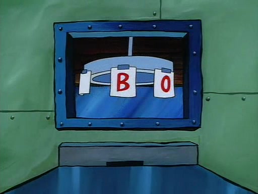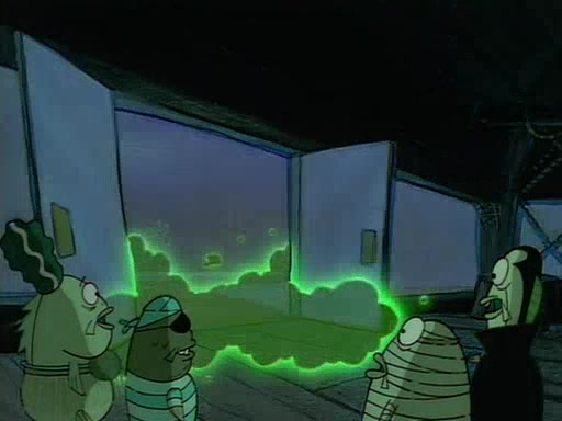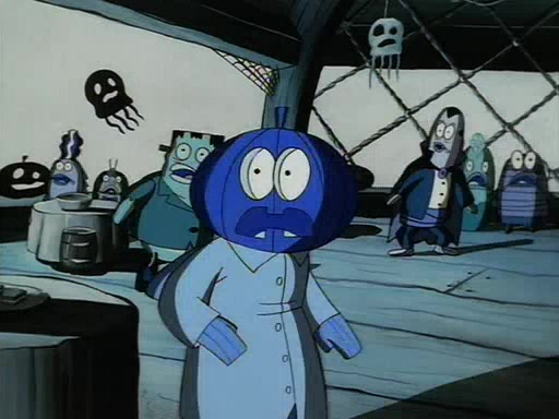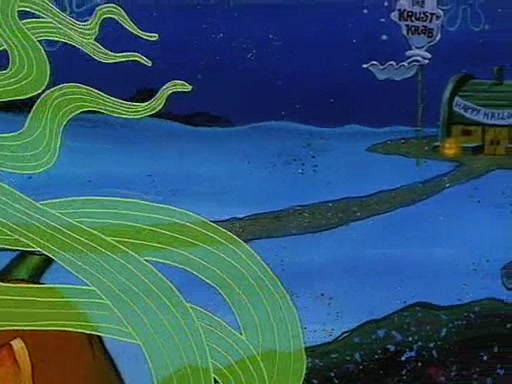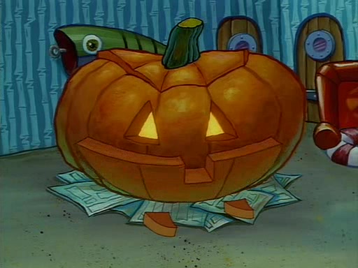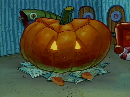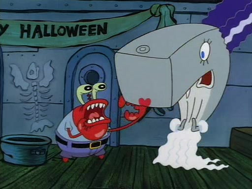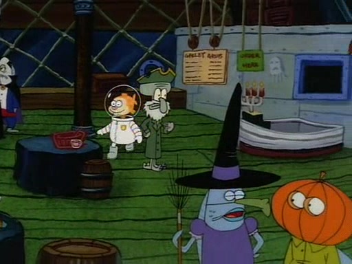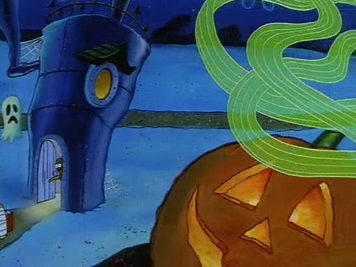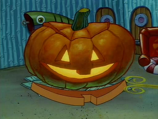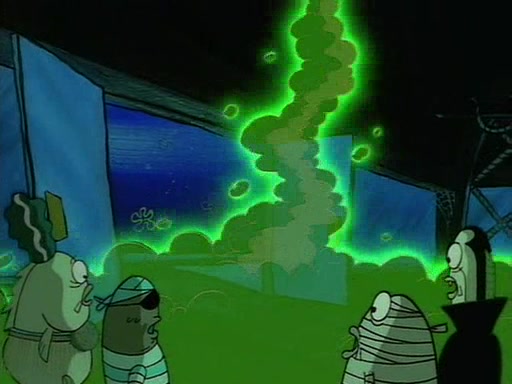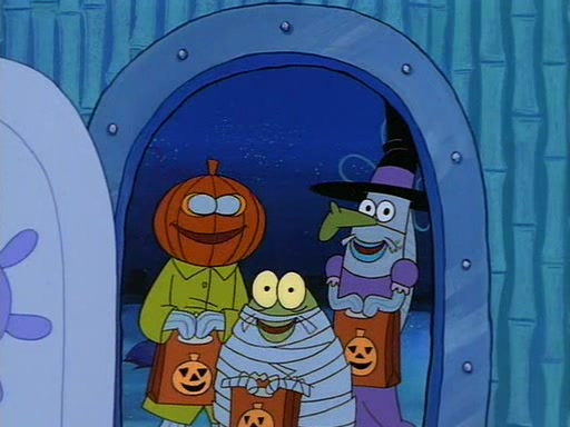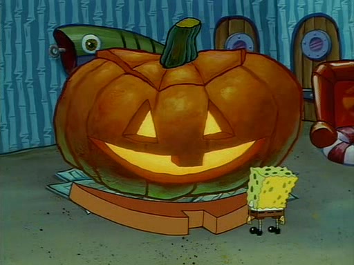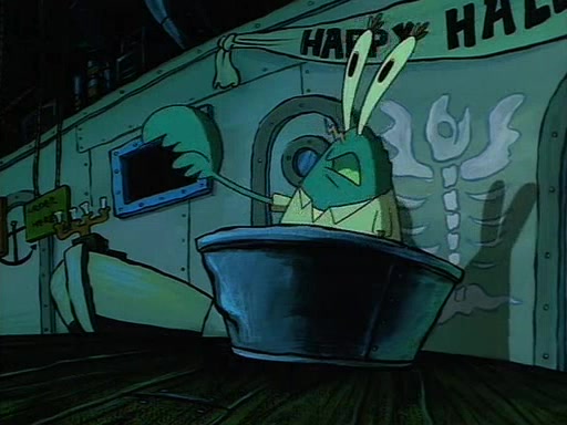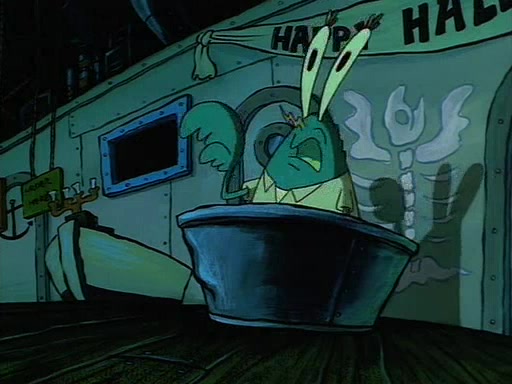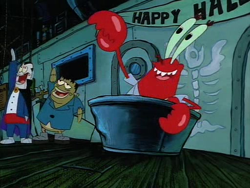 It's Halloween in Bikini Bottom, and SpongeBob is cleaning the dishes in the Krusty Krab at the end of the work day. He is frightened by the creepy door closing and a word (or possibly a message) reading "BOO" on the order slips.