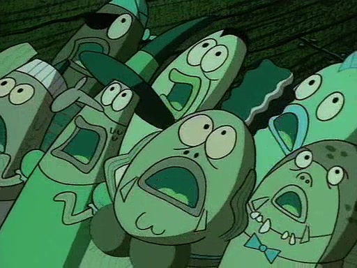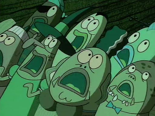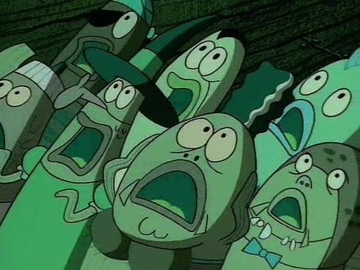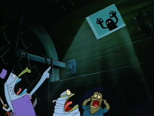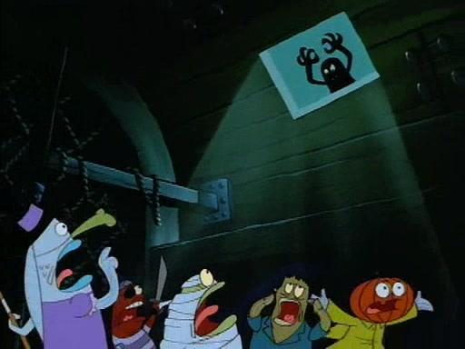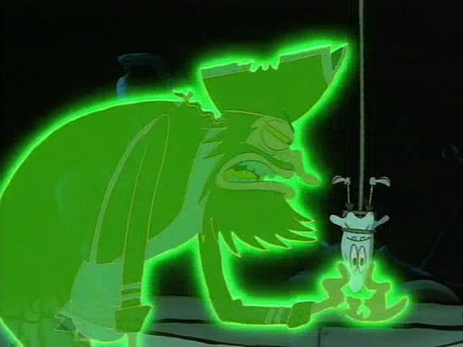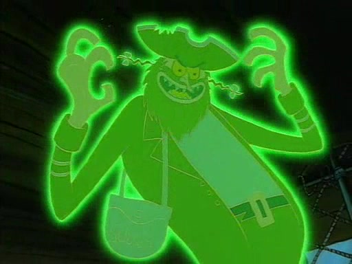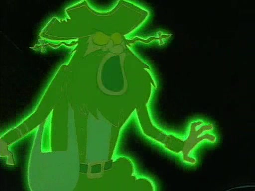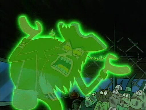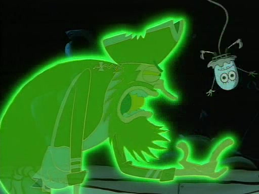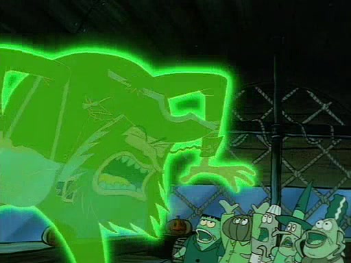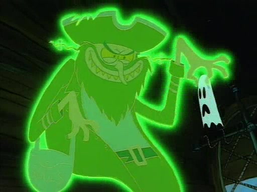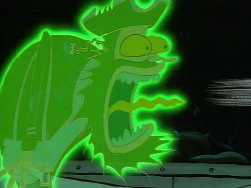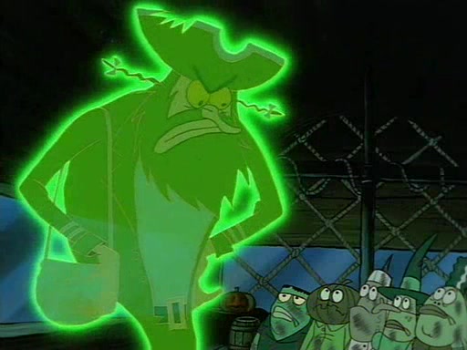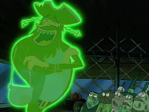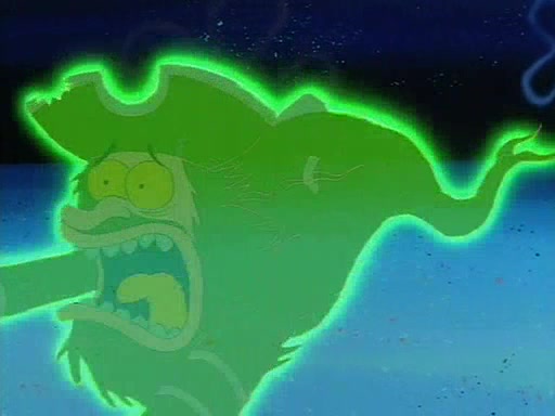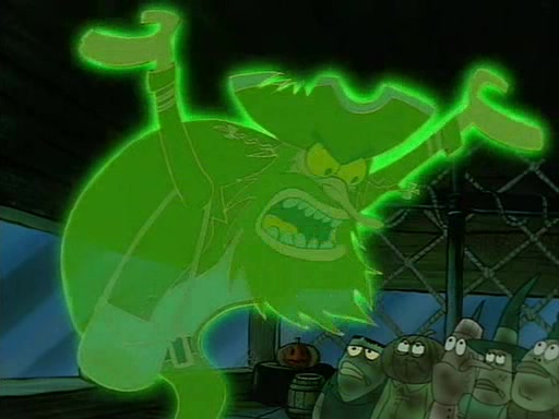 Everybody starts laughing at SpongeBob, but soon the real Flying Dutchman appears. He explains to them how offended he is by people dressing up as him for Halloween, and that SpongeBob's costume is the worst of all. He says that SpongeBob is the "straw that broke the camel's back," and that he will now steal the souls of everyone present. He takes off SpongeBob's costume, which revealed that his brain is exposed as a result of Patrick's shaving. Subsequently, everyone runs away, including the Dutchman, leaving SpongeBob satisfied to finally have succeeded in scaring people. Patrick comments on SpongeBob's "pink hat," and SpongeBob explains that it's not a hat, it's his brain, and Patrick screams and runs away. SpongeBob says "Don't worry, it grows back!" and the episode ends.