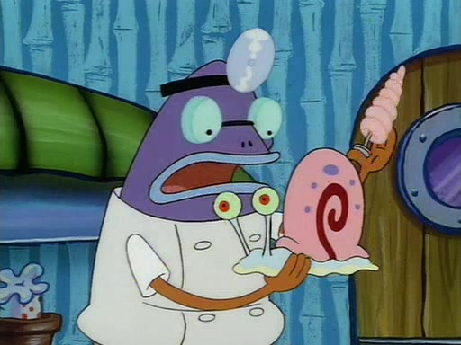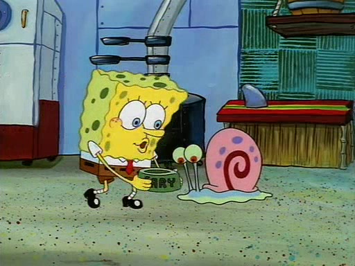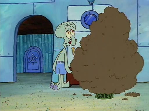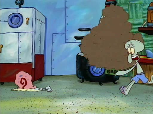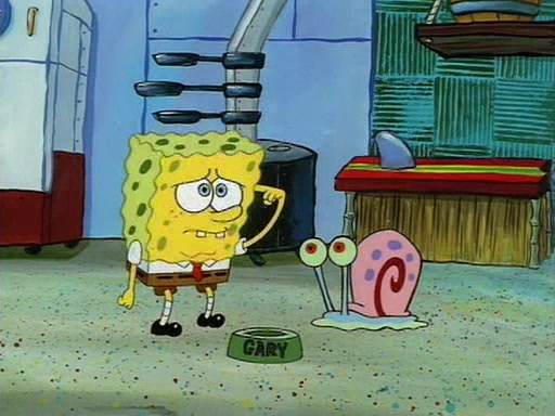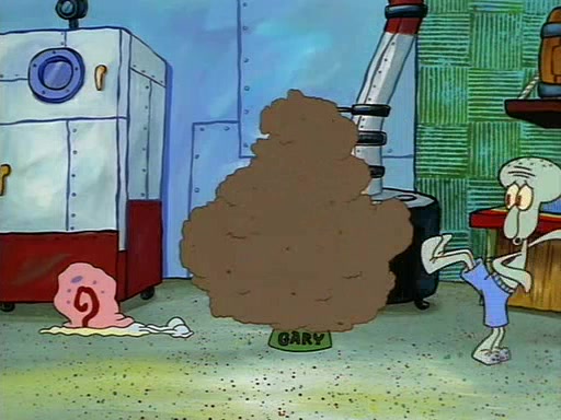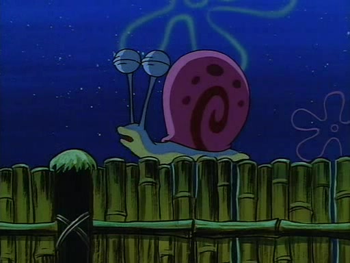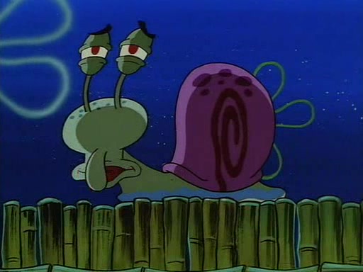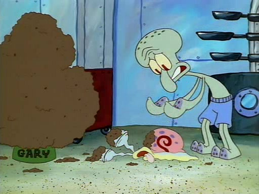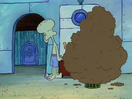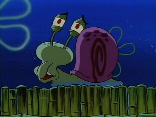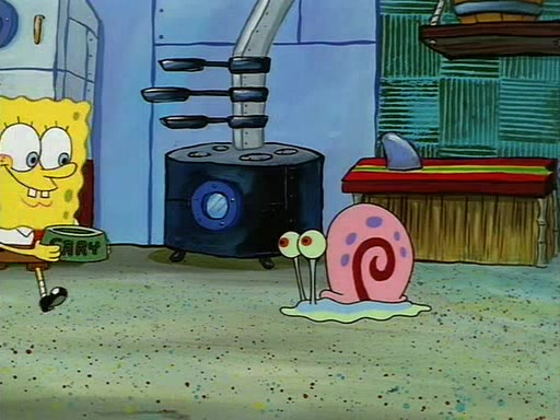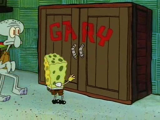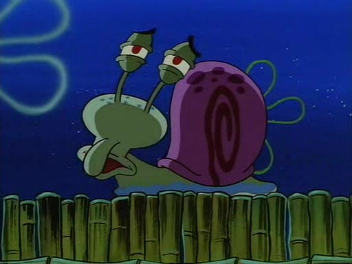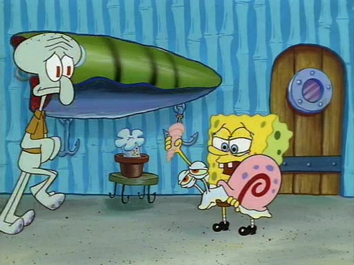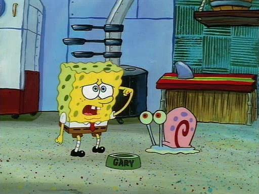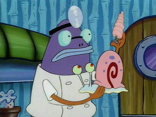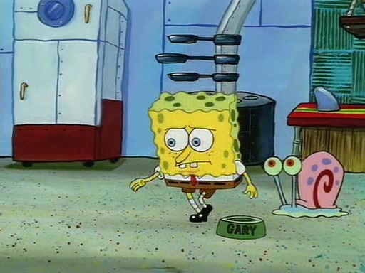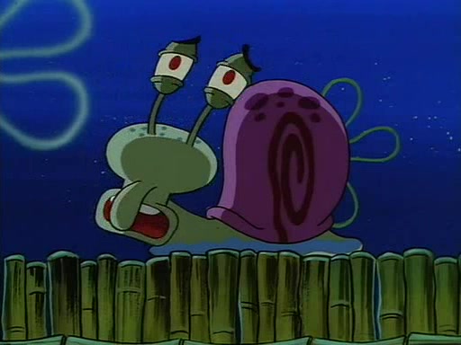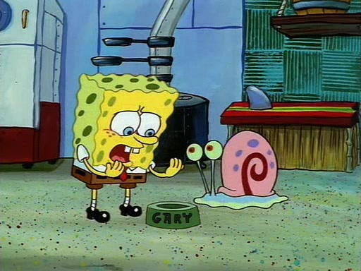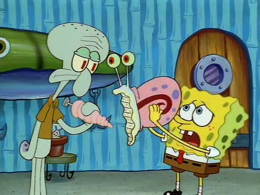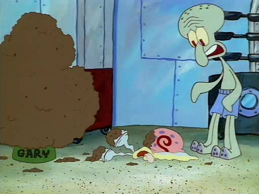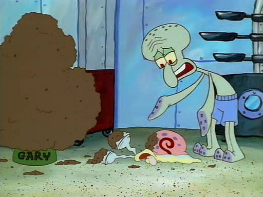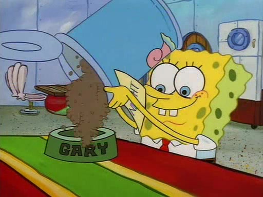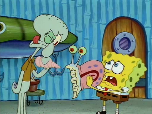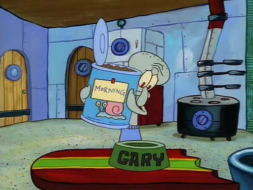 SpongeBob and Patrick are all set to leave for the jellyfishing convention in Ukelele Bottom that weekend. Realizing that he will not be able to take Gary, SpongeBob leaves Gary in Squidward's responsibility. SpongeBob takes Squidward around his house, telling him that he will have to feed Gary for three days. There are very large cans of snail food with the words "morning", "afternoon" and "night" written on them, so that Squidward will be able to keep track. Eager to get rid of both of them, Squidward lies and says that he will do it to get SpongeBob and Patrick to leave. They do, and Squidward runs out of SpongeBob's house and sits in a lounge chair for the whole weekend, thus ignoring Gary. He soaks up plenty of sun, but Gary is left in the house, looking longingly in the direction where SpongeBob left, horribly neglected. When SpongeBob gets back, Squidward suddenly remembers that he was supposed to take care of Gary. However, when he goes to get Gary, he finds him very sick, due to lack of food, water, and attention. Squidward, thinking he will be able to help, tried to give Gary some food. However, Gary is so weak from waiting for SpongeBob to come home, he is limp in Squidward's arms and will not eat. Squidward puts Gary down as he hears SpongeBob and Patrick saying goodbye to each other, and tries to force feed Gary. When he hears SpongeBob coming in, Squidward gives up and puts all of Gary's food into his mouth. He greets SpongeBob awkwardly, and explains that he was only checking on Gary. Just as Squidward is about to leave, a smirk on his face, Gary slowly enters the room. SpongeBob realizes that something is wrong, and quickly calls the local veterinarian, Dr. Gill Gilliam. He comes over to SpongeBob's house, and gives SpongeBob a syringe full of snail plasma. SpongeBob asks Squidward to give Gary the plasma, as he is squeamish. Squidward reluctantly agrees and, while trying to inject Gary, accidentally injects SpongeBob with snail plasma causing SpongeBob to worry about the consequences. Upon realizing that Gary only needed water, Squidward leaves telling SpongeBob not to worry. Sometime later, SpongeBob starts acting slow and somewhat like a snail, as well as eating Gary's food himself. When he goes to the bathroom, his eyes stretch out of his body and grow, his arms and legs disappear into his body, and his body reshapes itself. As a finished result SpongeBob has turned into a snail, becoming SpongeSnail. Afterwards, he goes over to Squidward's house to get help, but Squidward is terrified of the fact that SpongeBob turned into a snail because of his lousy aim and he throws the snail plasma away and he tries to reassure himself, but he hears SpongeSnail at the door and starts blocking the doors and windows and tries to run and hide from SpongeSnail. He chases him for help, but Squidward keeps running from his life thinking he's under attack which ultimately makes a mess of his house. Amongst the chaos, Squidward accidentally injects himself with the plasma, turning him into a snail as well, becoming SquidSnail. The ending has Gary, SpongeSnail and SquidSnail meowing to the tune of "Blow the man down" on top of a fence. Patrick, annoyed by this yells at them to clam up and throws a boot at SquidSnail. Gary and SpongeSnail continue to meow, but SquidSnail tries to meows the rest that ends after fading to black.