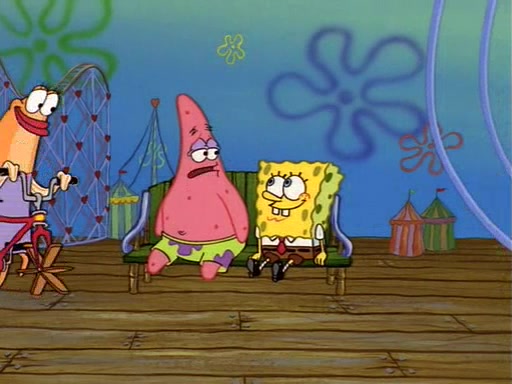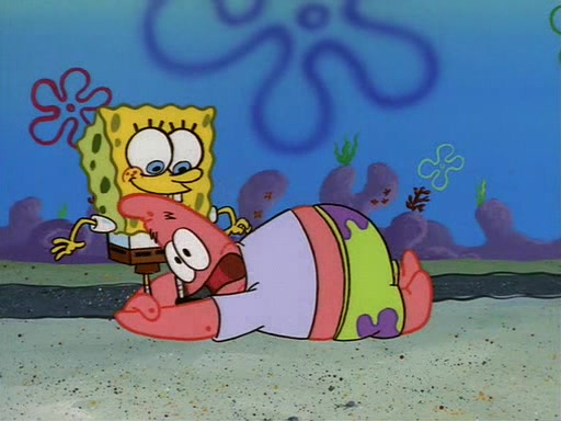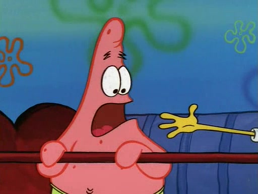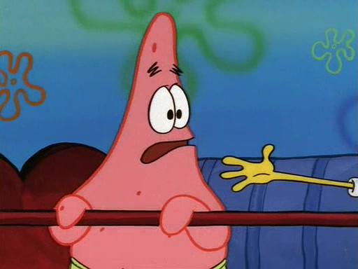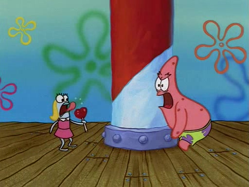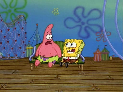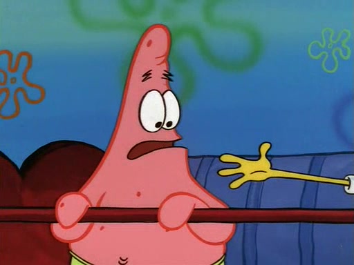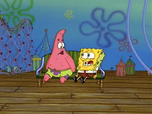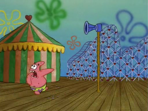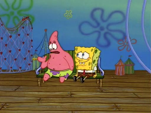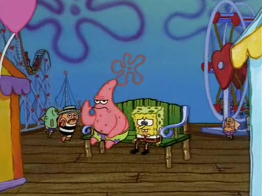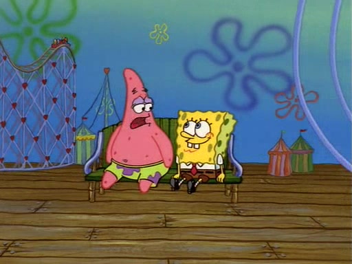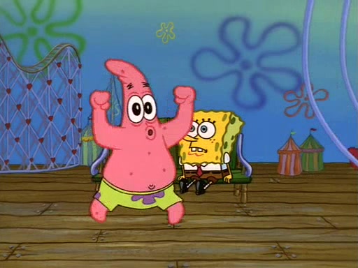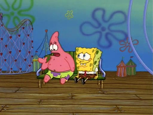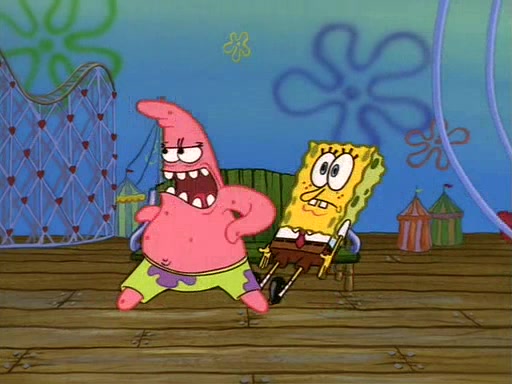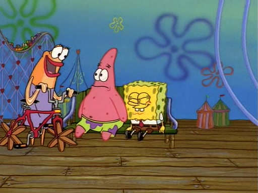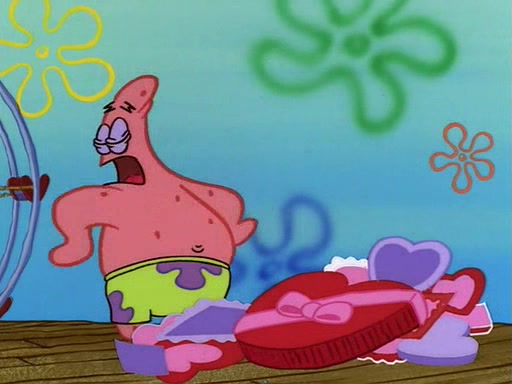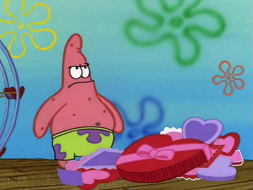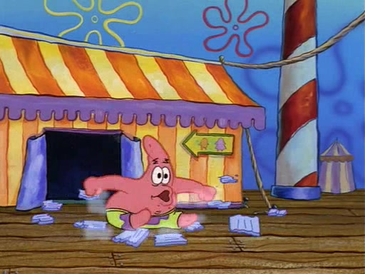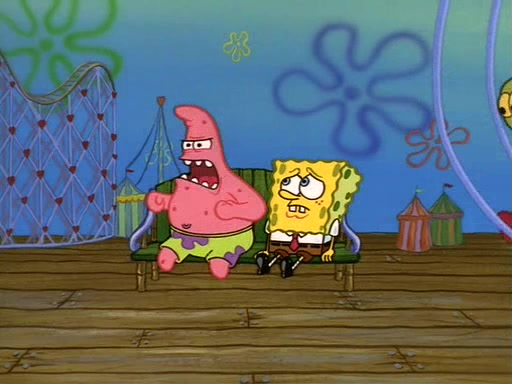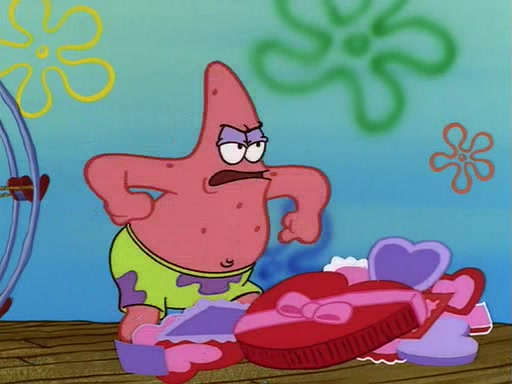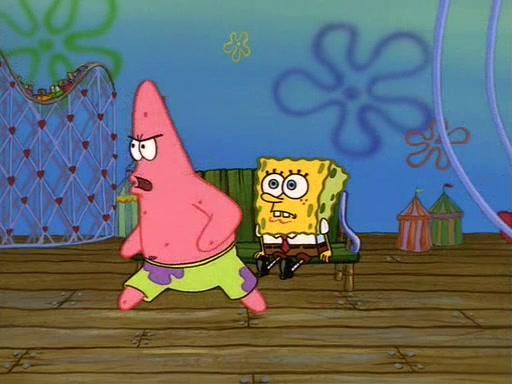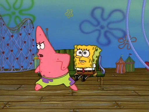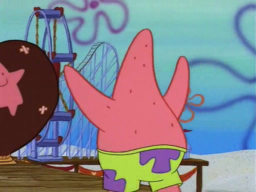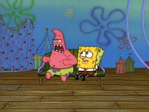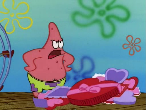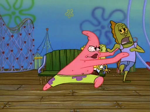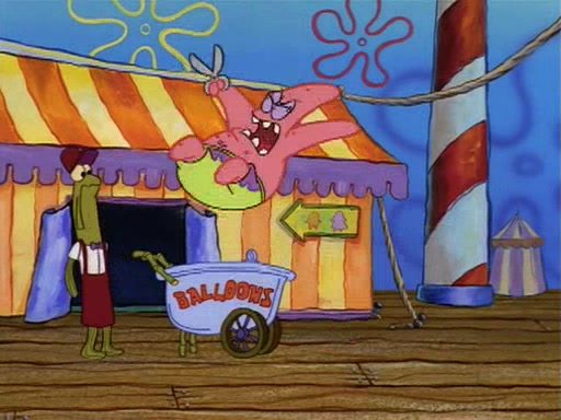 When Patrick sees many other people, including complete strangers (one man only asks for the time), thanking SpongeBob for his gifts to them, he is pushed off the deep end and goes on a rampage. He begins destroying the carnival and corners everyone there, including SpongeBob, seemingly with the intention of killing them all. Before he gets the chance, however, Sandy arrives, having tamed the scallops, who are now helping to keep her balloon afloat. Upon seeing this, Patrick takes a bite of his present, causing it to pop and covering the carnival in chocolate. Smiling at SpongeBob and completely forgetting his anger, Patrick joyfully says, "Aww, SpongeBob, you didn't have to get me anything.".