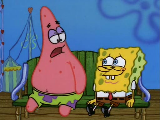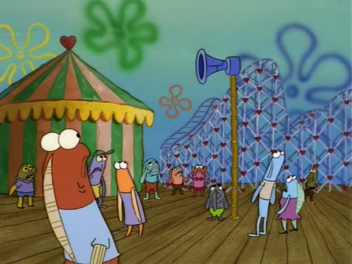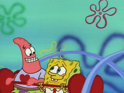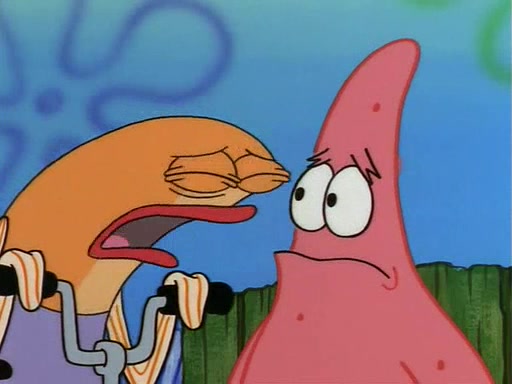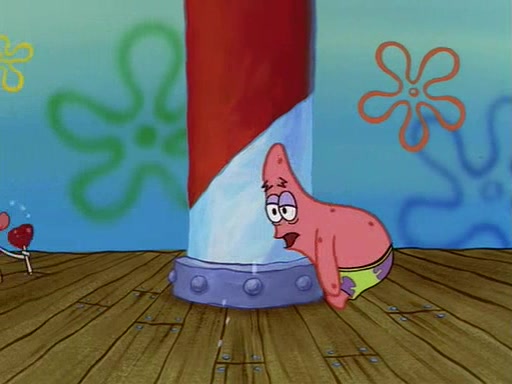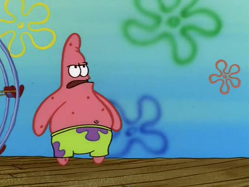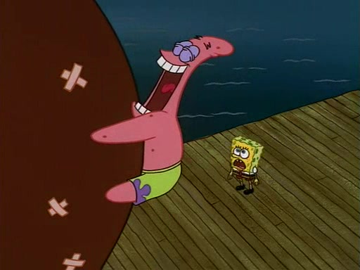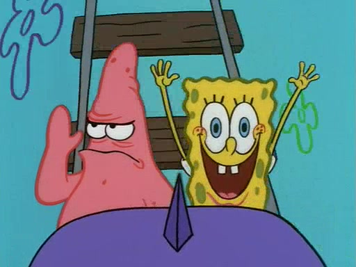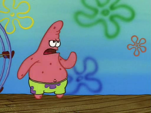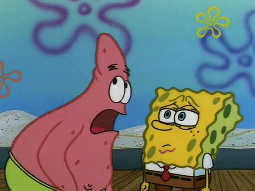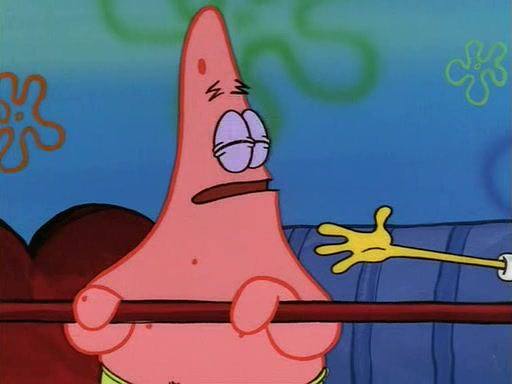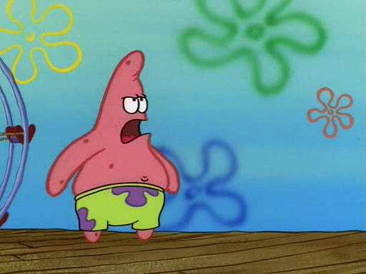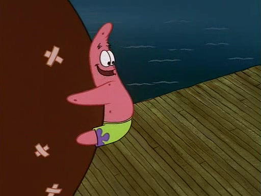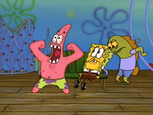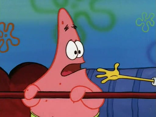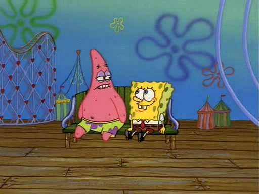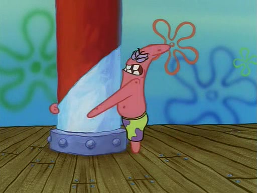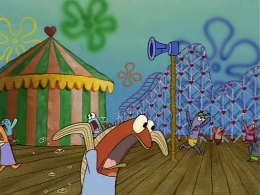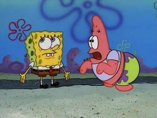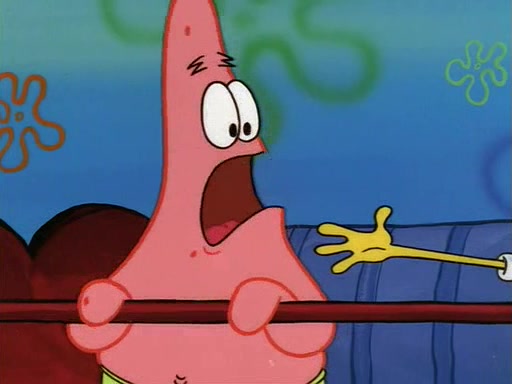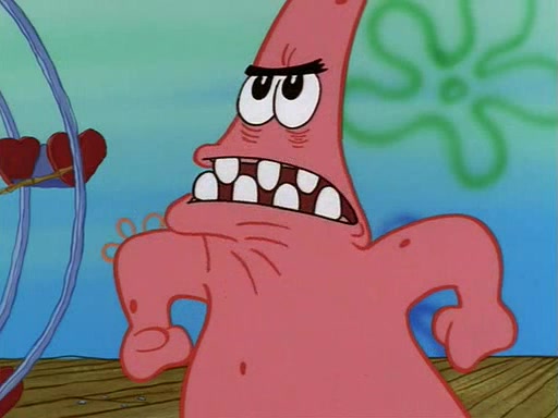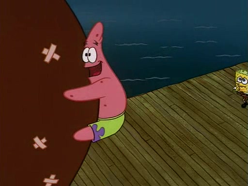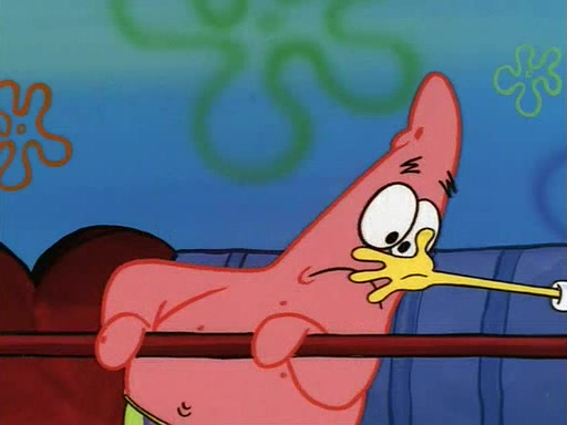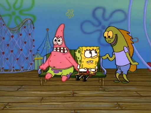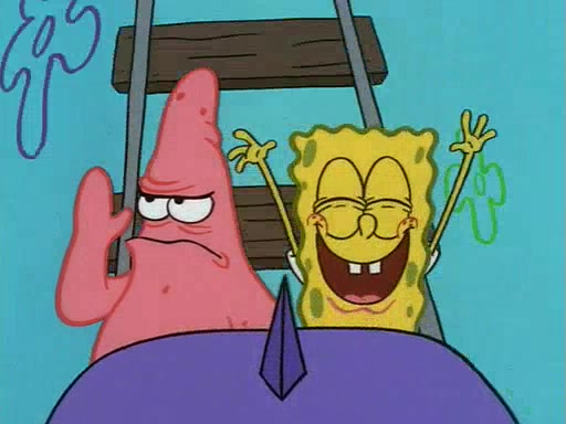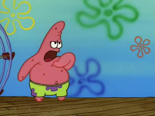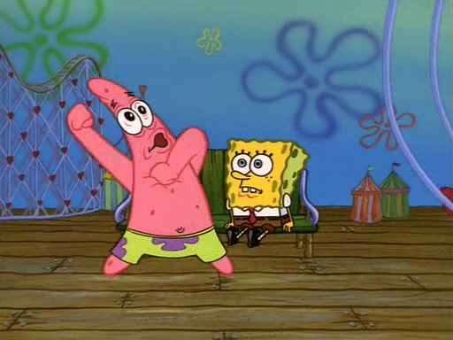 When Patrick sees many other people, including complete strangers (one man only asks for the time), thanking SpongeBob for his gifts to them, he is pushed off the deep end and goes on a rampage. He begins destroying the carnival and corners everyone there, including SpongeBob, seemingly with the intention of killing them all. Before he gets the chance, however, Sandy arrives, having tamed the scallops, who are now helping to keep her balloon afloat. Upon seeing this, Patrick takes a bite of his present, causing it to pop and covering the carnival in chocolate. Smiling at SpongeBob and completely forgetting his anger, Patrick joyfully says, "Aww, SpongeBob, you didn't have to get me anything.".