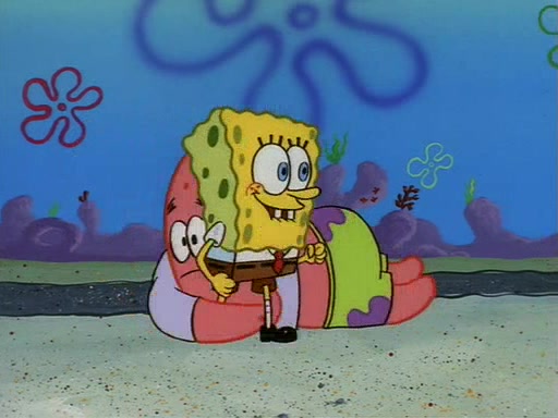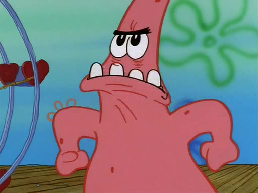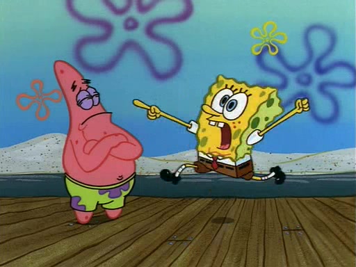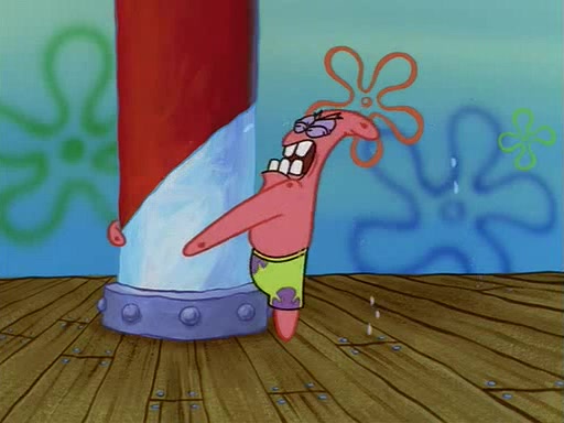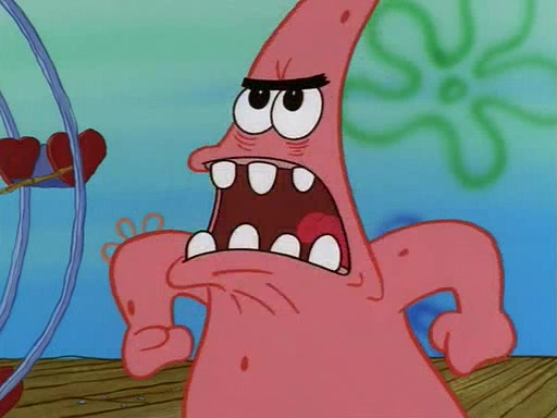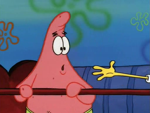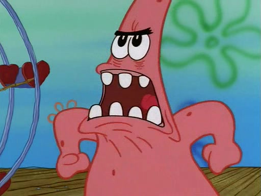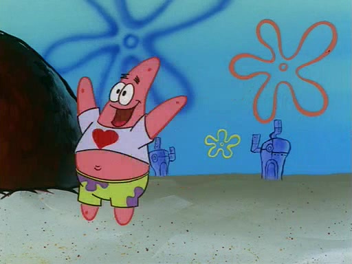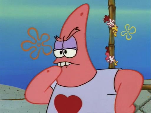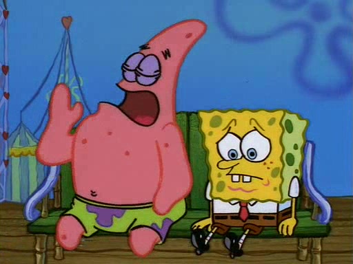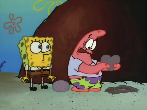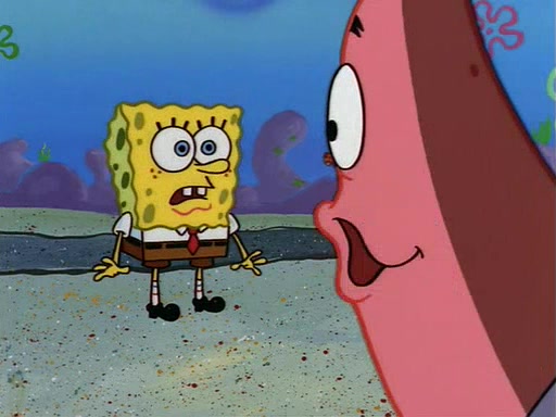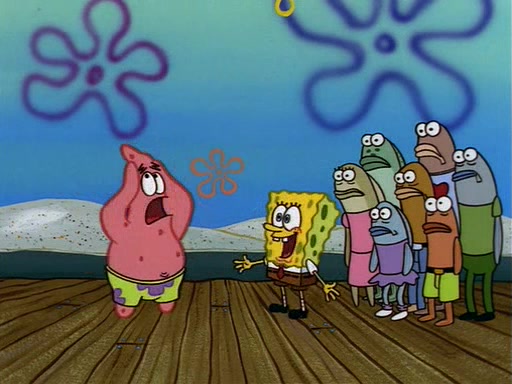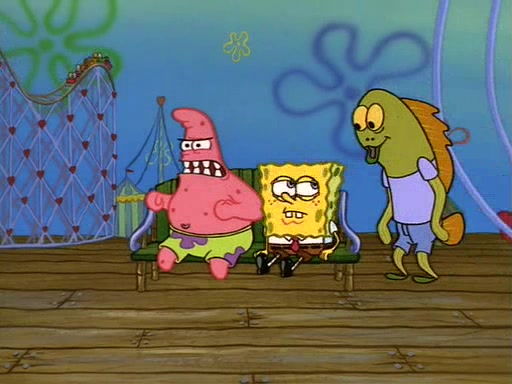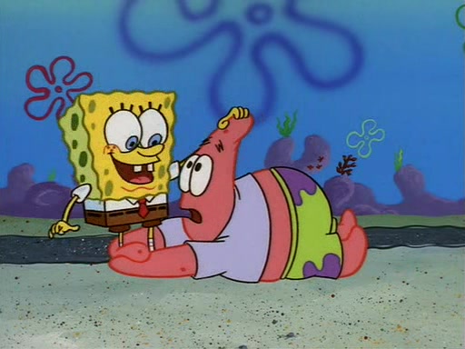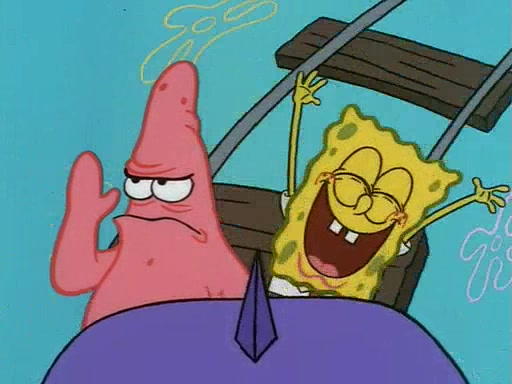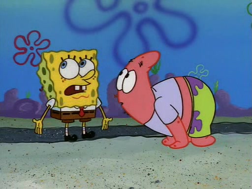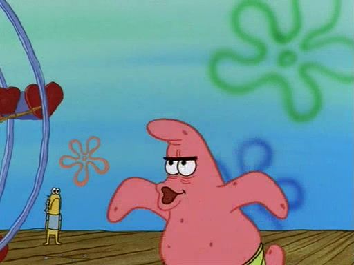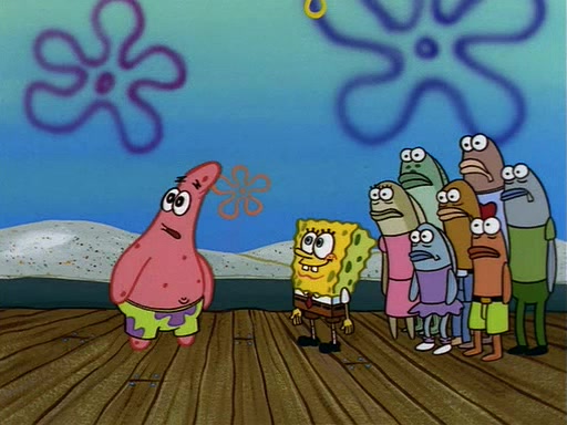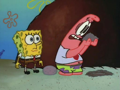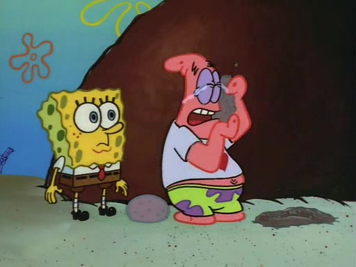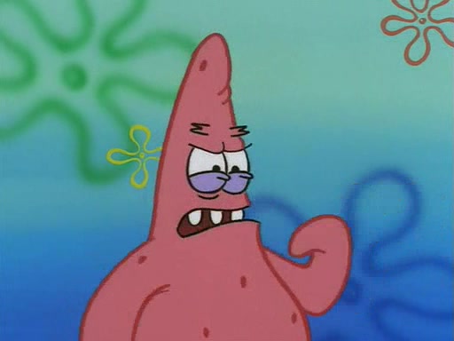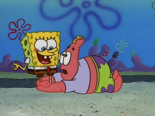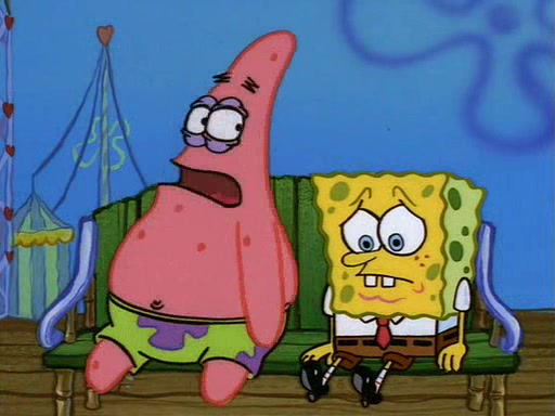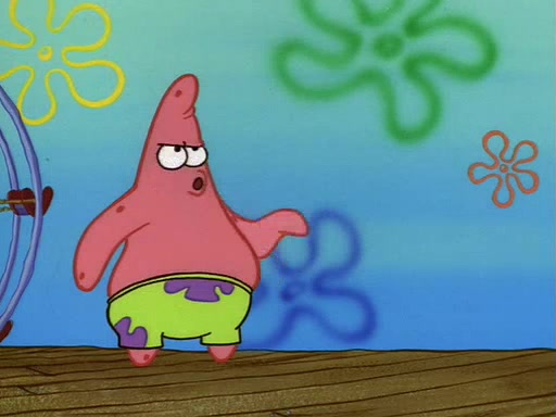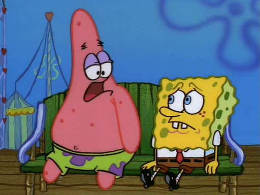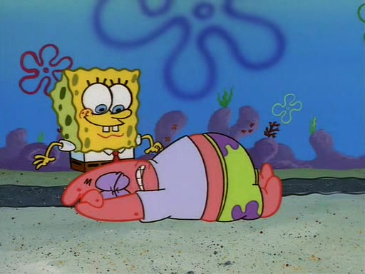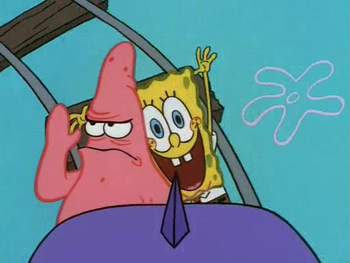 When Patrick sees many other people, including complete strangers (one man only asks for the time), thanking SpongeBob for his gifts to them, he is pushed off the deep end and goes on a rampage. He begins destroying the carnival and corners everyone there, including SpongeBob, seemingly with the intention of killing them all. Before he gets the chance, however, Sandy arrives, having tamed the scallops, who are now helping to keep her balloon afloat. Upon seeing this, Patrick takes a bite of his present, causing it to pop and covering the carnival in chocolate. Smiling at SpongeBob and completely forgetting his anger, Patrick joyfully says, "Aww, SpongeBob, you didn't have to get me anything.".