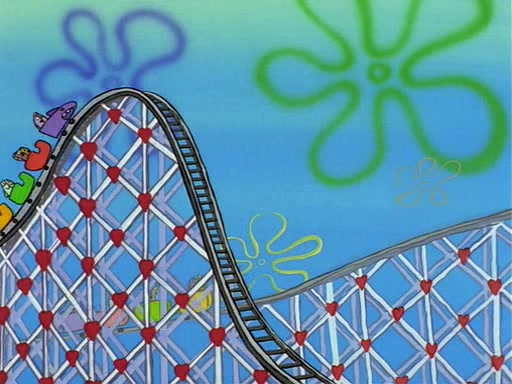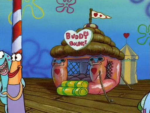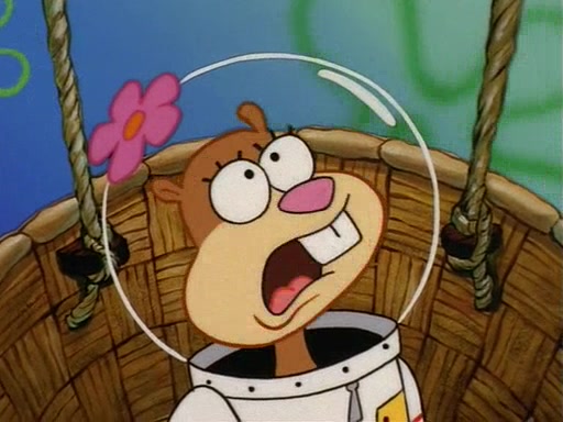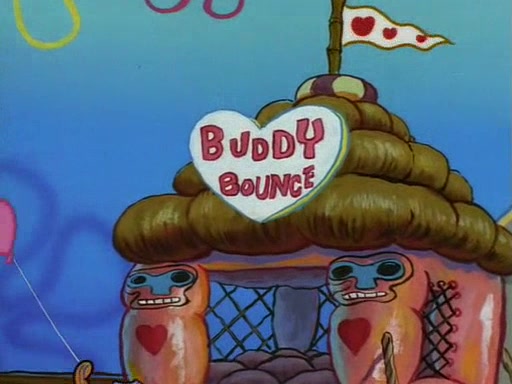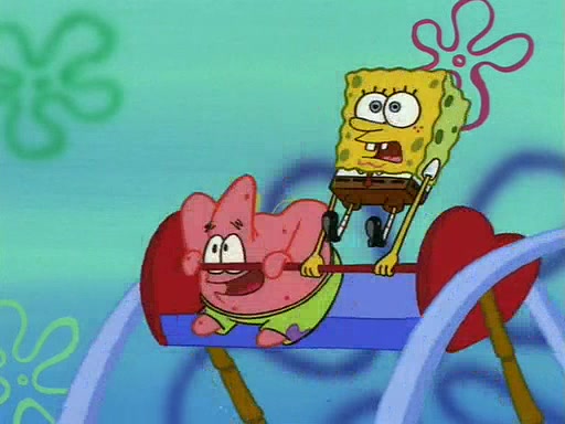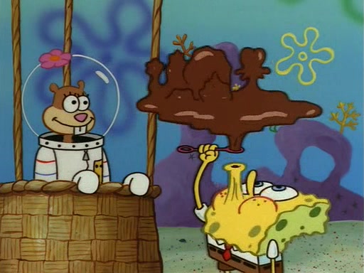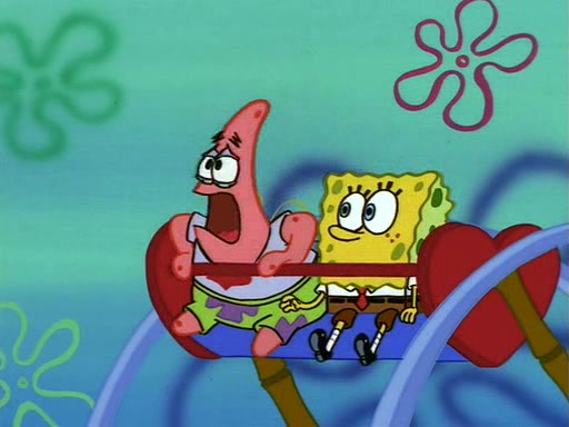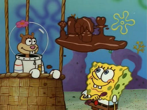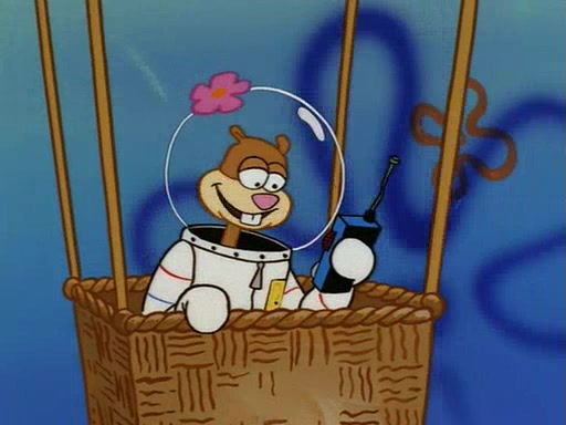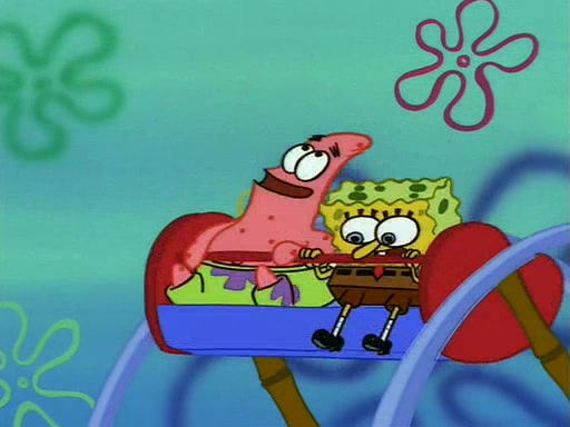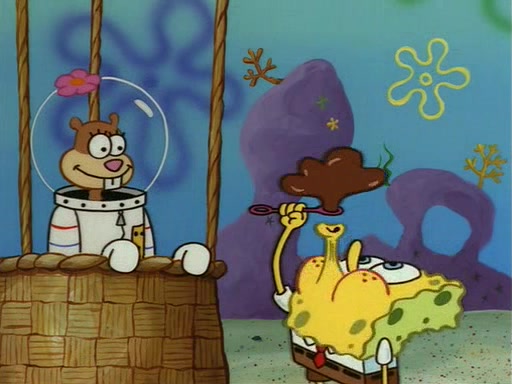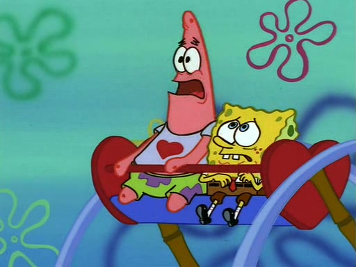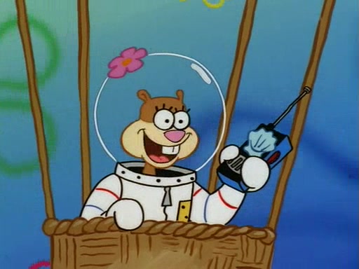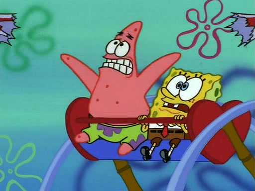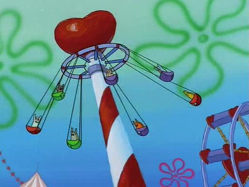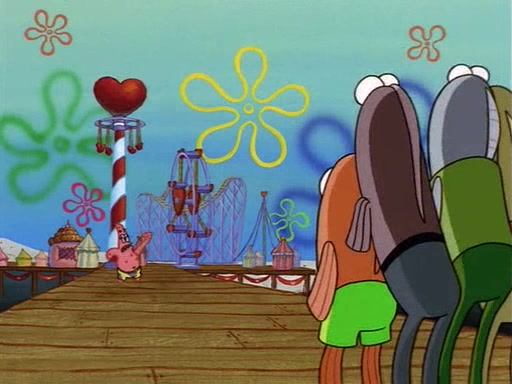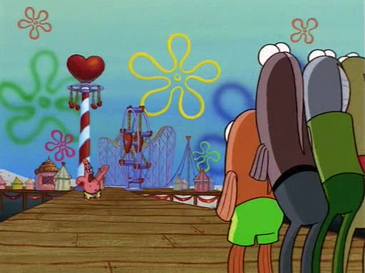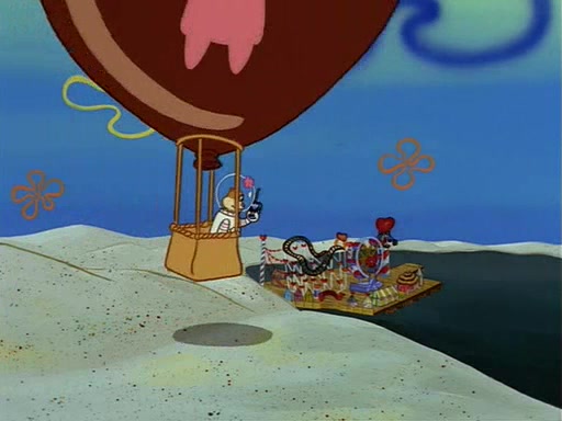 Meanwhile, Sandy, who is in route to the carnival in the chocolate balloon, is attacked by a flock of scallops, which causes the balloon to veer off course as she fights them off. When SpongeBob and Patrick reach the top of the Ferris wheel, where the surprise is to be revealed. However, Sandy contacts SpongeBob via walkie-talkie, informing him of her troubles and telling him that he will have to go with "Plan B". SpongeBob tells Patrick, who is so excited that he is literally shaking the entire Ferris wheel, that his present is a "friendly handshake", greatly disappointing him and making him very angry.